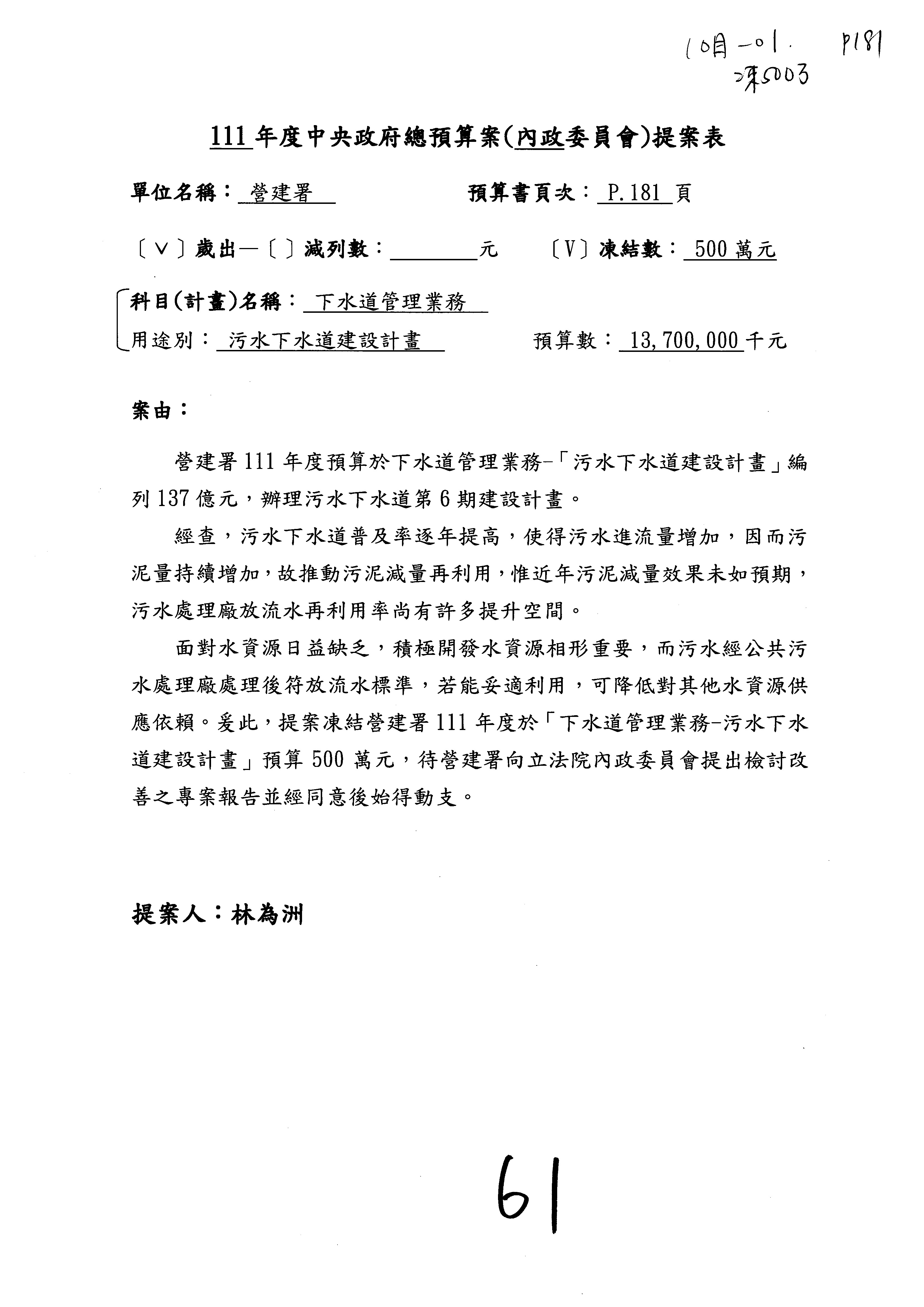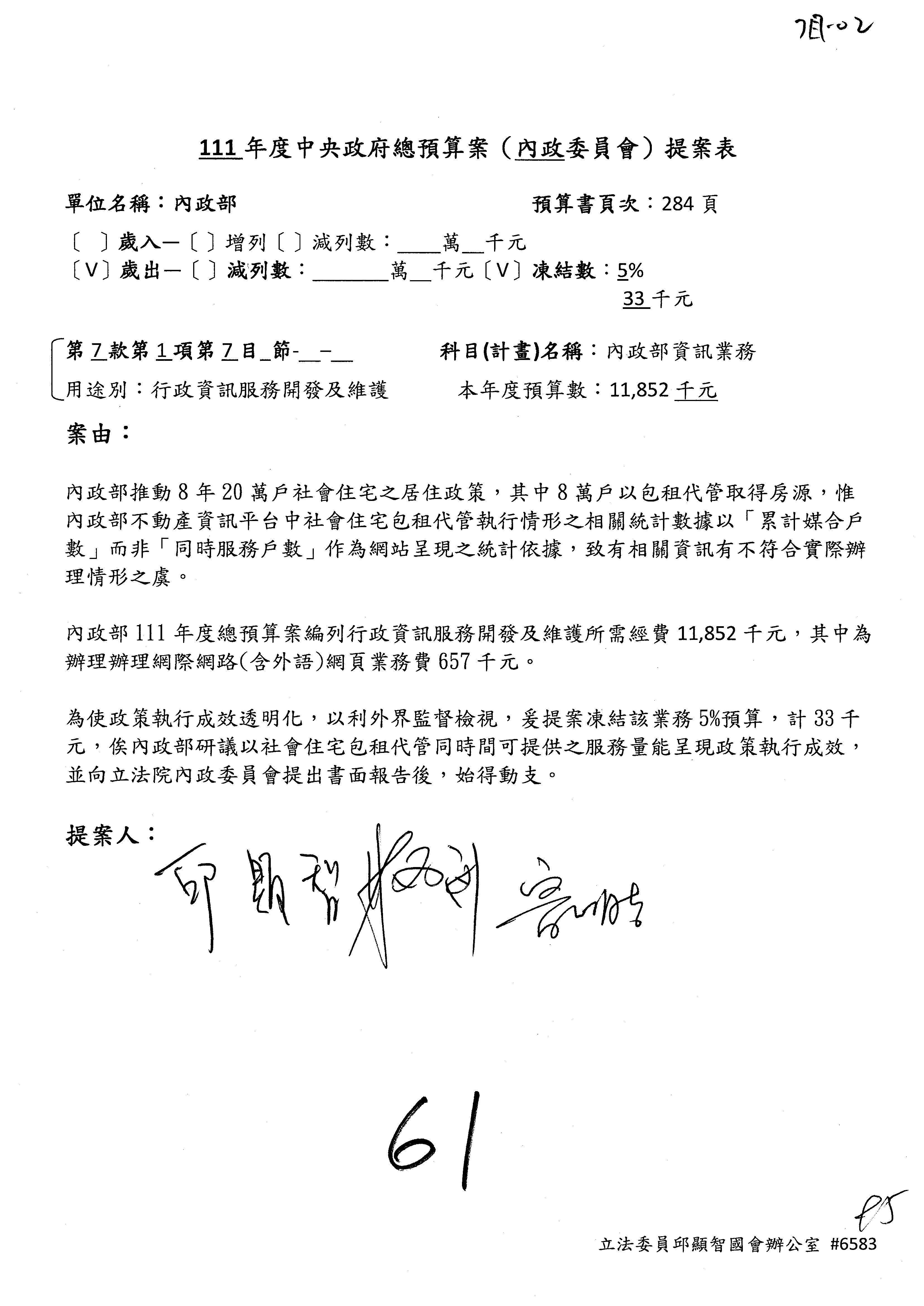 第61案第二段予以刪除;第三段第一句後段修正為「爰請內政部研議社會住宅包租代管同時間可提供之服務量能呈現政策執行成效,並於三個月內向立法院內政委員會提出書面報告」,「後,始得動支」予以刪除。