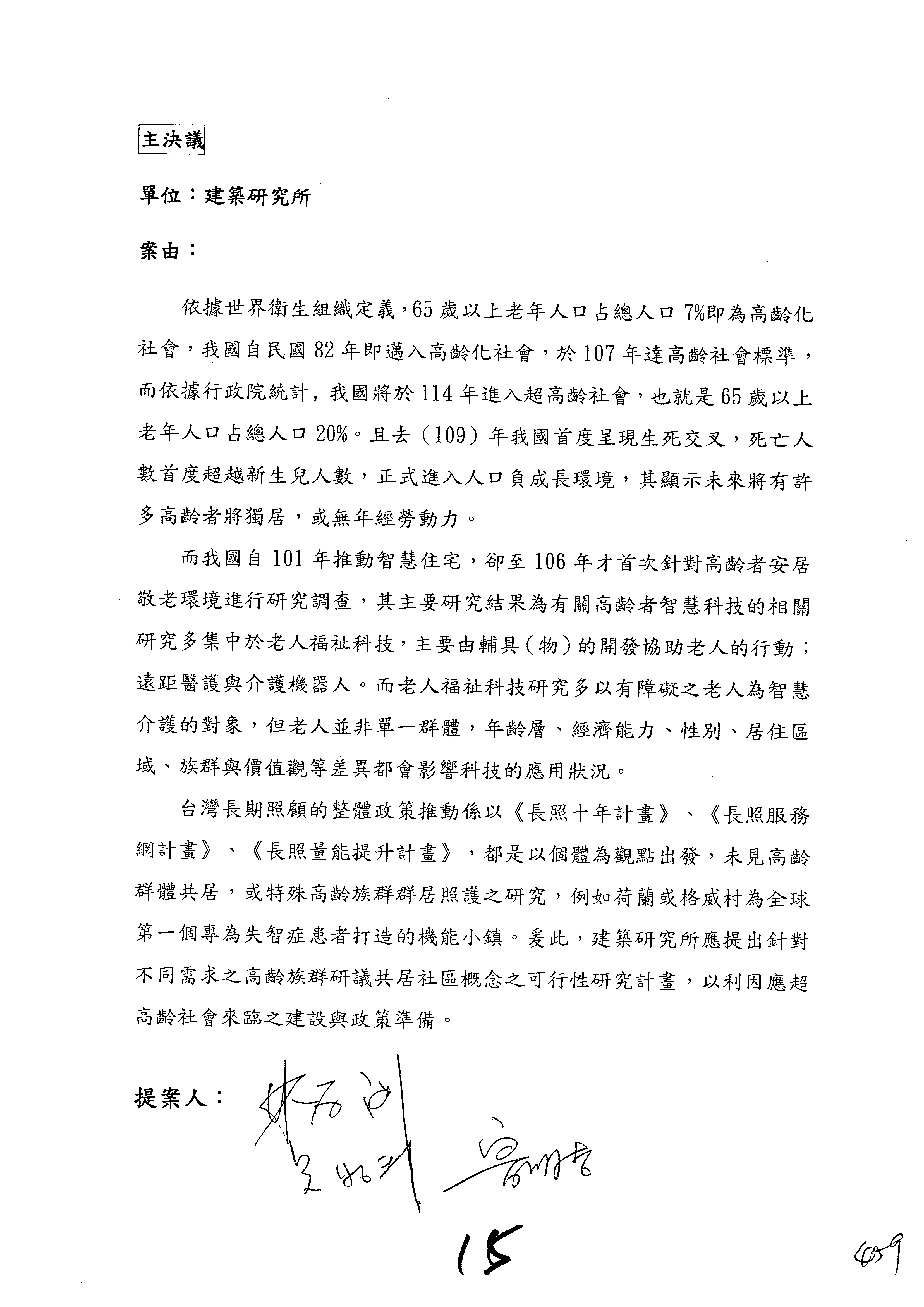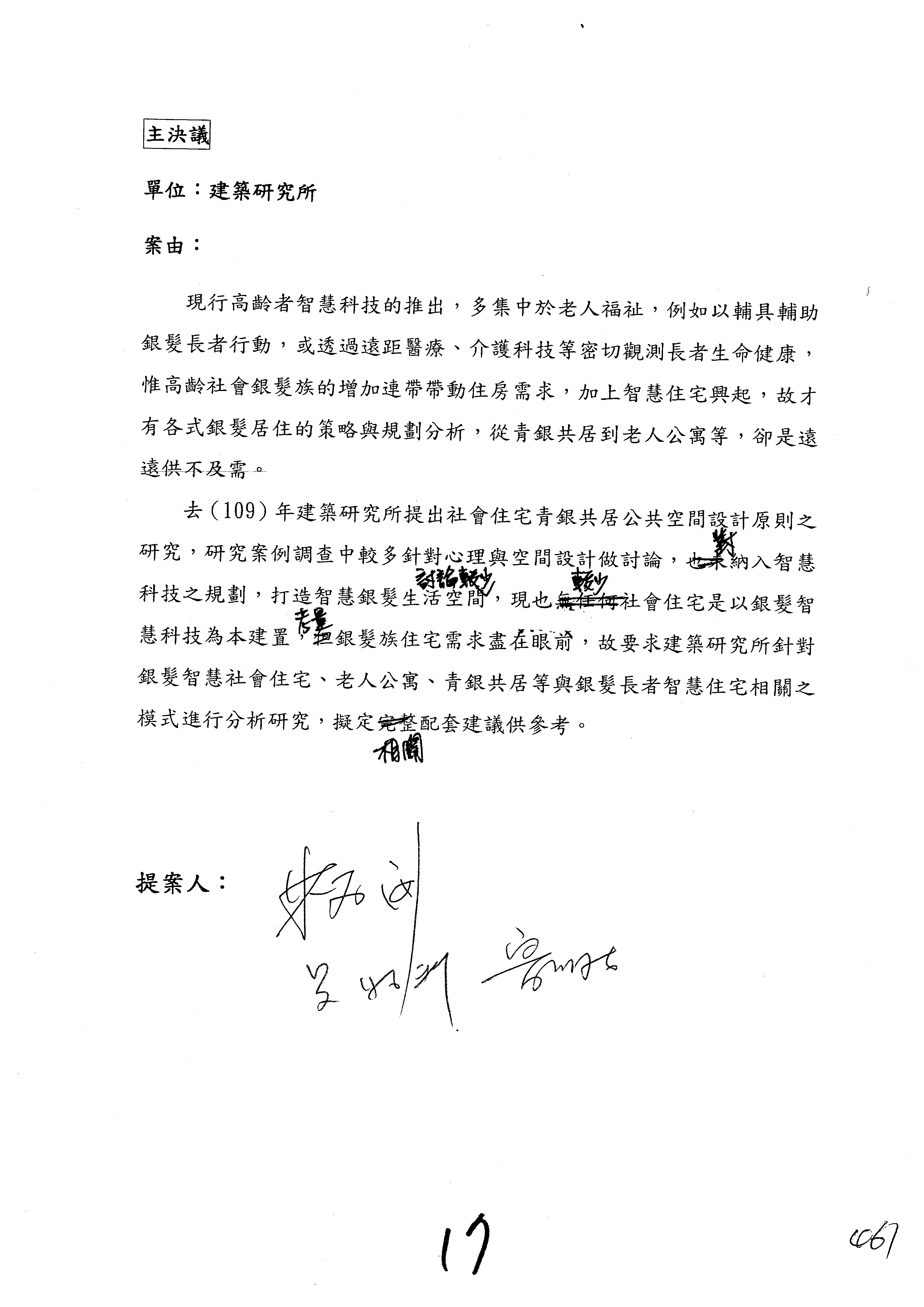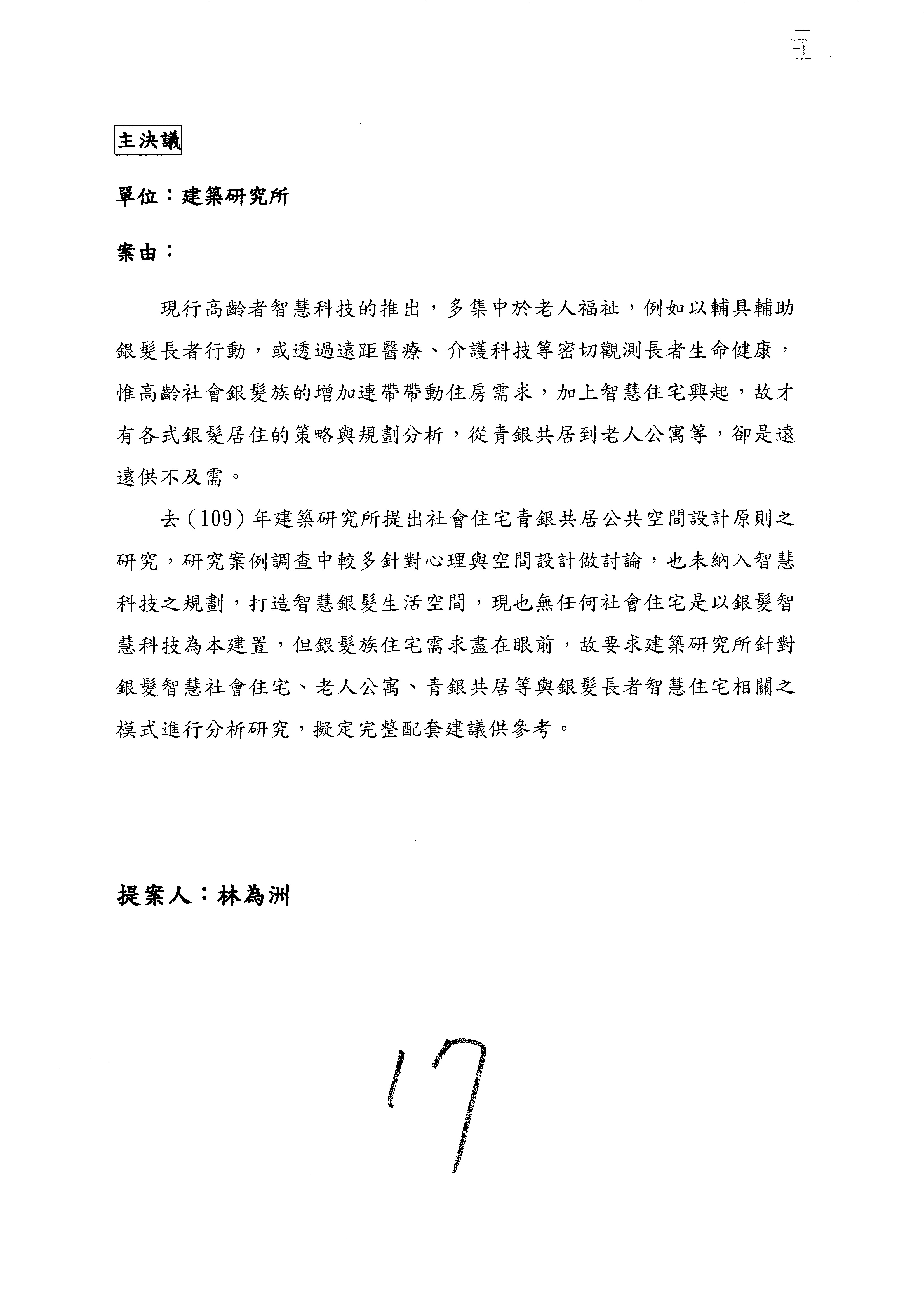 主決議部分,第15案、第16案均照案通過;第17案文字修正,第二段文字修正為「去(109)年建築研究所提出社會住宅青銀共居公共空間設計原則之研究,研究案例調查中較多針對心理與空間設計做討論,對納入智慧科技之規劃,打造智慧銀髮生活空間討論較少,現也較少社會住宅是以銀髮智慧科技為本建置,考量銀髮族住宅需求近在眼前,故要求建築研究所針對銀髮智慧社會住宅老人公寓青銀共居等與銀髮長者智慧住宅相關之模式進行分析研究,擬定相關配套建議供參考。」,第一段照案通過;第18案至第21案,均照案通過;第7案改為主決議的文字,末段修正為「爰予減列60萬元,其餘凍結」等文字予以刪除,其下的文字修正為「爰建請建築研究所提供近五年補助單位名單並檢附行政作業流程相關資料,提出書面報告」,其餘文字均照案通過。