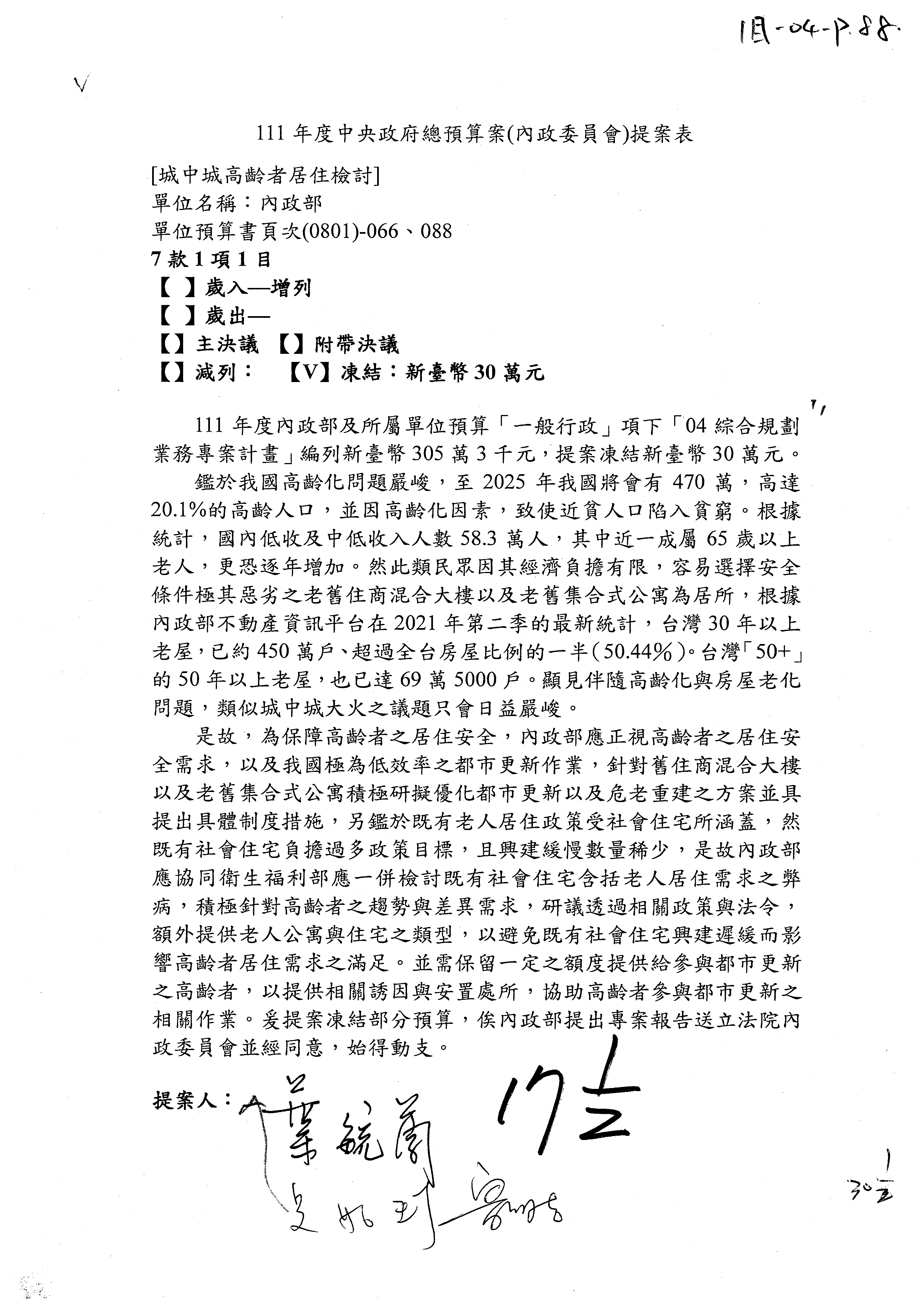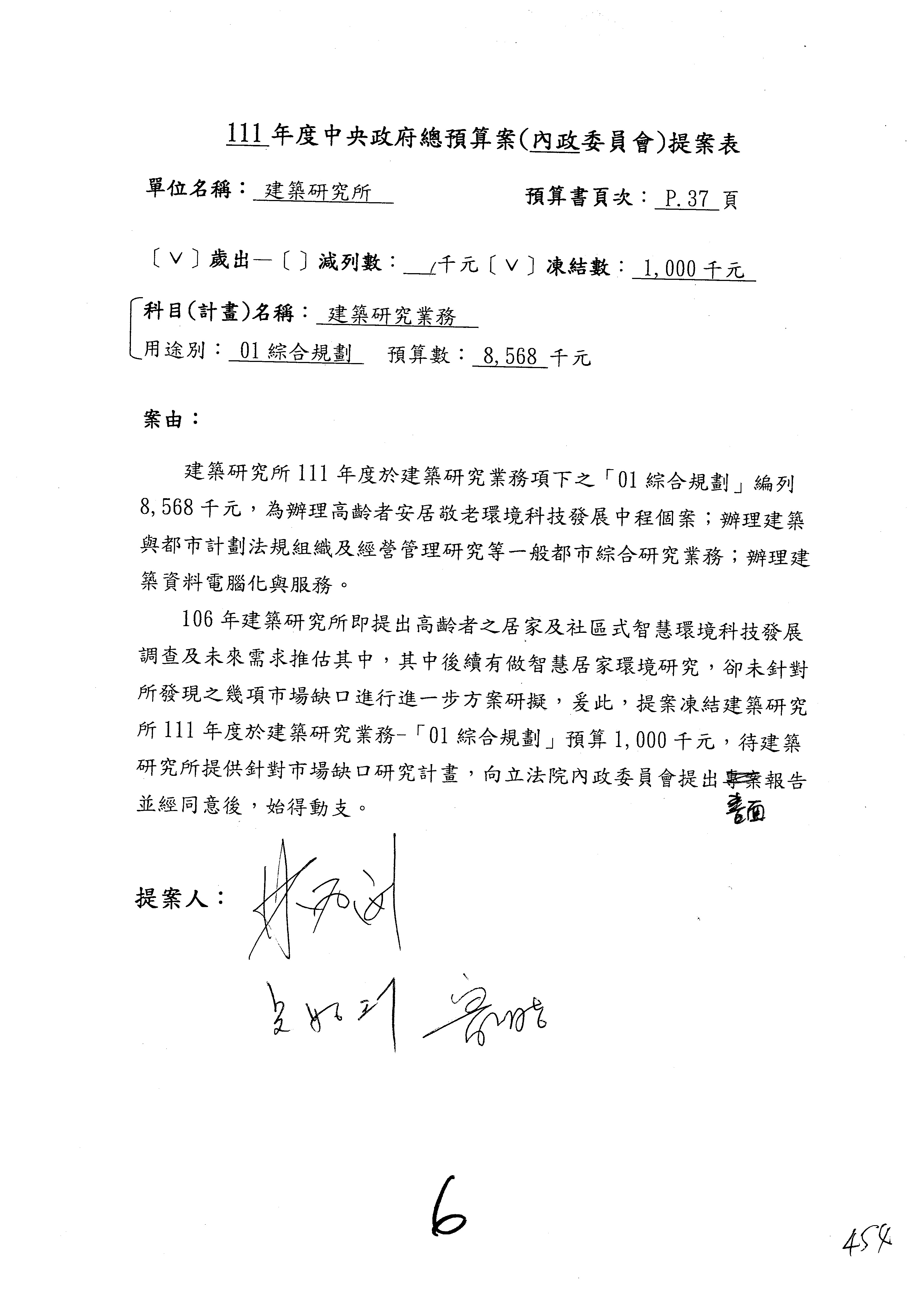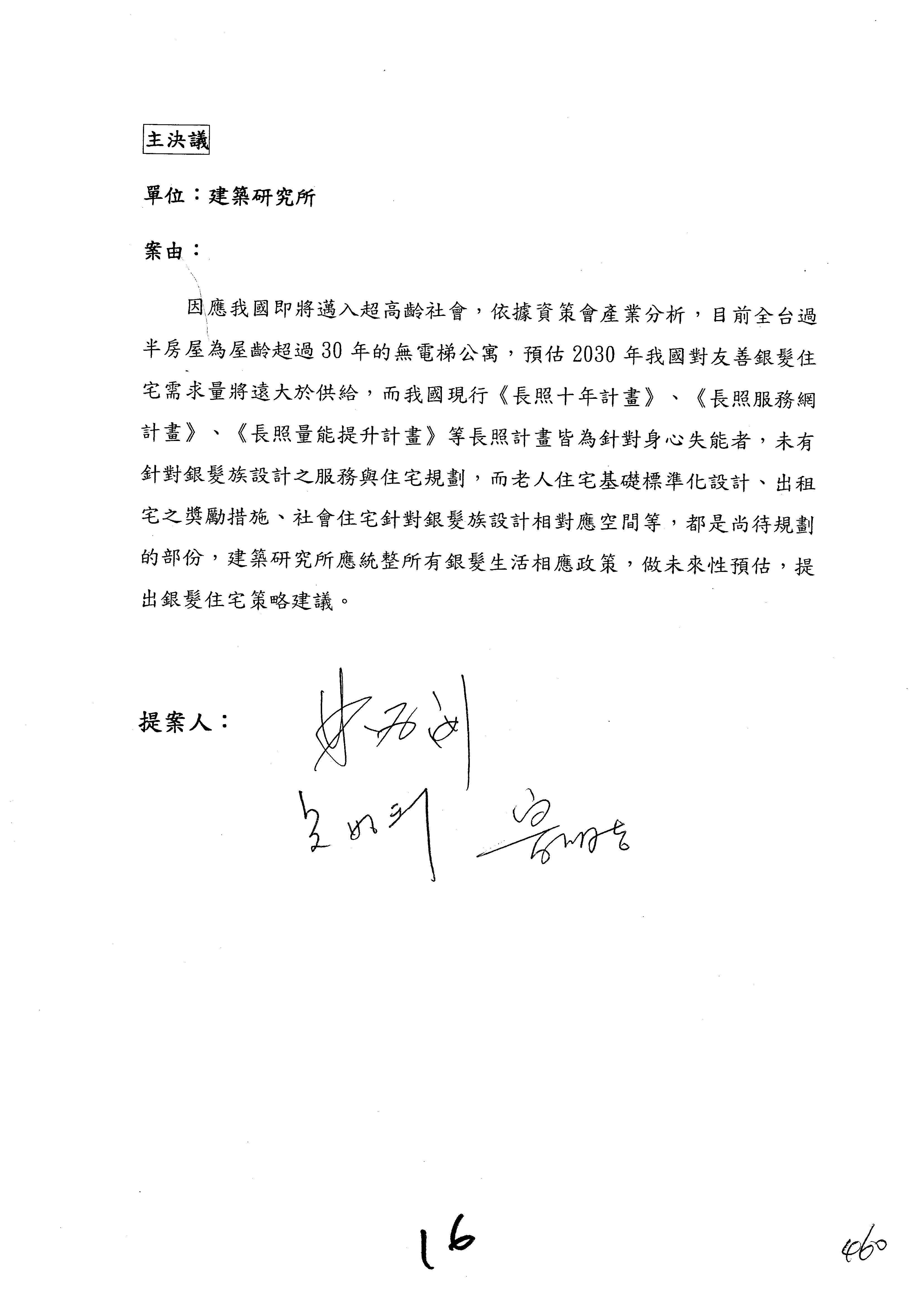 主決議部分,第15案、第16案均照案通過;第17案文字修正,第二段文字修正為「去(109)年建築研究所提出社會住宅青銀共居公共空間設計原則之研究,研究案例調查中較多針對心理與空間設計做討論,對納入智慧科技之規劃,打造智慧銀髮生活空間討論較少,現也較少社會住宅是以銀髮智慧科技為本建置,考量銀髮族住宅需求近在眼前,故要求建築研究所針對銀髮智慧社會住宅老人公寓青銀共居等與銀髮長者智慧住宅相關之模式進行分析研究,擬定相關配套建議供參考。」,第一段照案通過;第18案至第21案,均照案通過;第7案改為主決議的文字,末段修正為「爰予減列60萬元,其餘凍結」等文字予以刪除,其下的文字修正為「爰建請建築研究所提供近五年補助單位名單並檢附行政作業流程相關資料,提出書面報告」,其餘文字均照案通過。