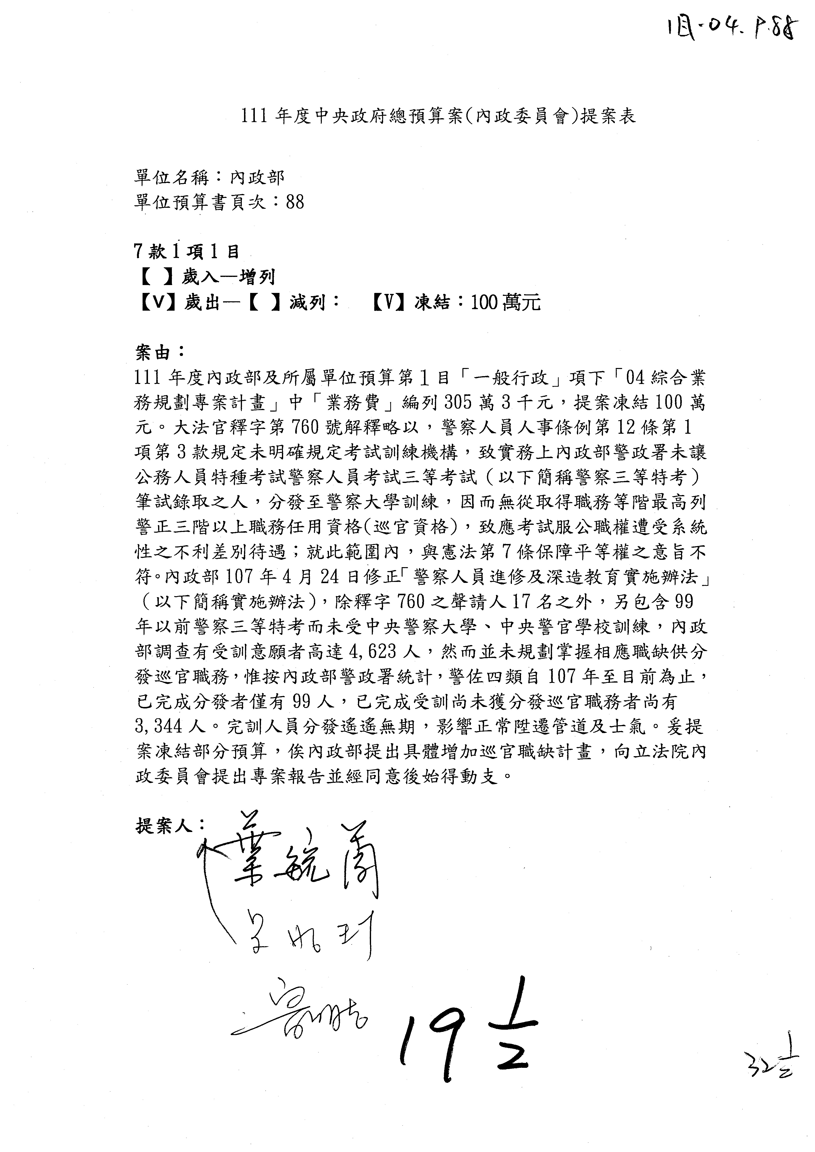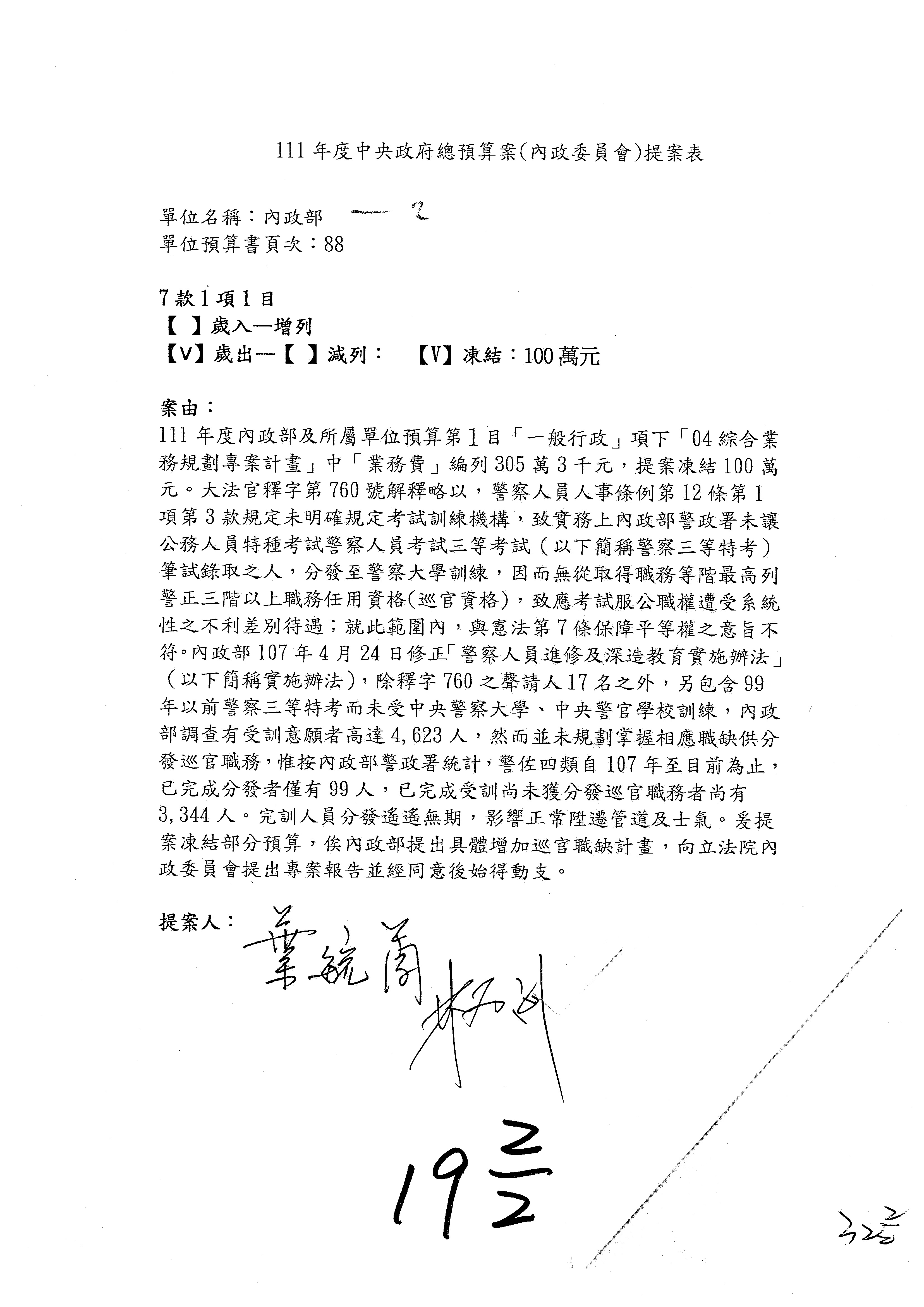 第19案前兩行予以刪除;倒數第二行修正為「爰請內政部提出具體增加巡官職缺計畫,向立法院內政委員會提出書面報告」,其餘文字照案通過。
