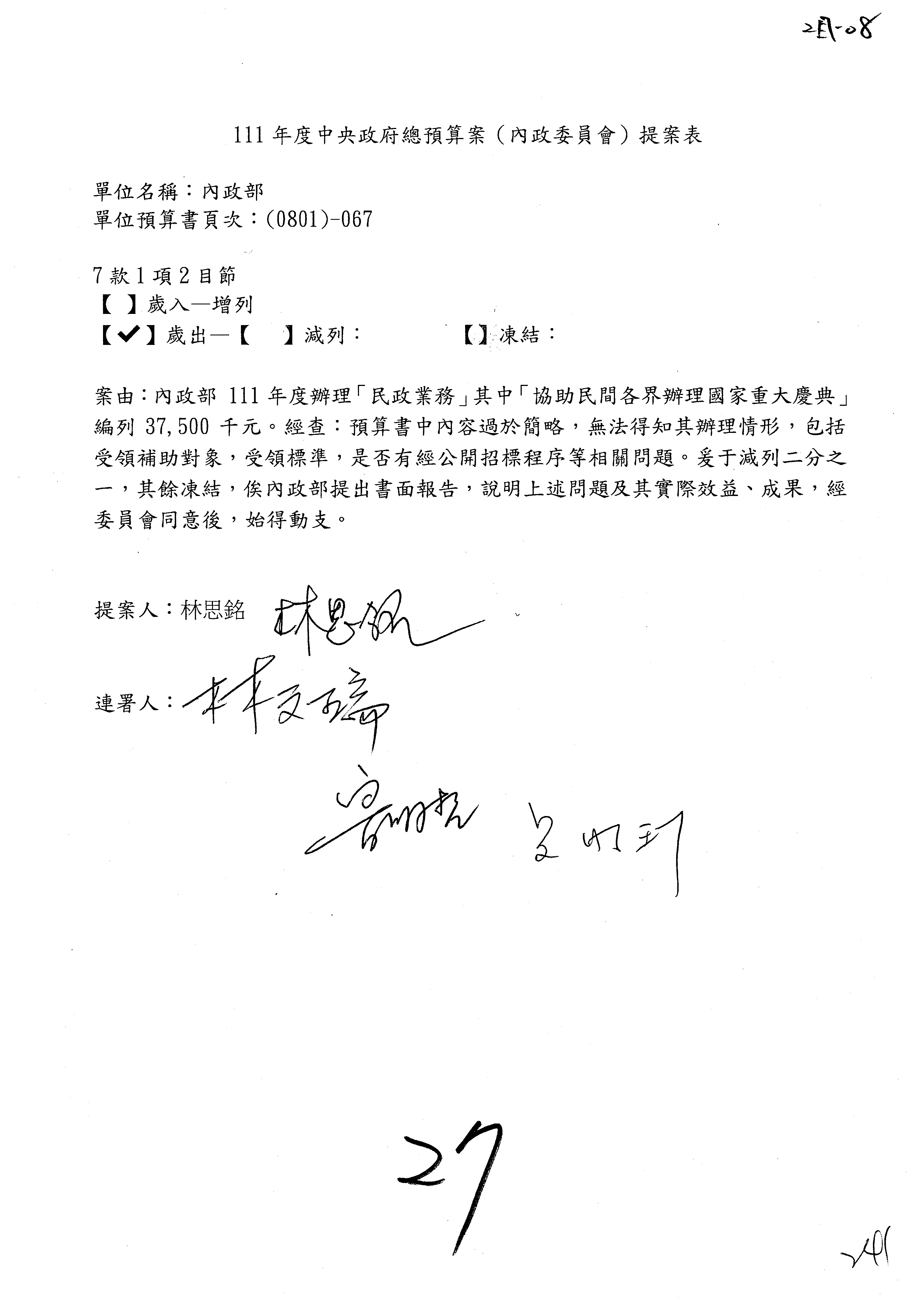 第27案第三行修正為「爰請內政部提出書面報告,說明上述問題及其實際效益、成果」,其餘文字照案通過。