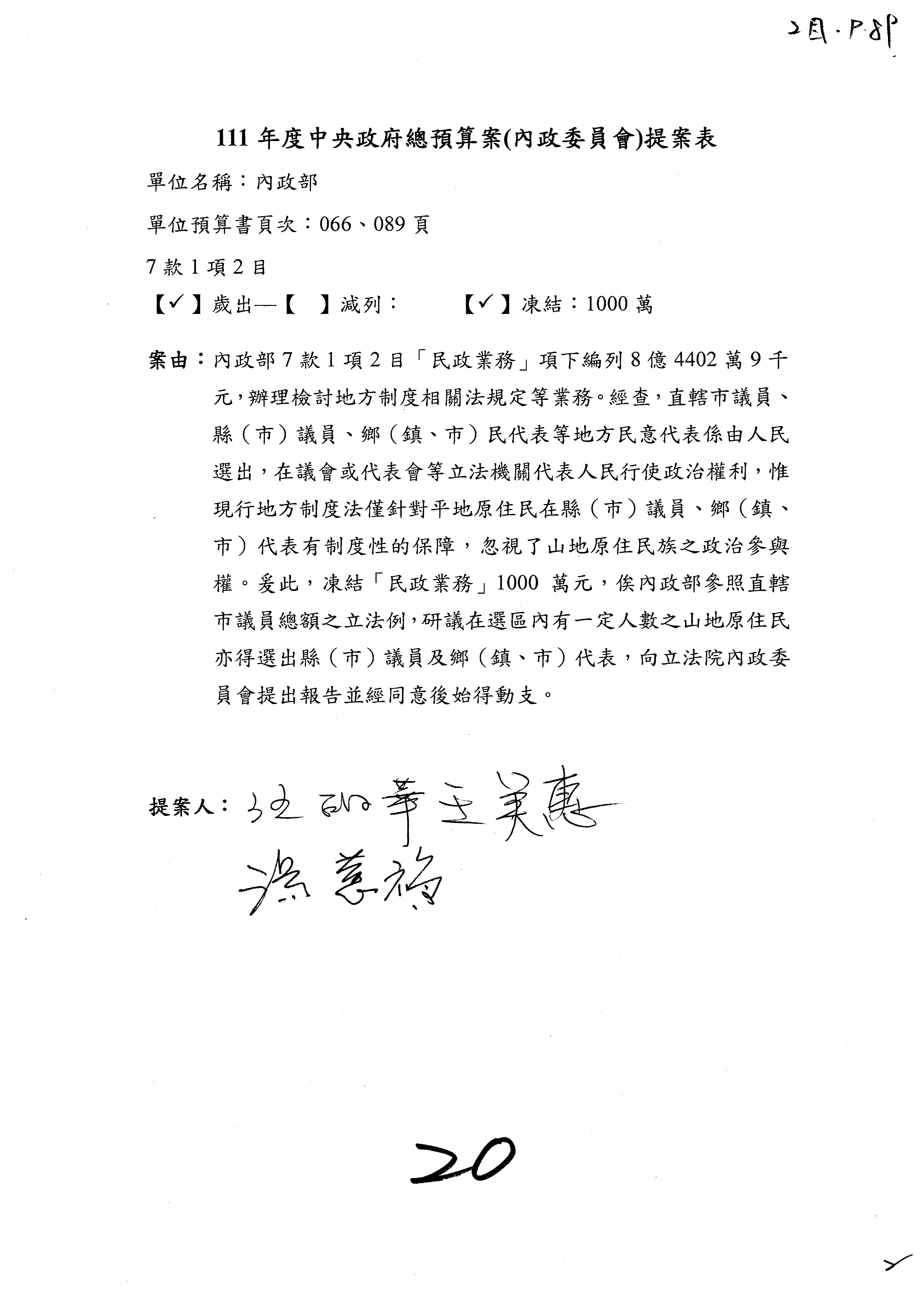 第20案倒數第五行中段之「忽視了……」改為「未規範山地原住民之政治參與權,爰請內政部參照直轄市議員總額之立法例,研議在選區內有一定人數之山地原住民亦得選出縣(市)議員及鄉(鎮、市)代表,向立法院內政委員會提出書面報告」,其餘文字照案通過。