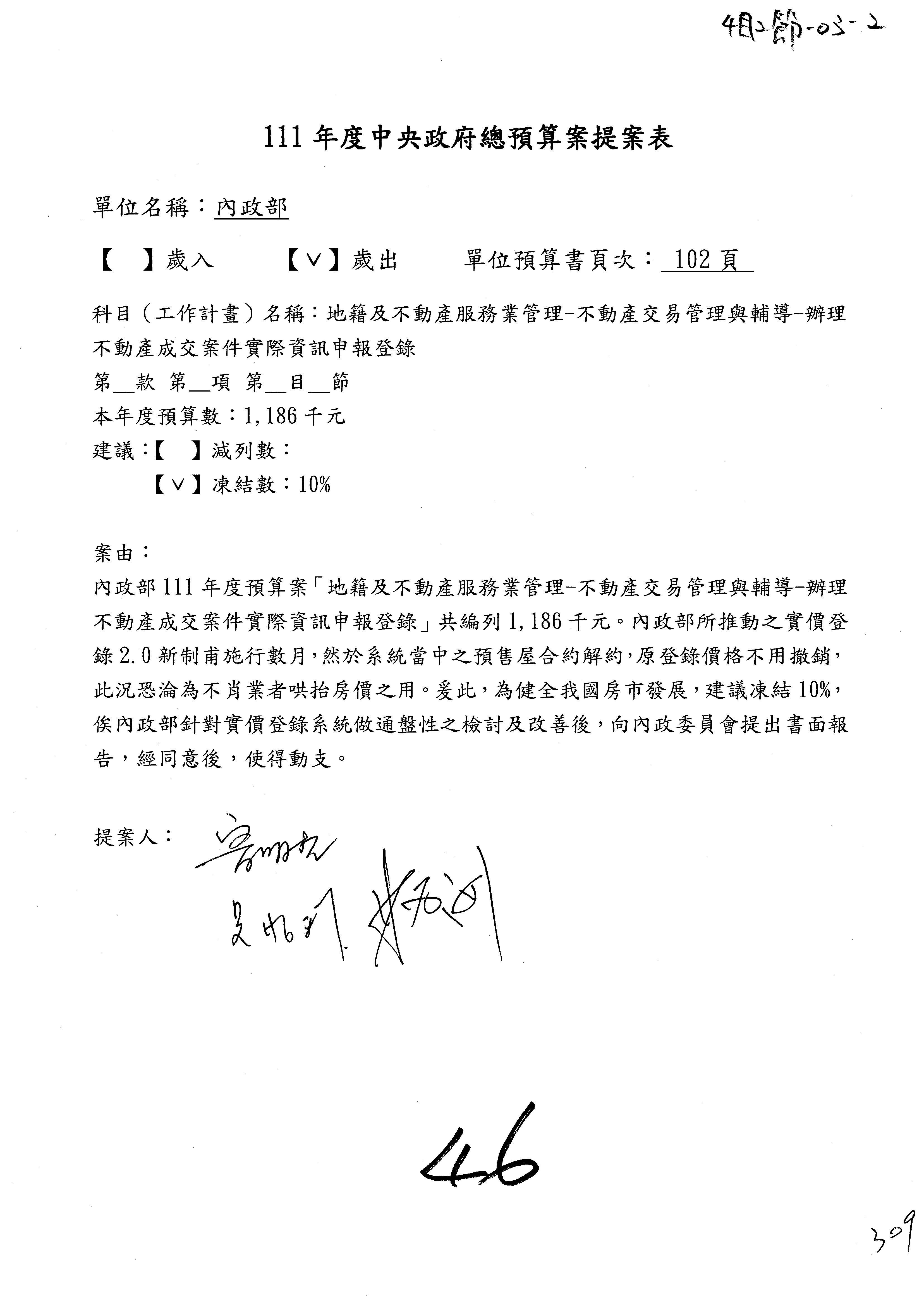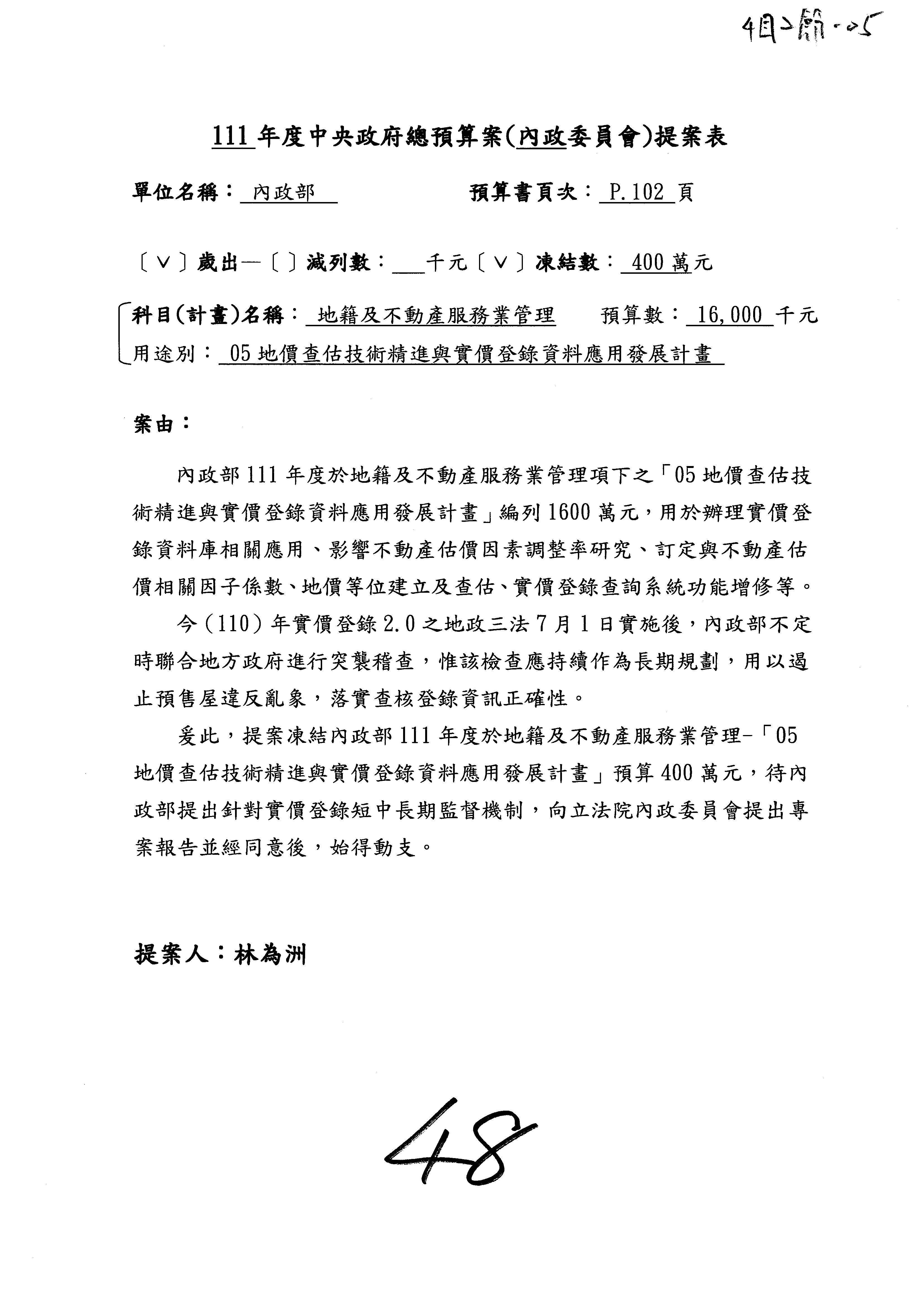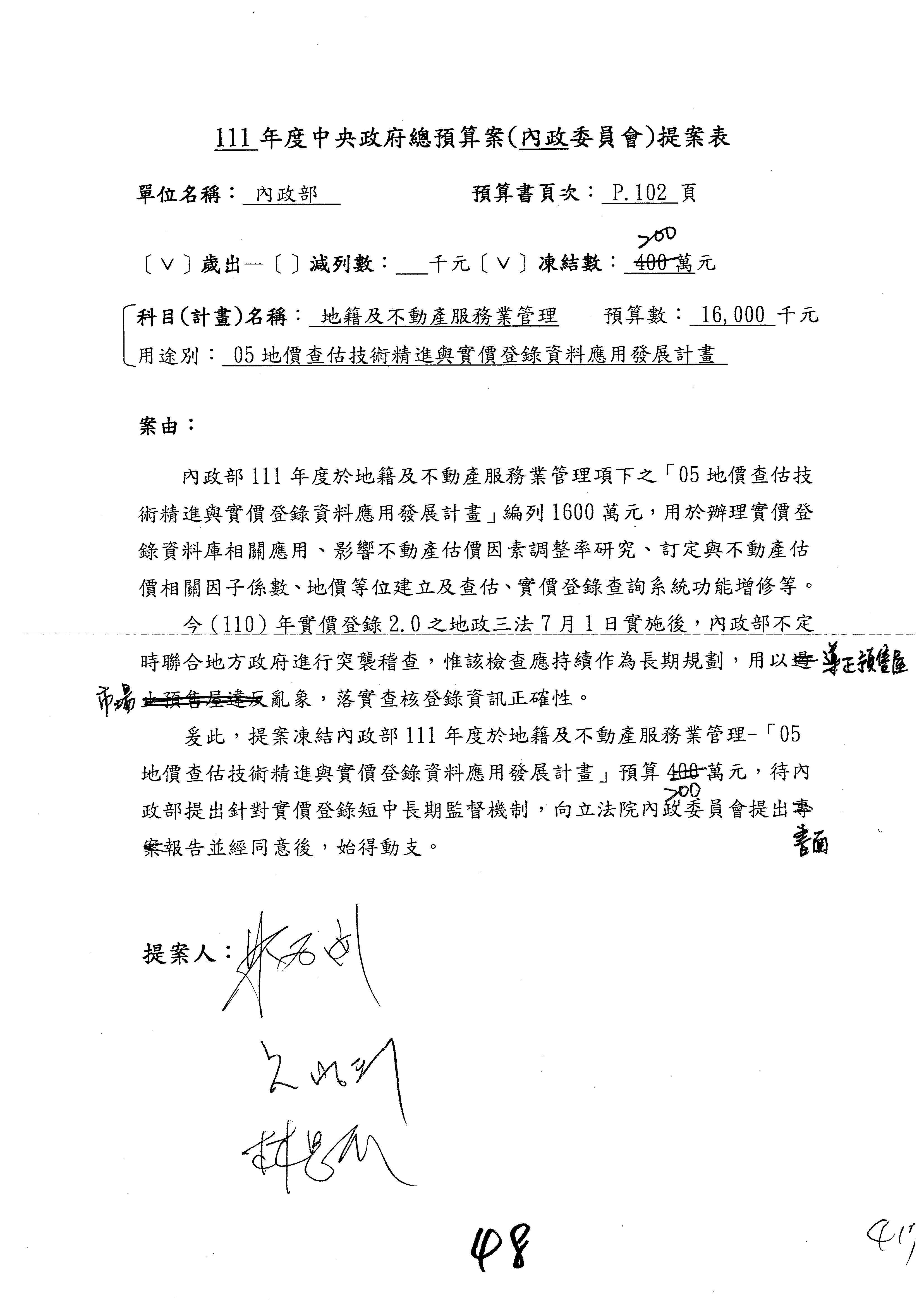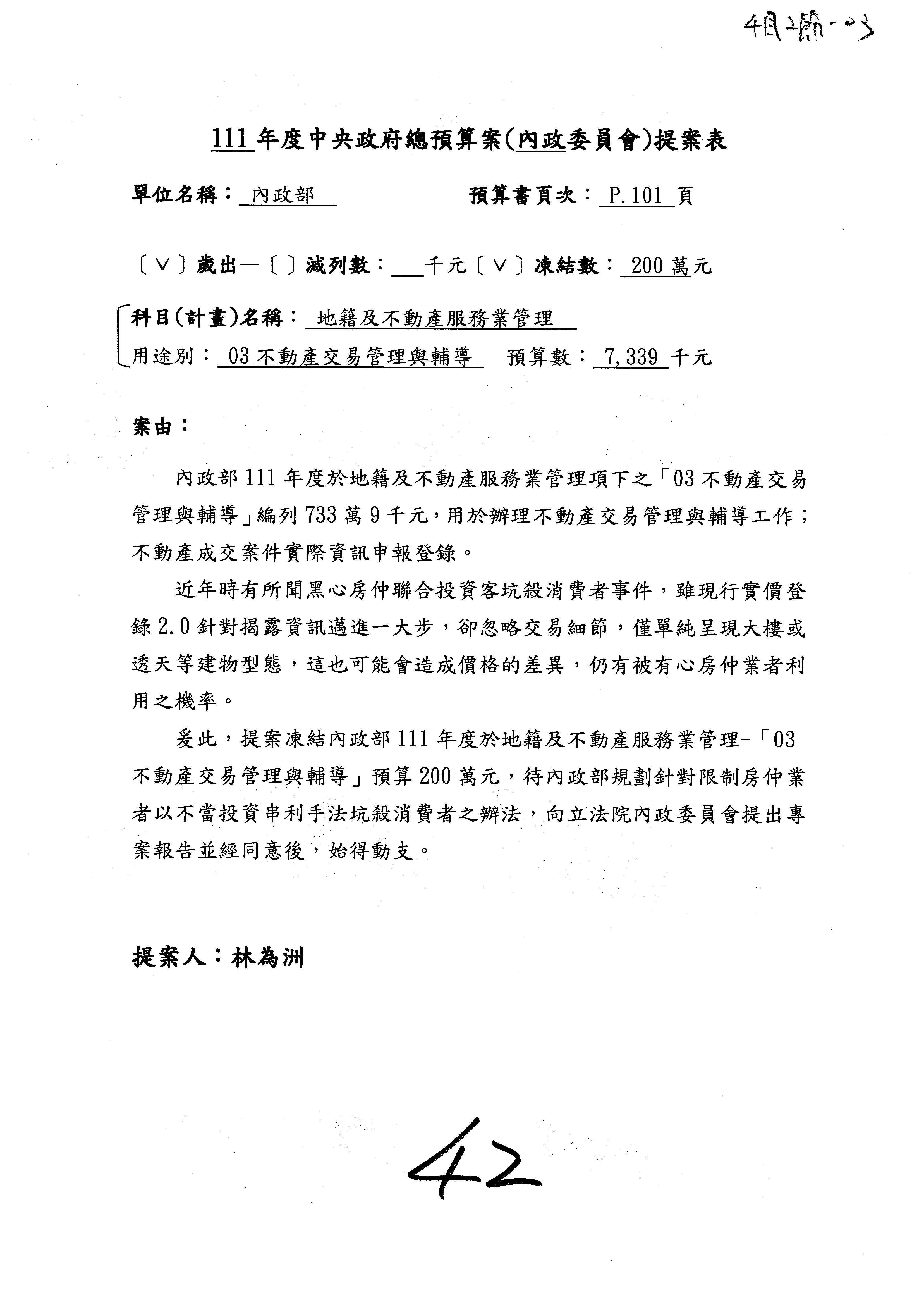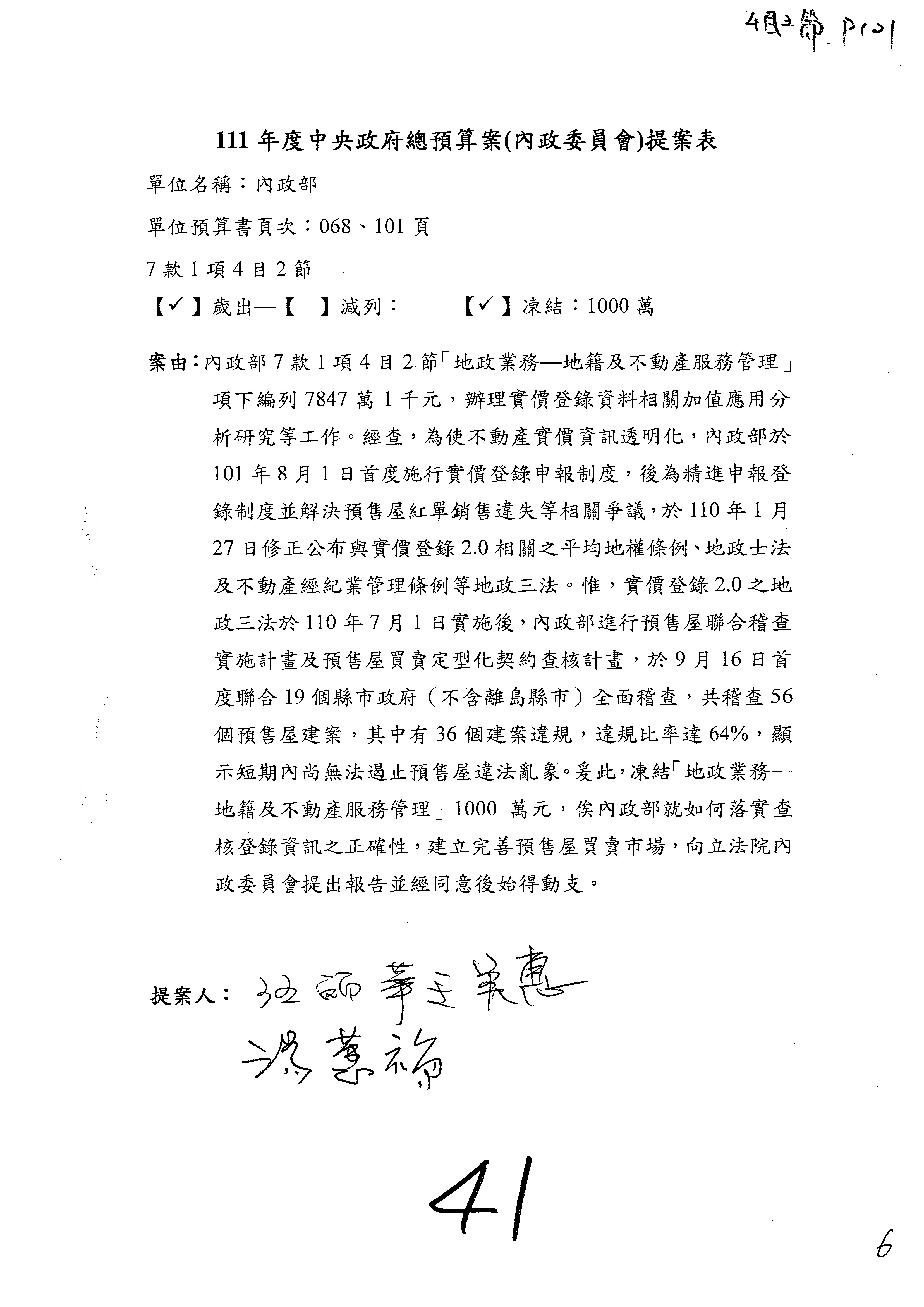 第4目「地政業務」,第41案、第44案、第52案均撤案;第42案、第43案、第45案、第46案合併處理,凍結100萬元,提出書面報告後,始得動支;第47案、第48案、第49案、第50案、第51案凍結100萬元,提出書面報告後,始得動支:第53案、第54案、第55案、第56案凍結30萬元,提出書面報告後,始得動支。