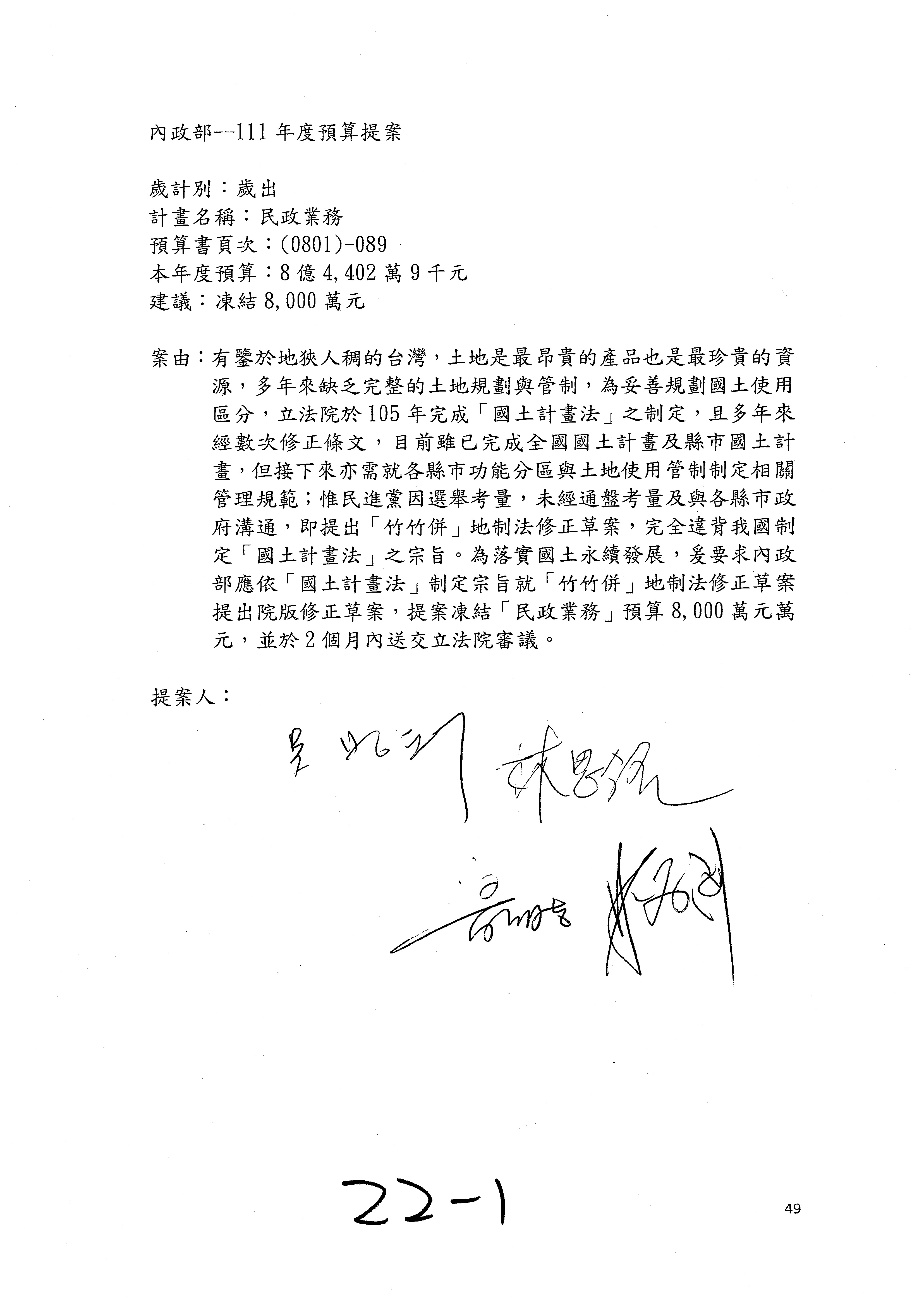 第22之1案第六行之「惟民進黨……之宗旨」等文字予以刪除;另,文字修正為「為落實國土永續發展,爰請內政部針對地方制度國內外案例、我國地方制度法現況與整體國土規劃等進行蒐集研議」;「應依『國土計畫法』制定……立法院審議」等文字予以刪除,其餘照案通過。