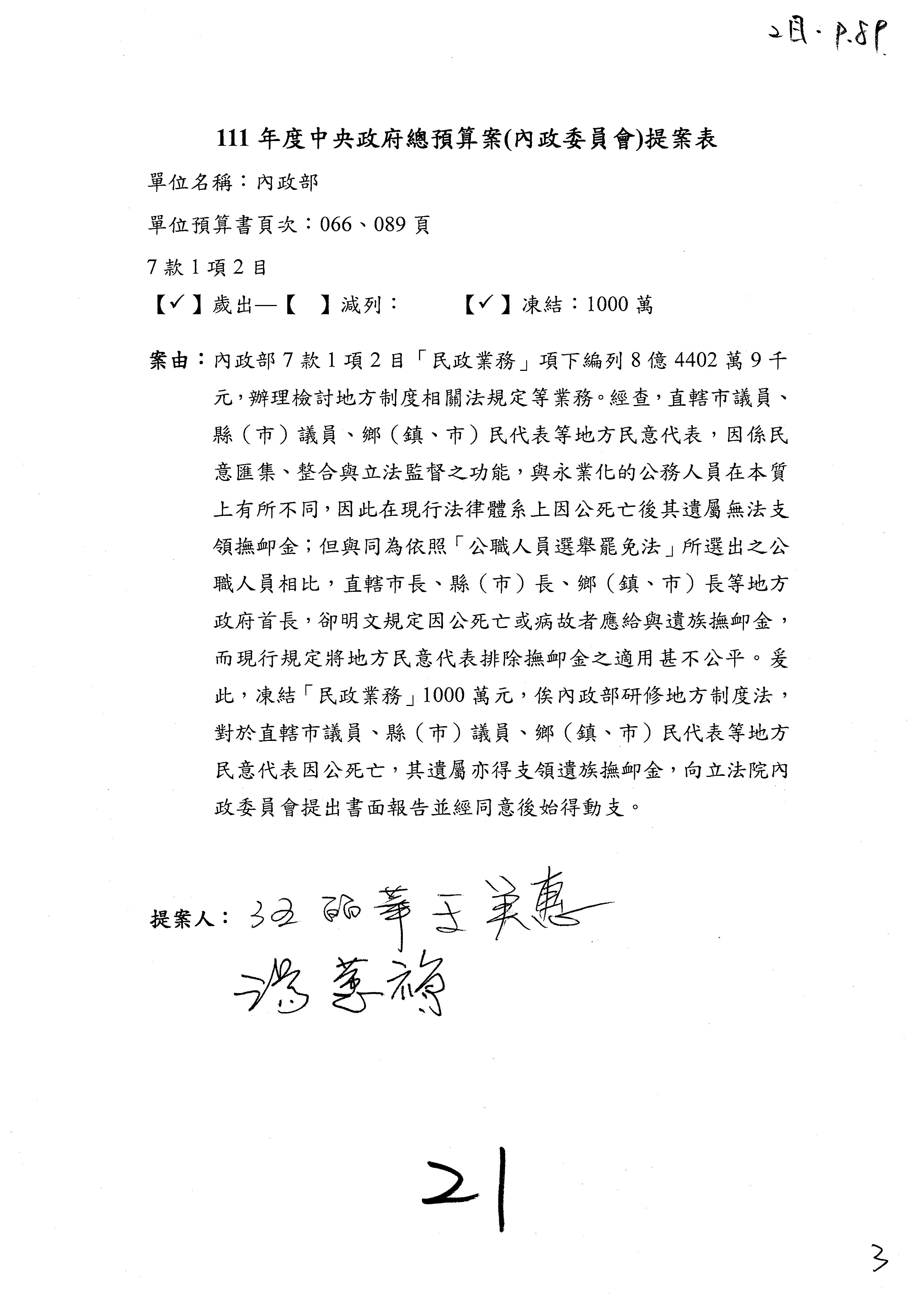 第21案文字修正為「爰請內政部對於直轄市議員、縣(市)議員、鄉(鎮、市)民代表等地方民意代表因公死亡之保障措施,向立法院內政委員會提出書面報告」,其餘文字照案通過。