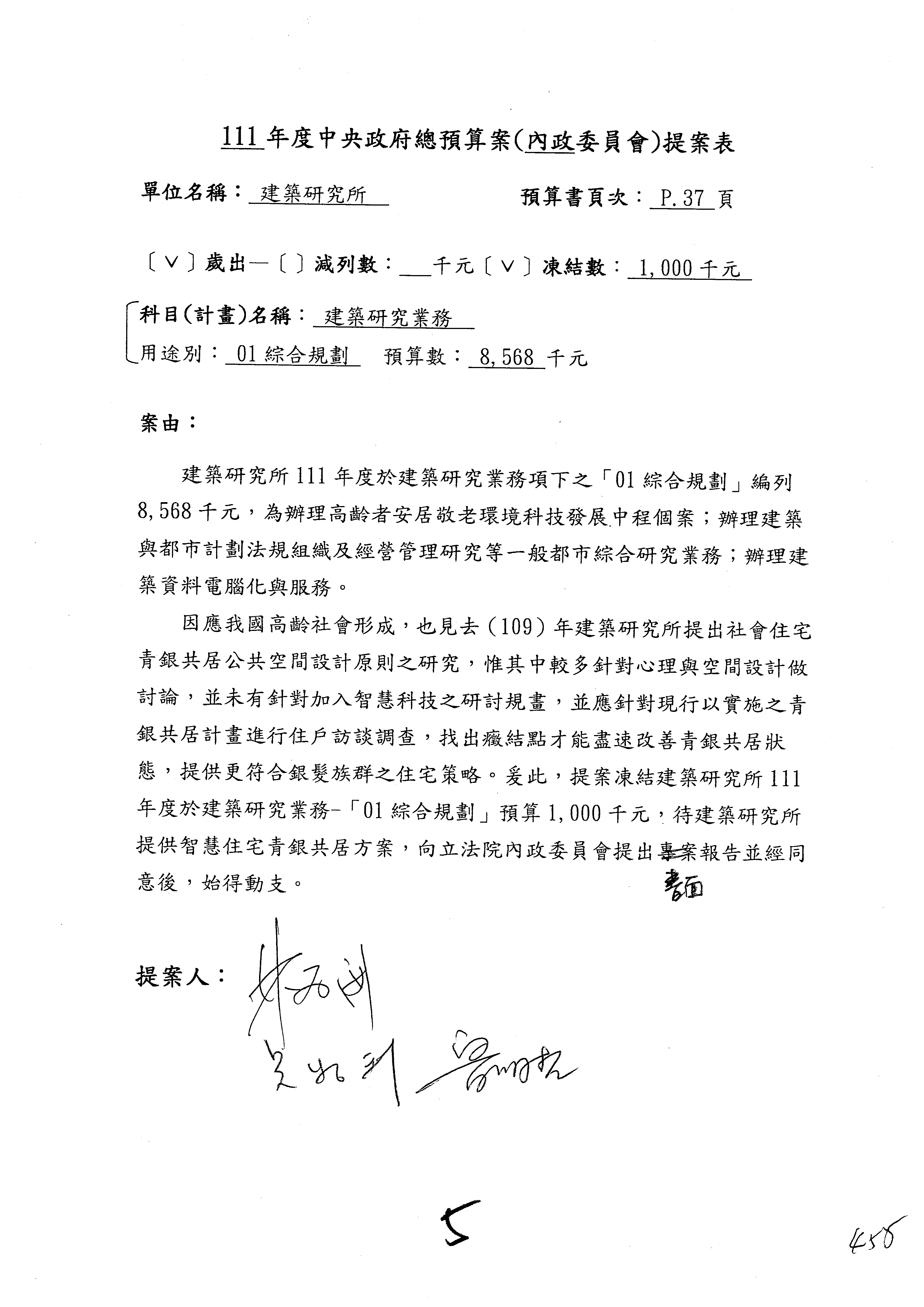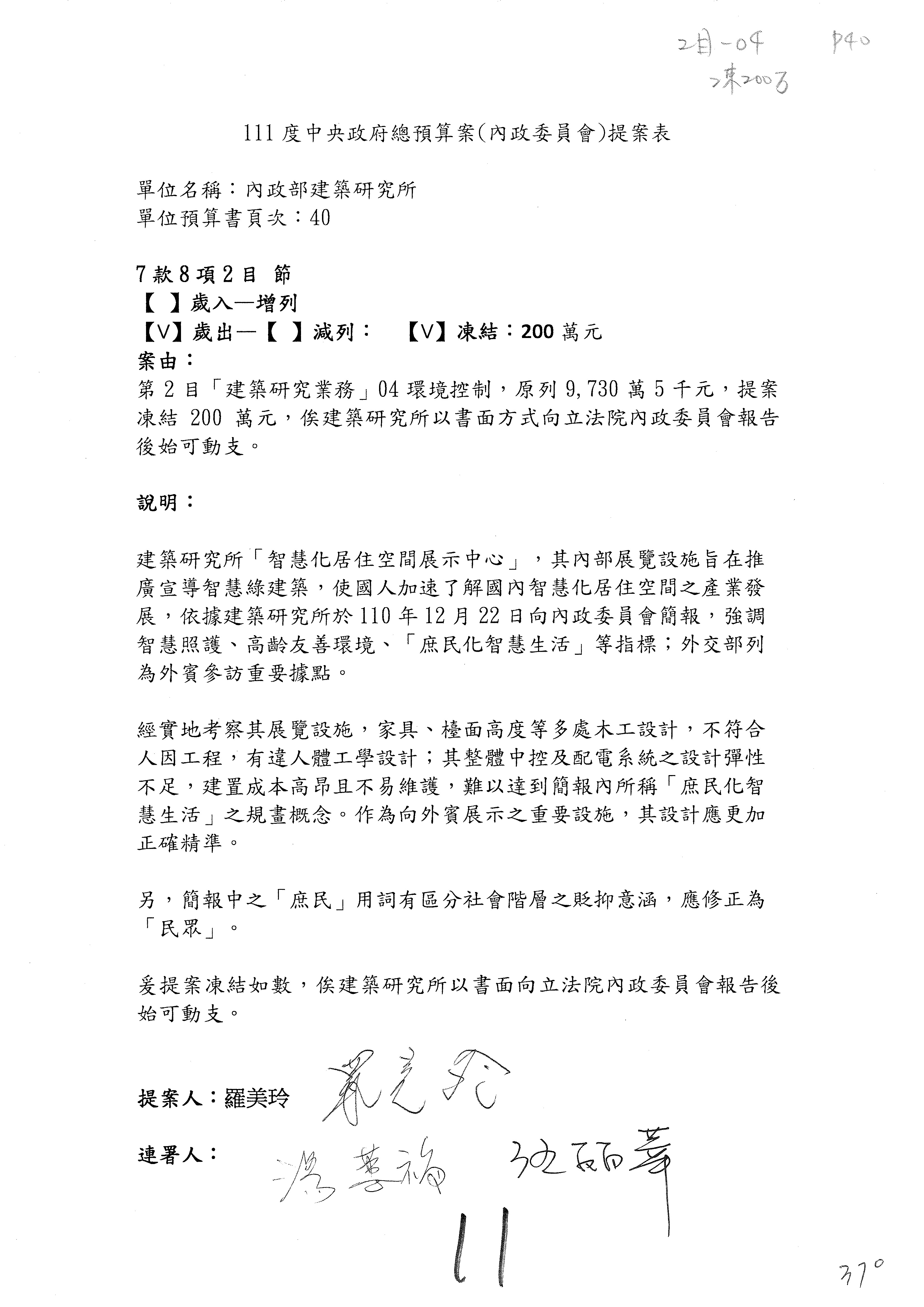 羅委員美玲:我的第11案是針對我們在12月22日去實地考察建築研究所智慧化居住空間展示中心,其內部展覽設施主要是推廣宣導智慧綠建築,讓國人可以加速瞭解國內智慧化居住空間的產業發展,另外還特別強調智慧照護、高齡友善環境,然後還有庶民化智慧生活等指標,可是實地考察之後,發現其所展覽的設施,不管是家具、檯面高度等多處木工設計其實都不符合人體工學,其中整體中控及配電系統的彈性設計不足,而且成本非常高昂,不容易維護,因此很難達到他們簡報提到所謂庶民化智慧生活規劃的概念,所以要向外賓展示這些重要設施,其設計應該更加正確、精準,而且簡報一再強調「庶民」,該用詞讓人覺得是不是有社會階層的貶抑意涵,是不是可以修正而不要用庶民化?這個用語在做簡報的時候,聽起來覺得怪怪的。所以建築研究所還是要以書面向內政委員會報告,尤其針對設施的部分,因此本席凍結200萬元。以上,謝謝。