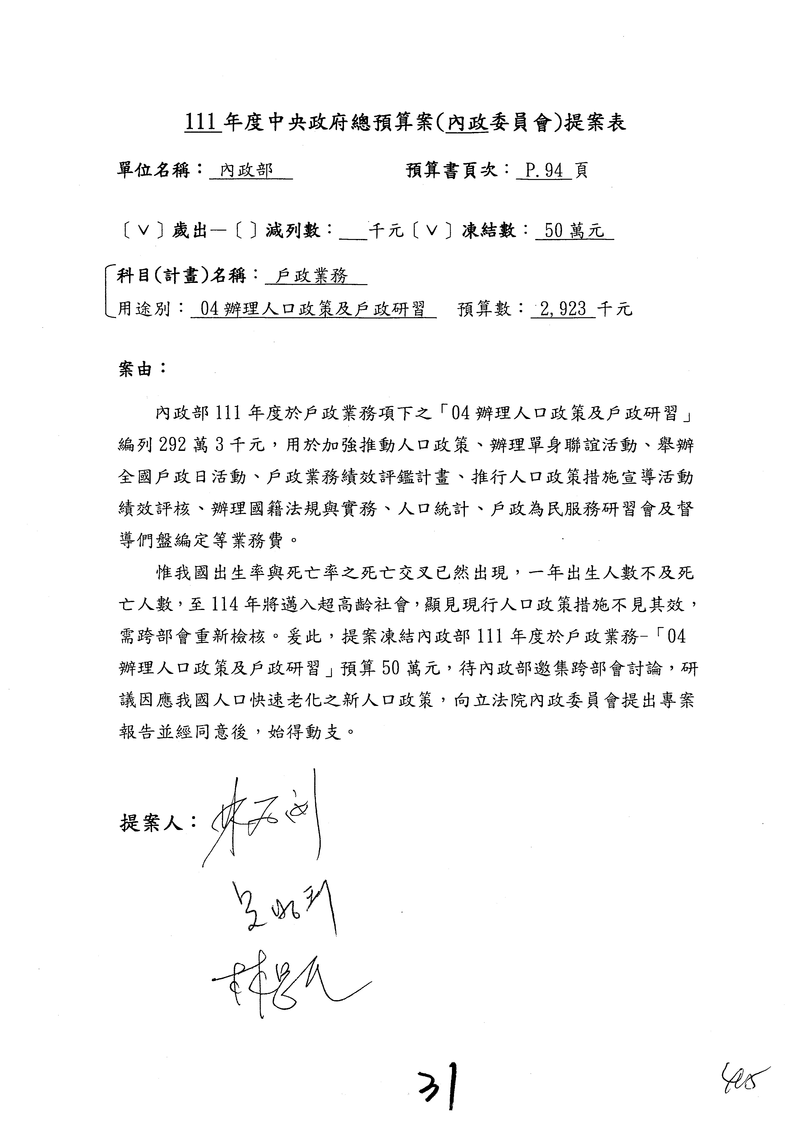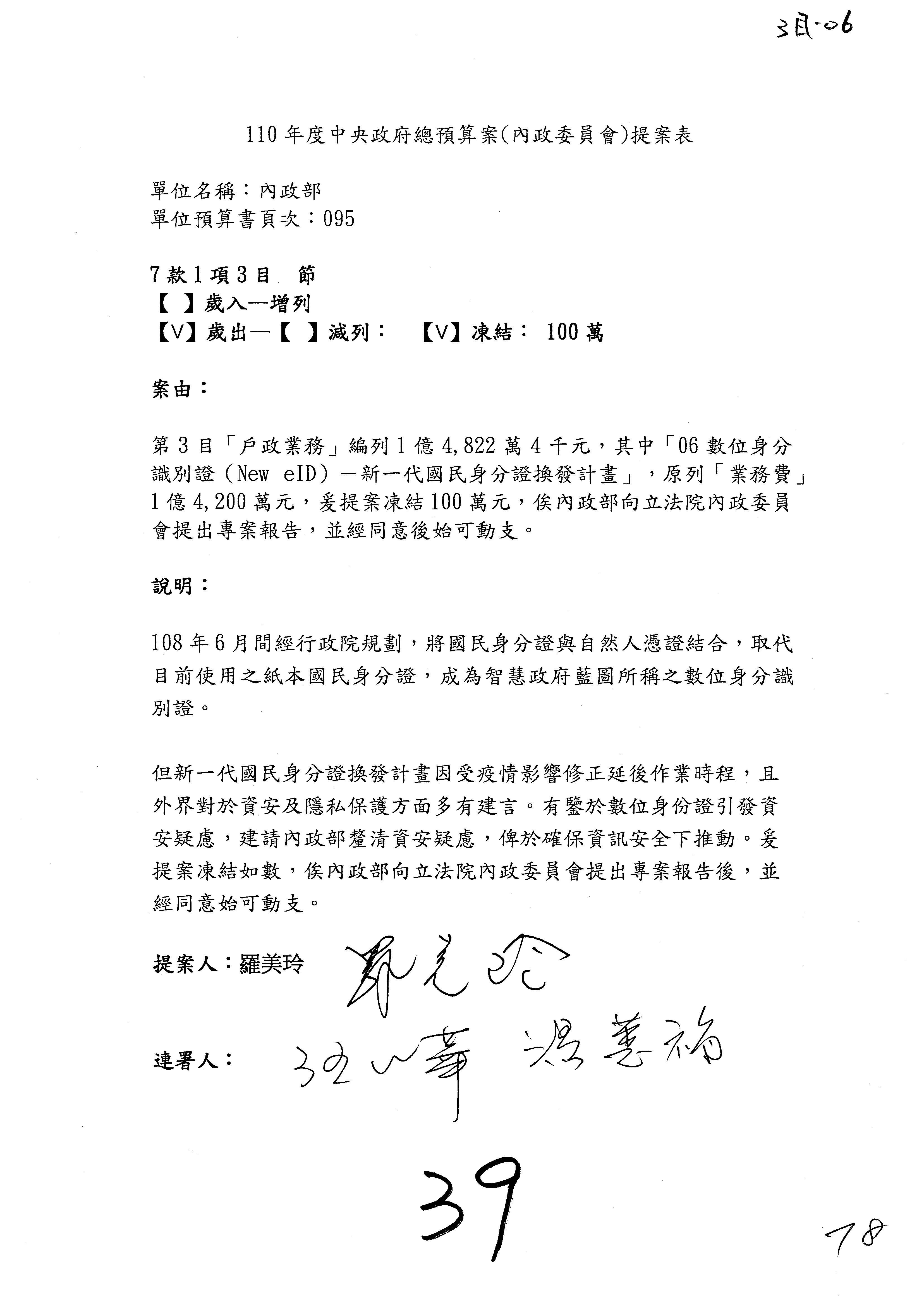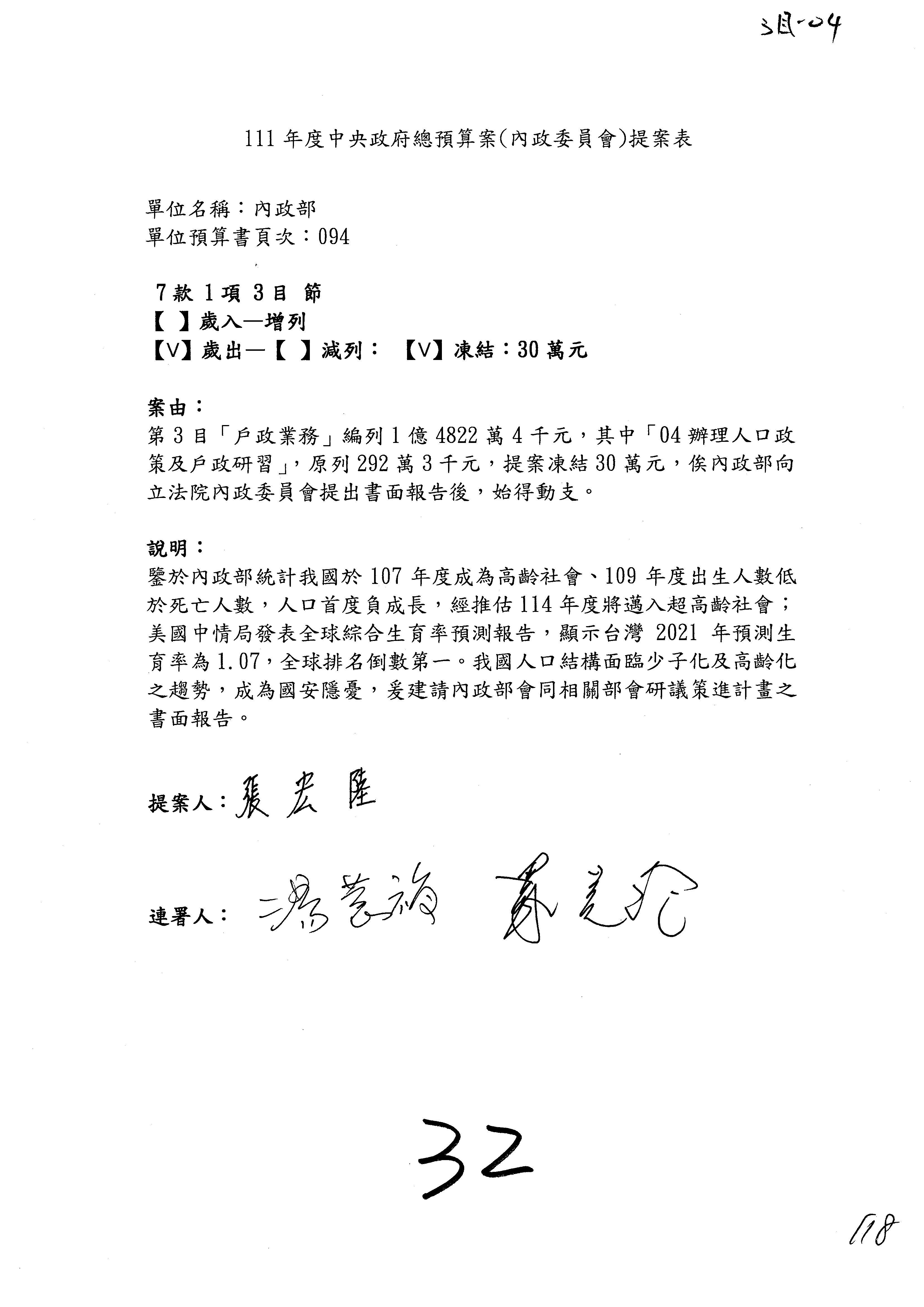 第3目「戶政業務」,第33案至第40案保留;第28案、第29案、第30案均改主決議;第31案及第32案合併處理,凍結10萬元,提出書面報告後,始得動支,其餘預算均照列。