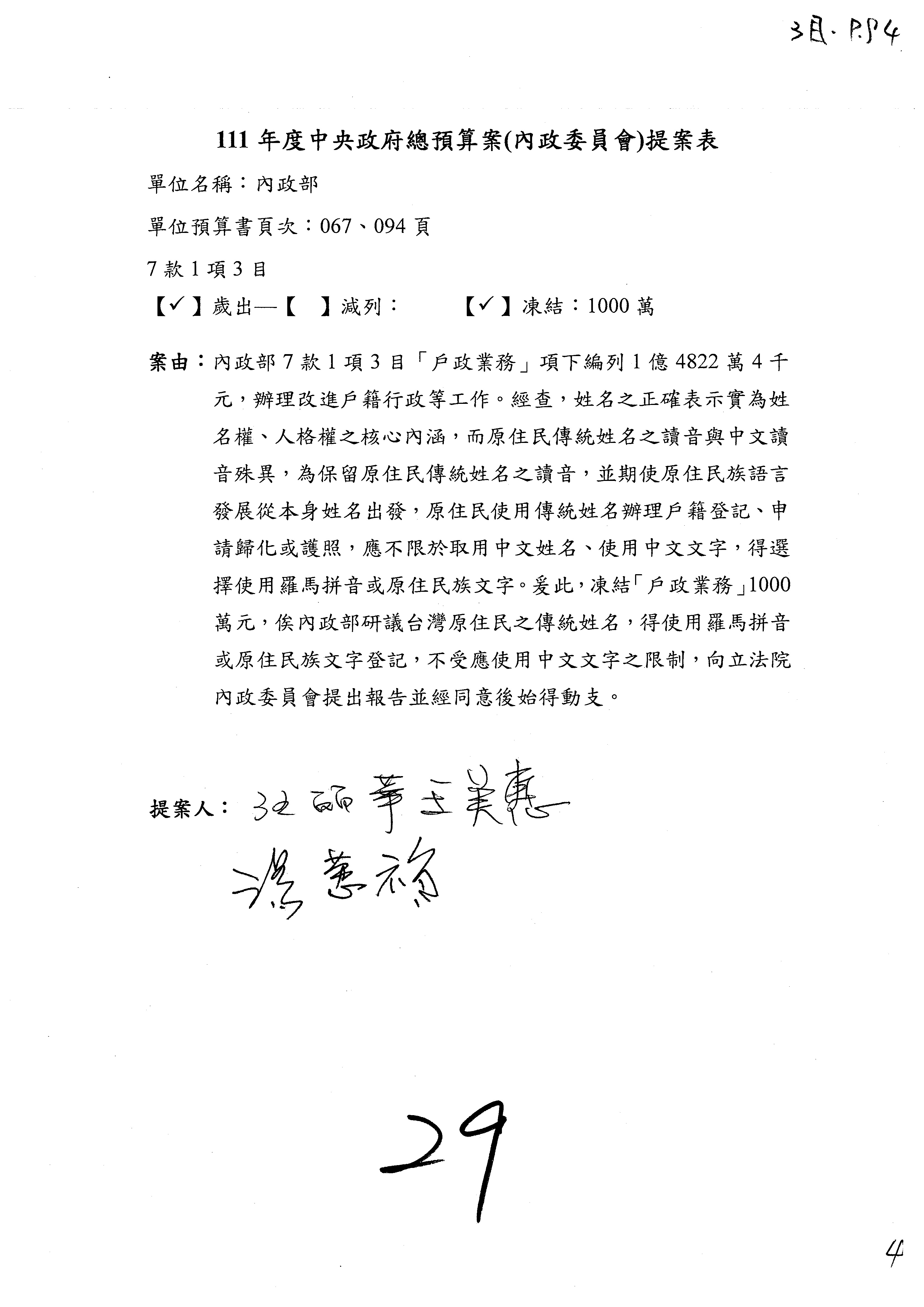 第29案倒數第四行修正為「得選擇使用原住民族文字及羅馬拼音,爰此,請內政部研議臺灣原住民之傳統姓名得使用羅馬拼音或原住民族文字(及羅馬拼音登記),不受應使用中文文字之限制,於三個月內向立法院內政委員提出書面檢討報告」,其餘文字照案通過。