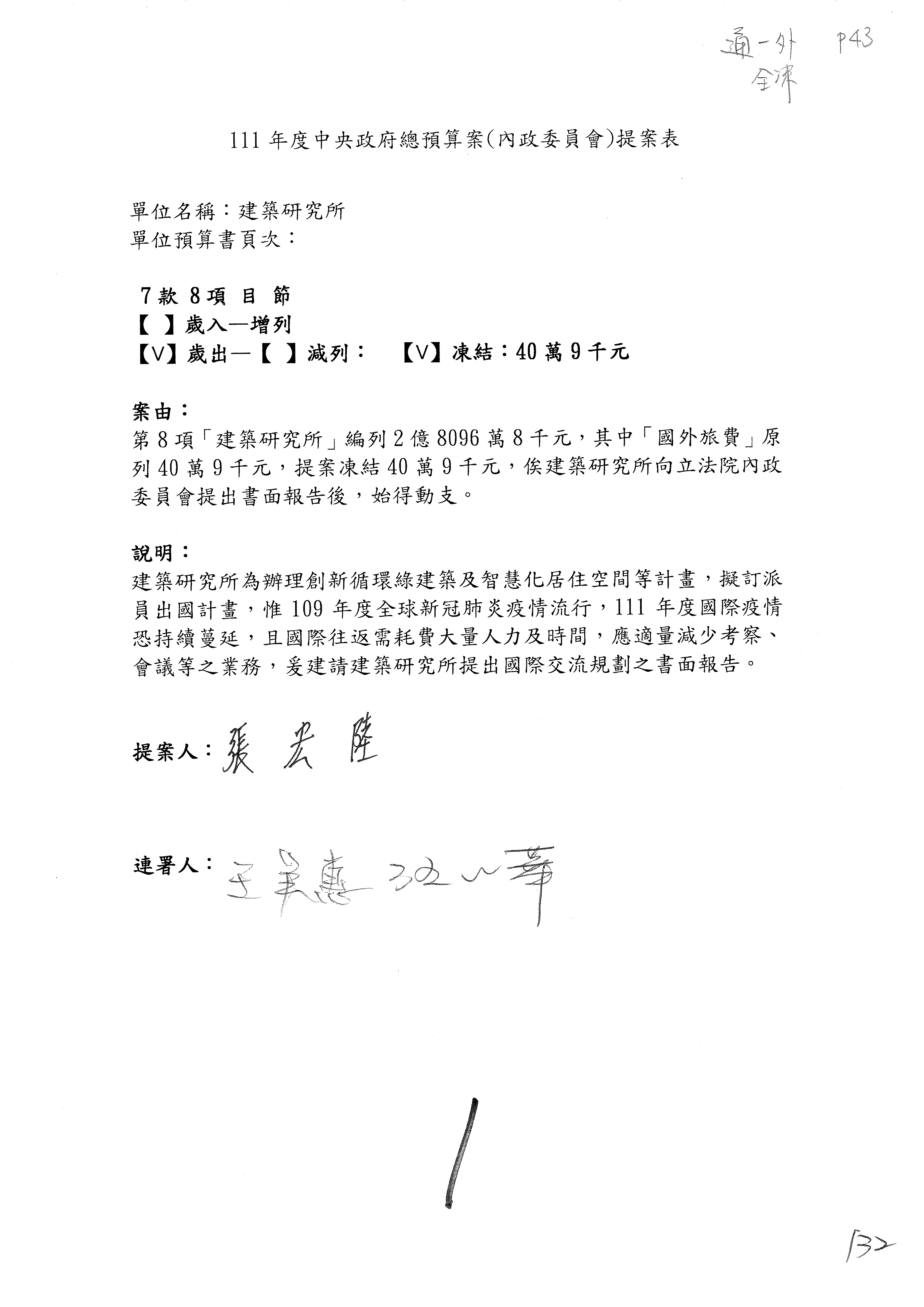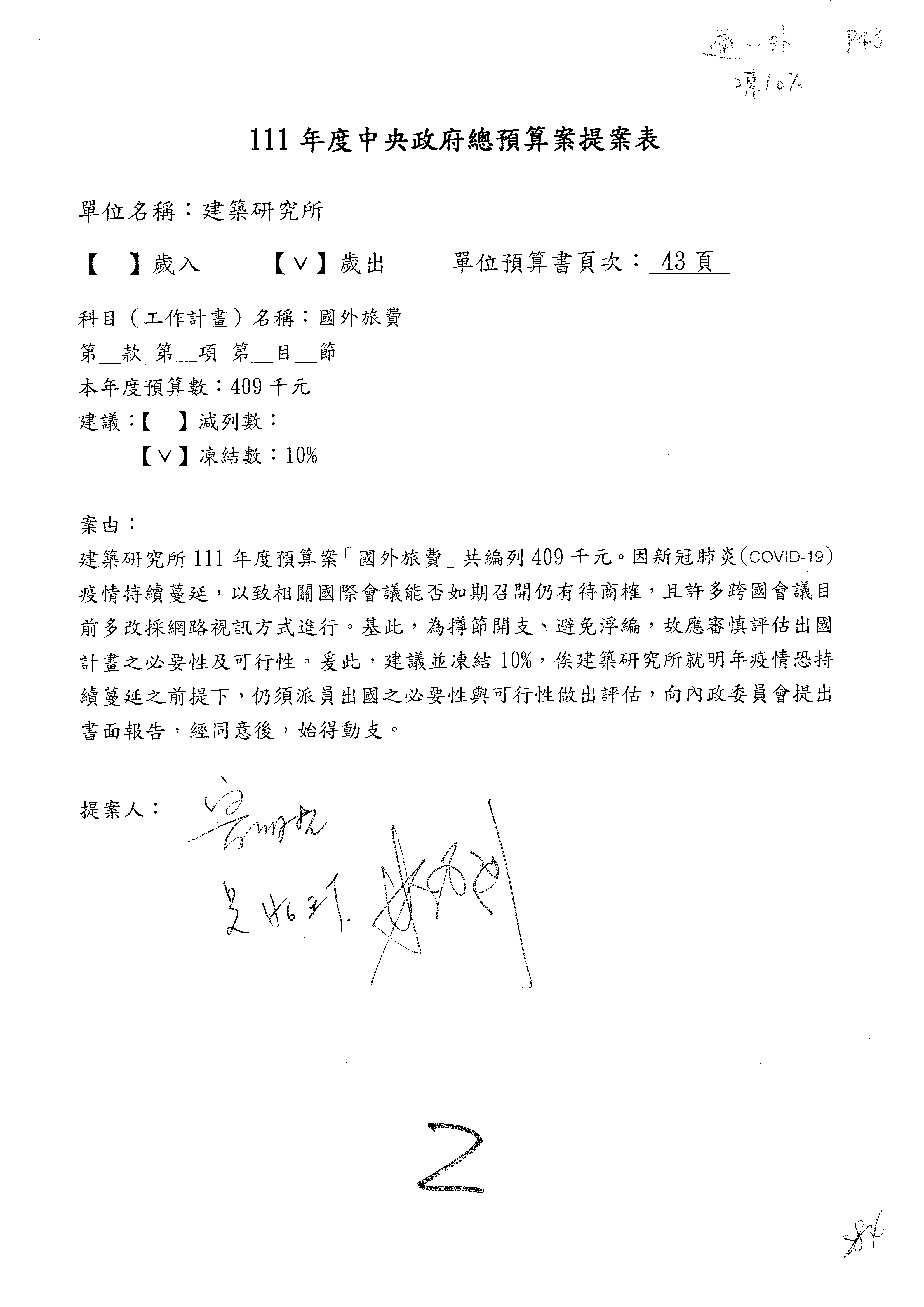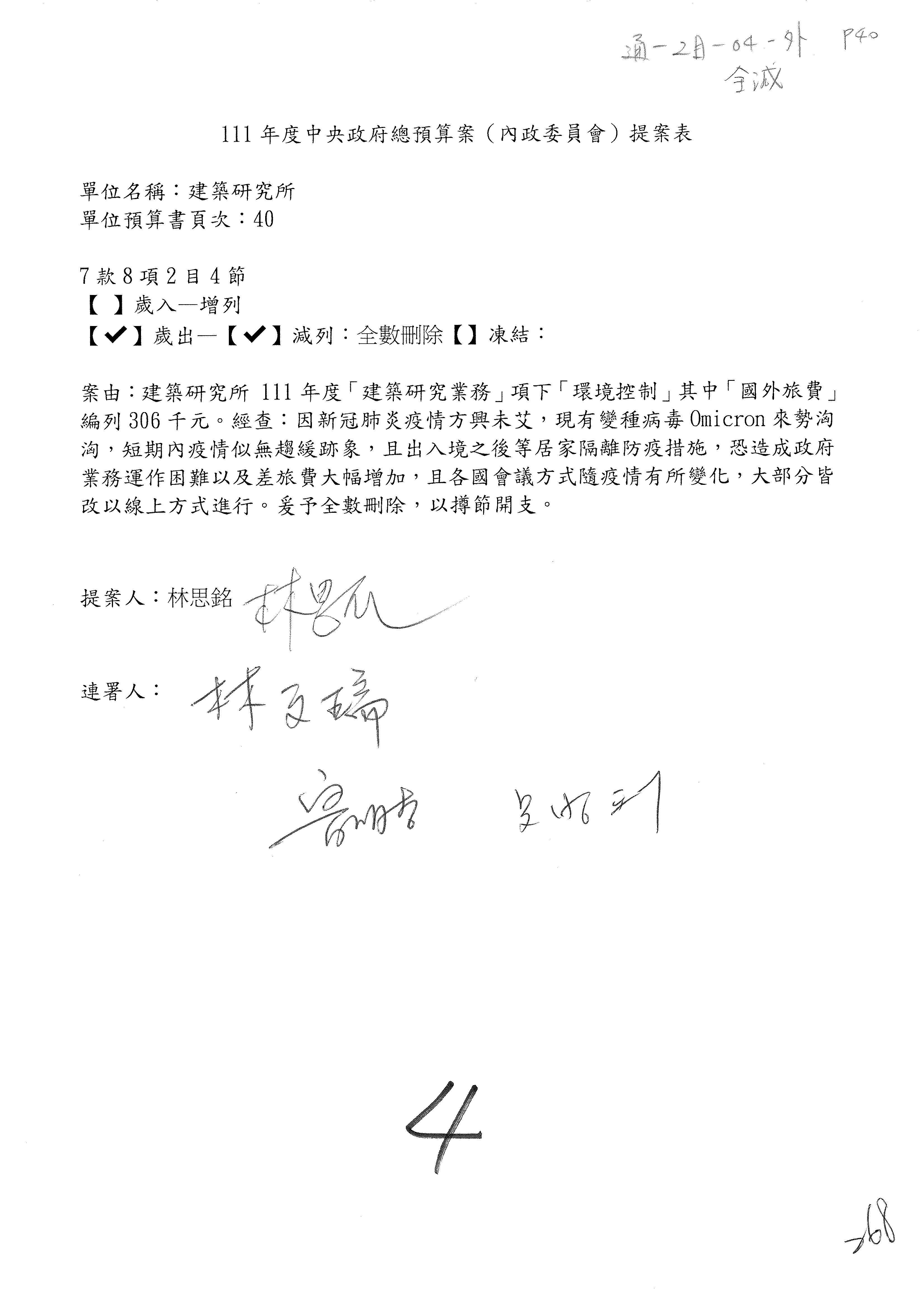 林委員思銘:我的第3案、第4案都是國外旅費,基於疫情的關係,現在到底有沒有出國的必要?這部分待會請建築研究所說明,如果真的有必要,也可以改成凍結。