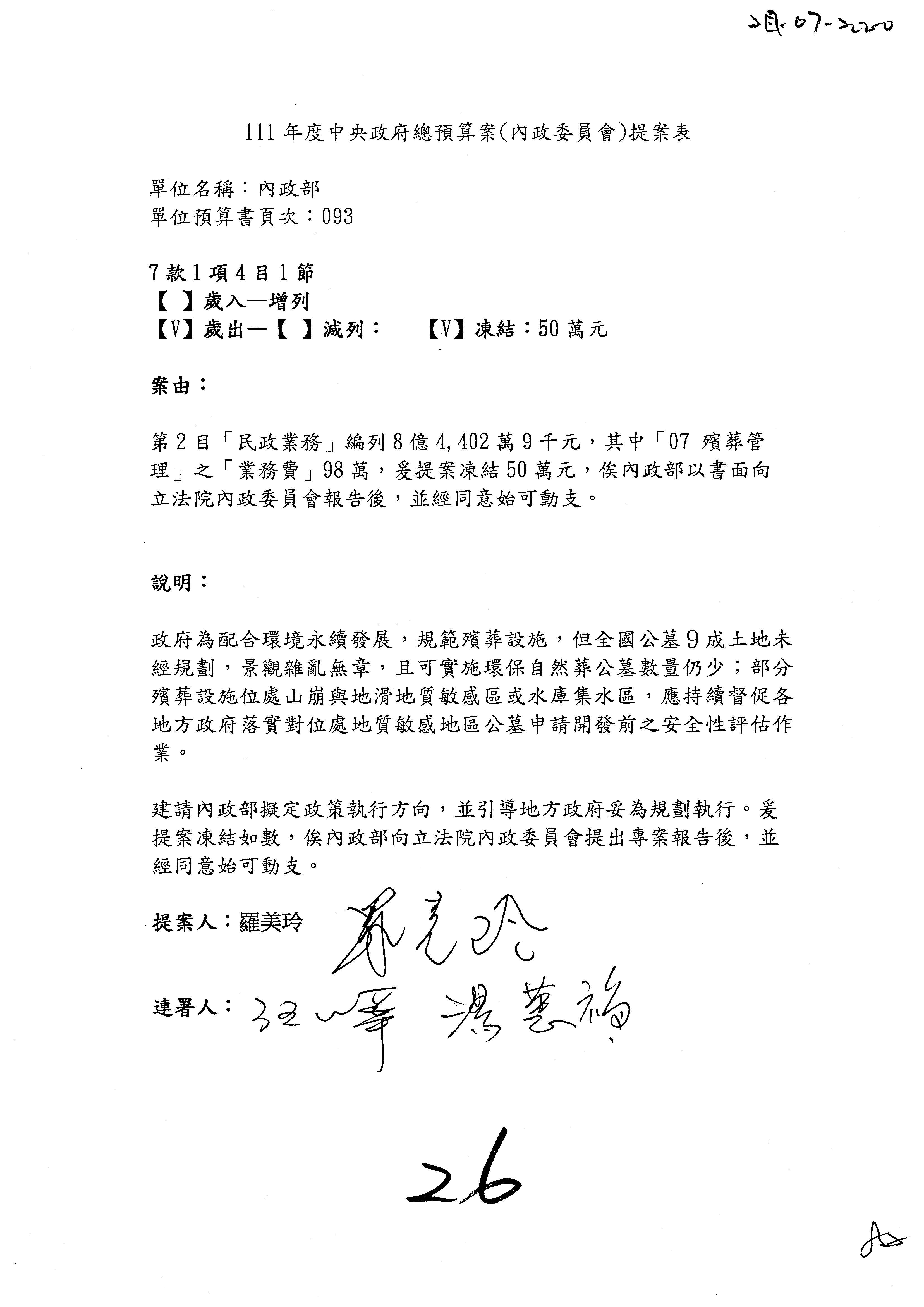 第26案說明倒數第二行末句修正為「請內政部向立法院內政委員會提出書面報告」,並刪除「後,並經同意始可動支」之文字,其餘文字照案通過;案由予以刪除。