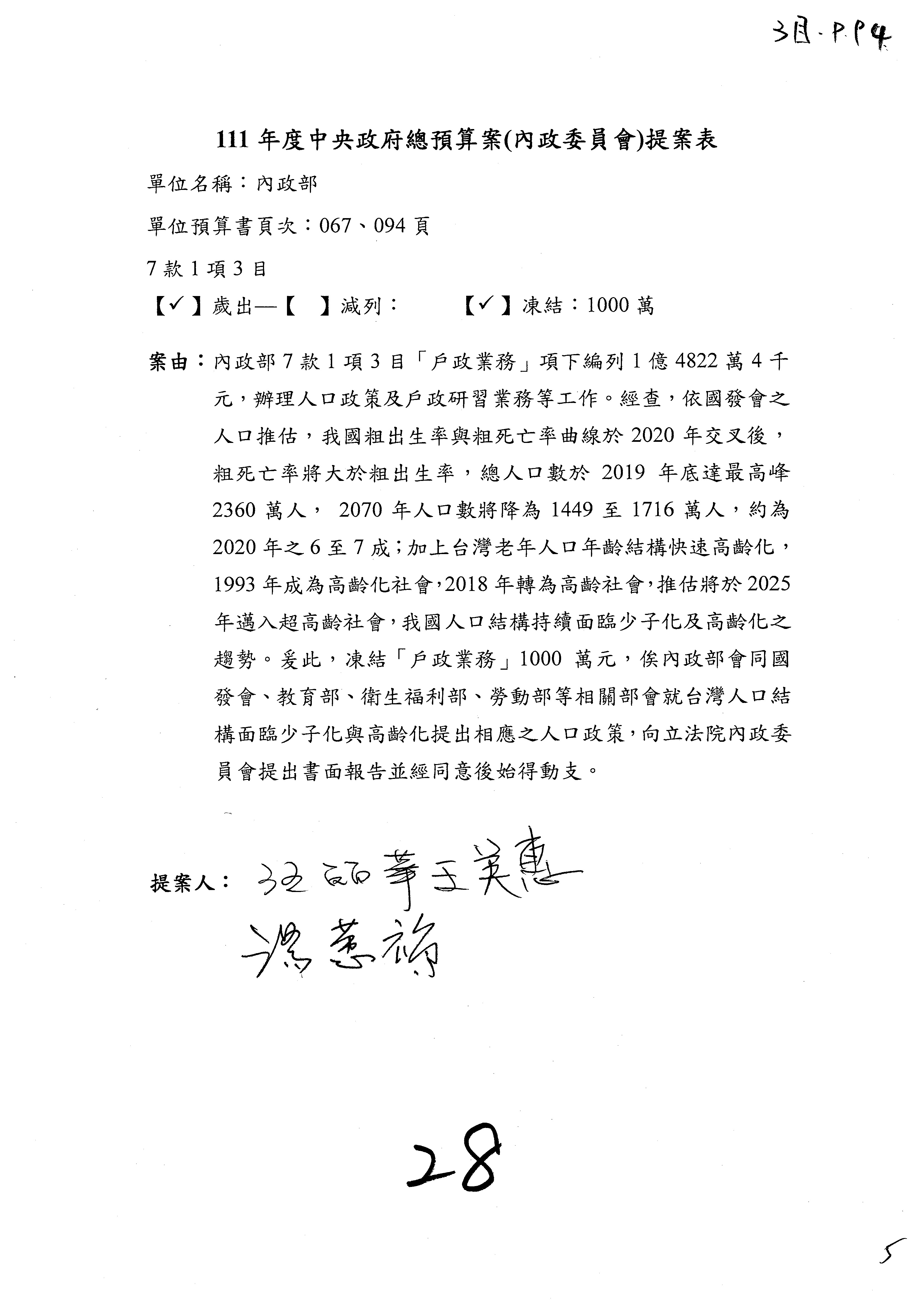 第28案句末修正為「爰此,請內政部就該部因應人口問題相關作為,於三個月內向立法院內政委員會提出書面報告」,其餘文字均照案通過。