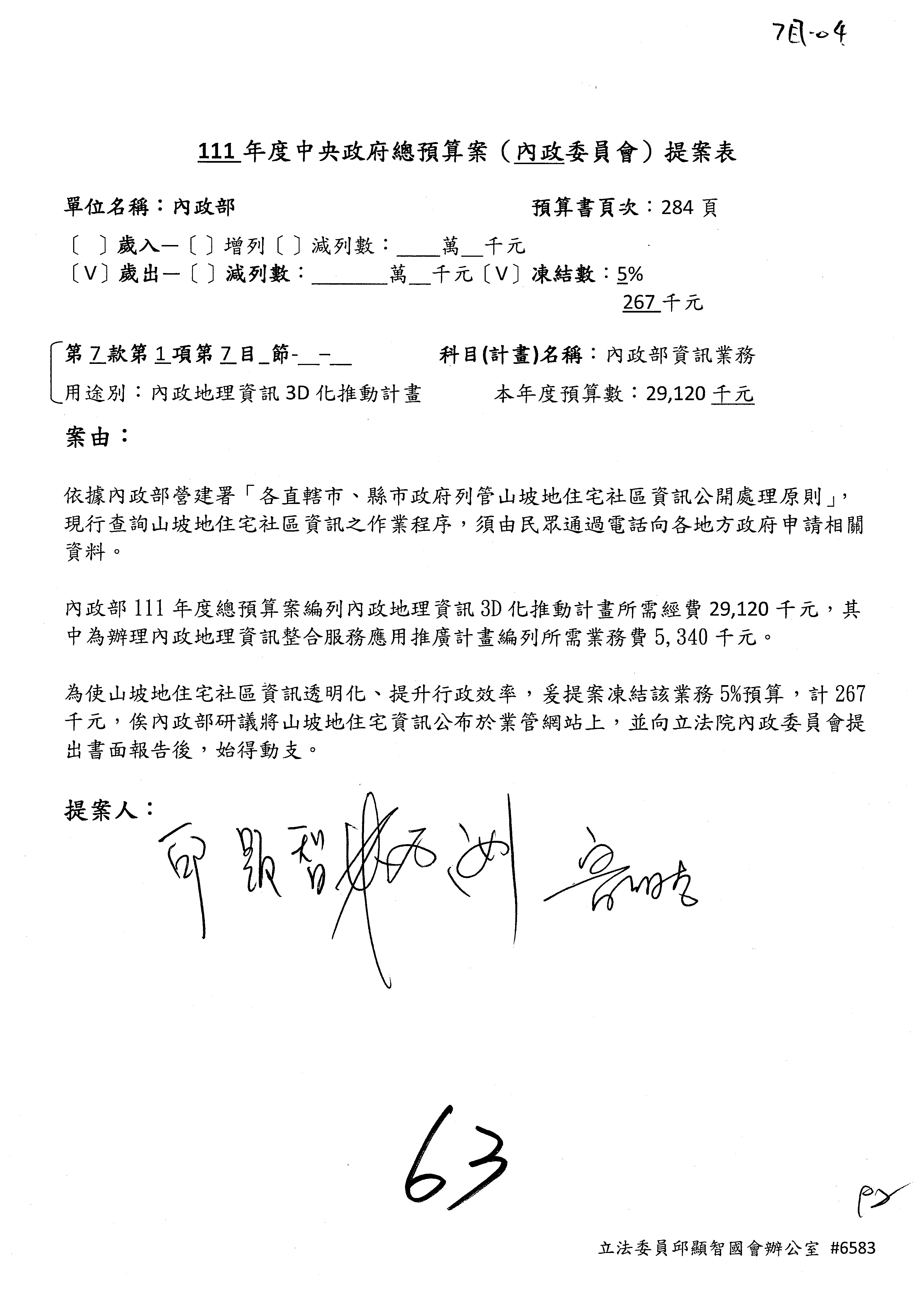 第63案第三段後段修正為「請內政部研議要求地方政府建置列管山坡地住宅社區資訊申辦系統,並於六個月內向立法院內政委員提出書面報告」,其餘文字照案通過。