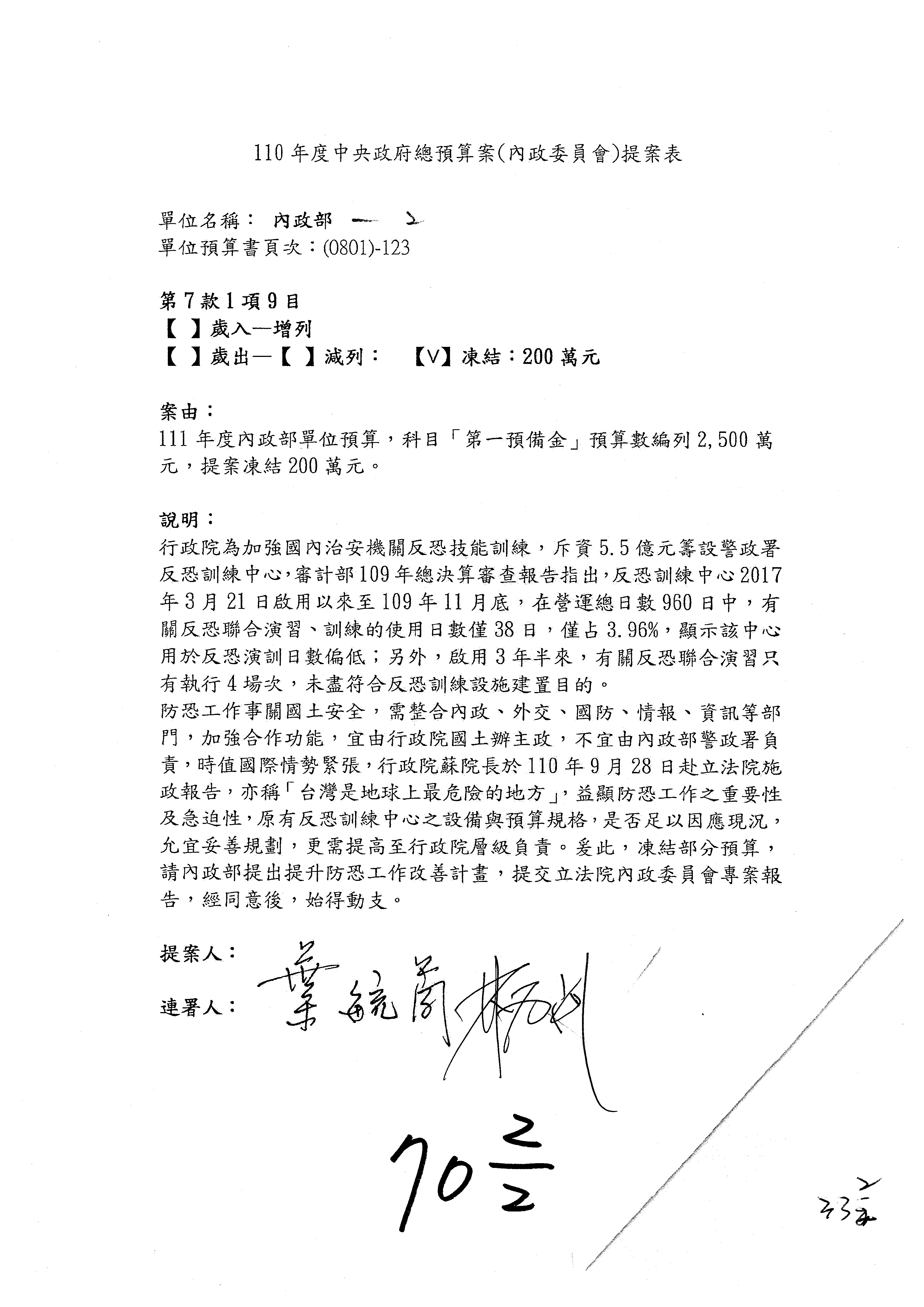 徐部長國勇:跟委員報告,是不是可以不要凍結?因為這實際上是反恐訓練中心的預算,應該是列在警政署那邊,所以建議這部分不要凍結,明天審查警政署預算時,警政署再跟委員詳細說明。因為這個科目是「第一預備金」,如果因為反恐訓練中心的事而凍到第一預備金,變成我們部本部預算也會有些不一樣,所以是不是在審查警政署預算時再處理,這邊就改為主決議或看怎麼處理?好不好?