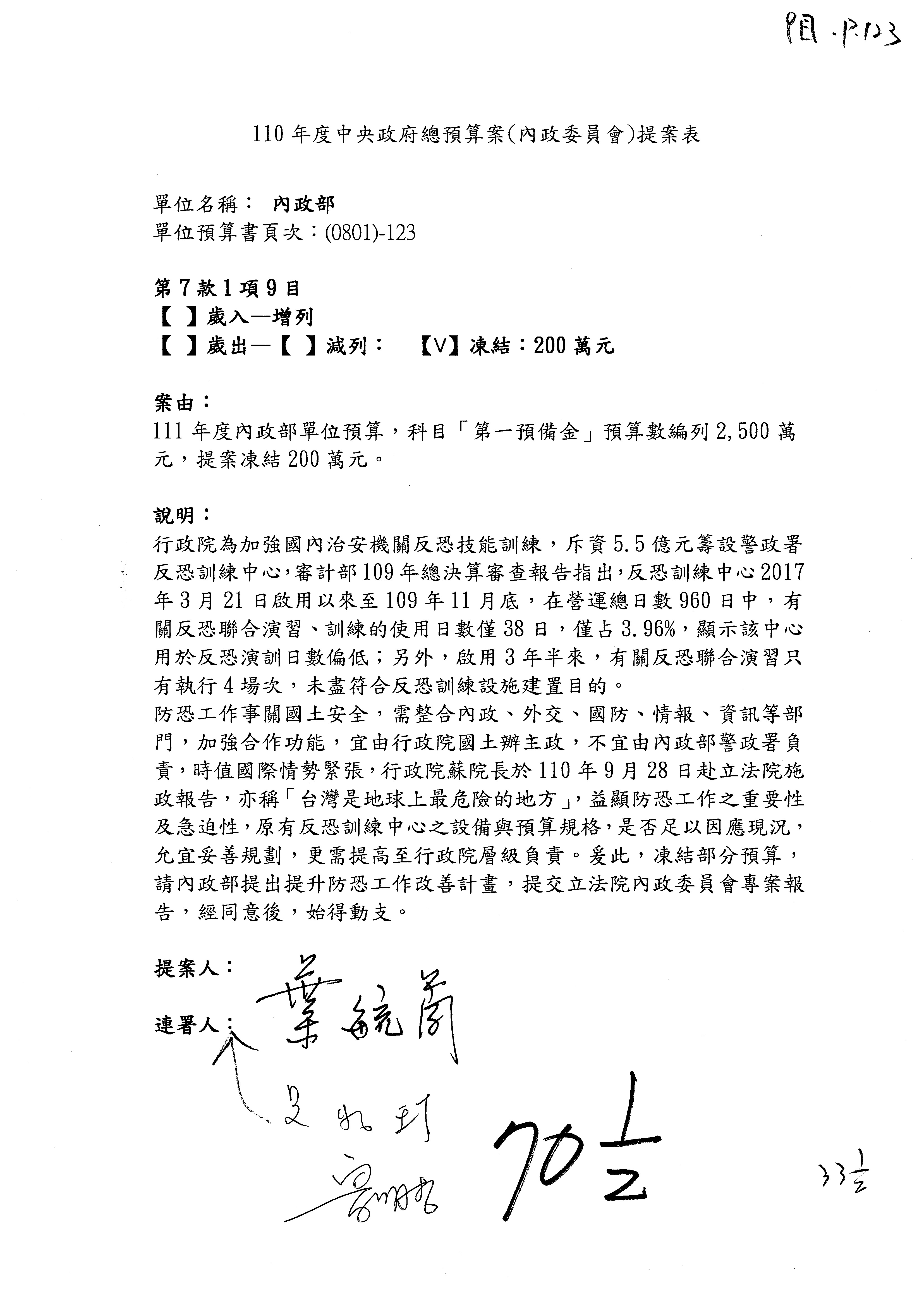 處理第9目「第一預備金」。吳怡玎委員提案凍結200萬元,有沒有問題?