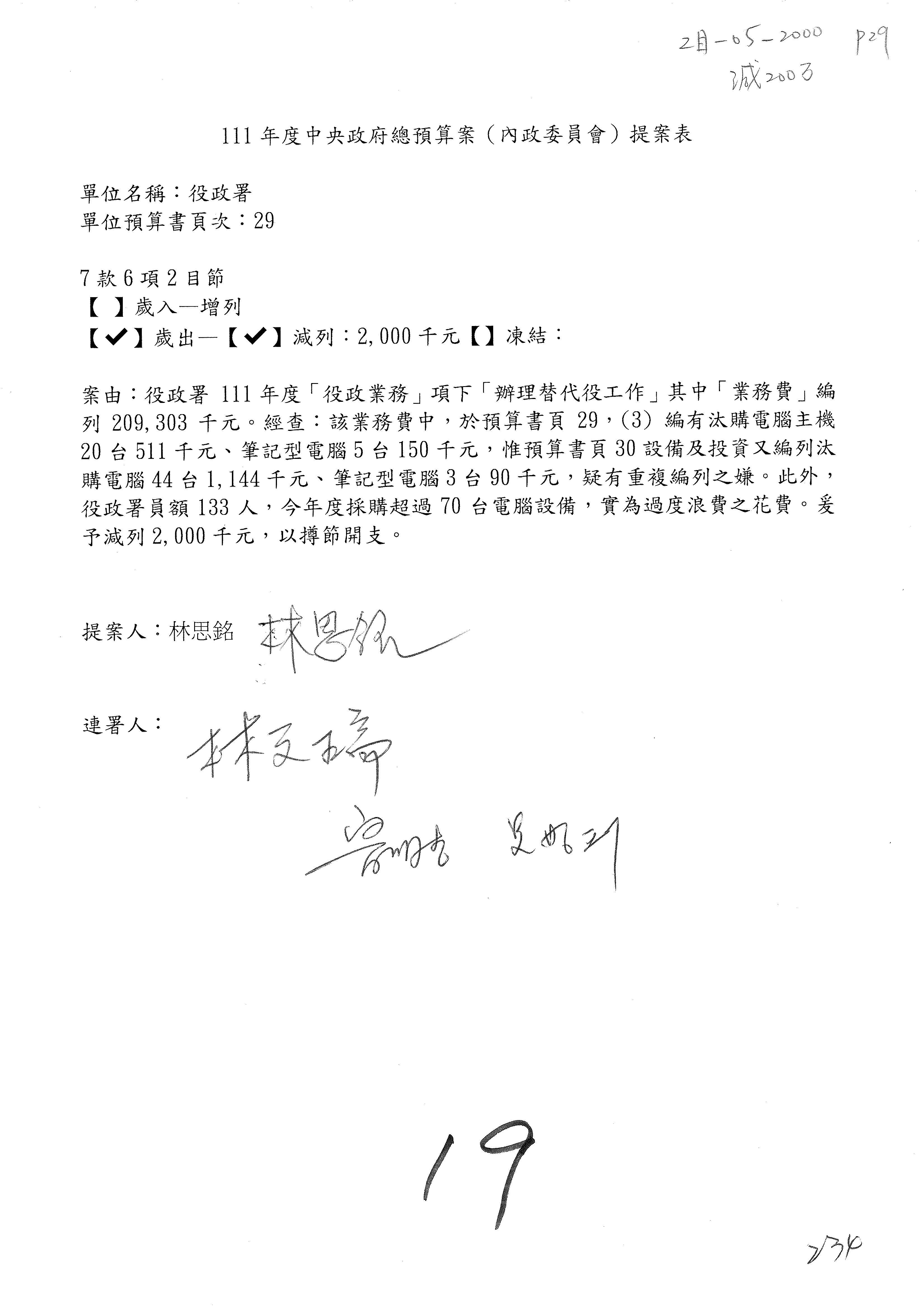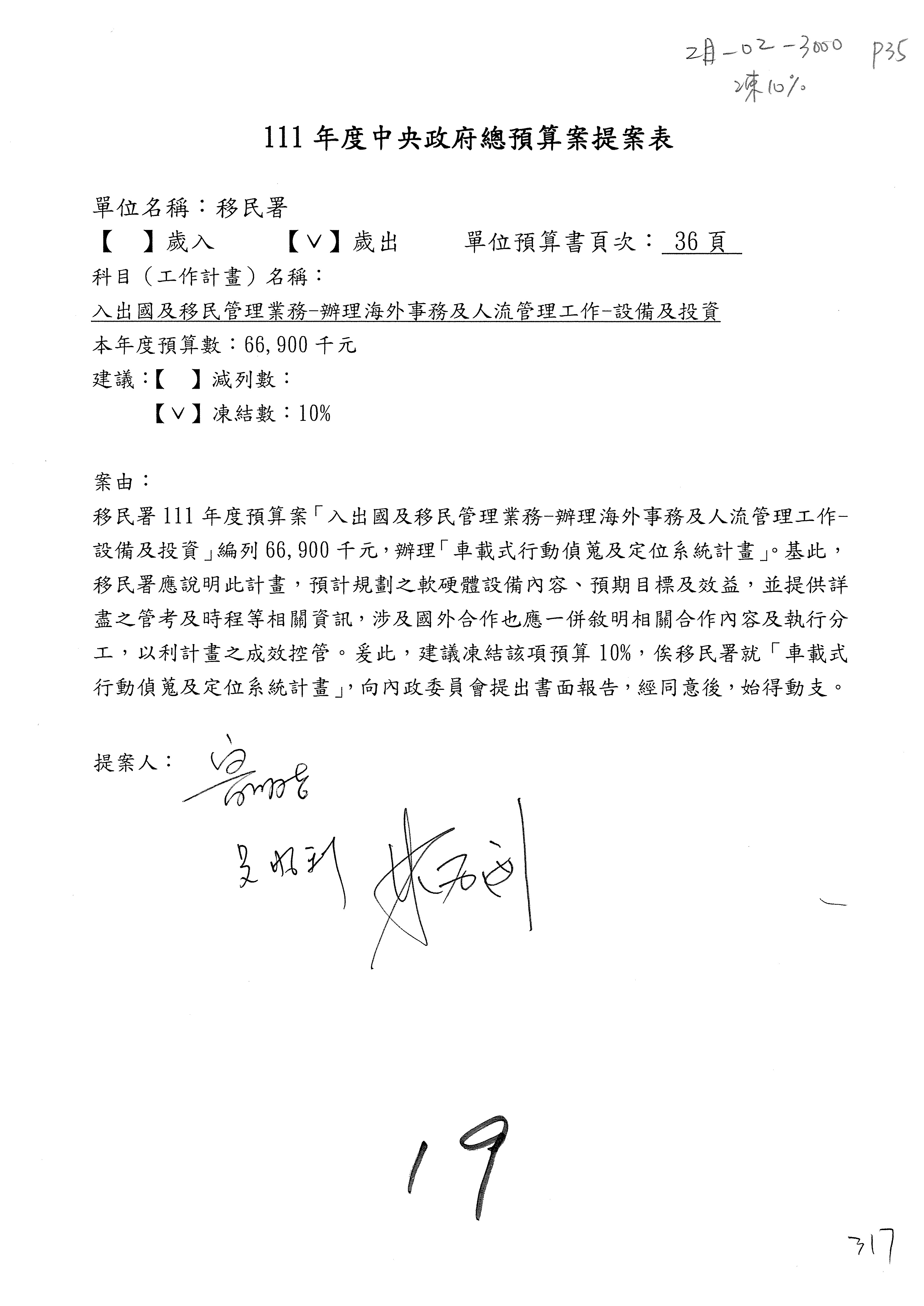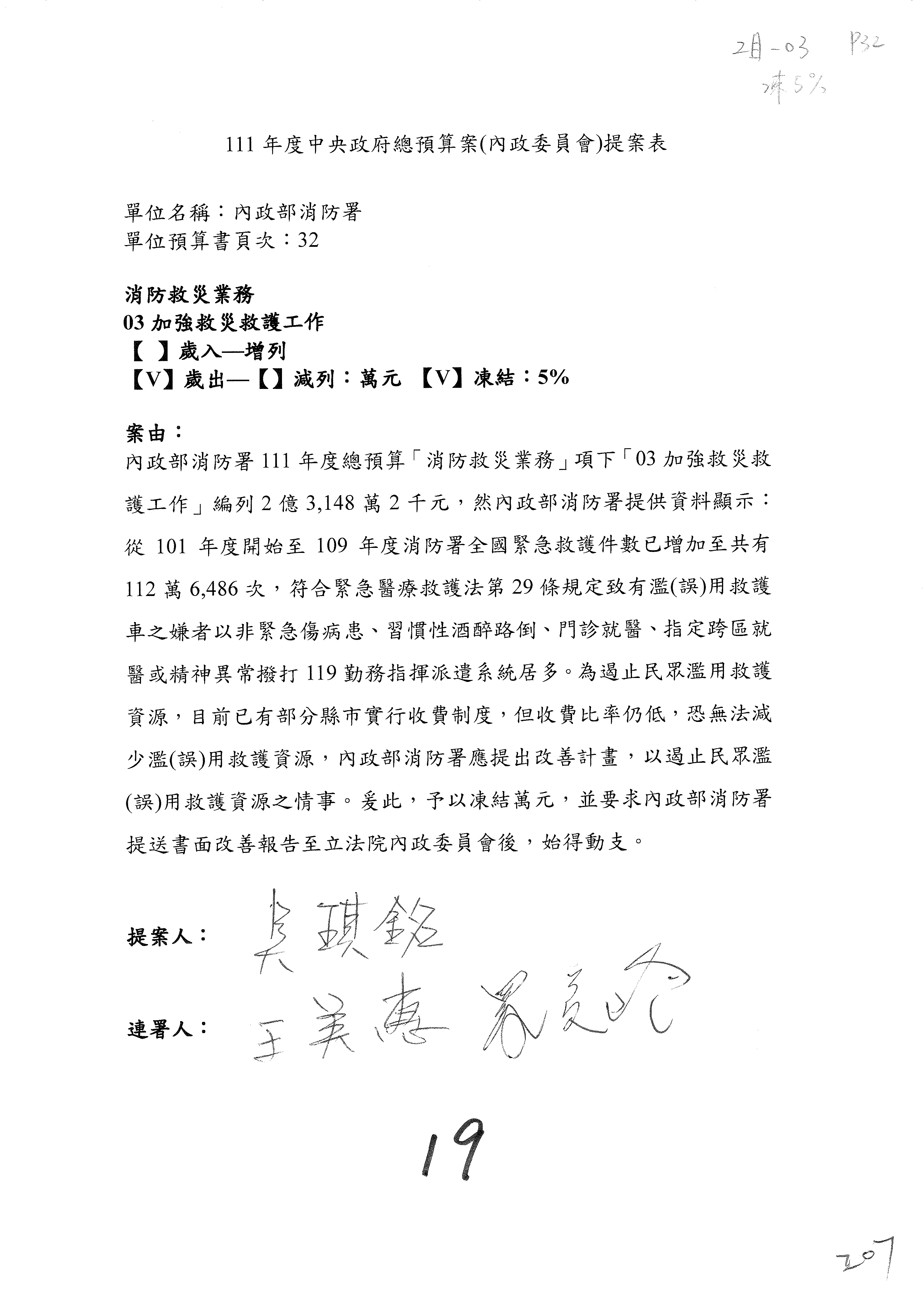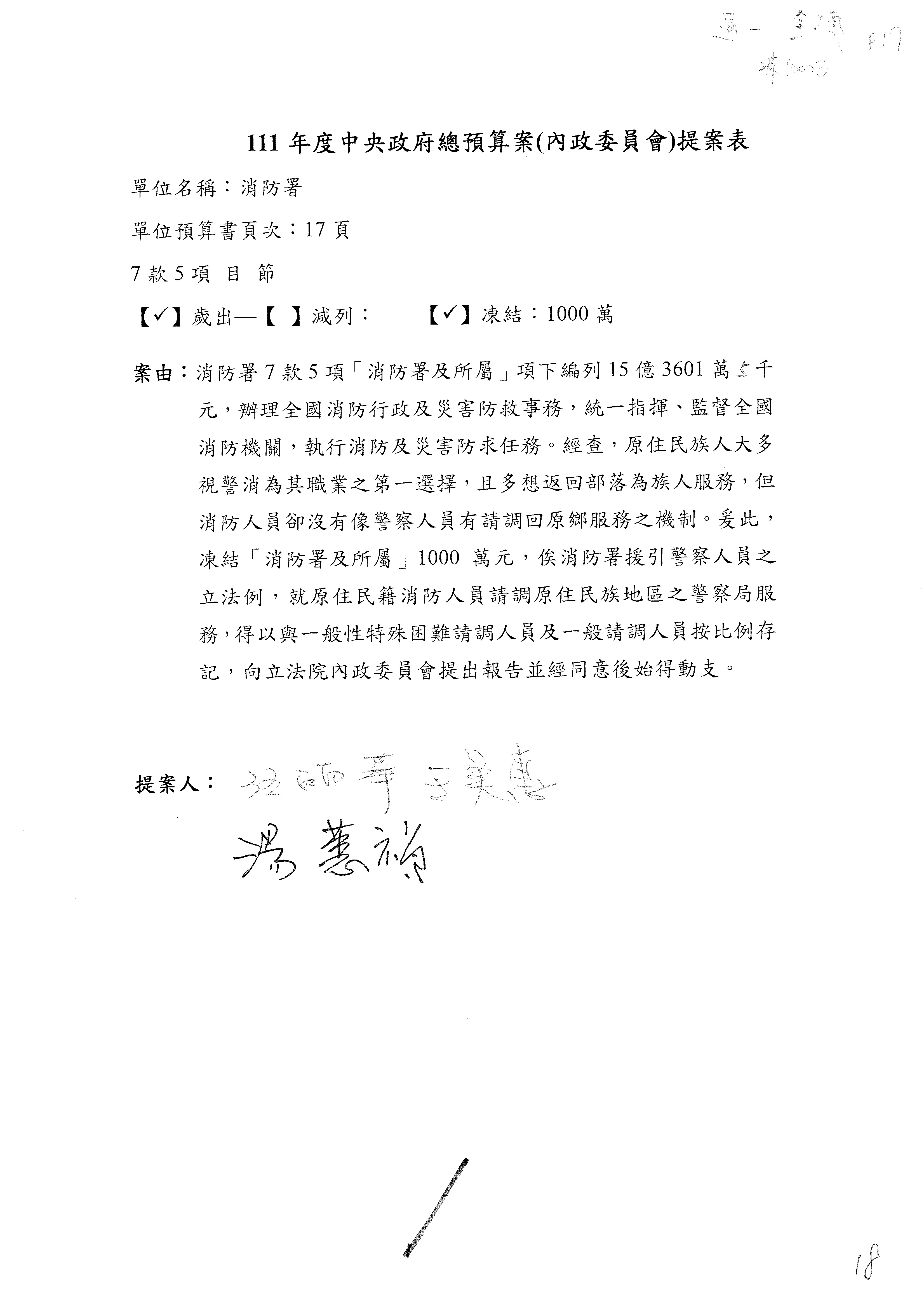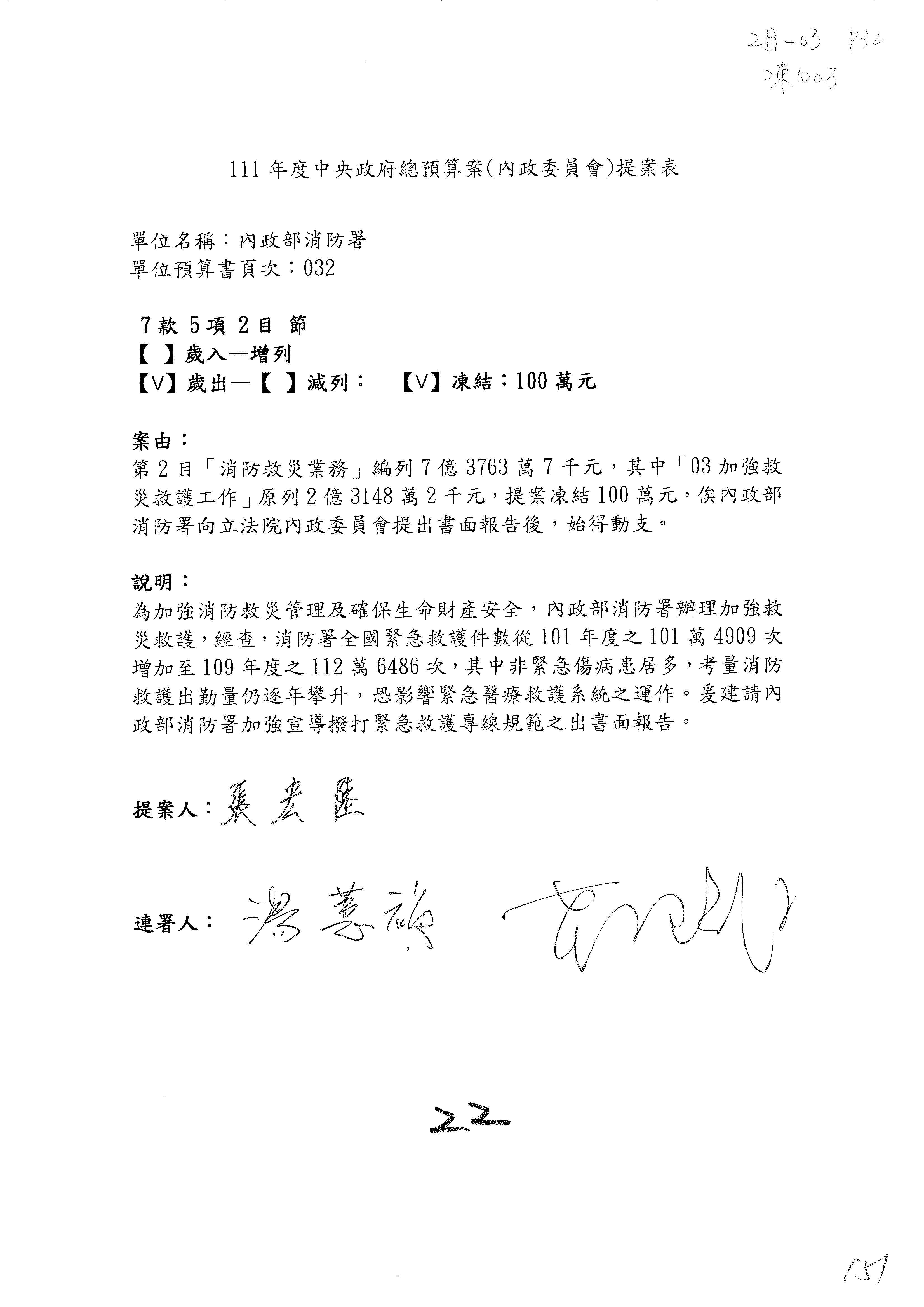第19案已經改成主決議;第20案,改凍結100萬元,提書面報告後,始得動支;第21案,也改主決議;第22案,凍結100萬元,提書面報告。這個OK啦!都可以。