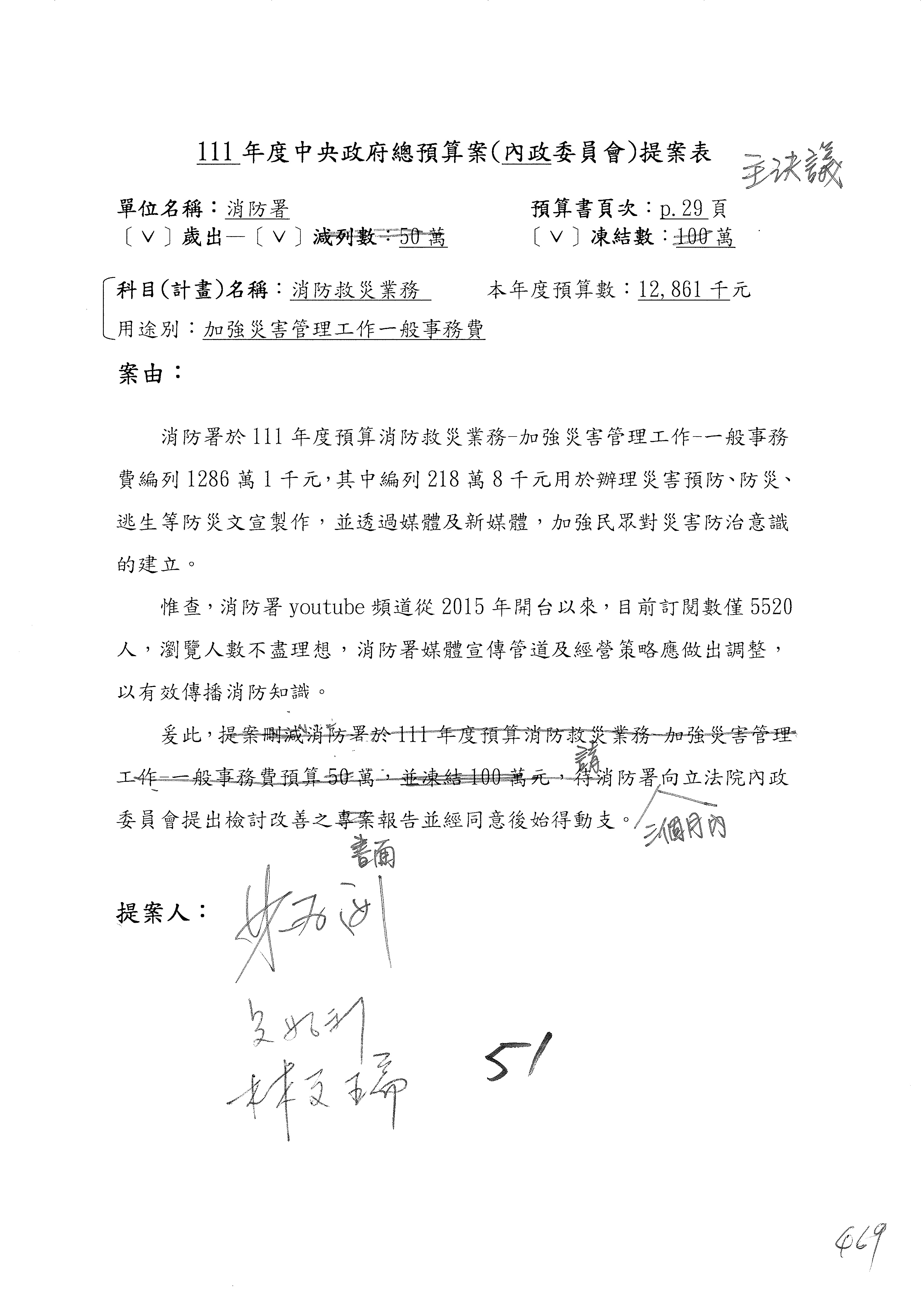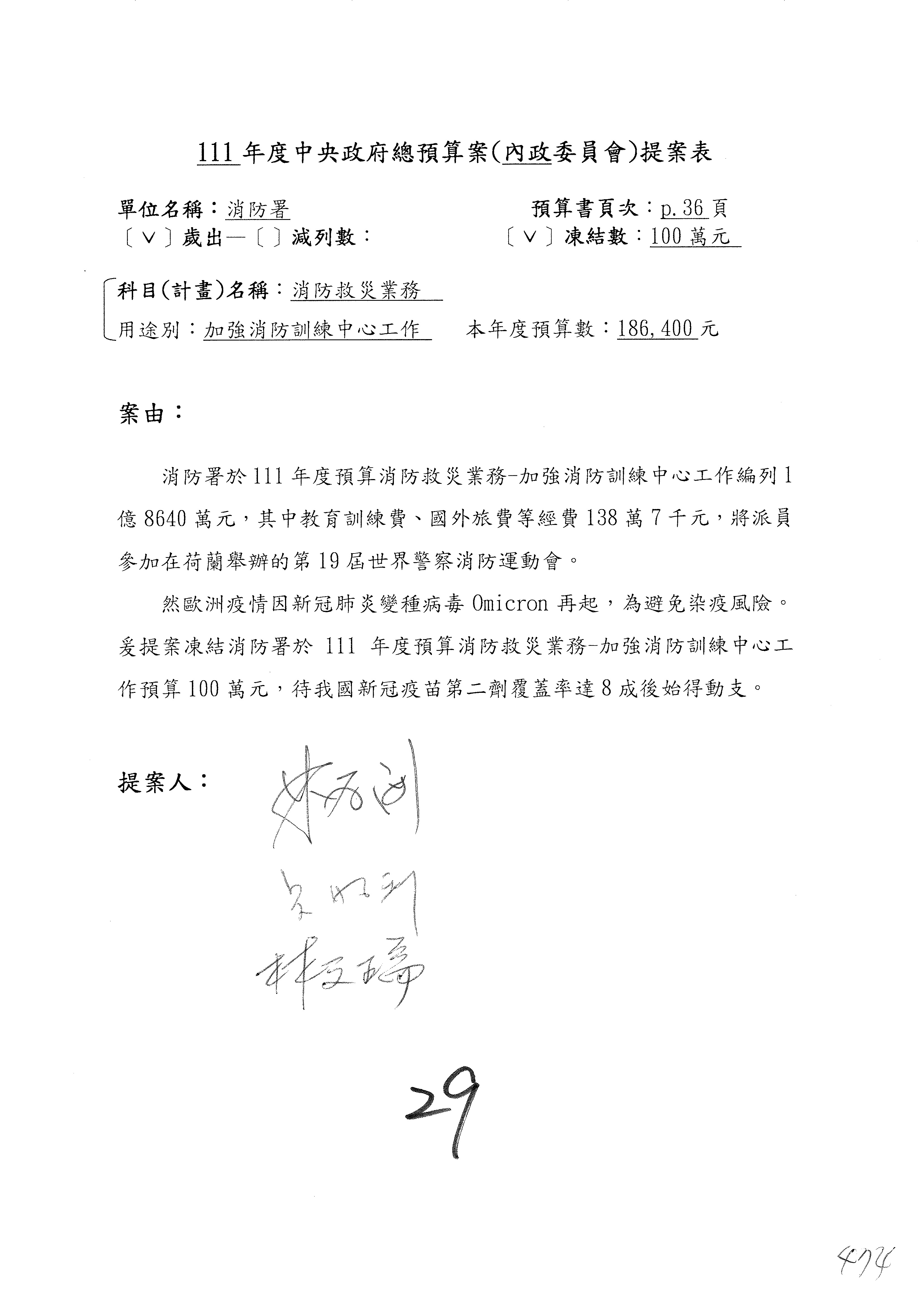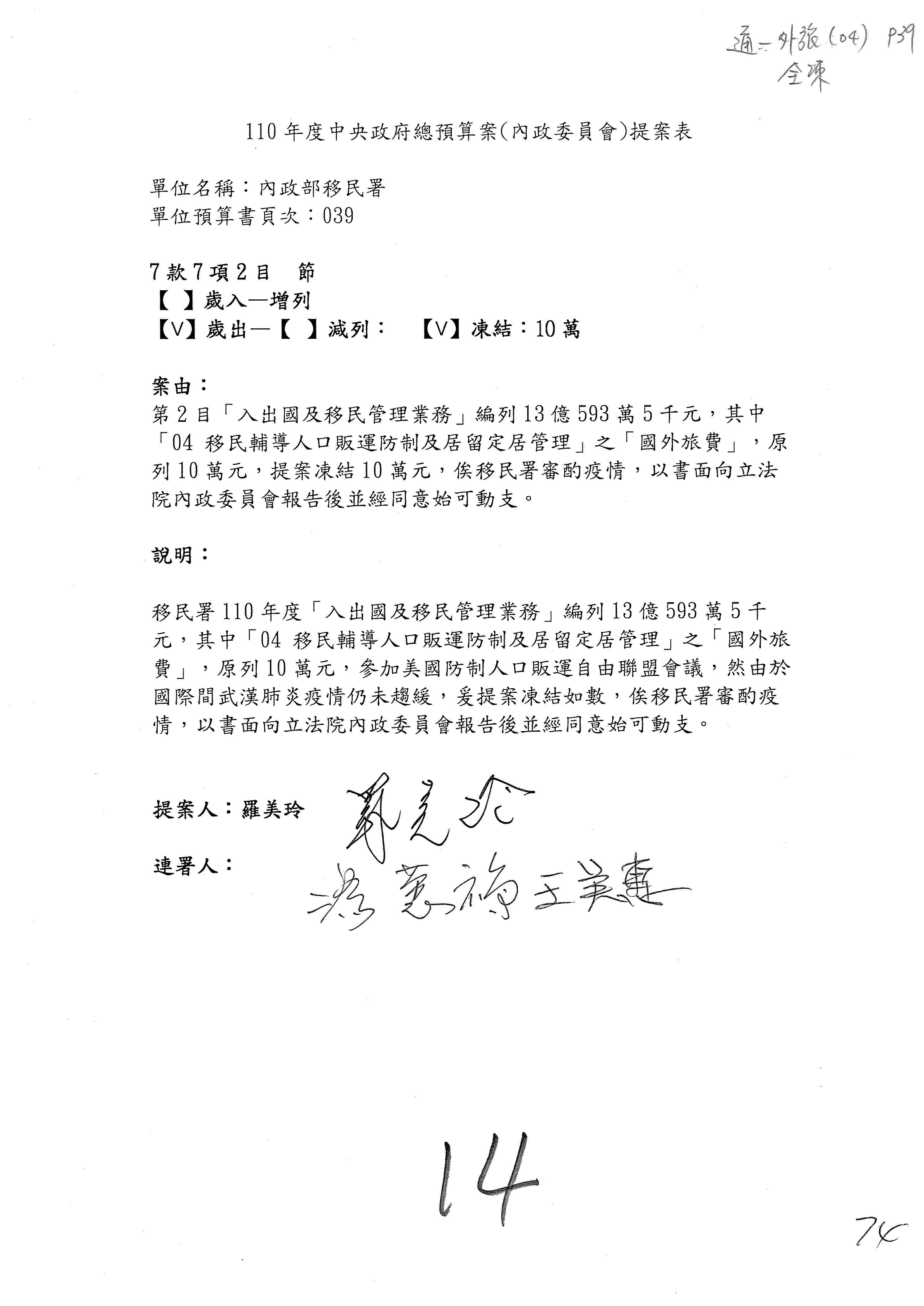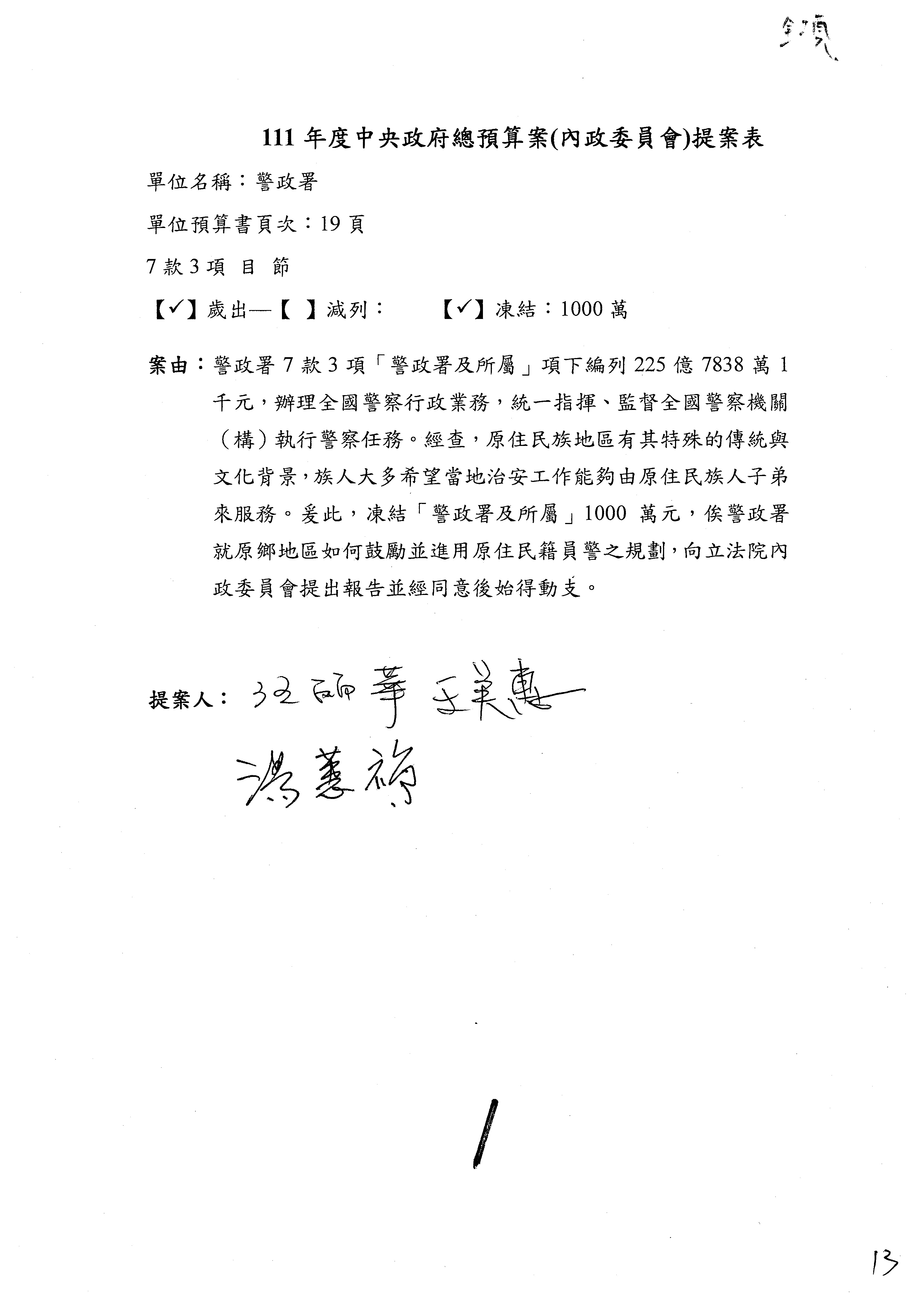 第19案已經改成主決議;第20案,改凍結100萬元,提書面報告後,始得動支;第21案,也改主決議;第22案,凍結100萬元,提書面報告。這個OK啦!都可以。