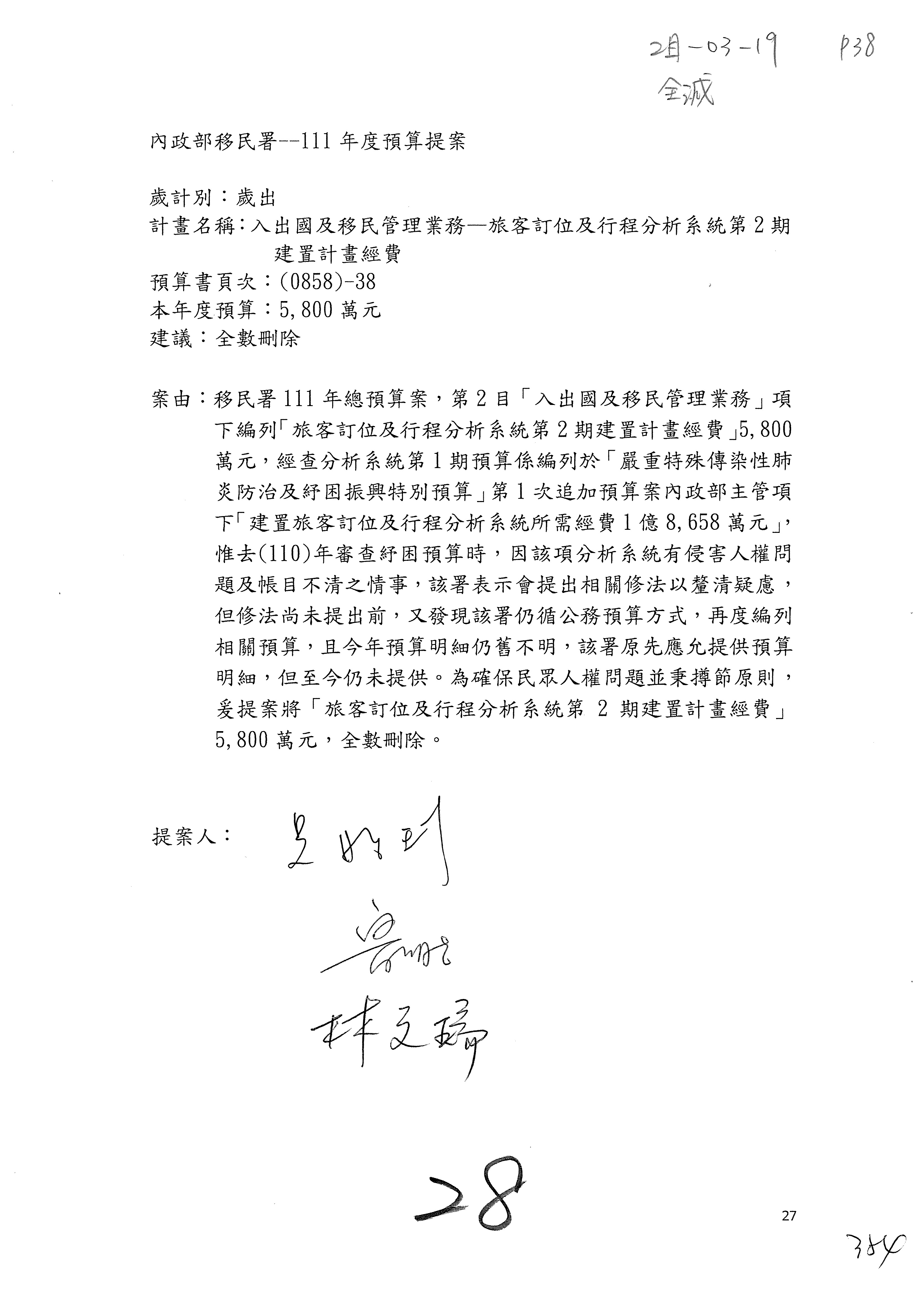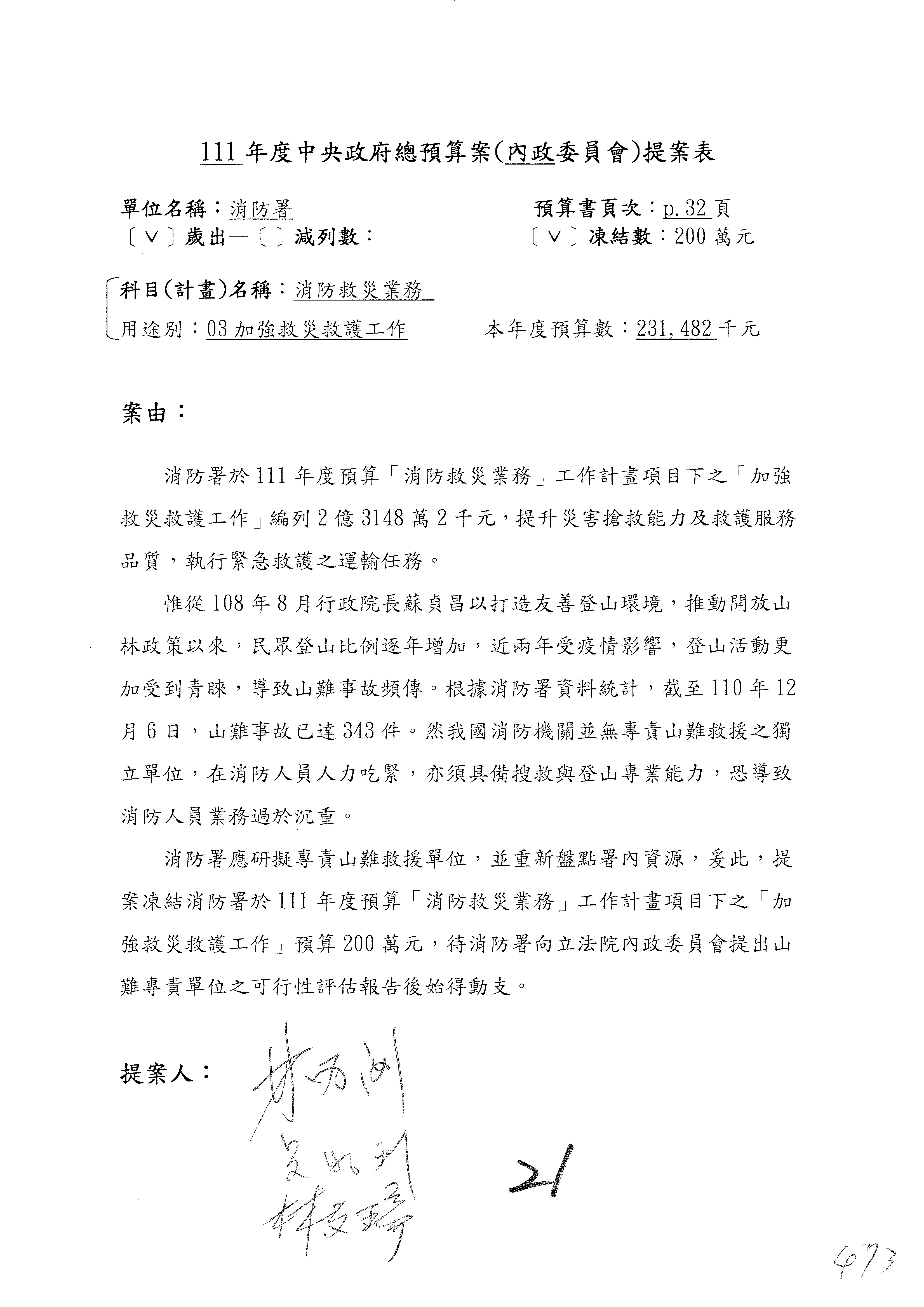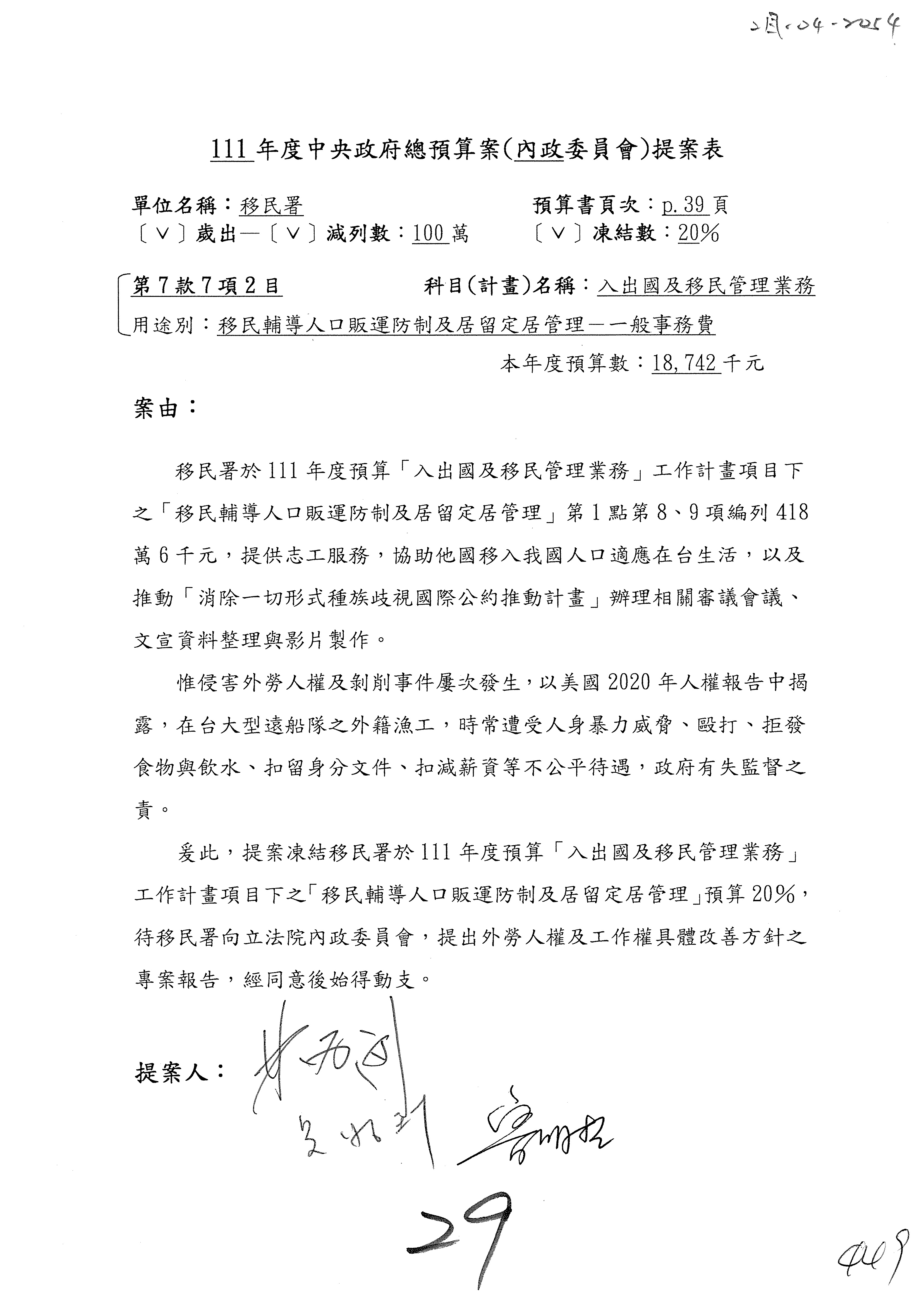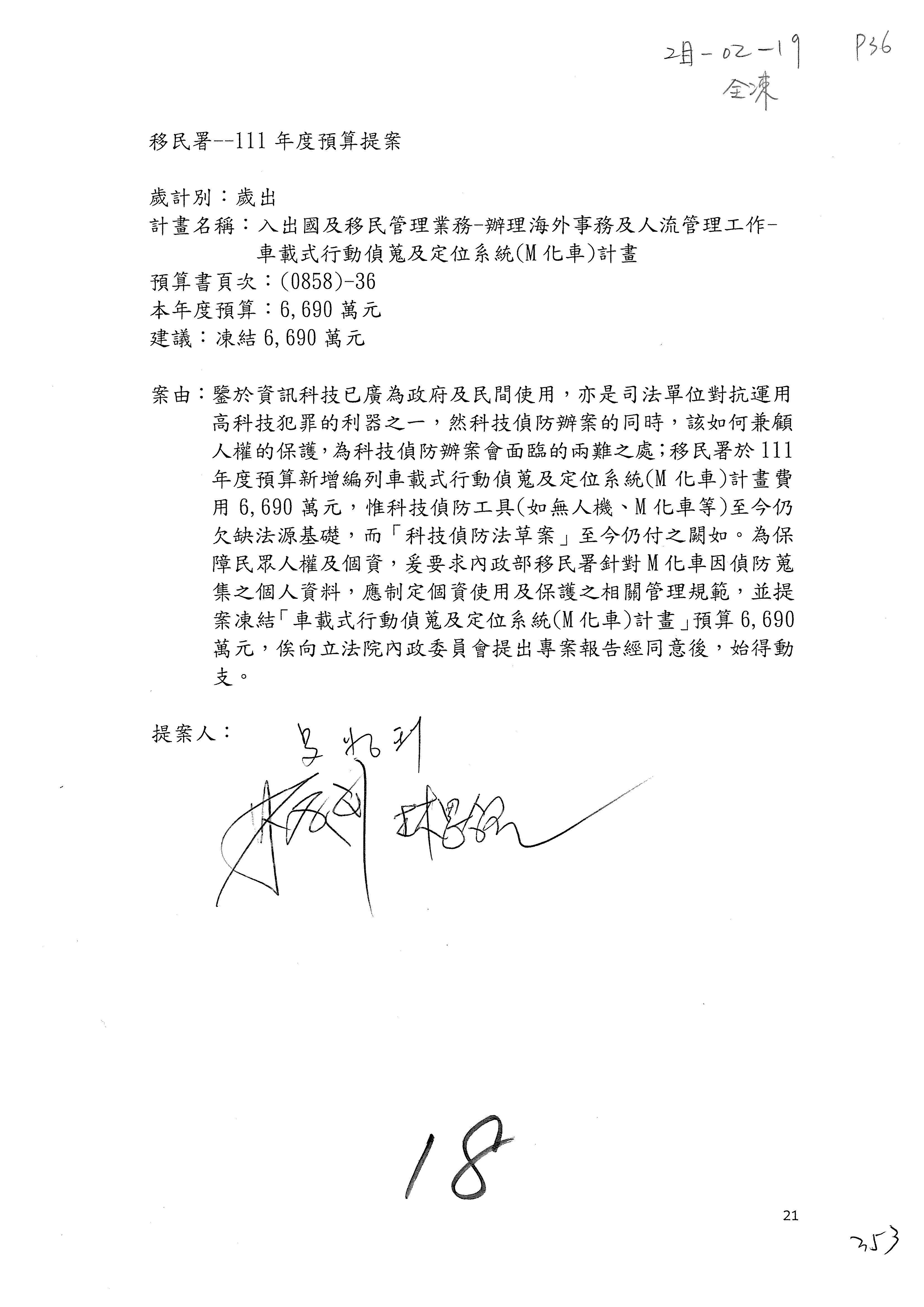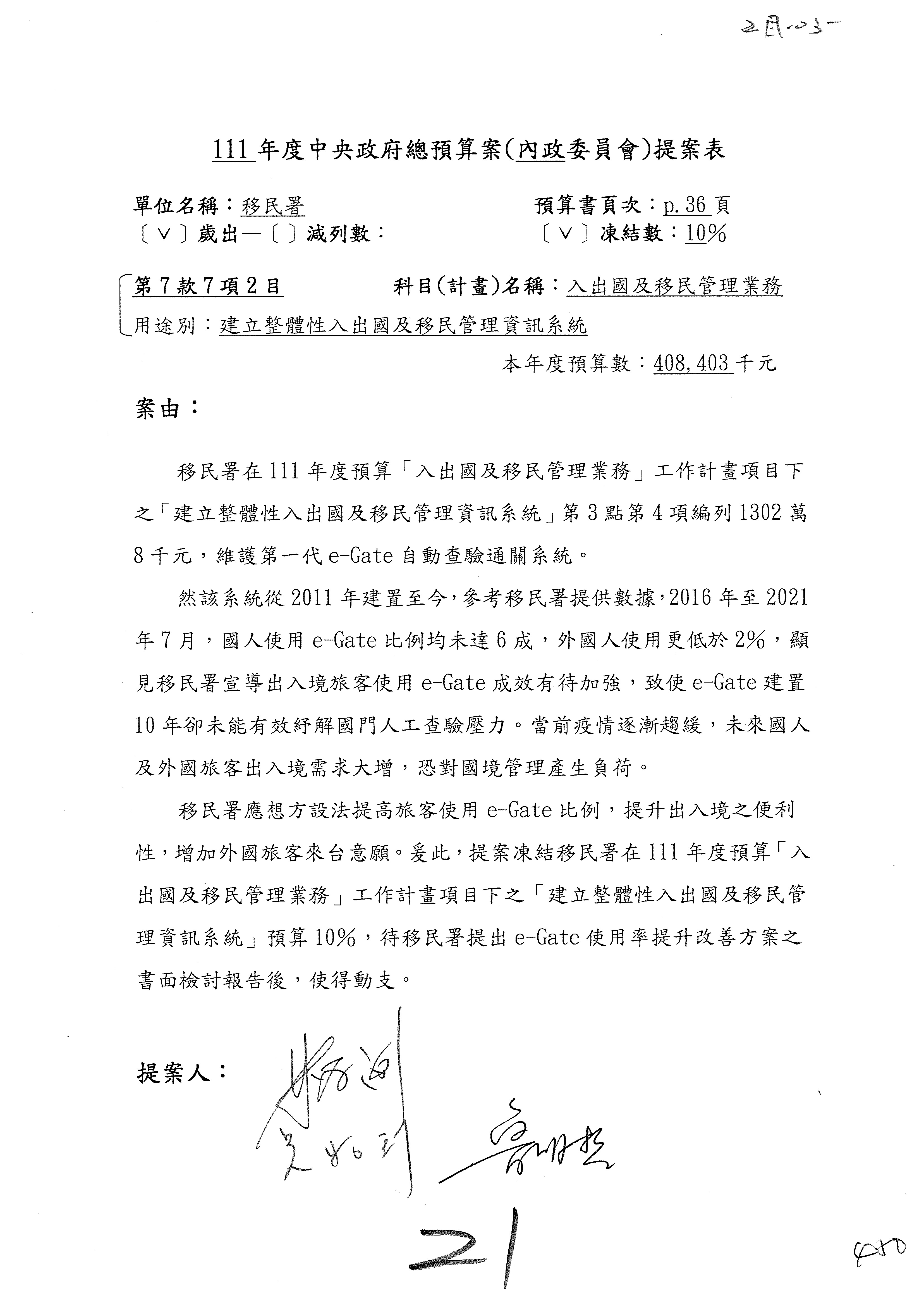 第19案已經改成主決議;第20案,改凍結100萬元,提書面報告後,始得動支;第21案,也改主決議;第22案,凍結100萬元,提書面報告。這個OK啦!都可以。