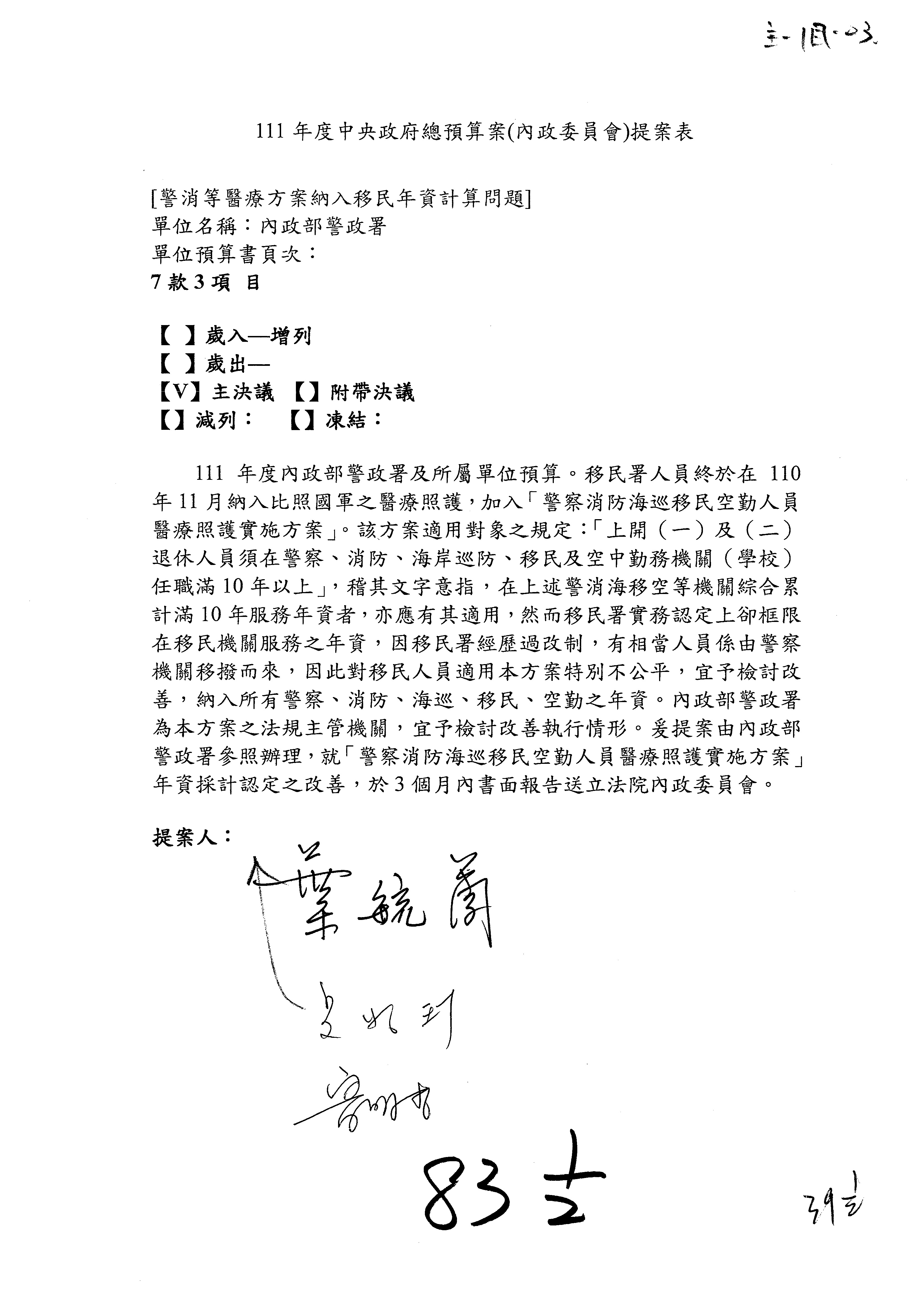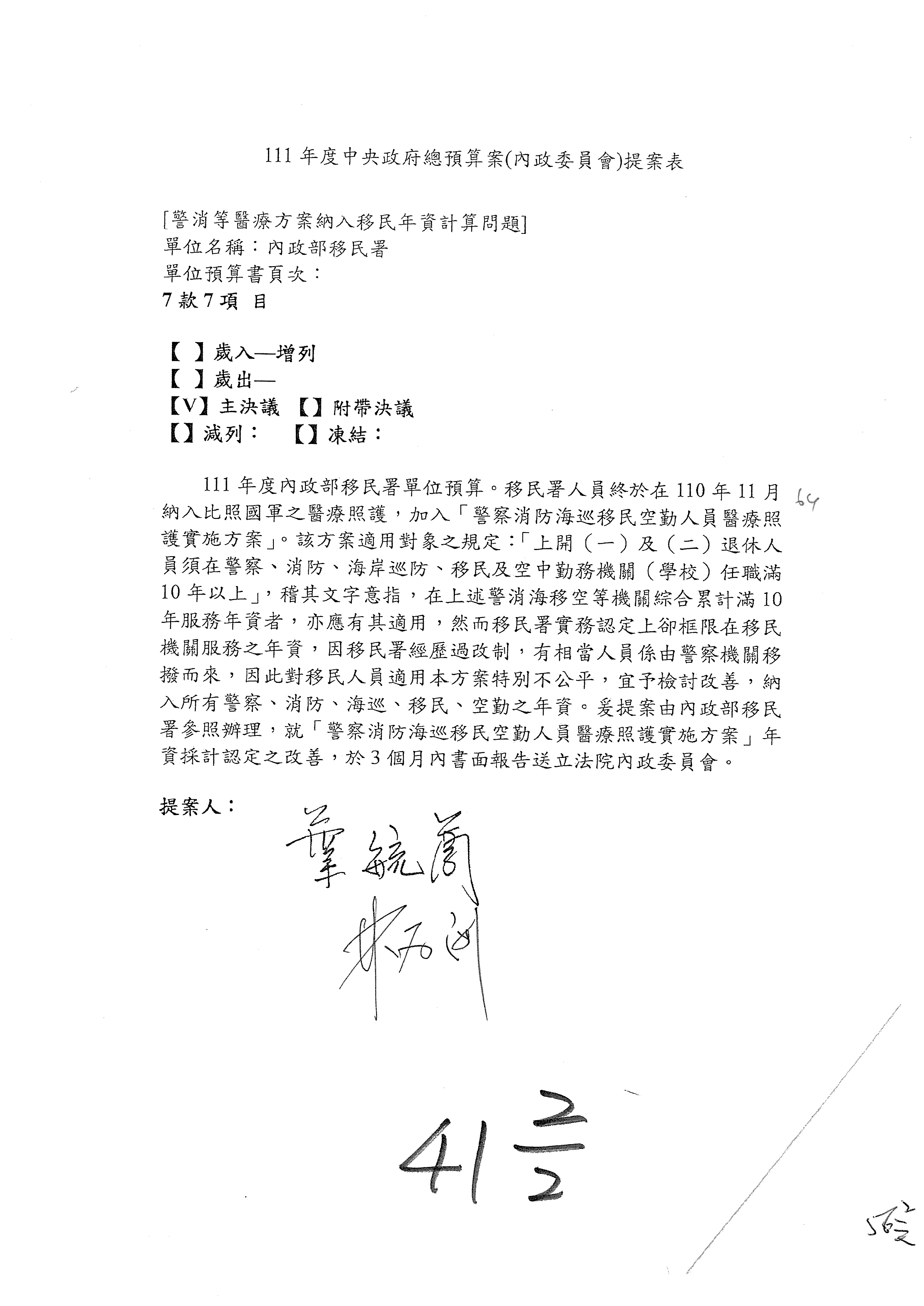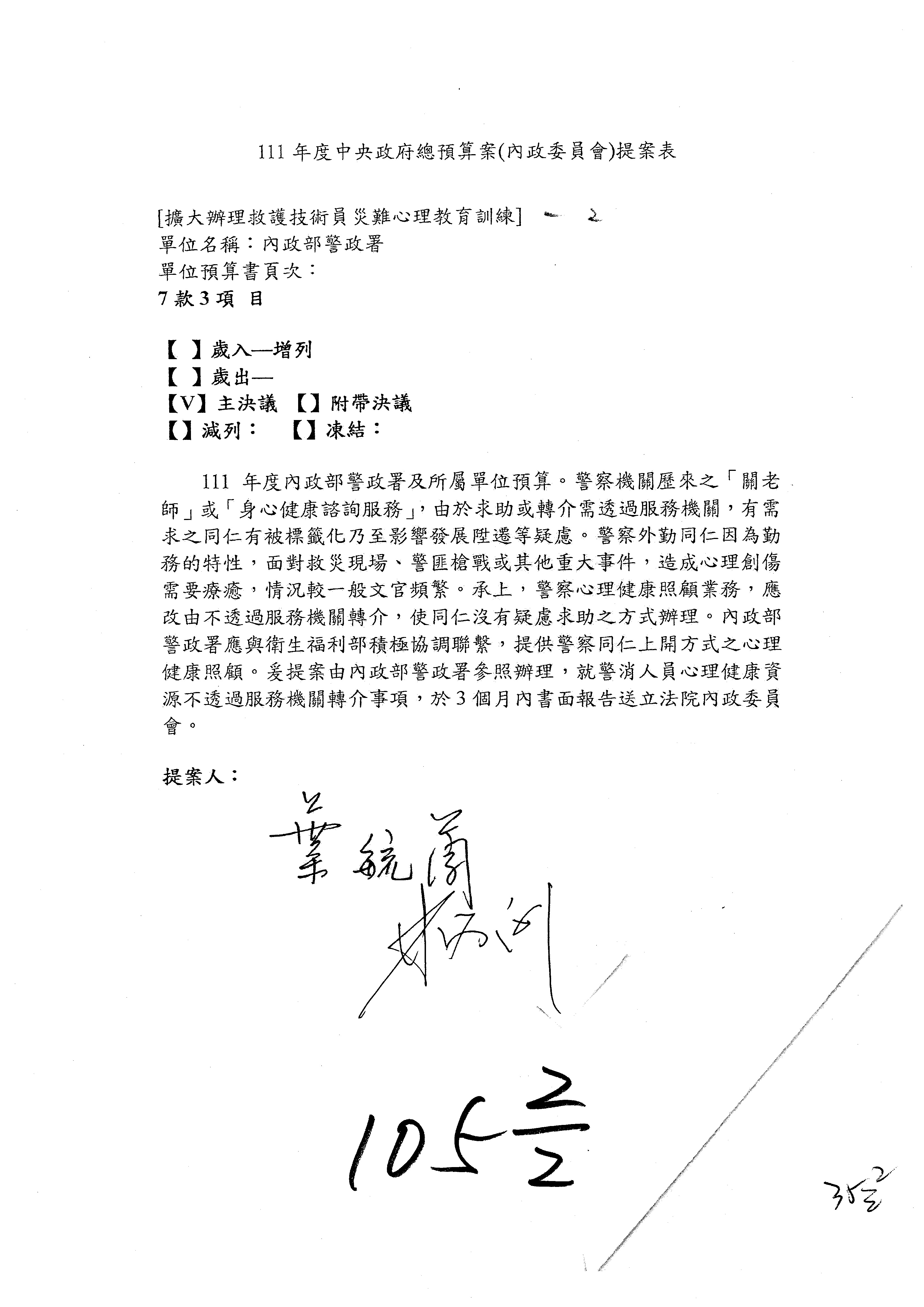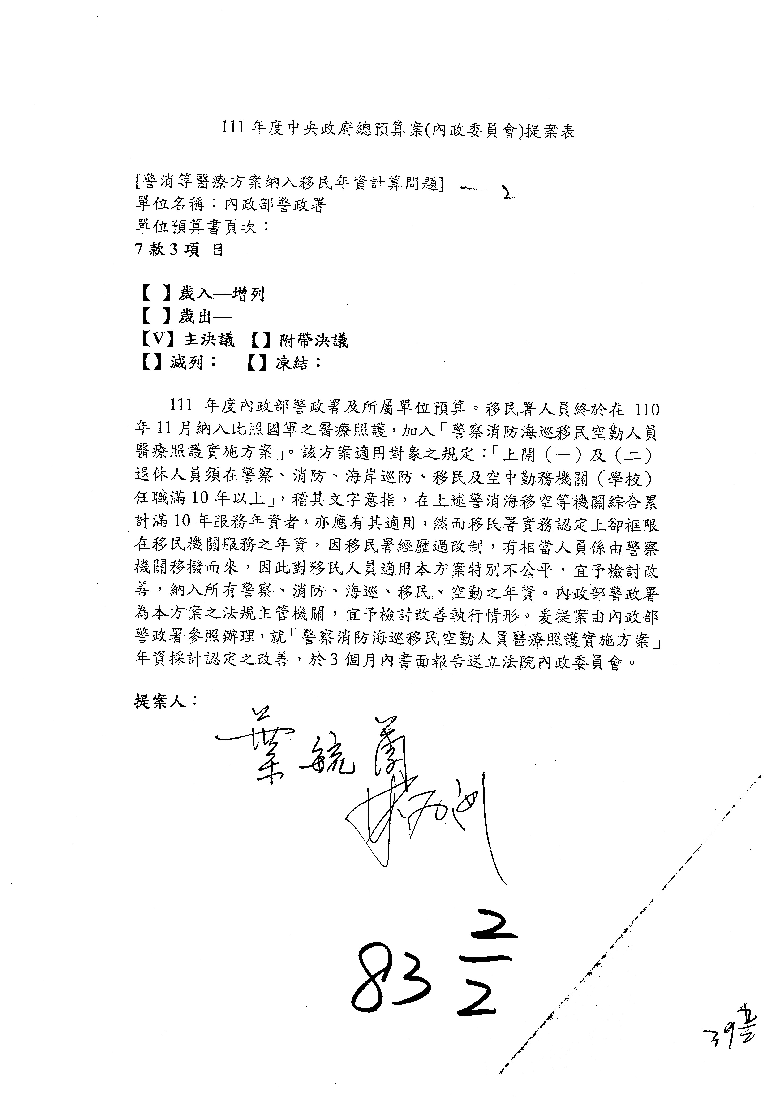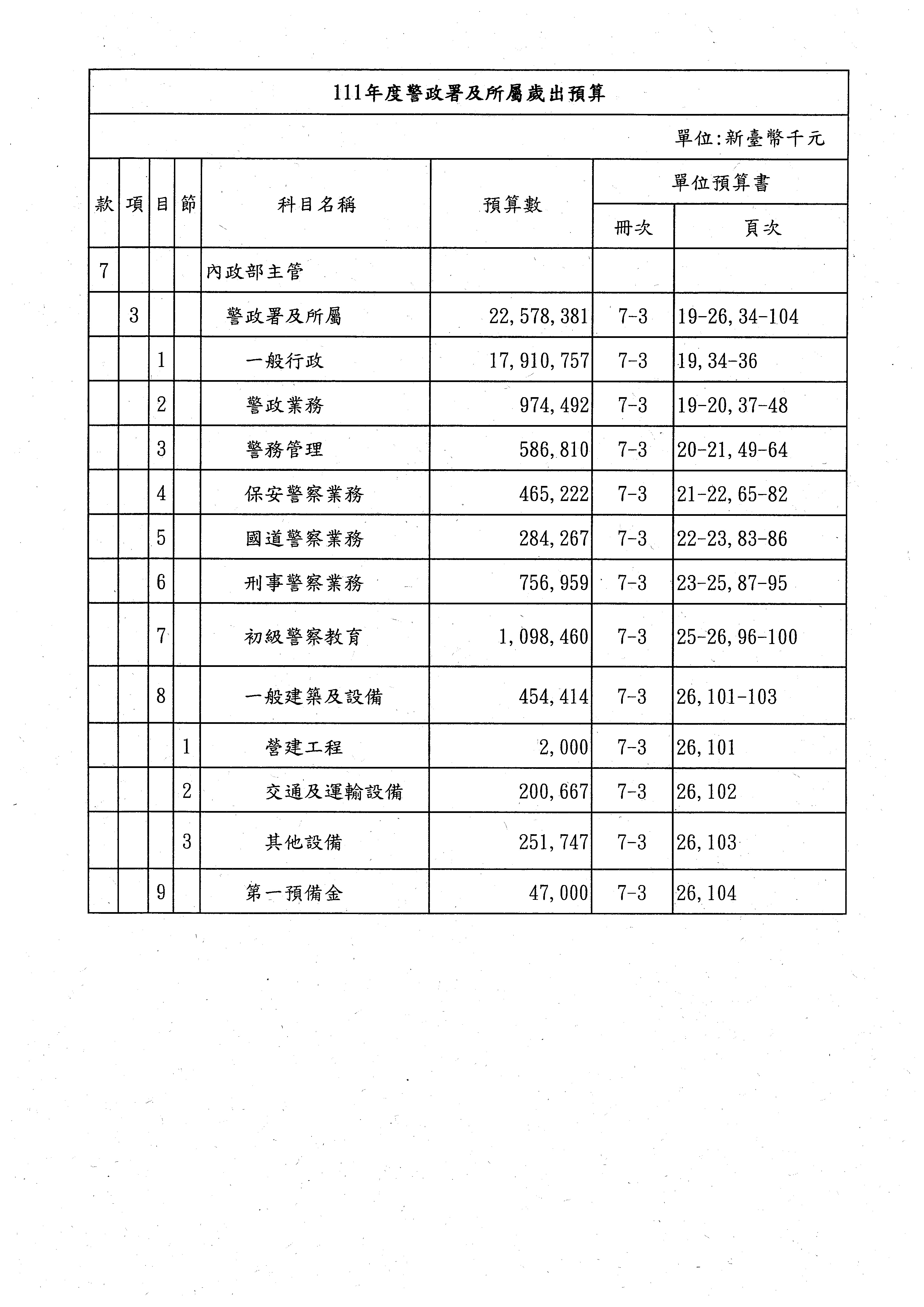 主席:現在進行預算處理,今天預算審查的順序依序為:警政署及所屬、中央警察大學、消防署及所屬、移民署、役政署及空中勤務總隊等單位預算,以上每個單位的預算數已宣讀完畢。