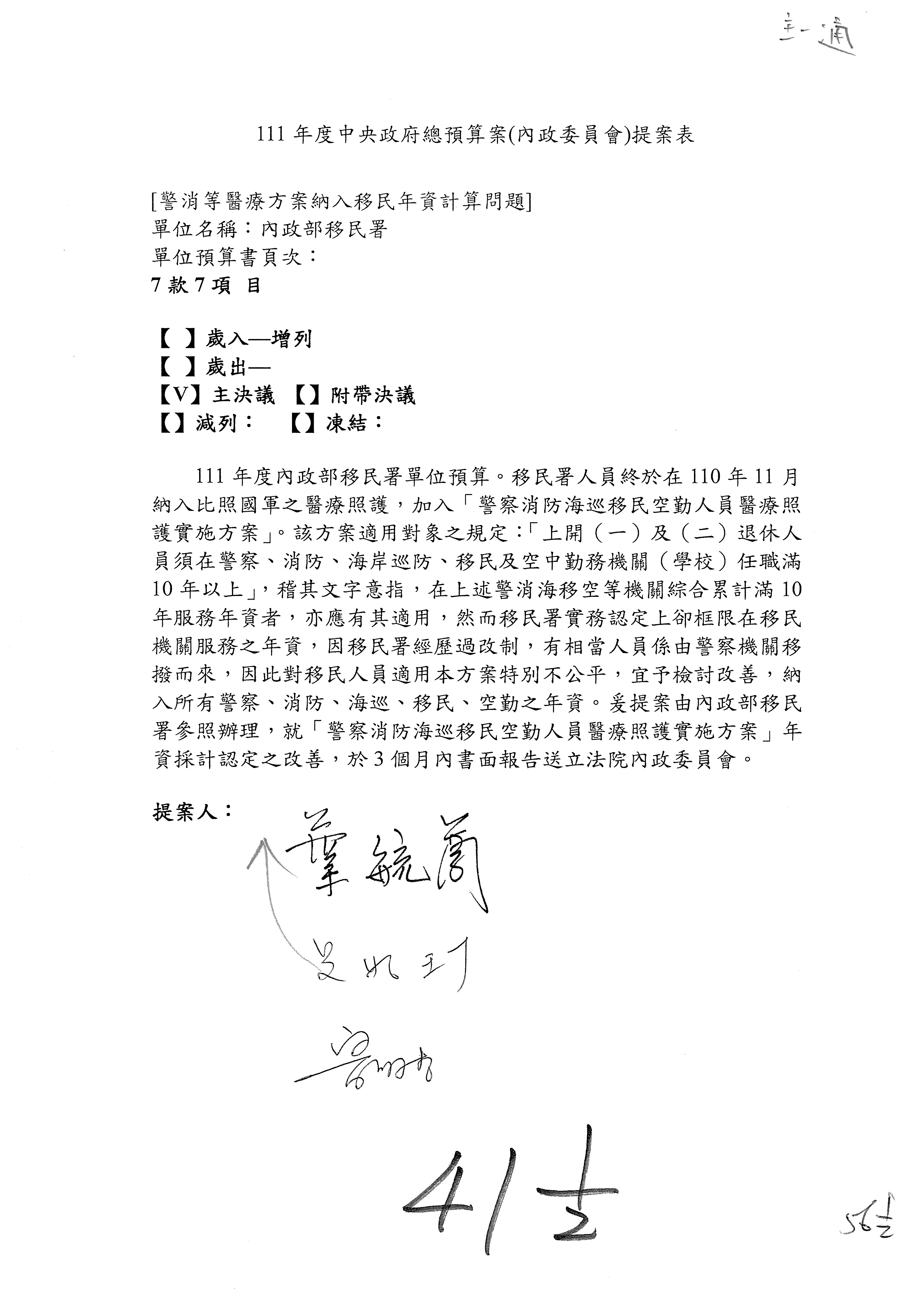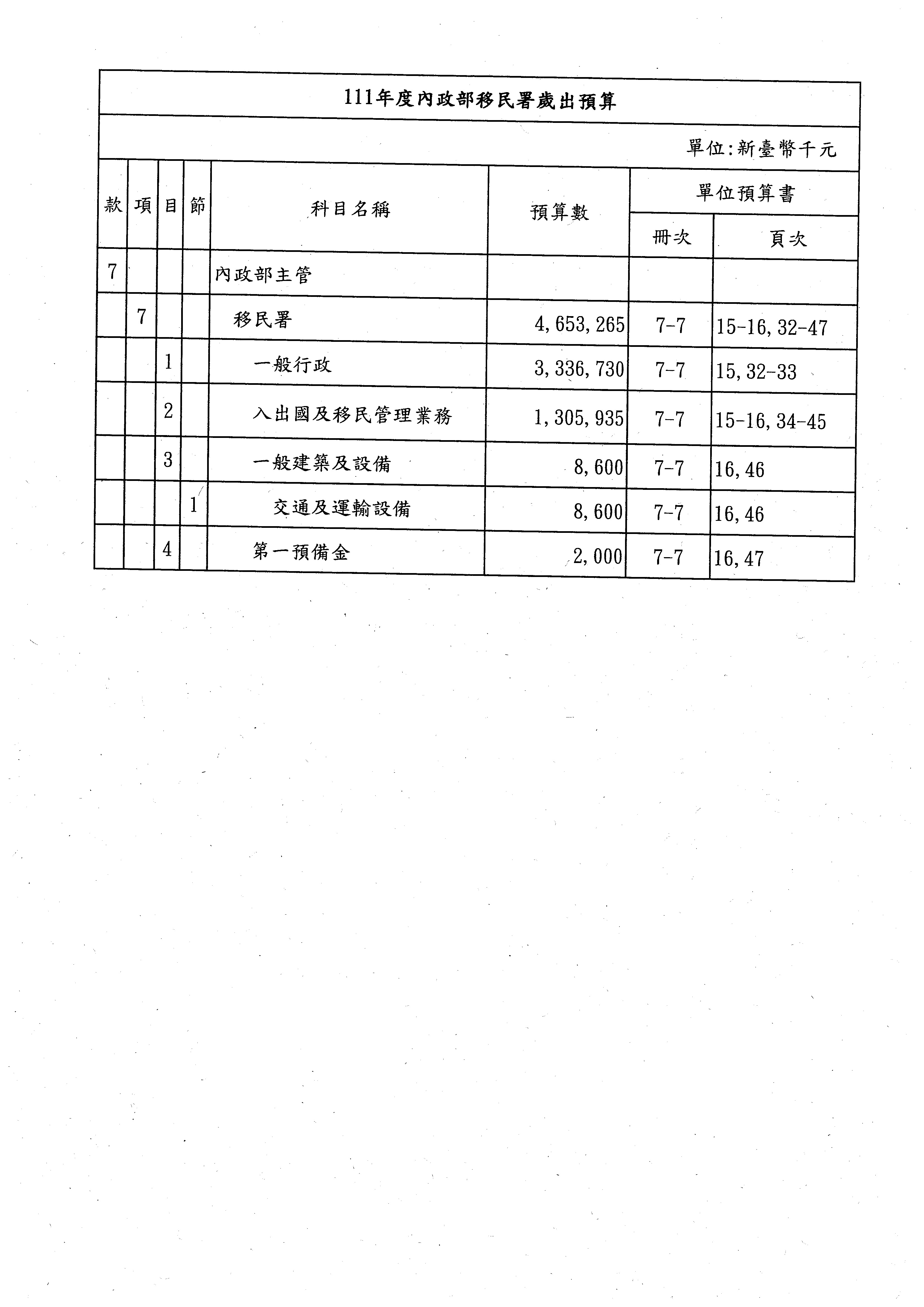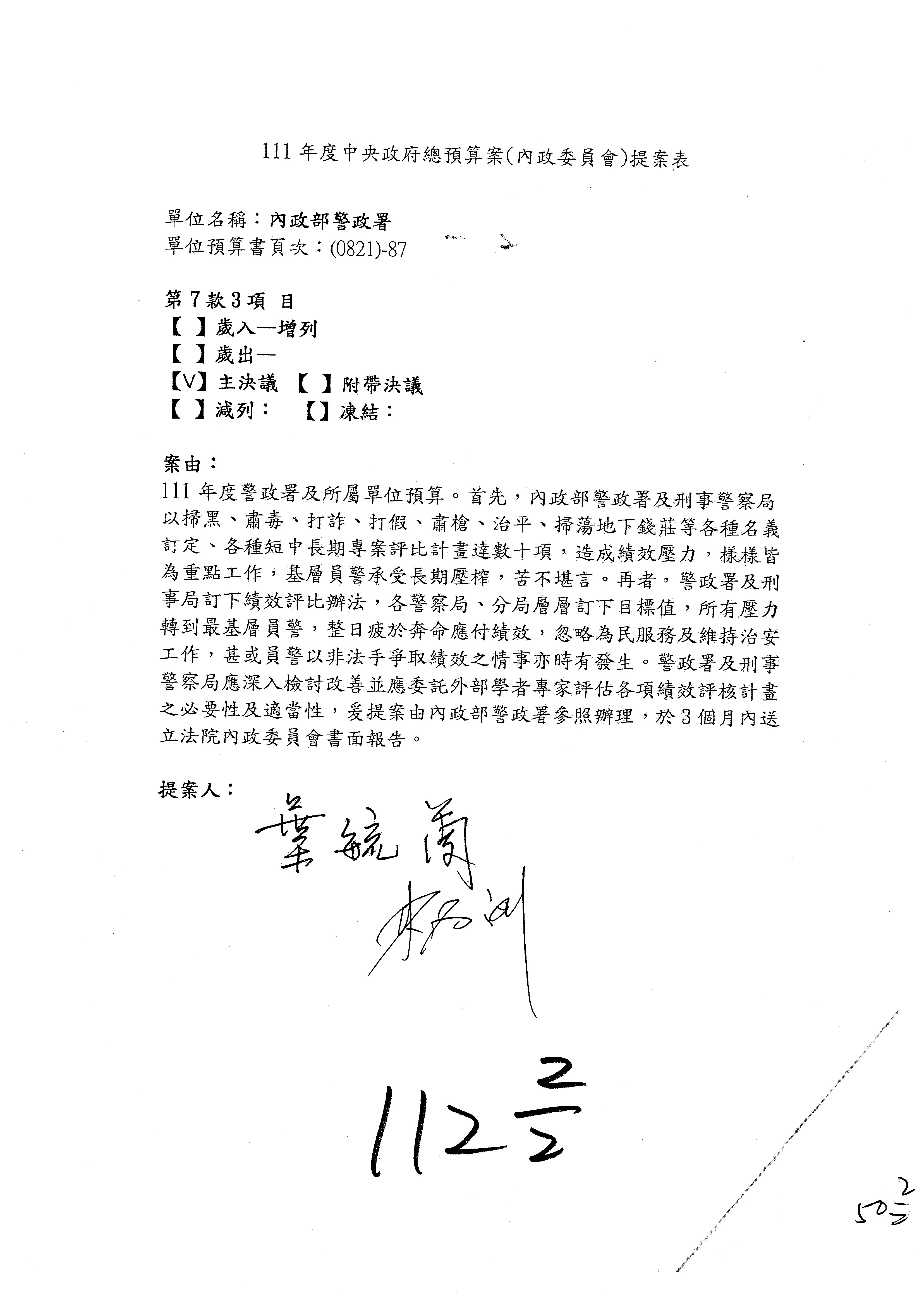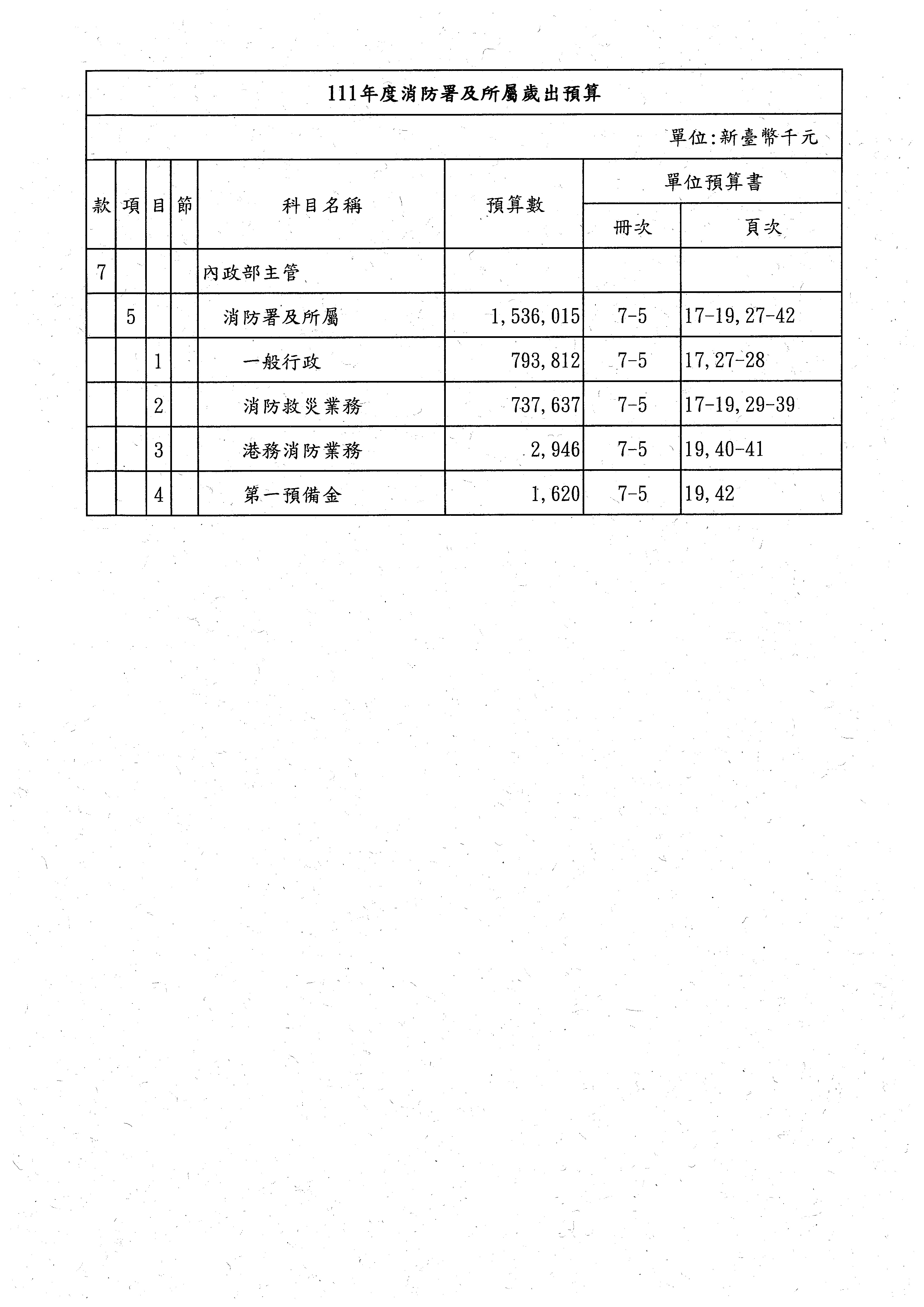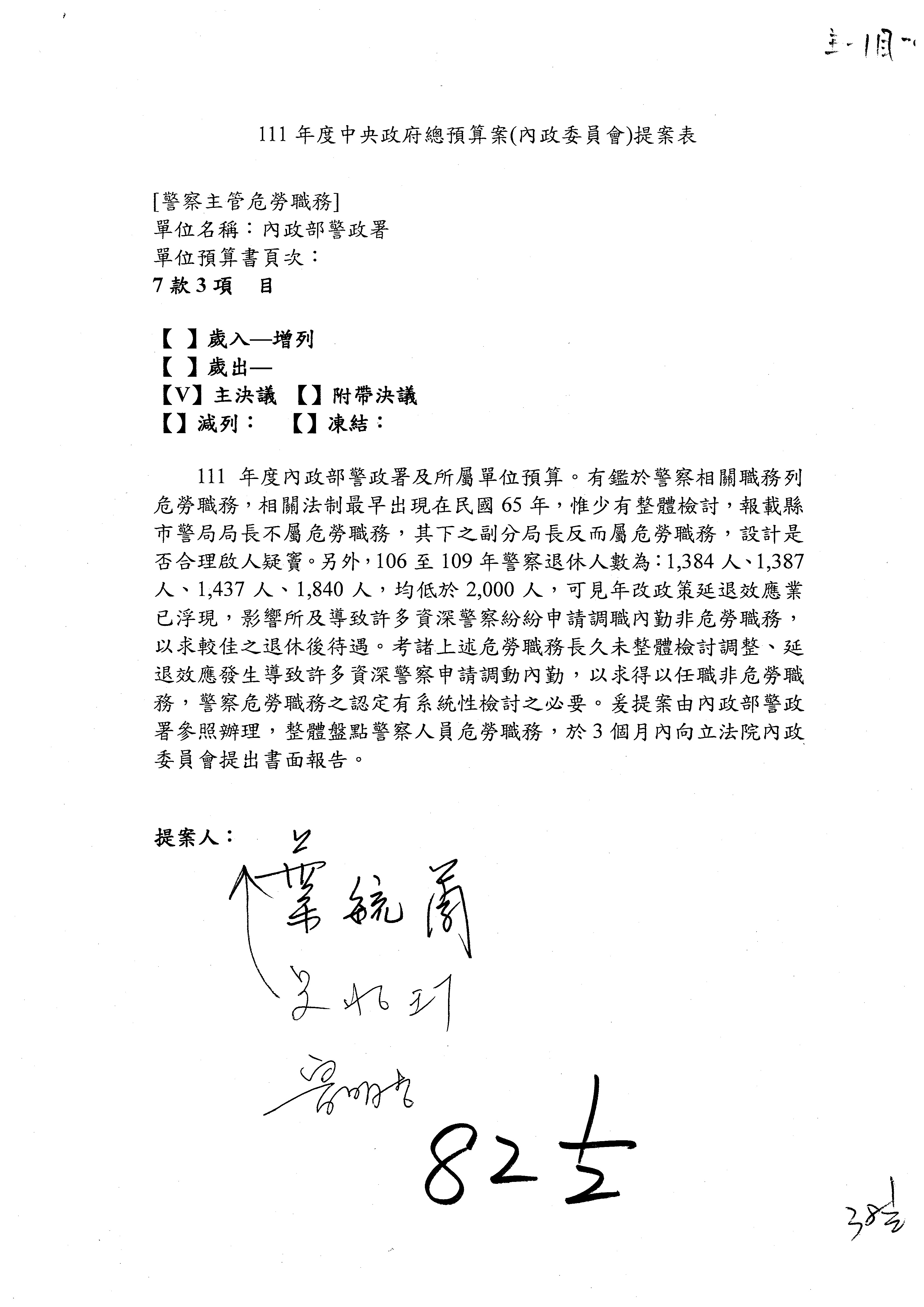 主席:現在進行預算處理,今天預算審查的順序依序為:警政署及所屬、中央警察大學、消防署及所屬、移民署、役政署及空中勤務總隊等單位預算,以上每個單位的預算數已宣讀完畢。