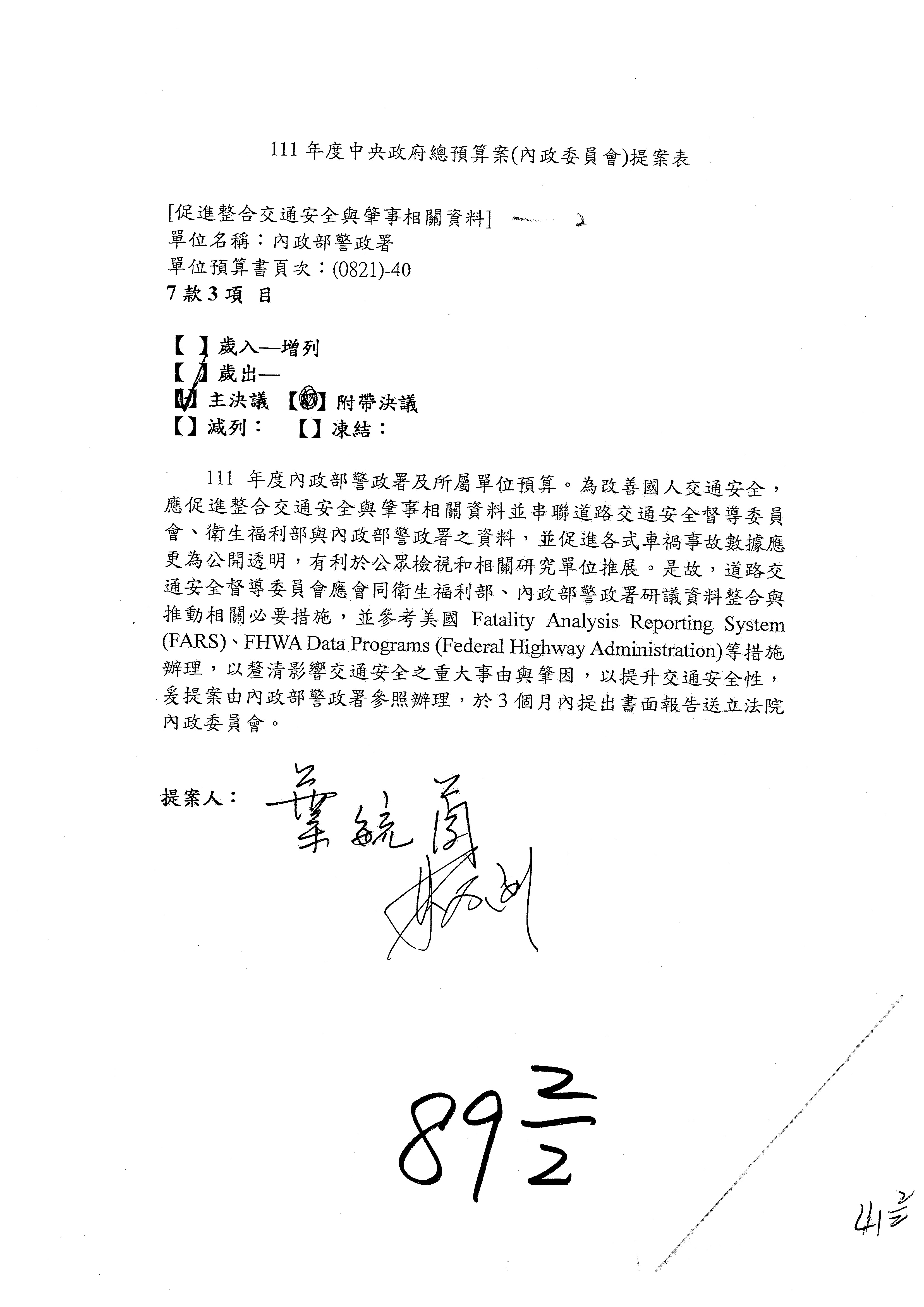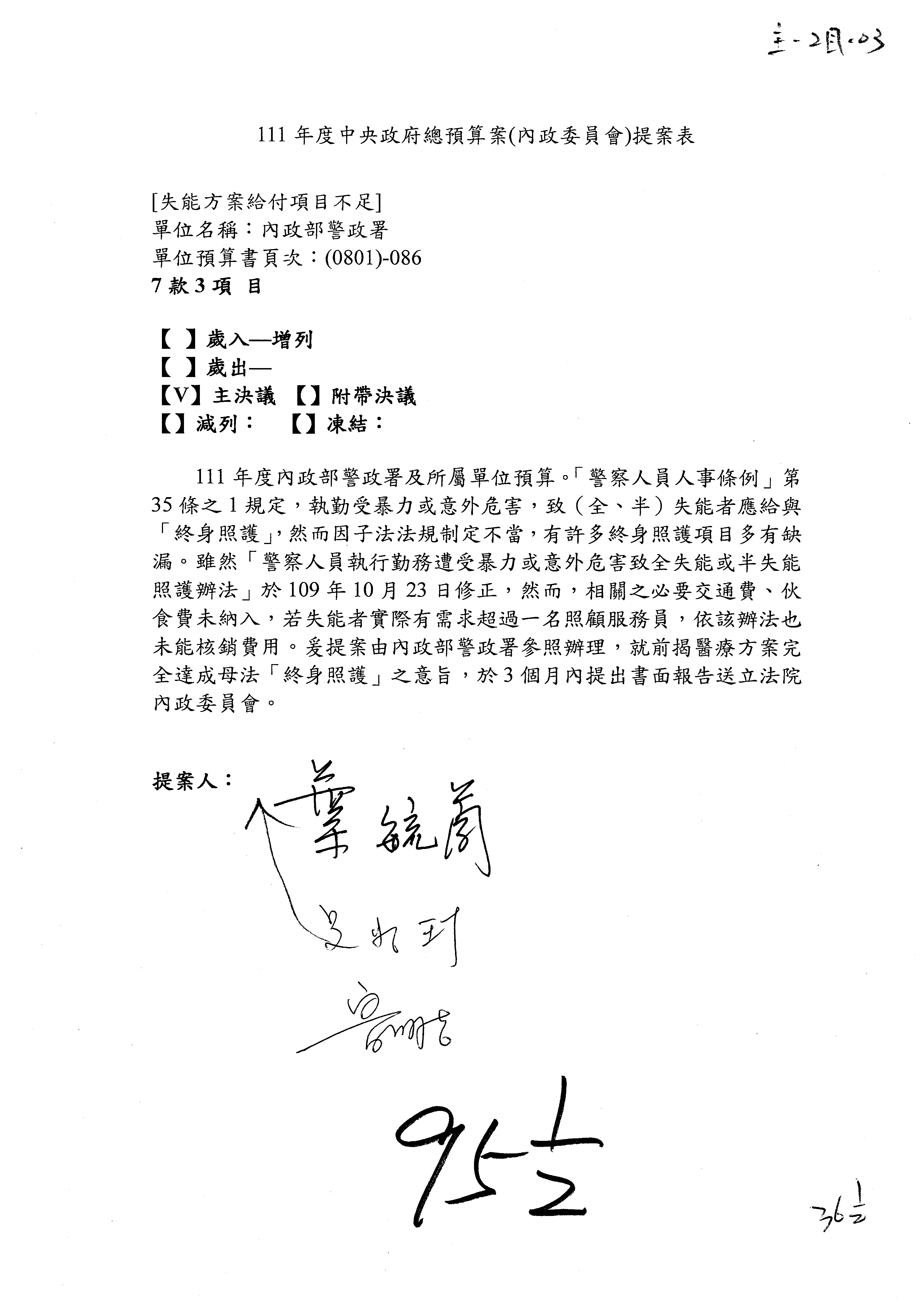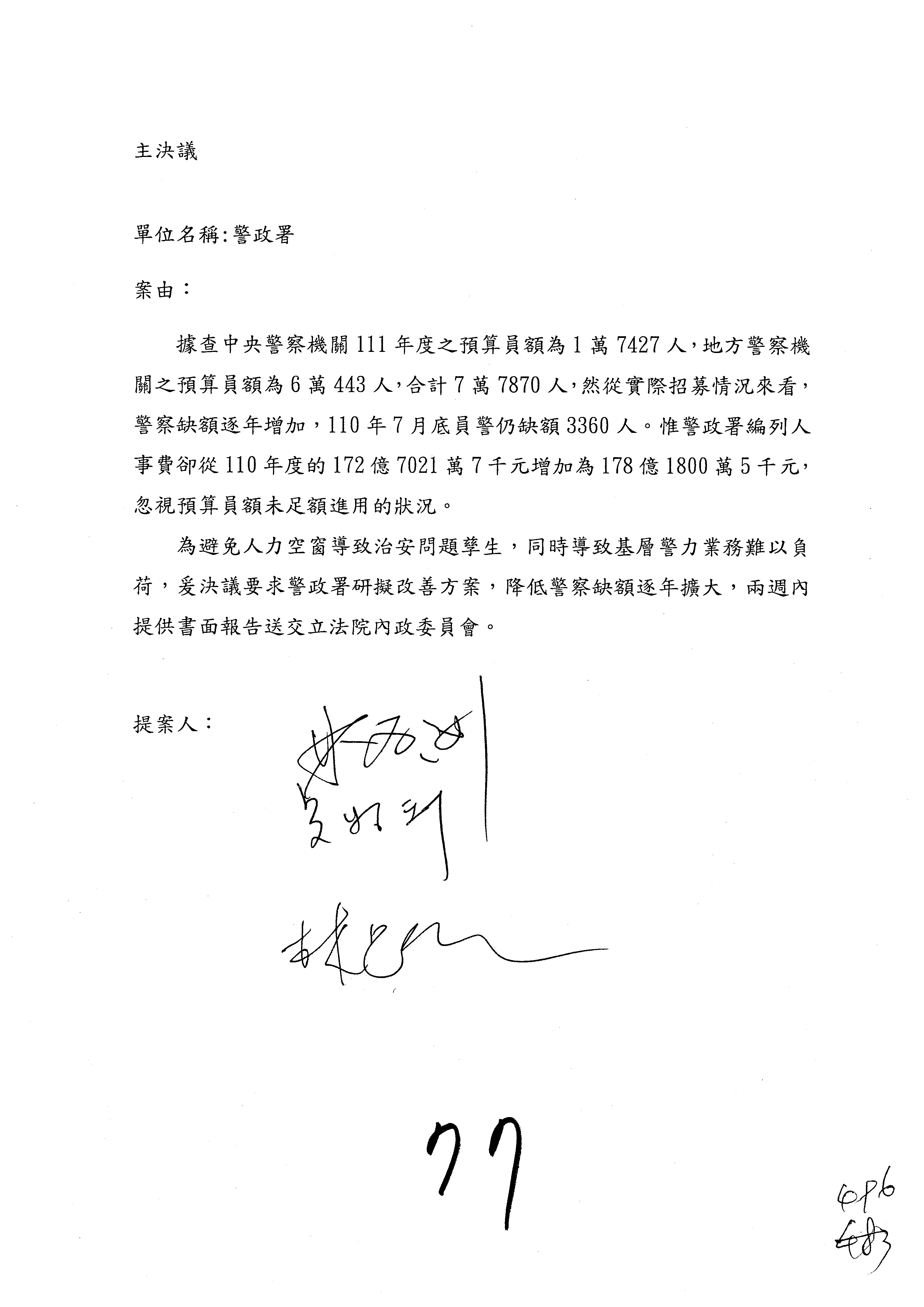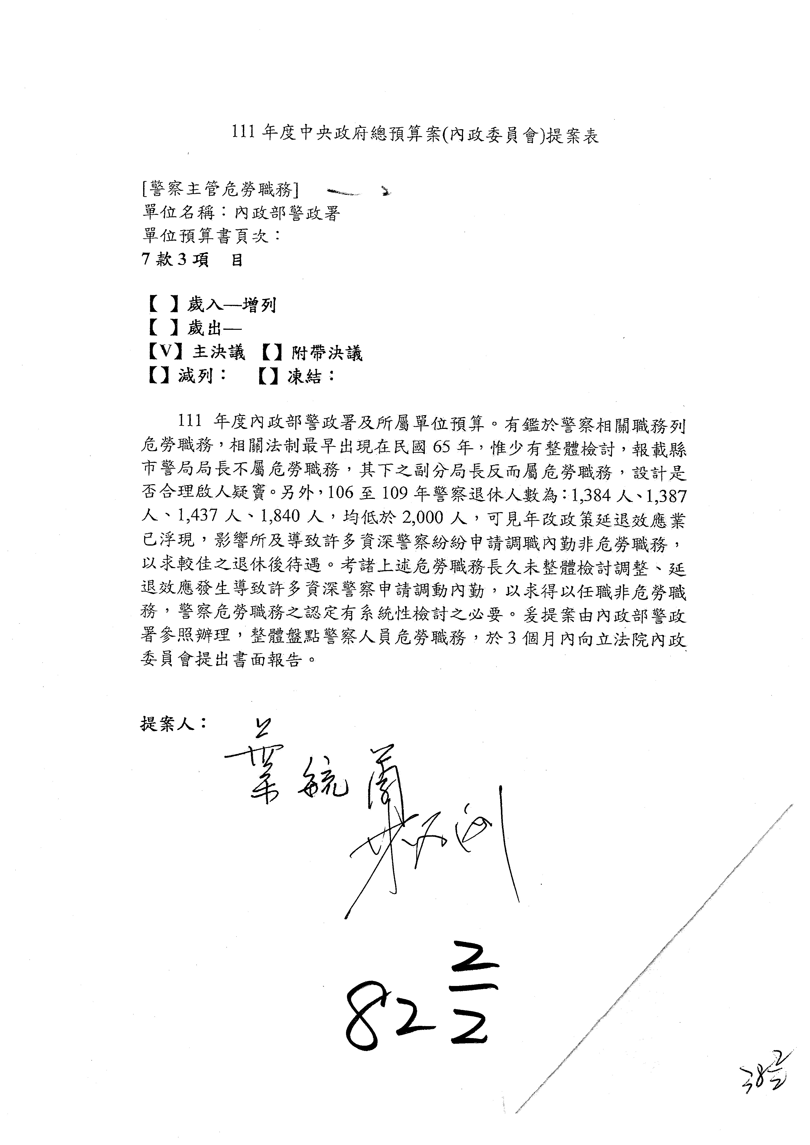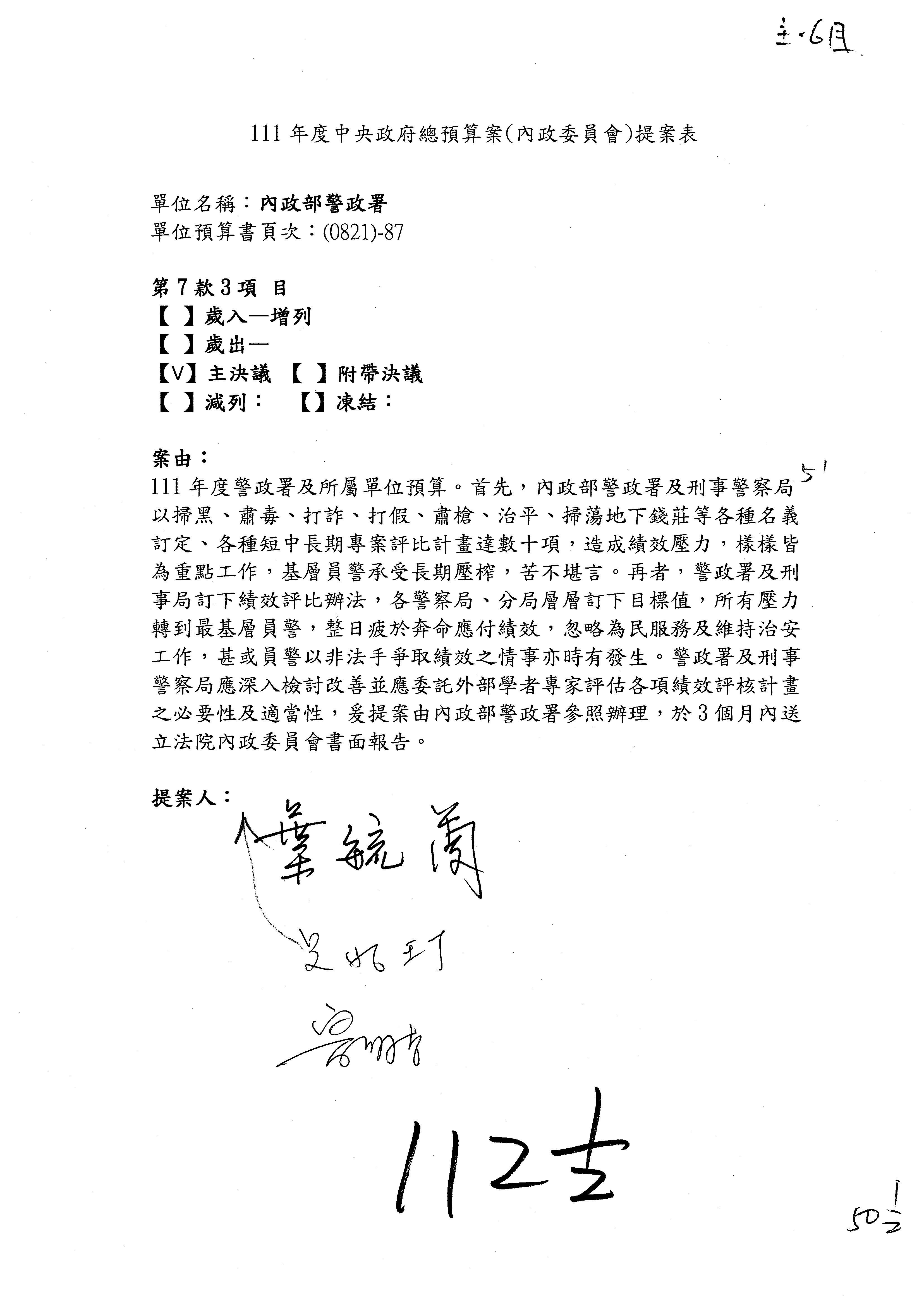 主席:現在進行預算處理,今天預算審查的順序依序為:警政署及所屬、中央警察大學、消防署及所屬、移民署、役政署及空中勤務總隊等單位預算,以上每個單位的預算數已宣讀完畢。