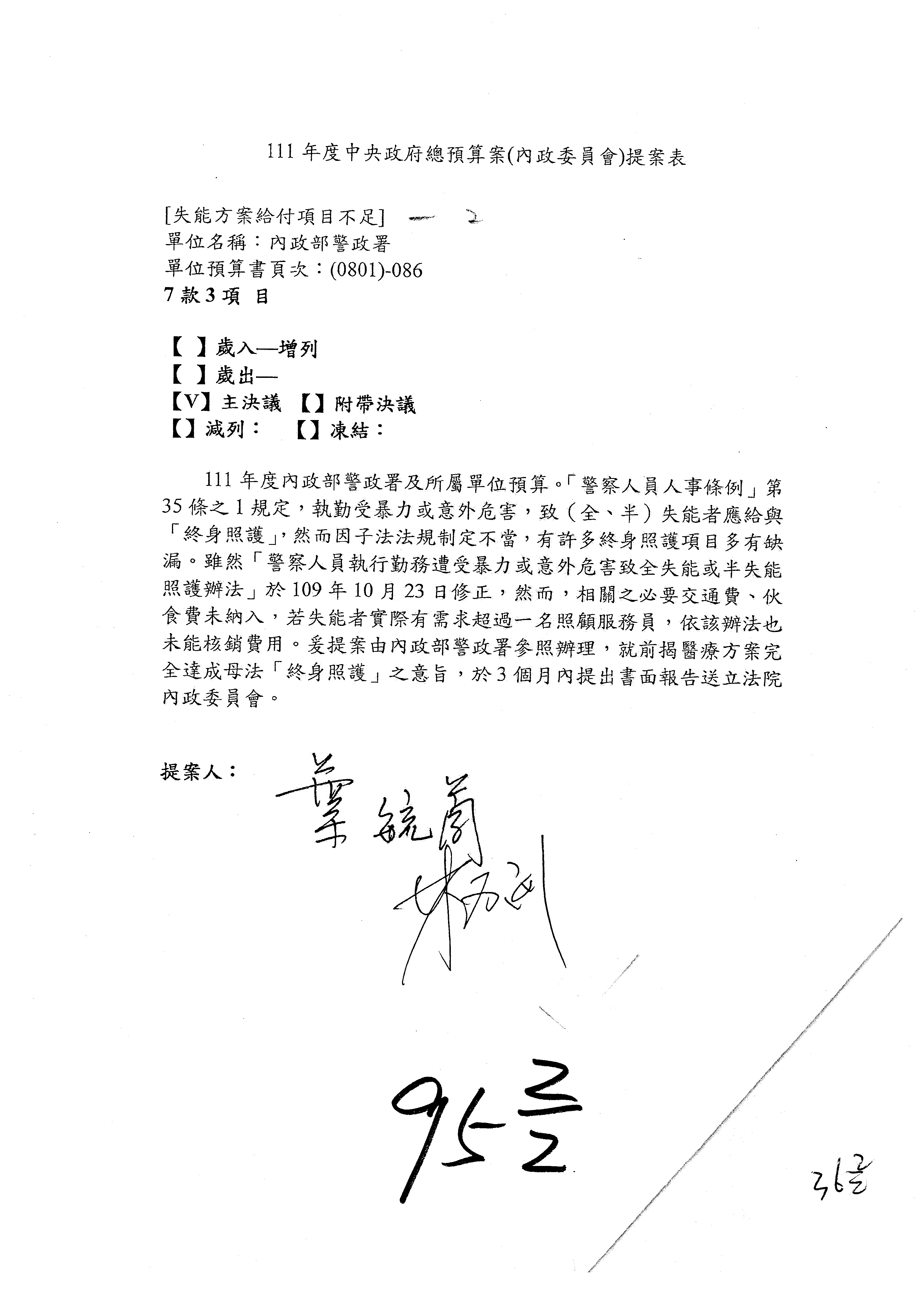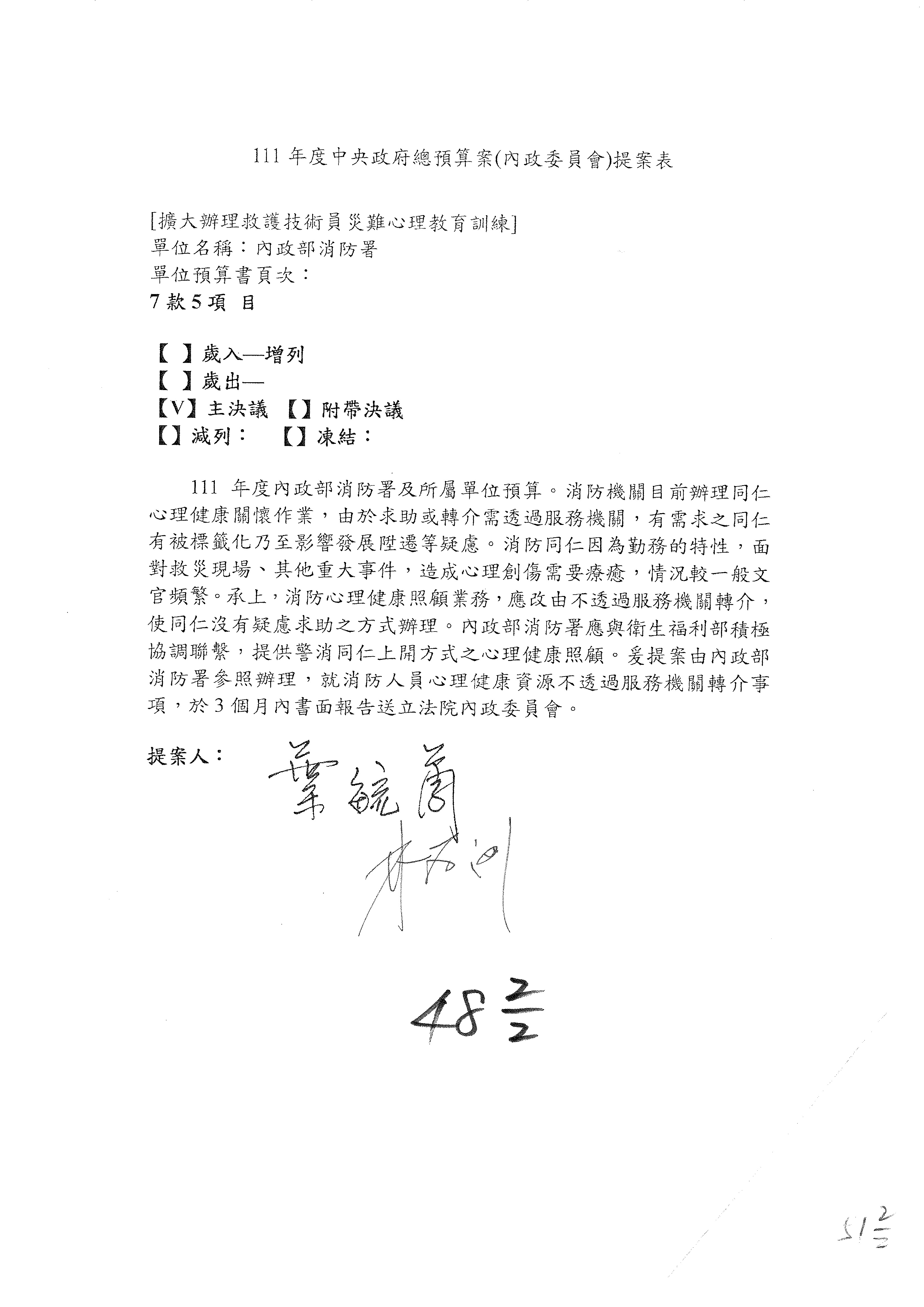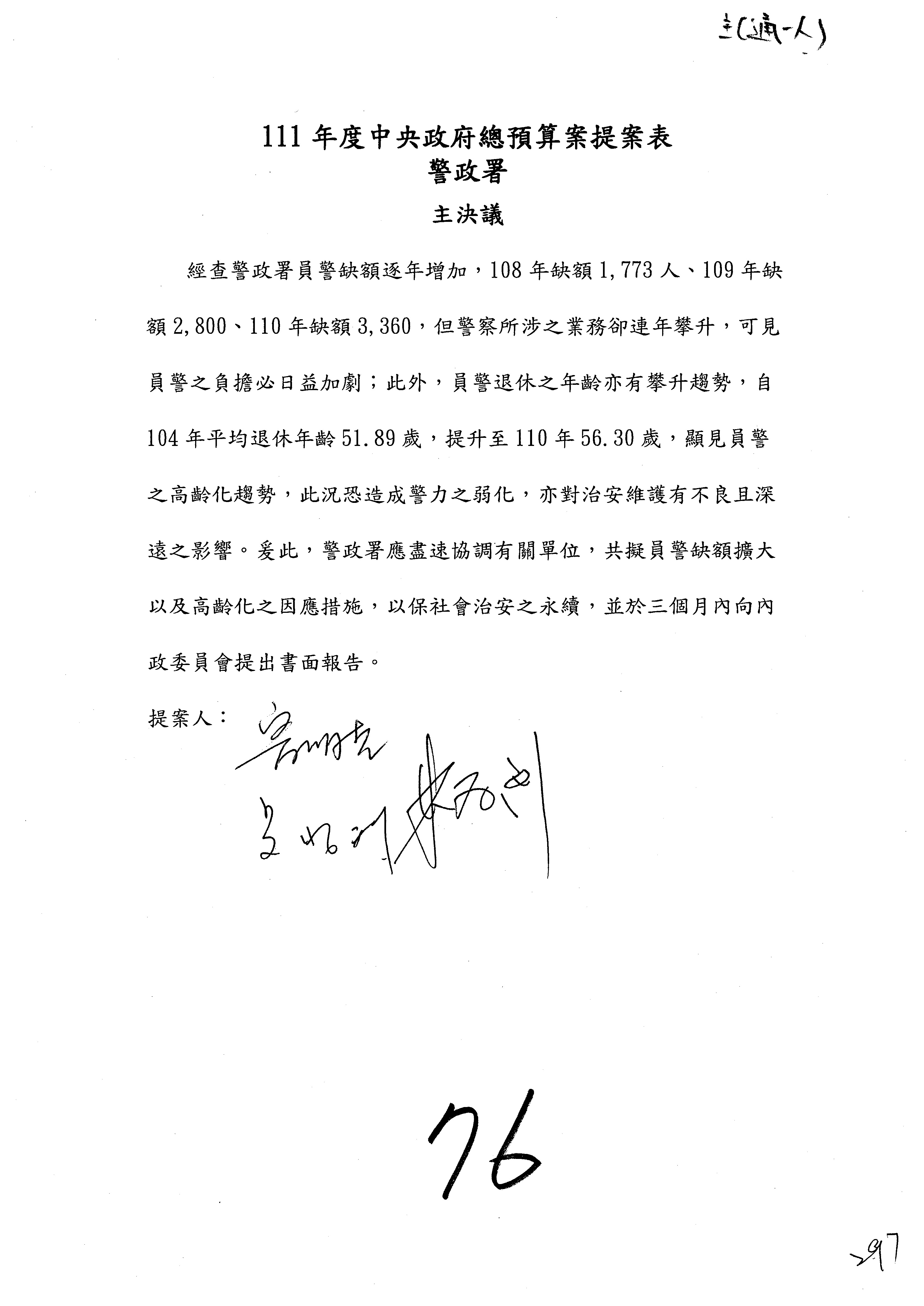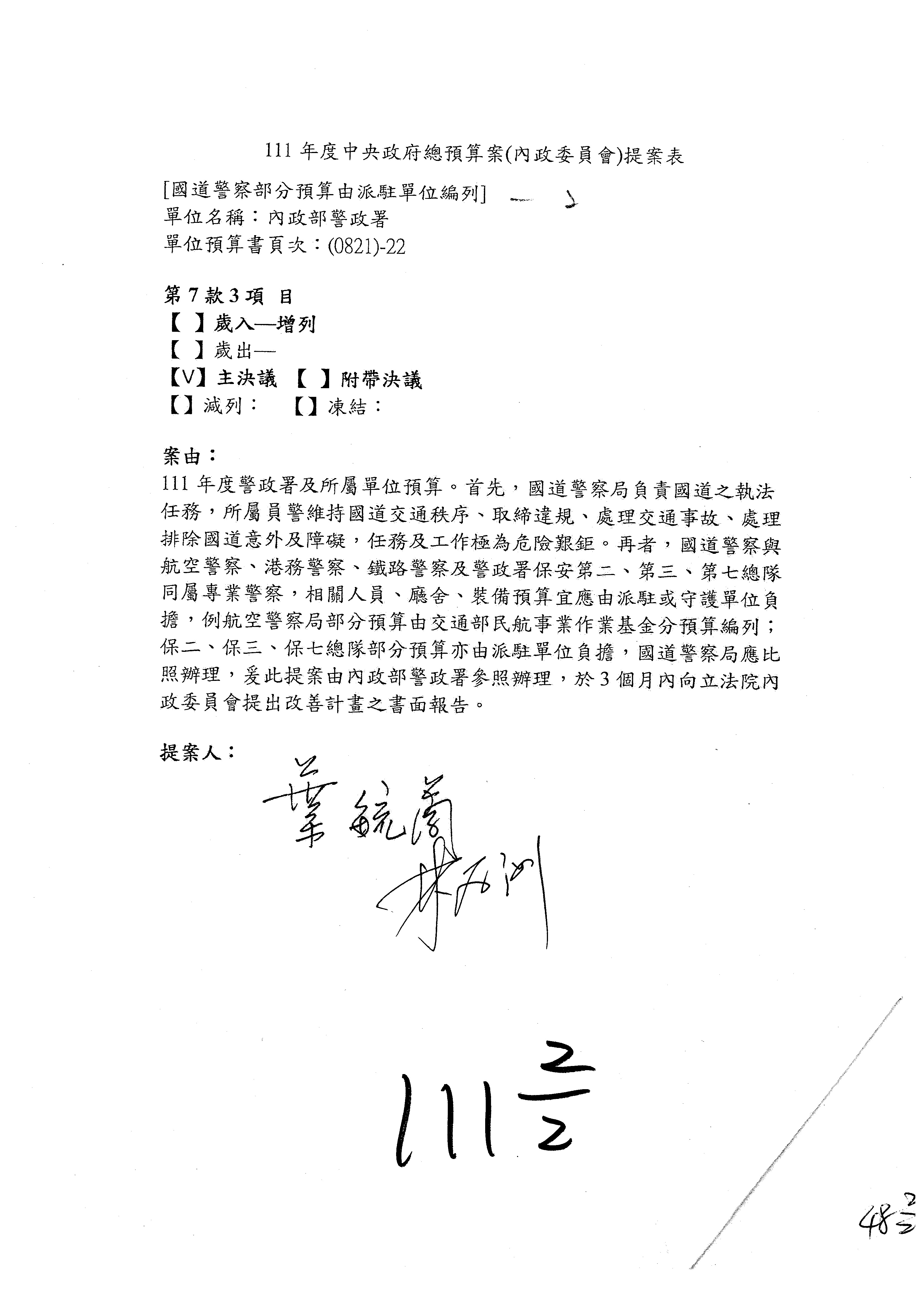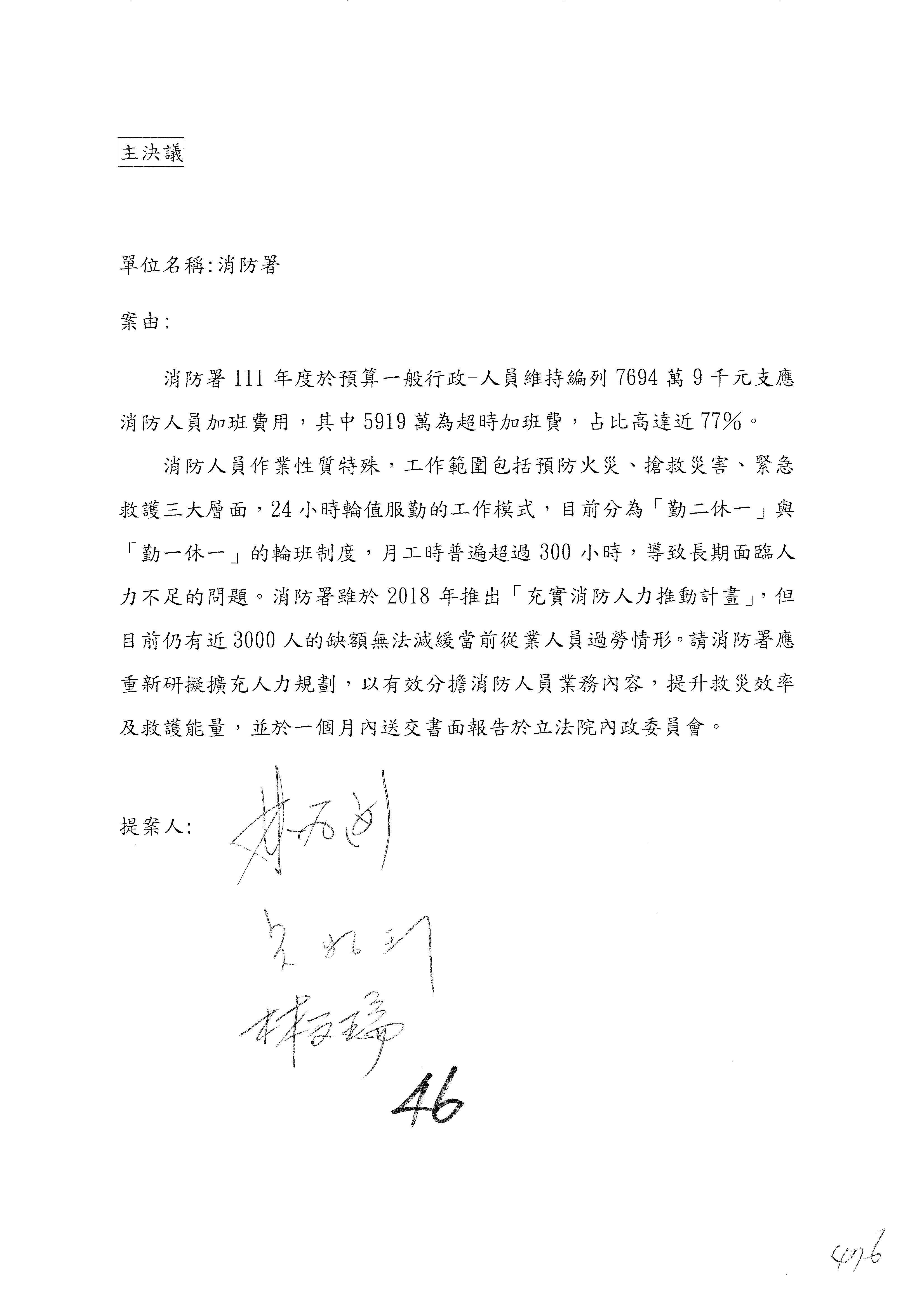 主席:現在進行預算處理,今天預算審查的順序依序為:警政署及所屬、中央警察大學、消防署及所屬、移民署、役政署及空中勤務總隊等單位預算,以上每個單位的預算數已宣讀完畢。