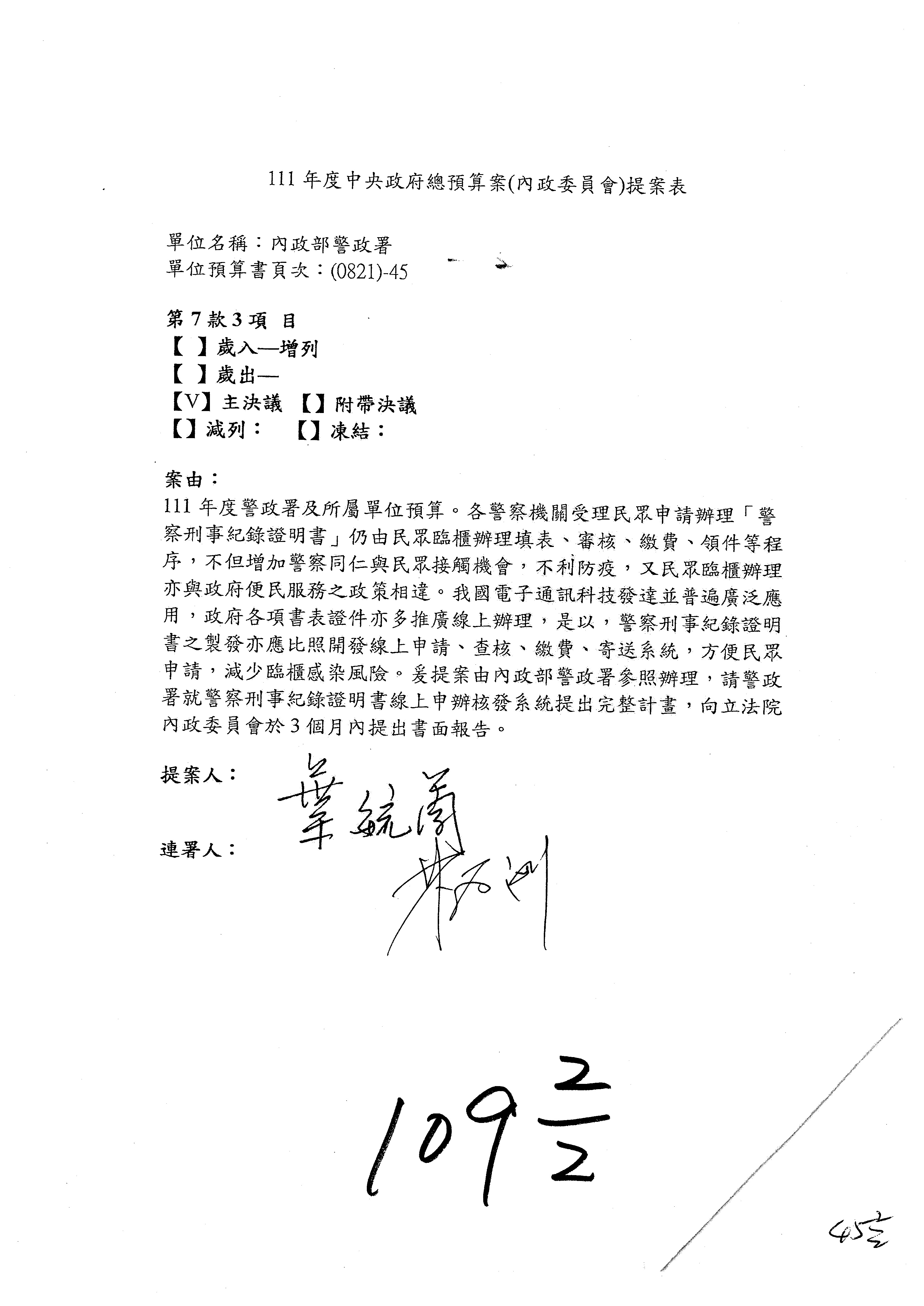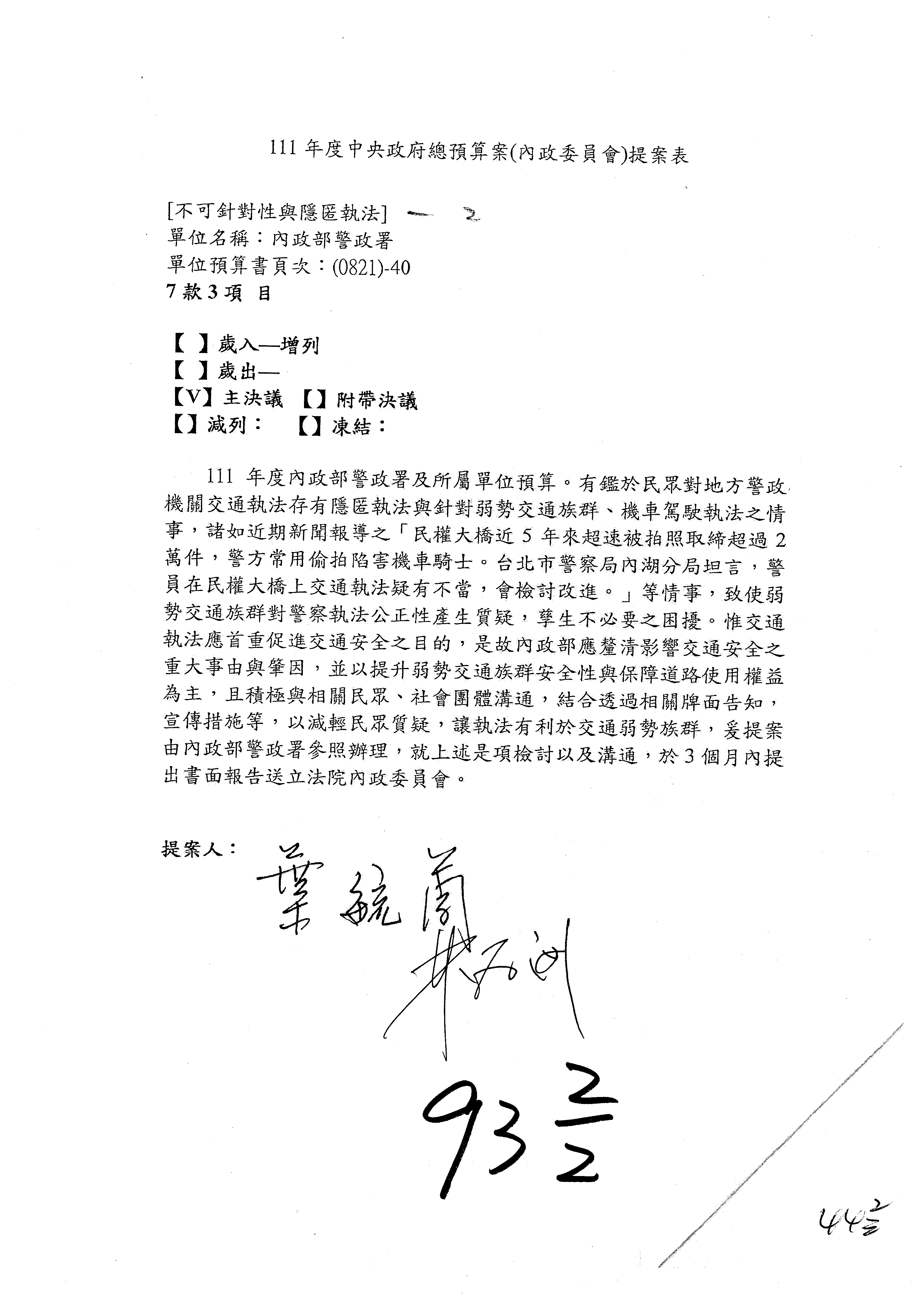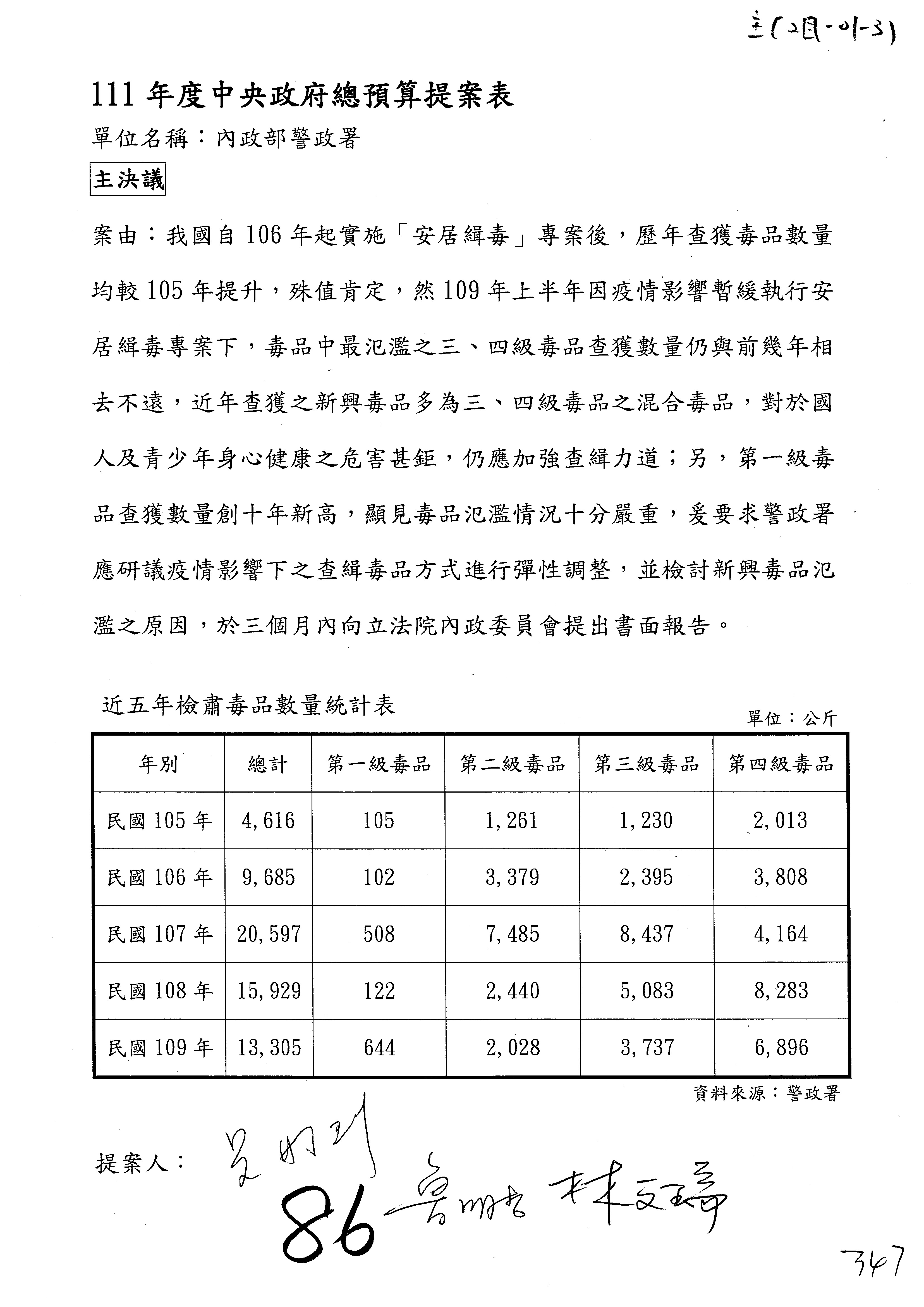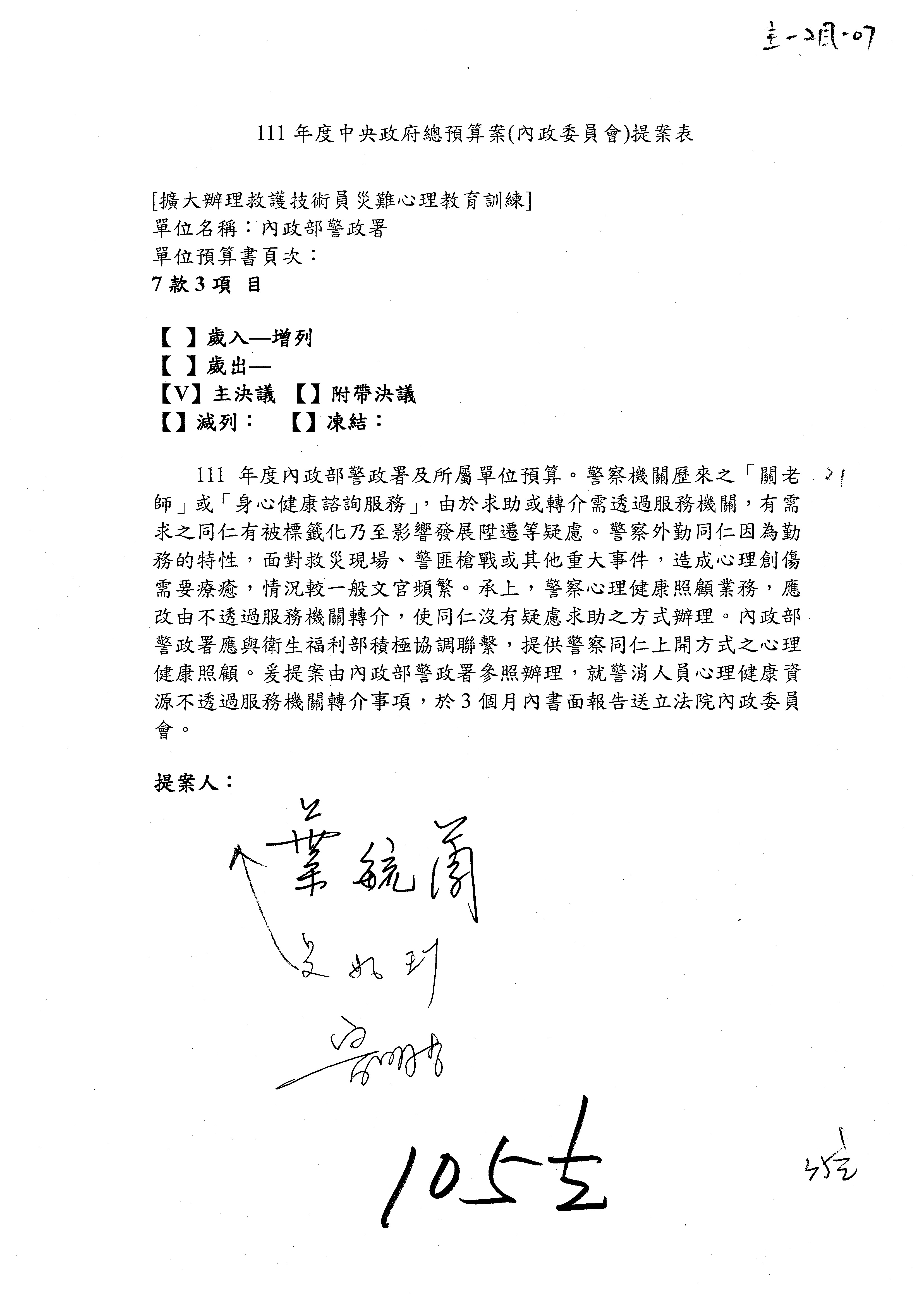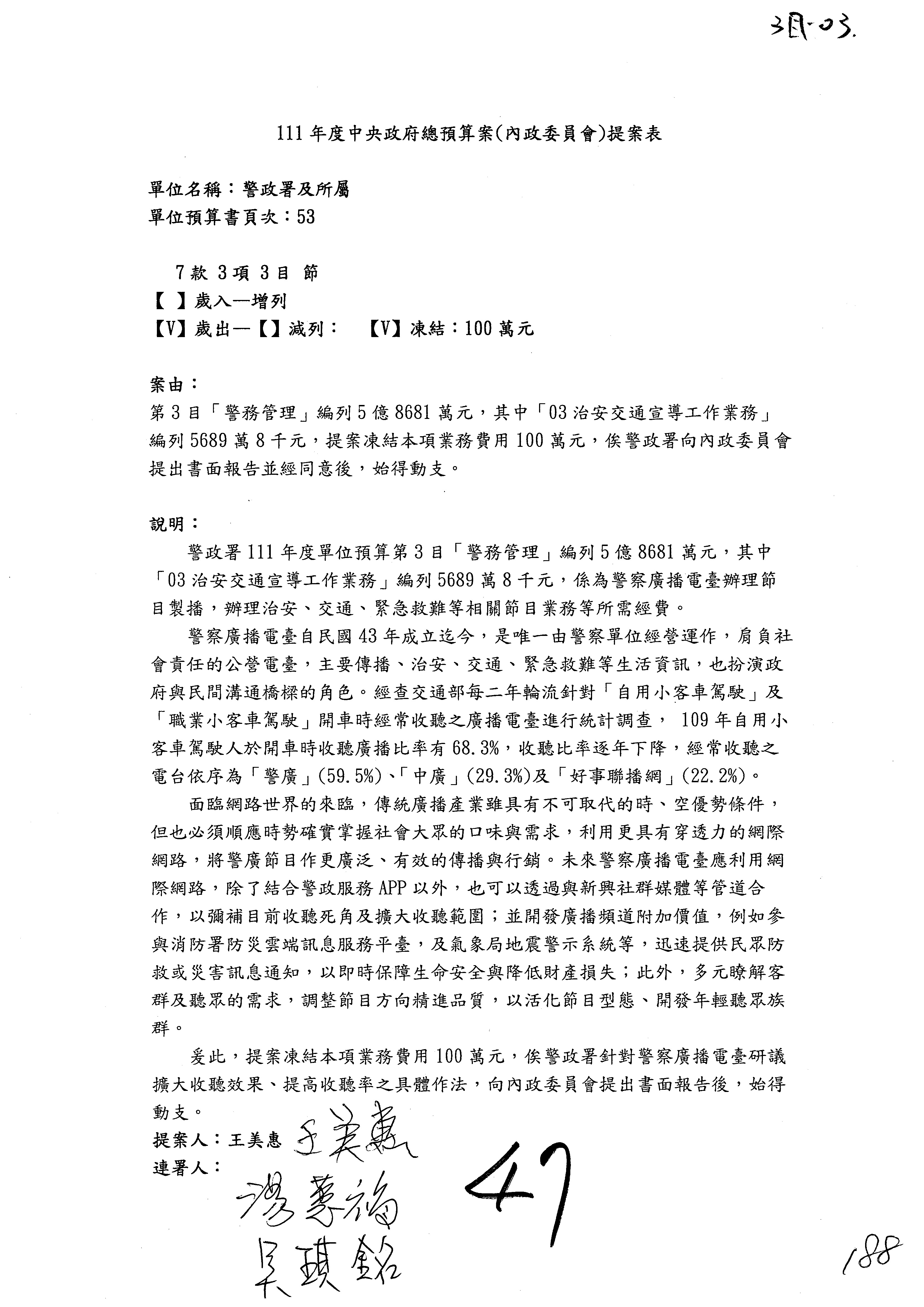 主席:現在進行預算處理,今天預算審查的順序依序為:警政署及所屬、中央警察大學、消防署及所屬、移民署、役政署及空中勤務總隊等單位預算,以上每個單位的預算數已宣讀完畢。