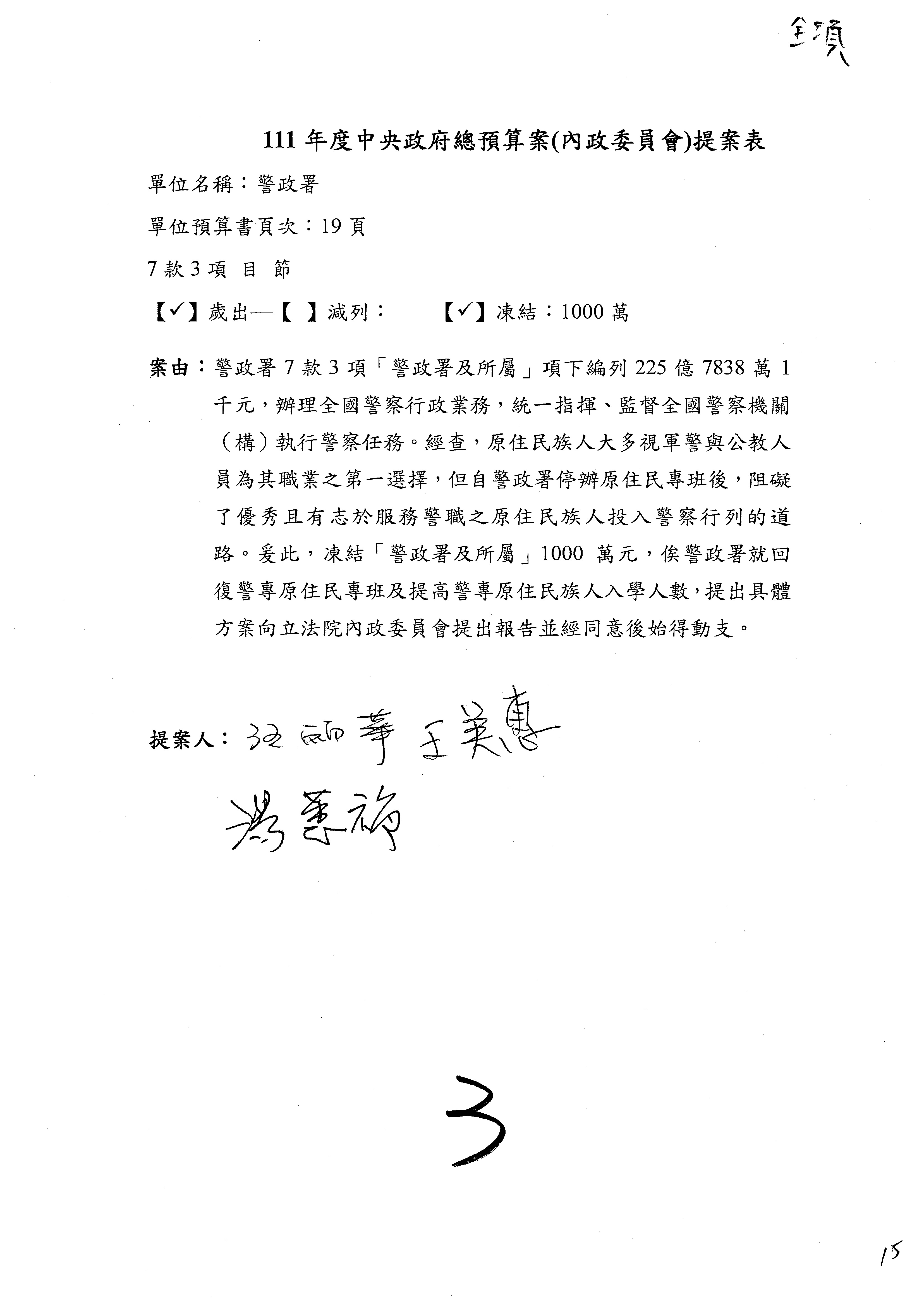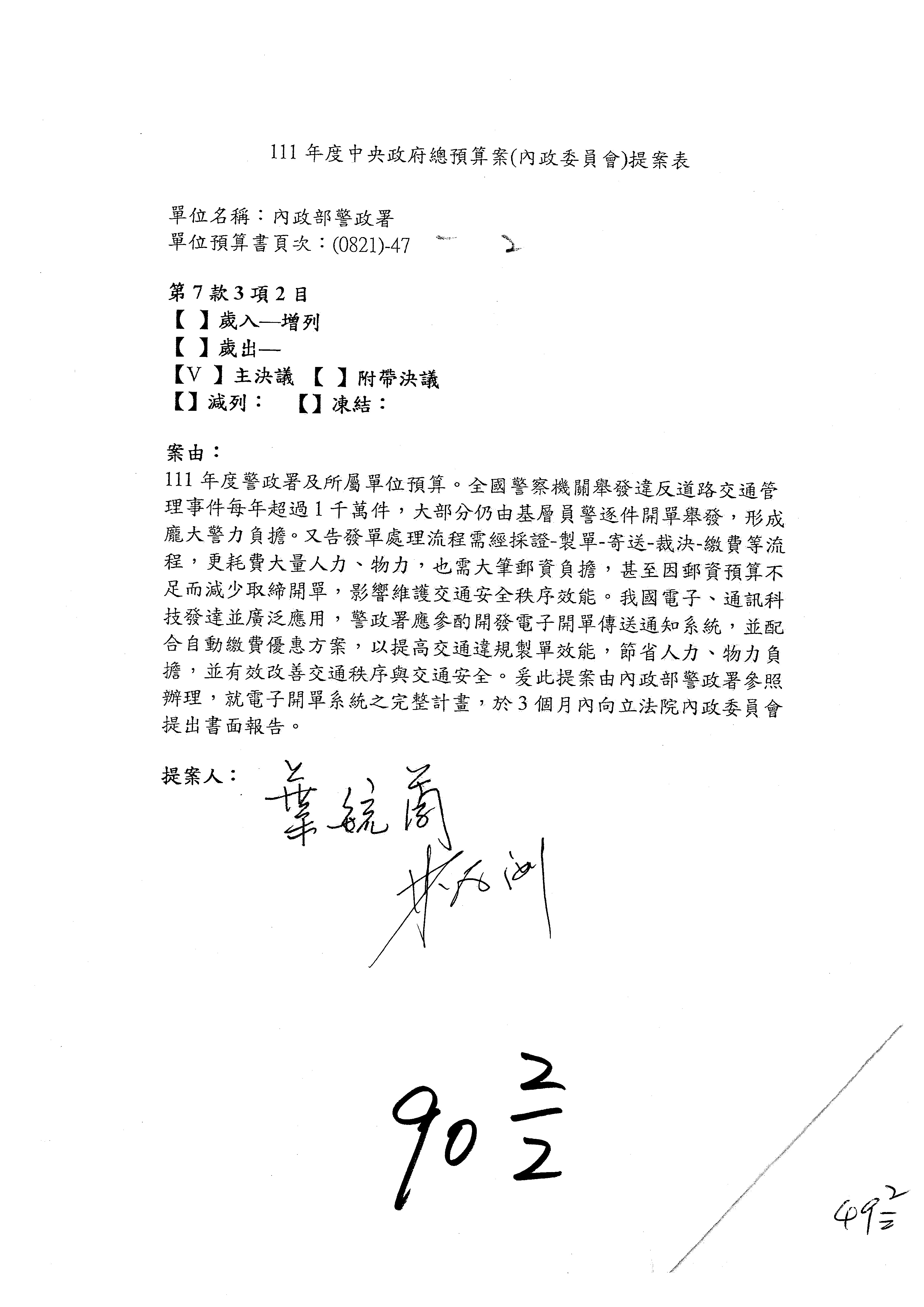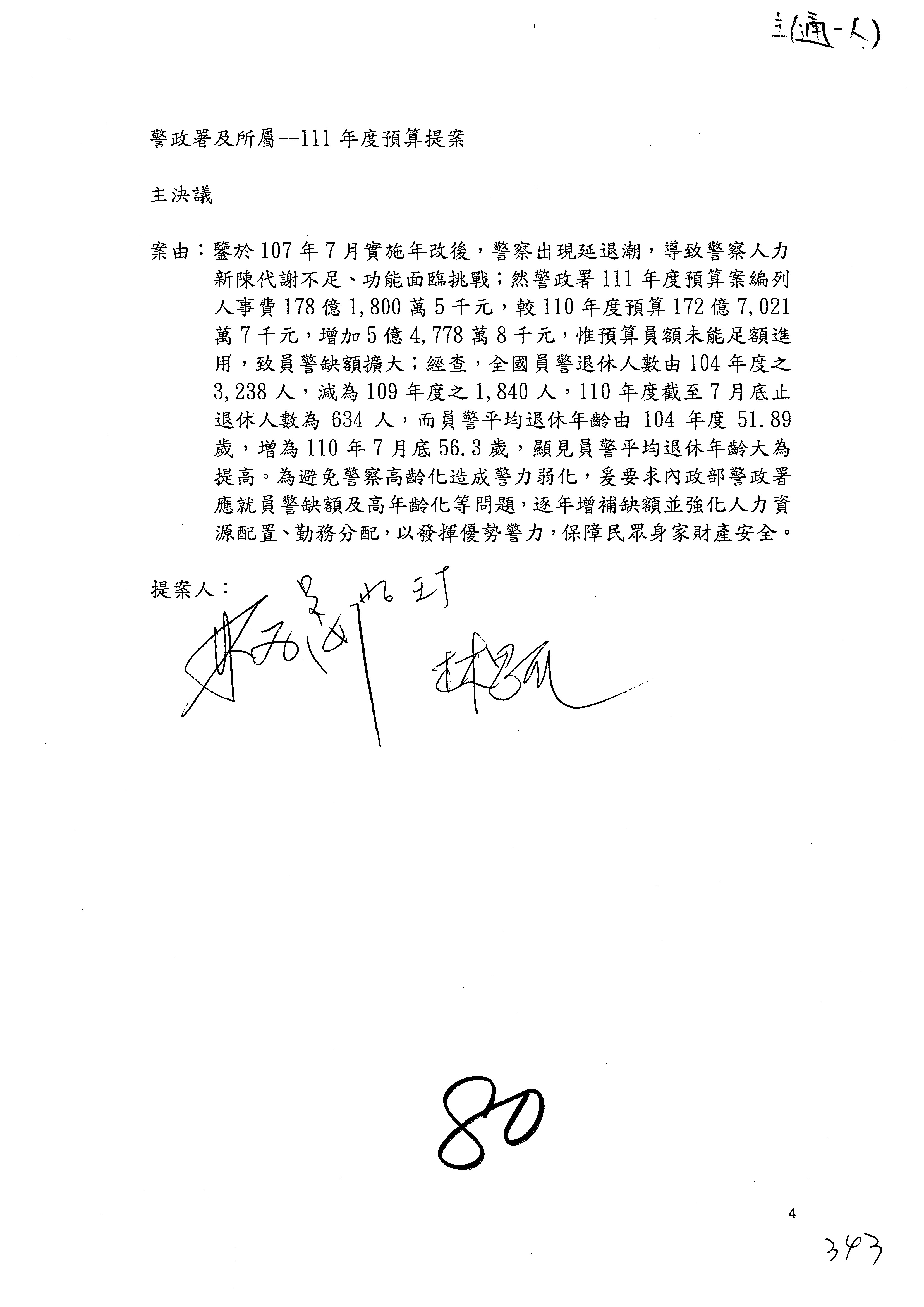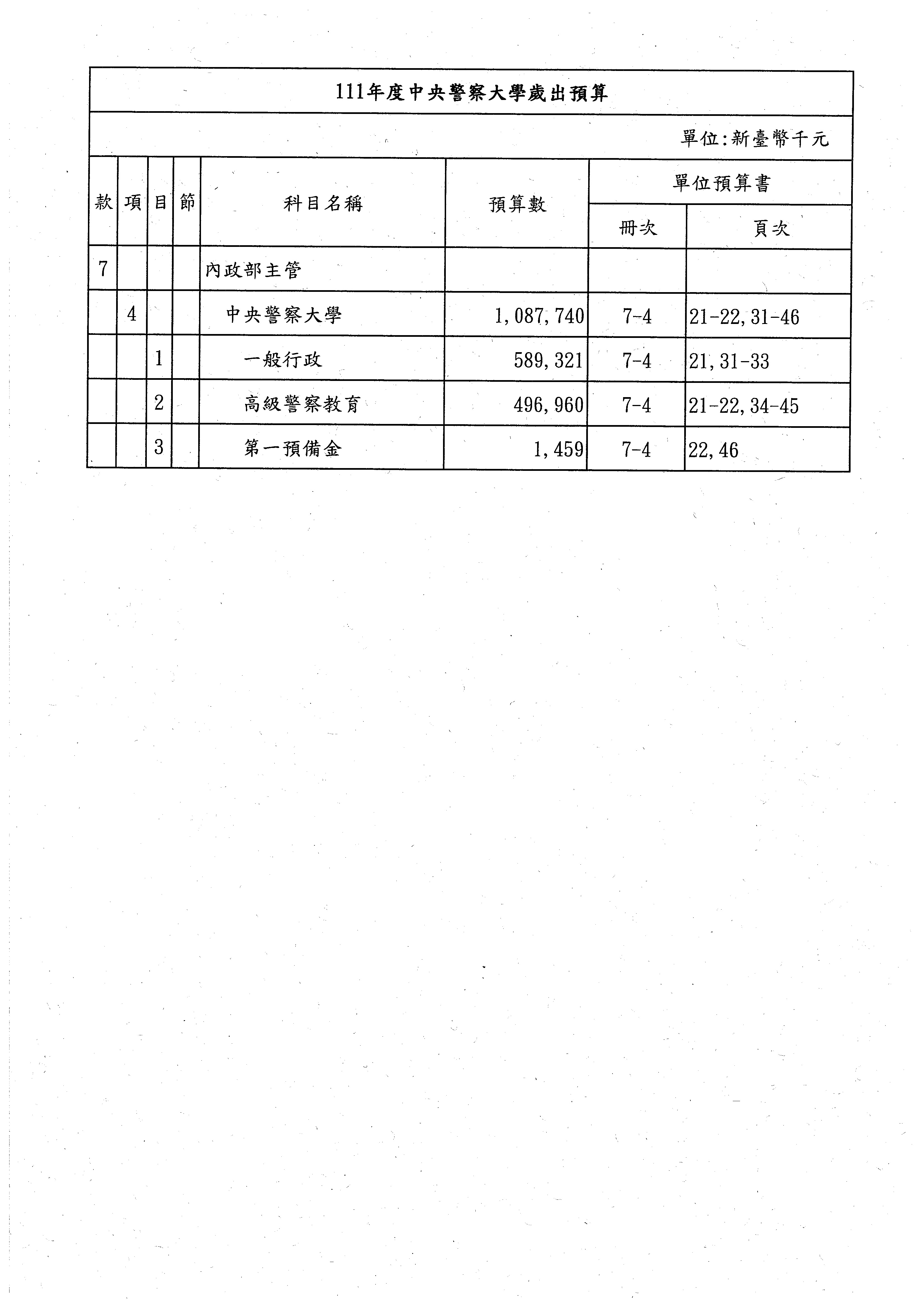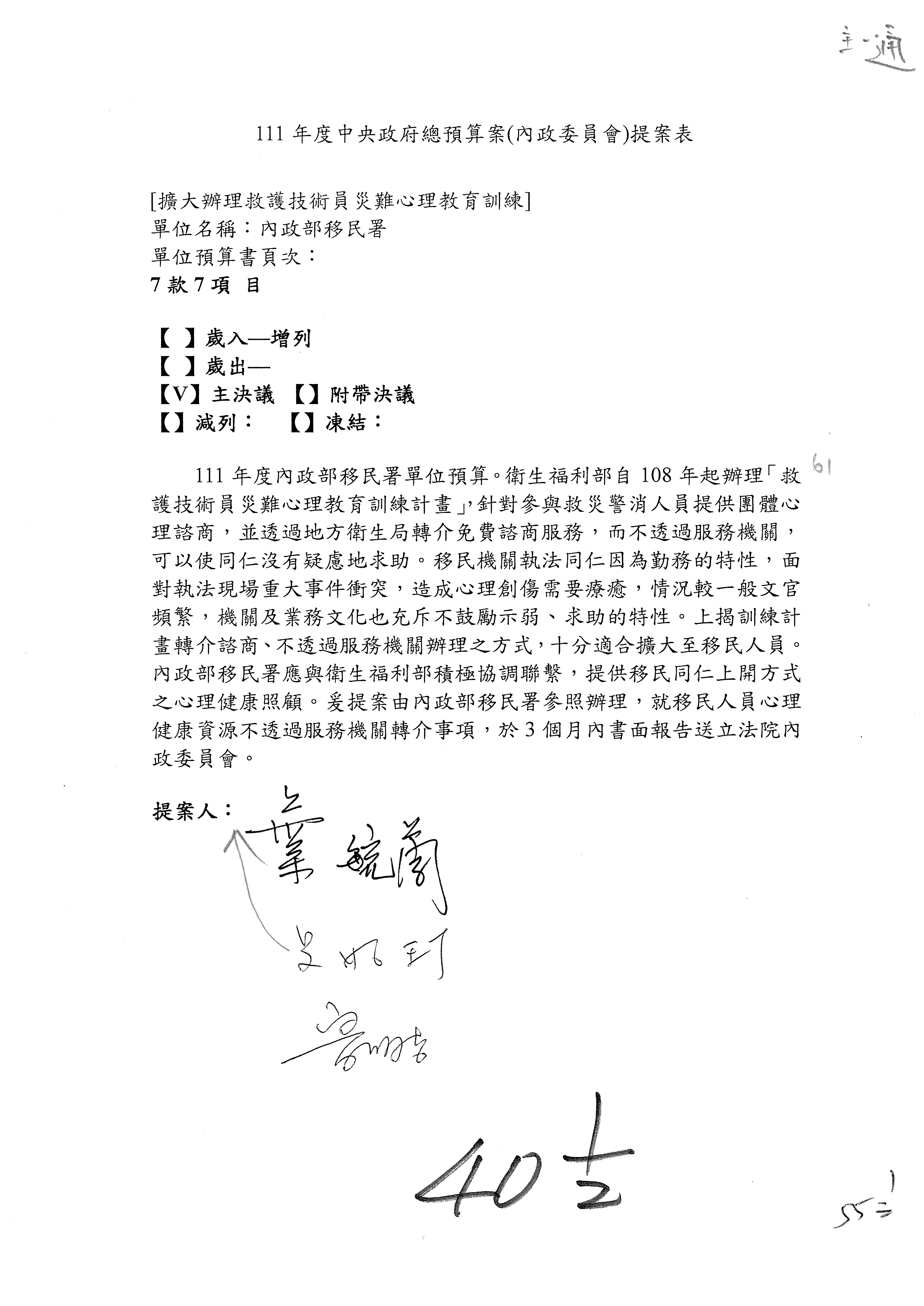 主席:現在進行預算處理,今天預算審查的順序依序為:警政署及所屬、中央警察大學、消防署及所屬、移民署、役政署及空中勤務總隊等單位預算,以上每個單位的預算數已宣讀完畢。