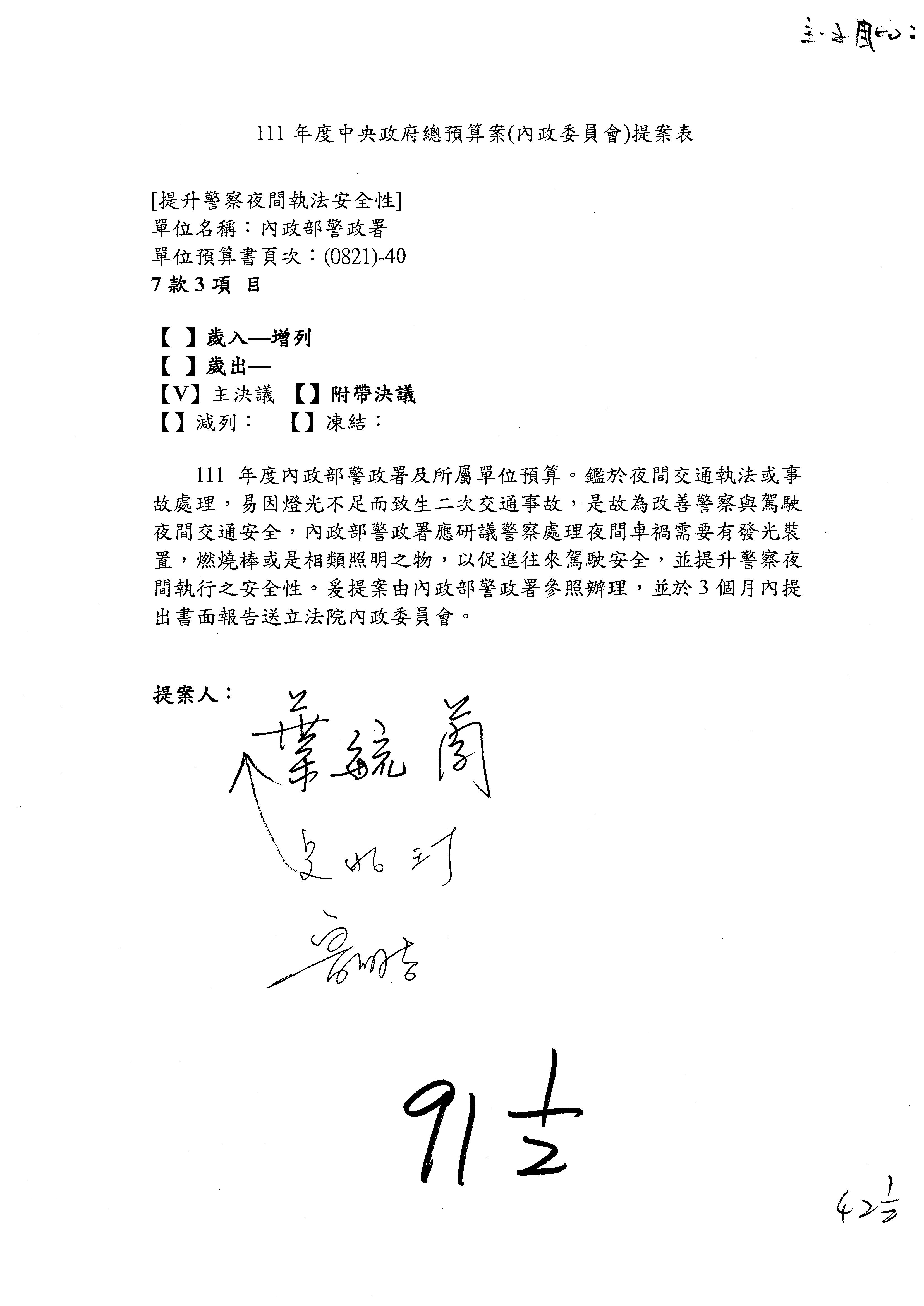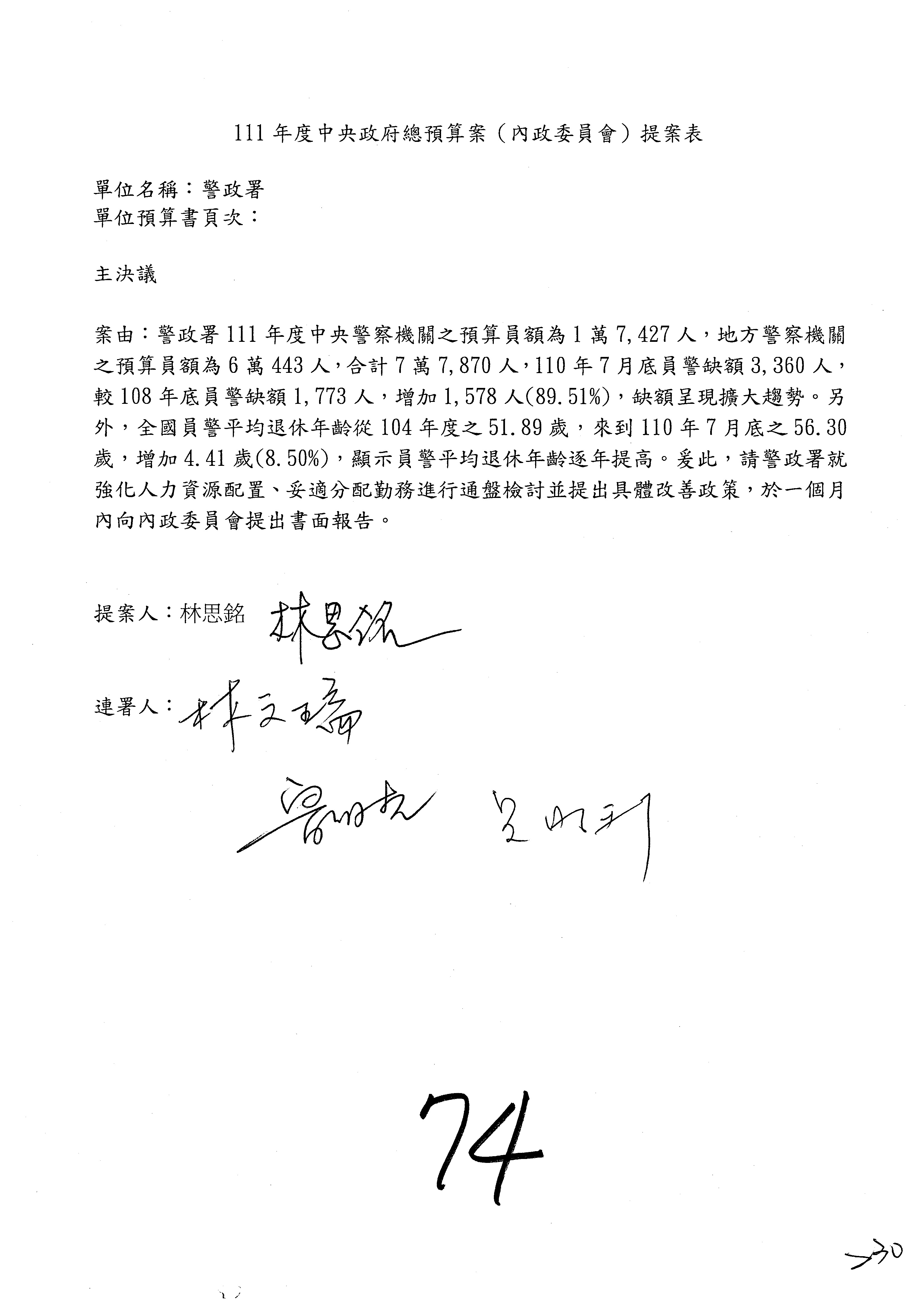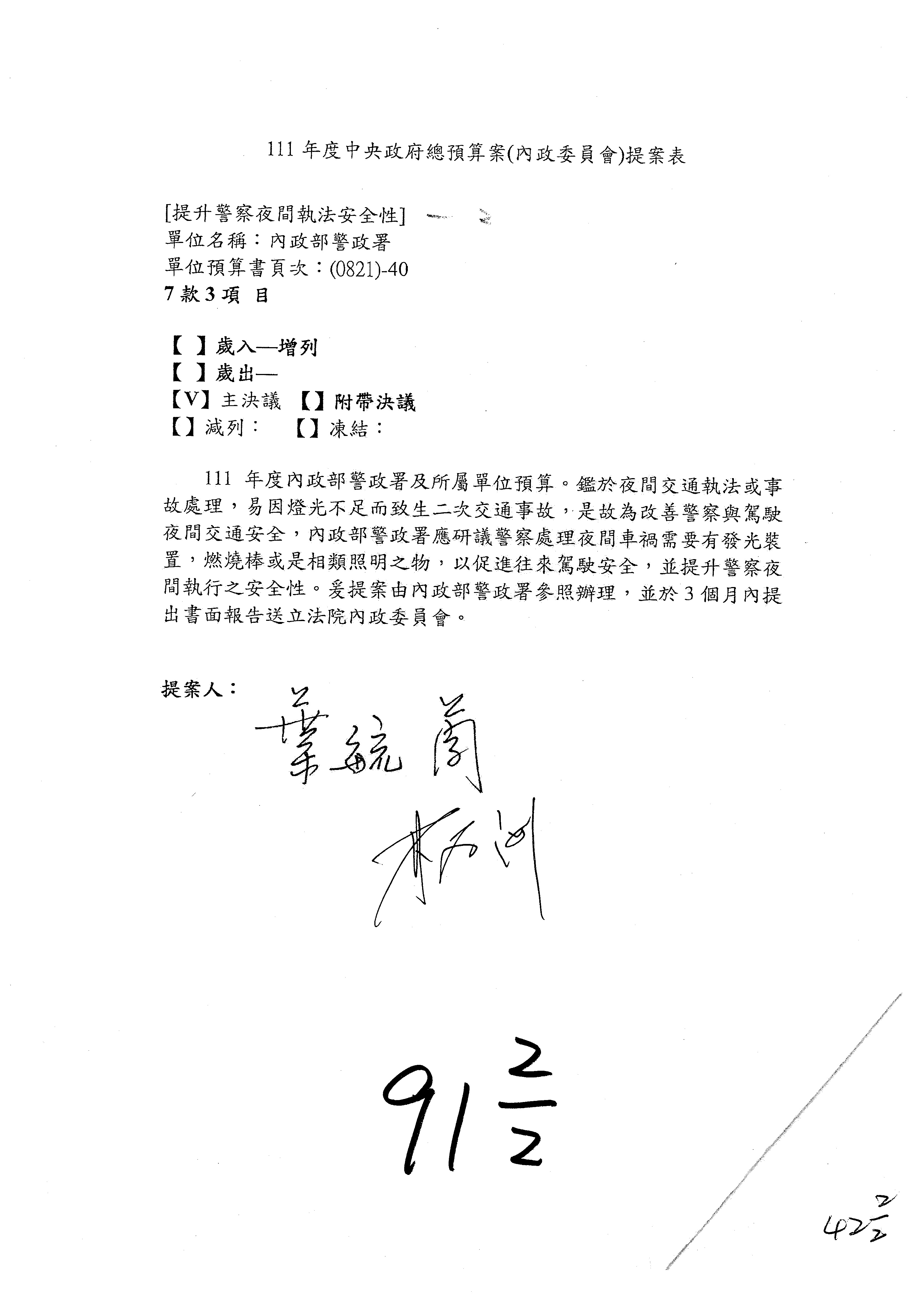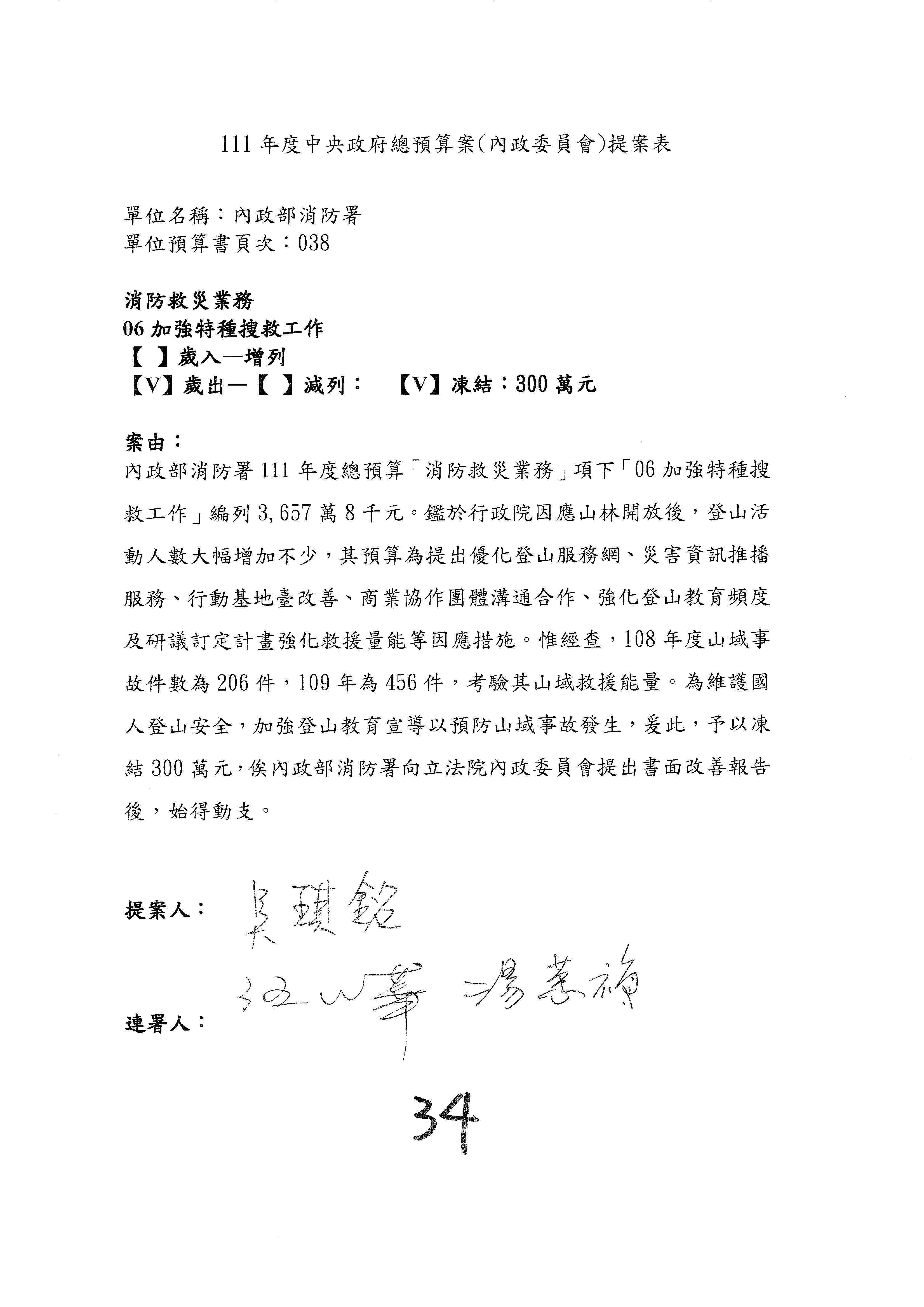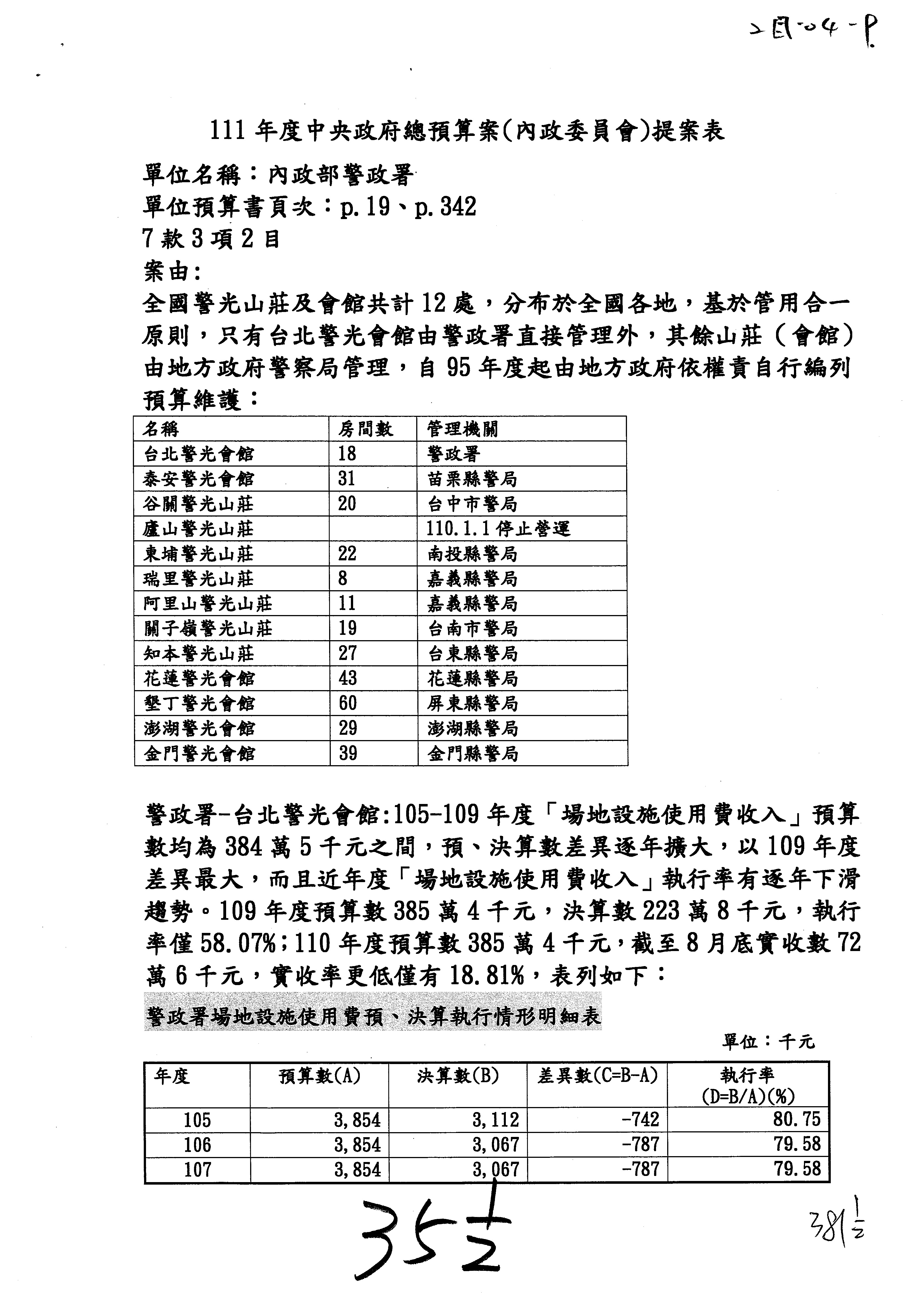 主席:現在進行預算處理,今天預算審查的順序依序為:警政署及所屬、中央警察大學、消防署及所屬、移民署、役政署及空中勤務總隊等單位預算,以上每個單位的預算數已宣讀完畢。