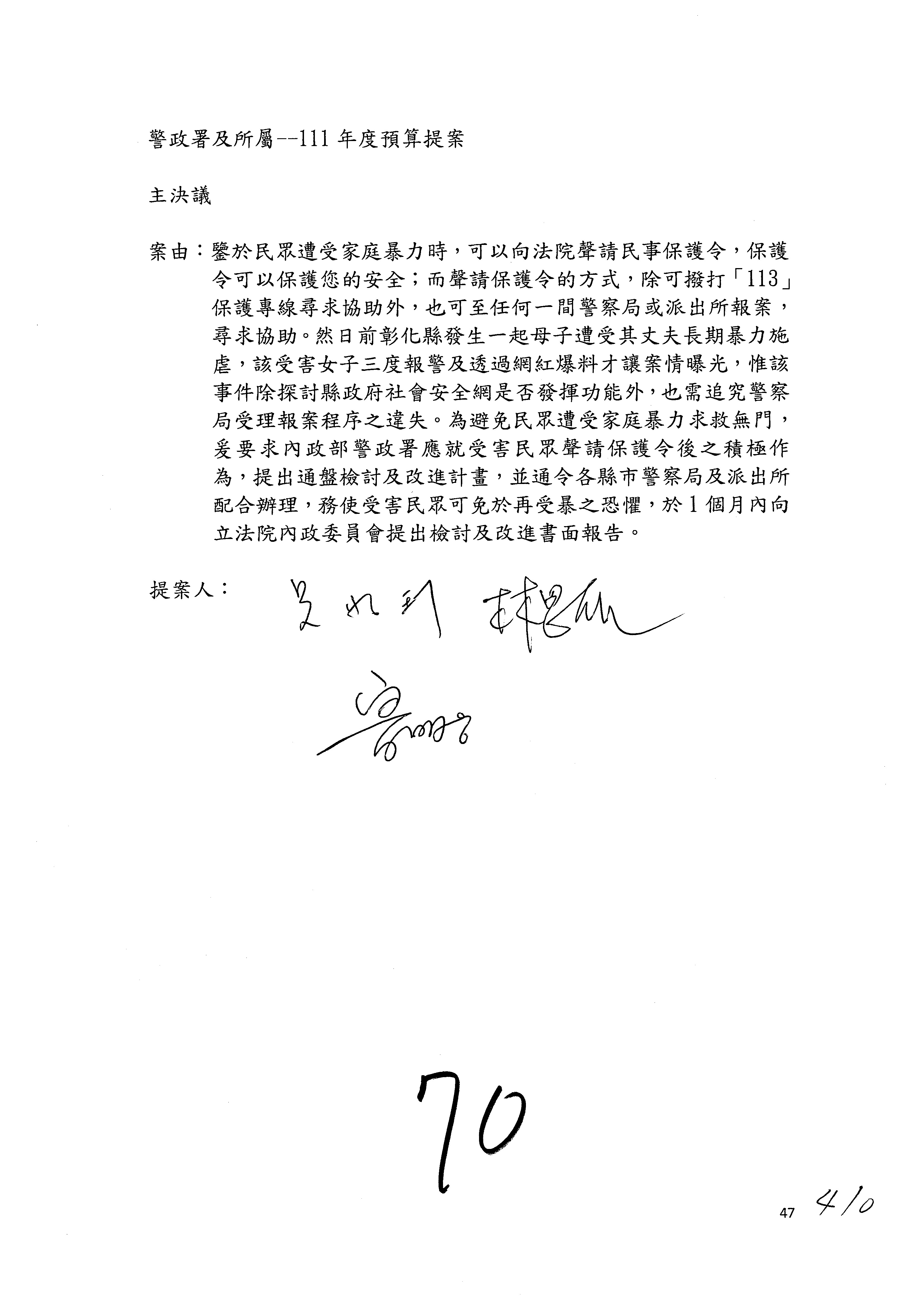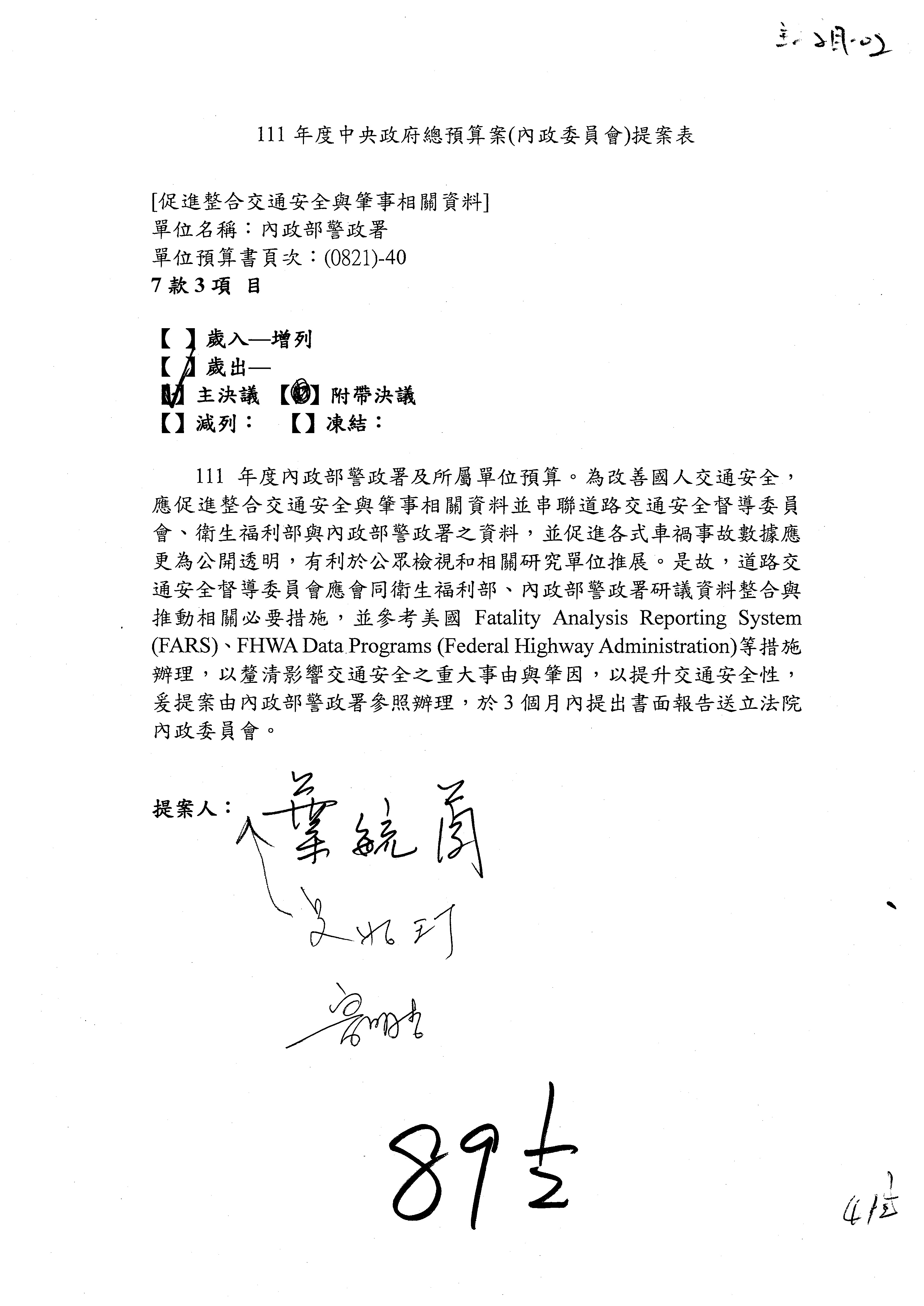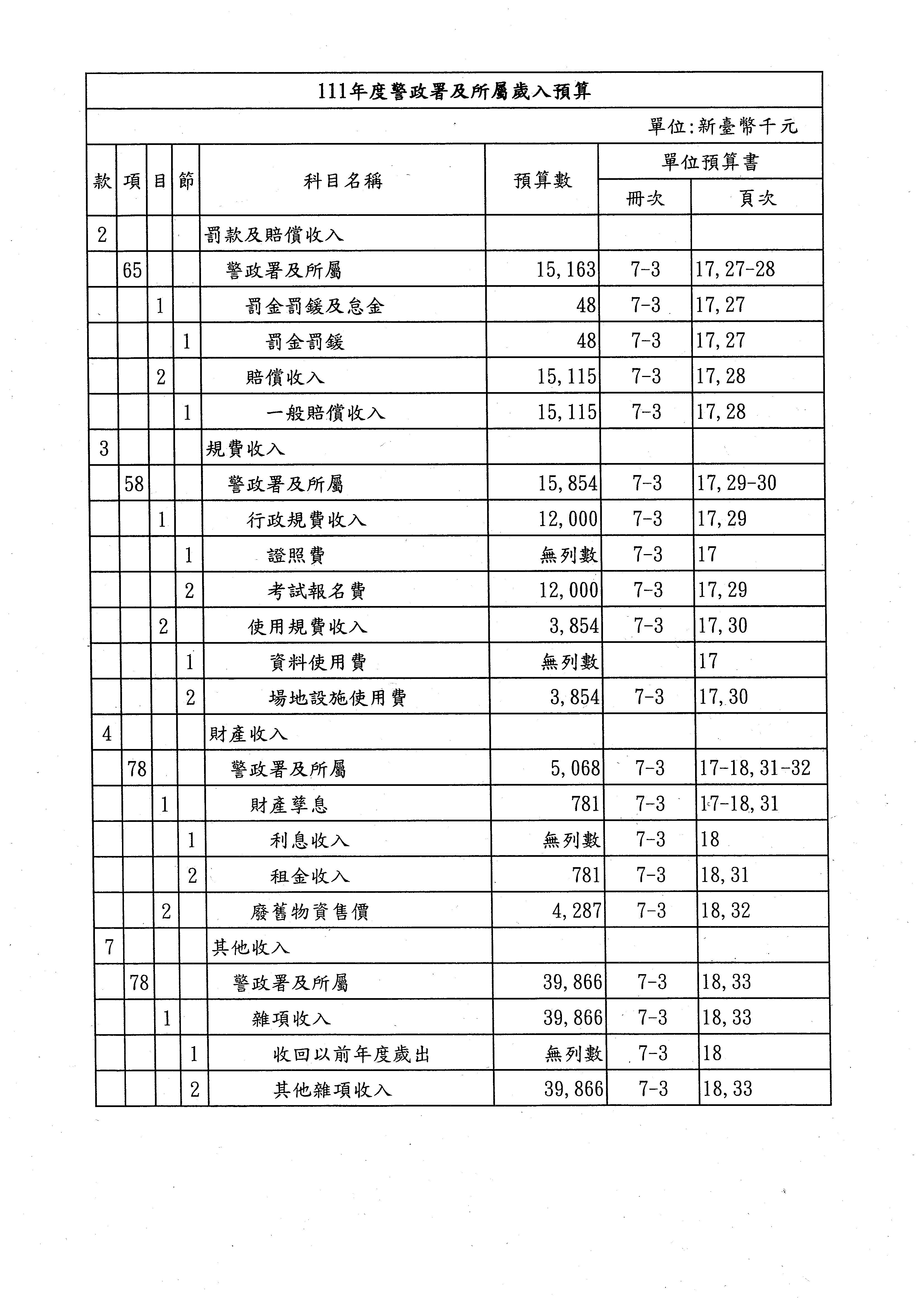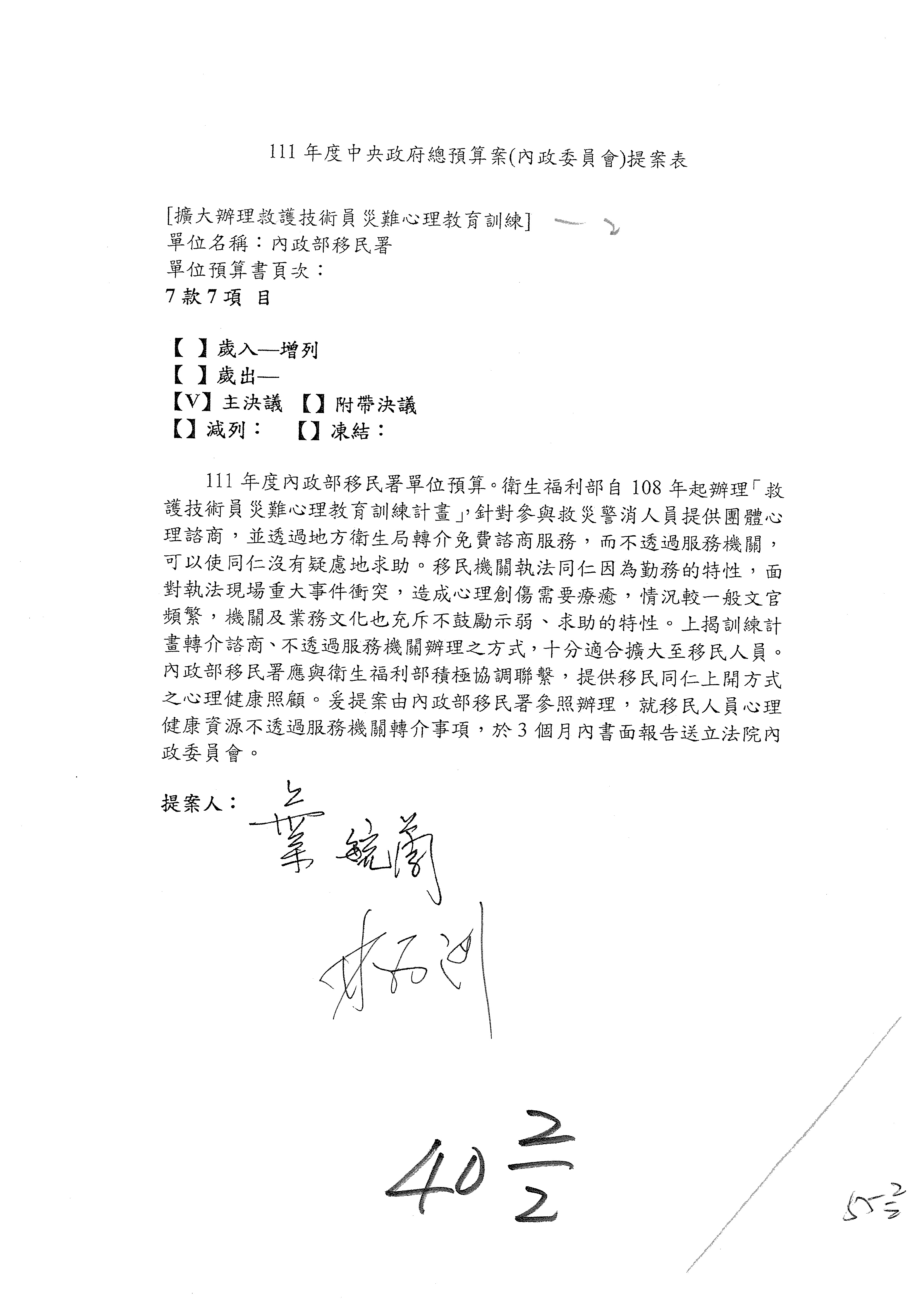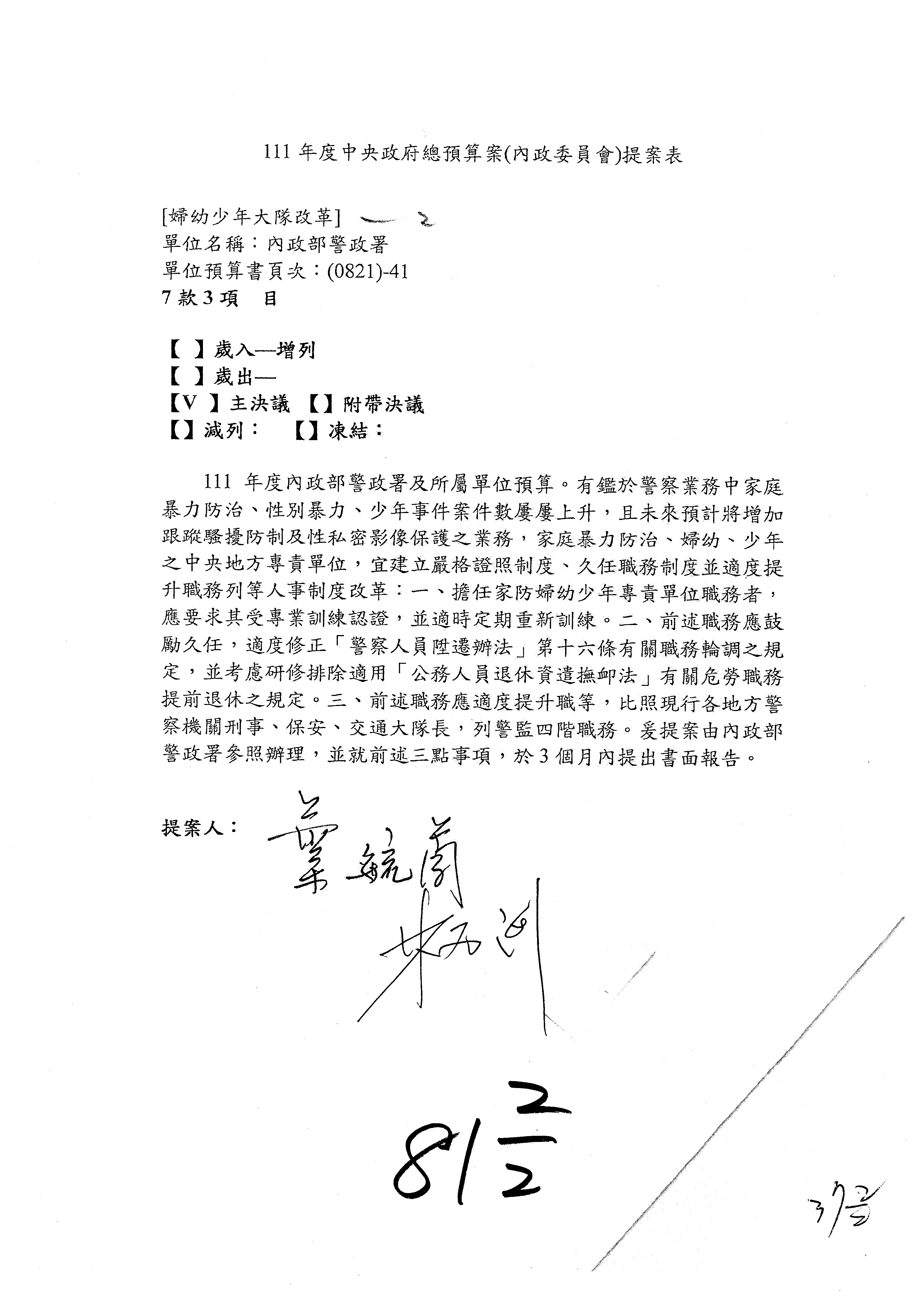 主席:現在進行預算處理,今天預算審查的順序依序為:警政署及所屬、中央警察大學、消防署及所屬、移民署、役政署及空中勤務總隊等單位預算,以上每個單位的預算數已宣讀完畢。