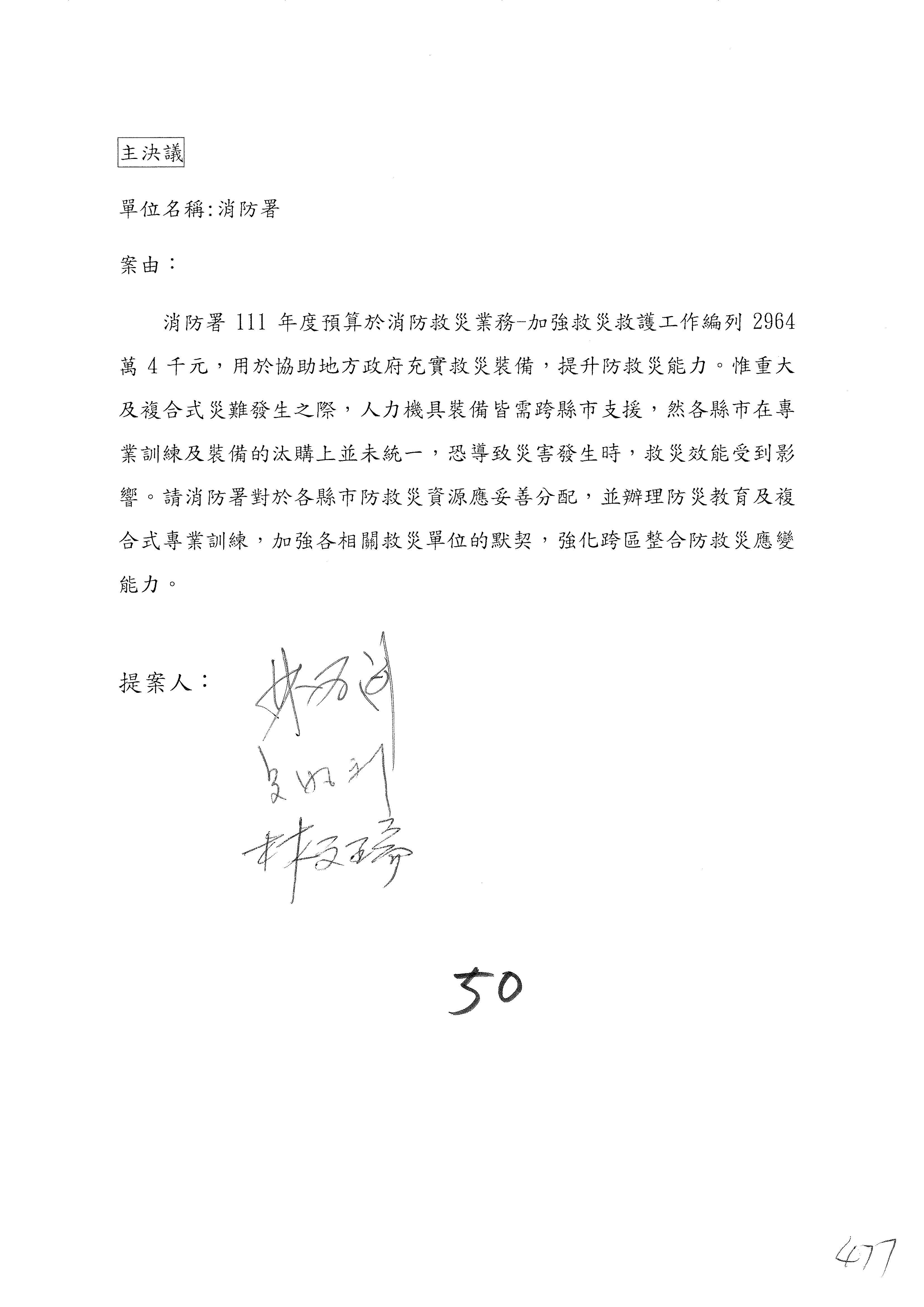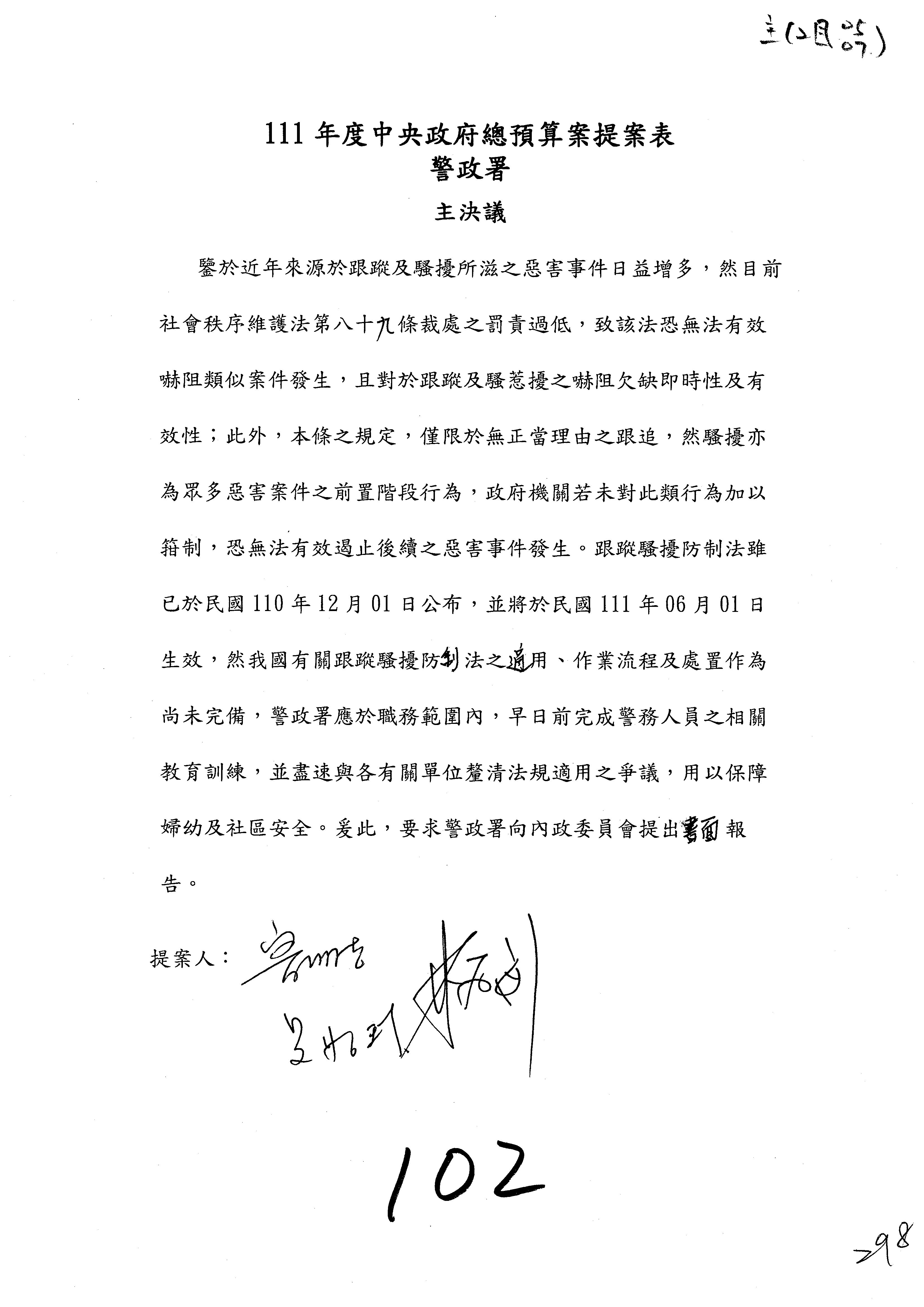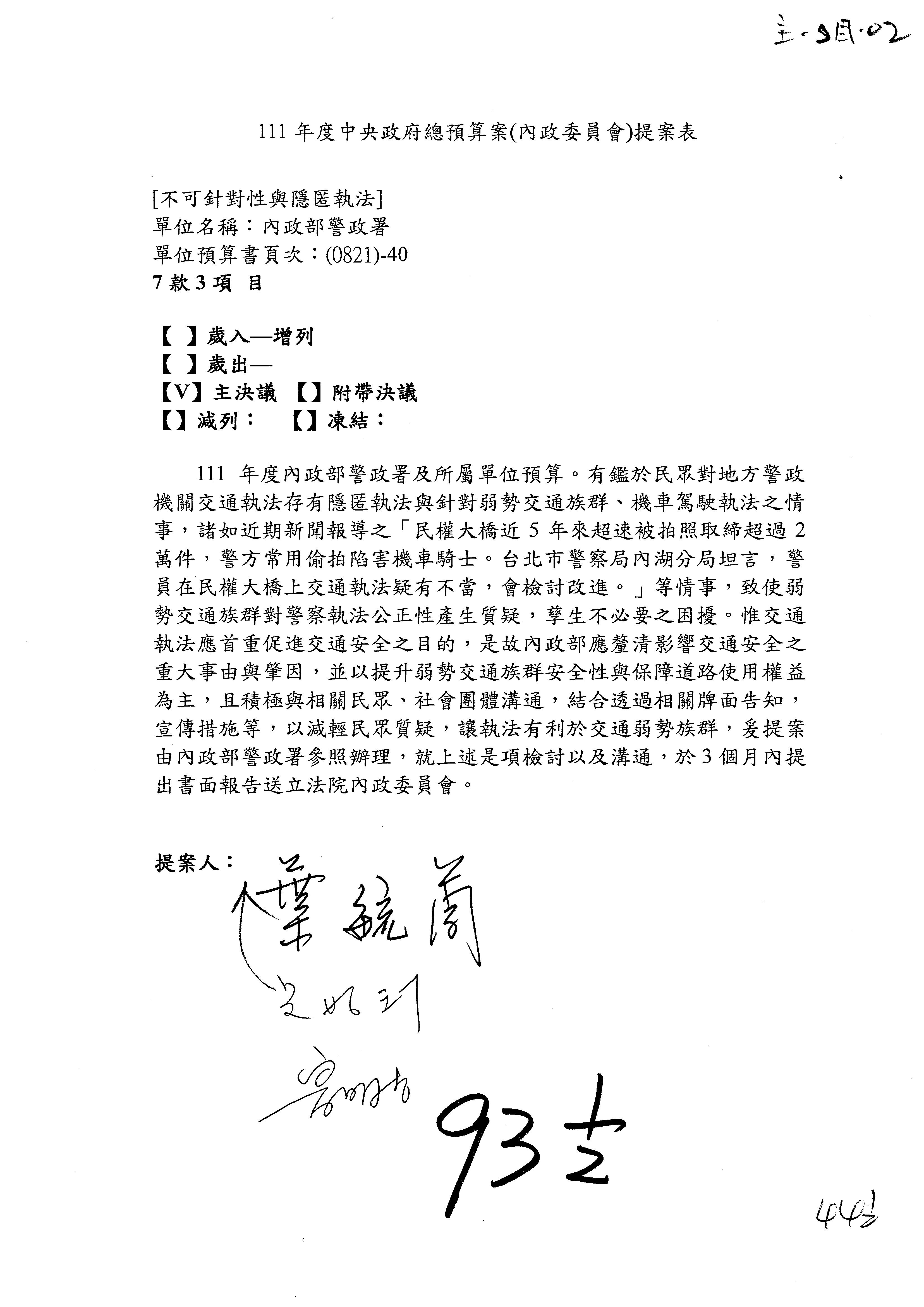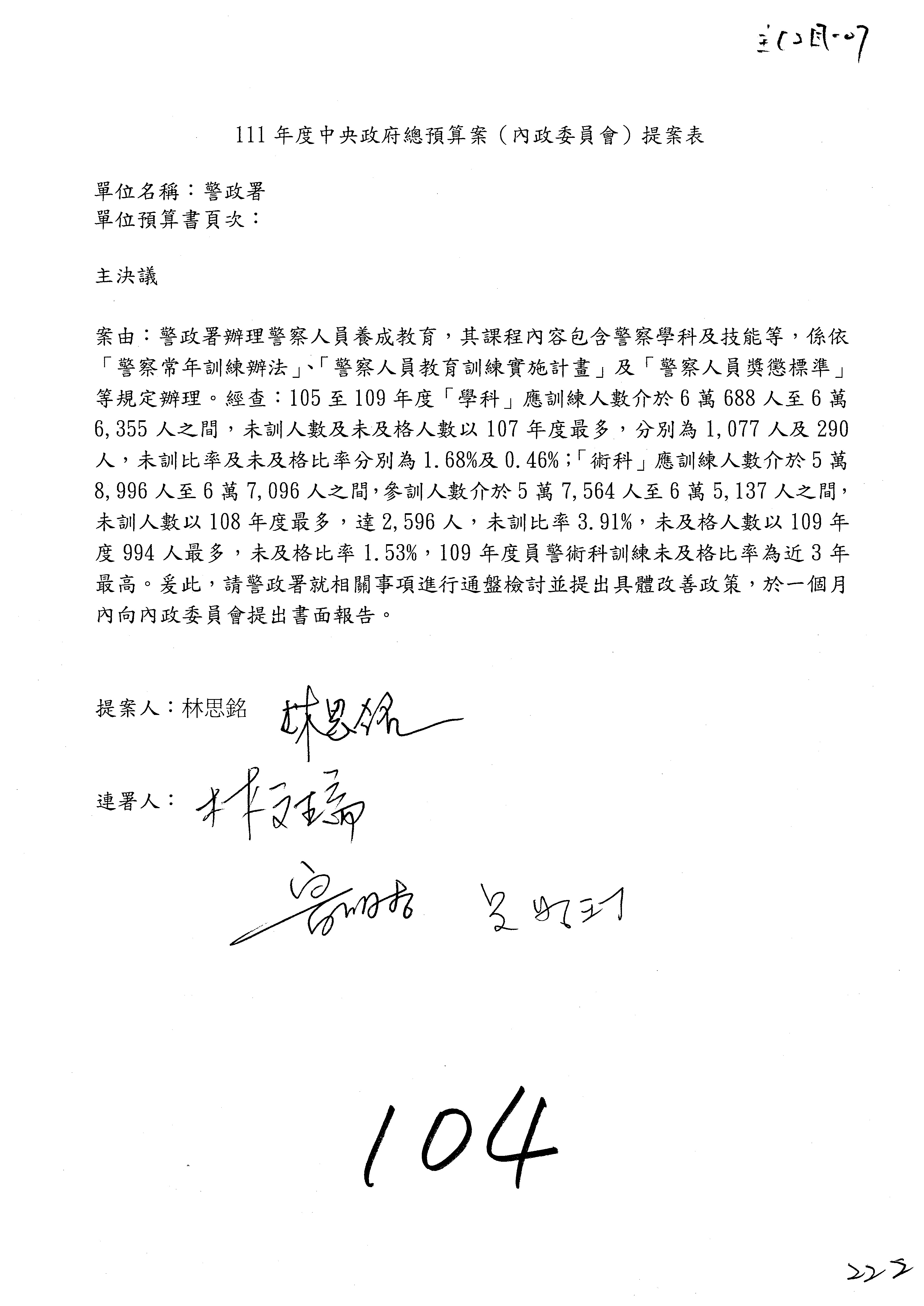 主席:現在進行預算處理,今天預算審查的順序依序為:警政署及所屬、中央警察大學、消防署及所屬、移民署、役政署及空中勤務總隊等單位預算,以上每個單位的預算數已宣讀完畢。