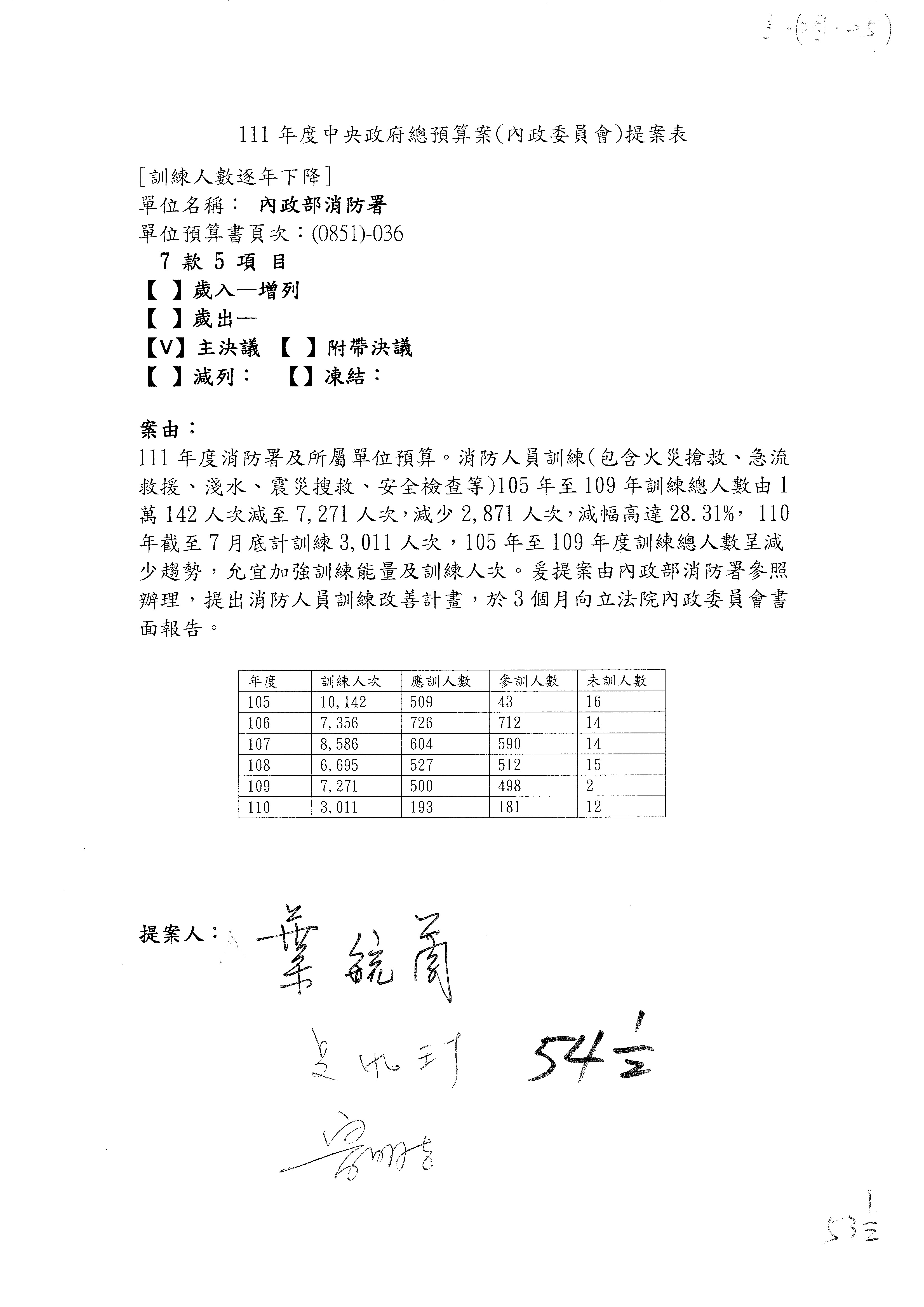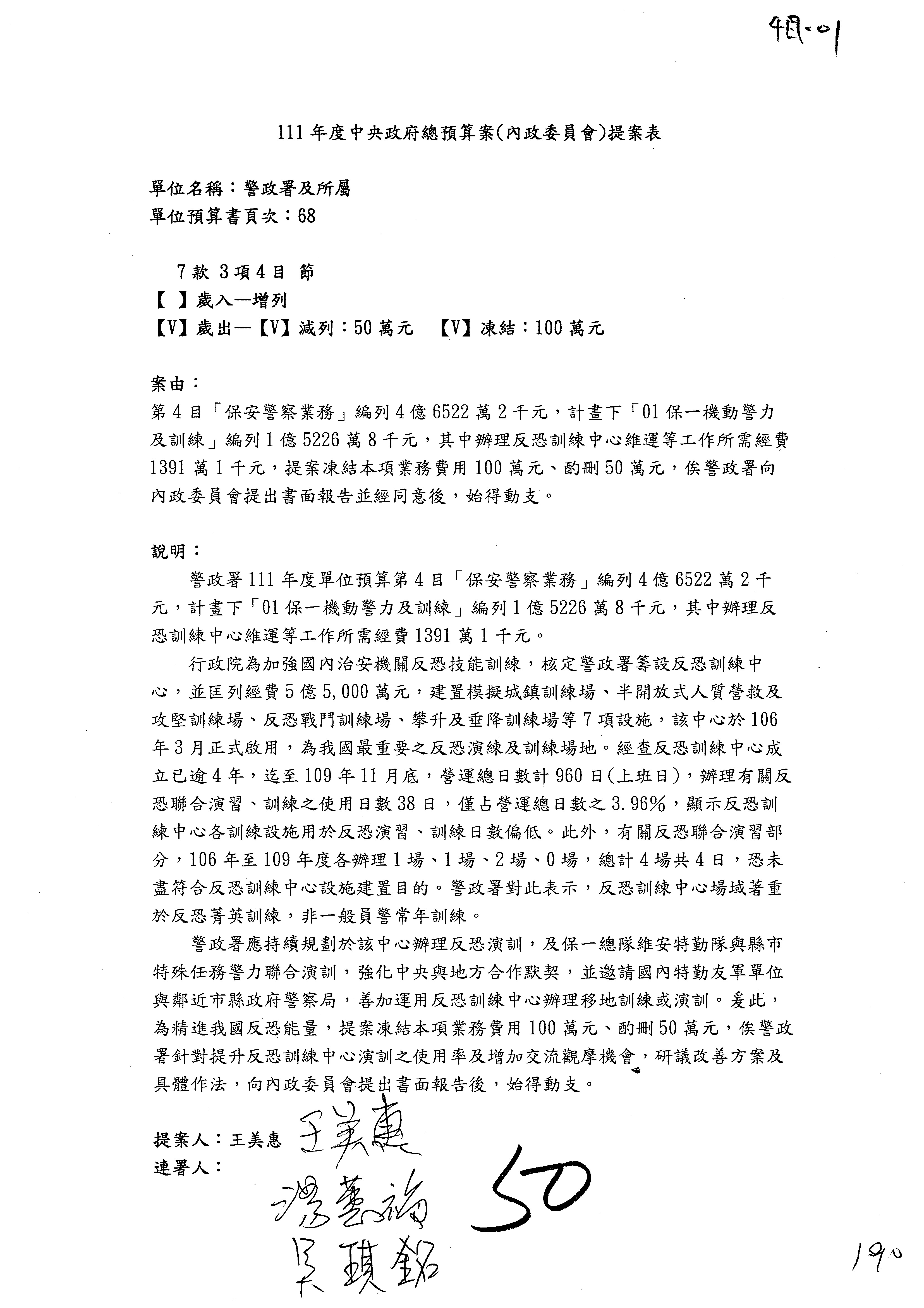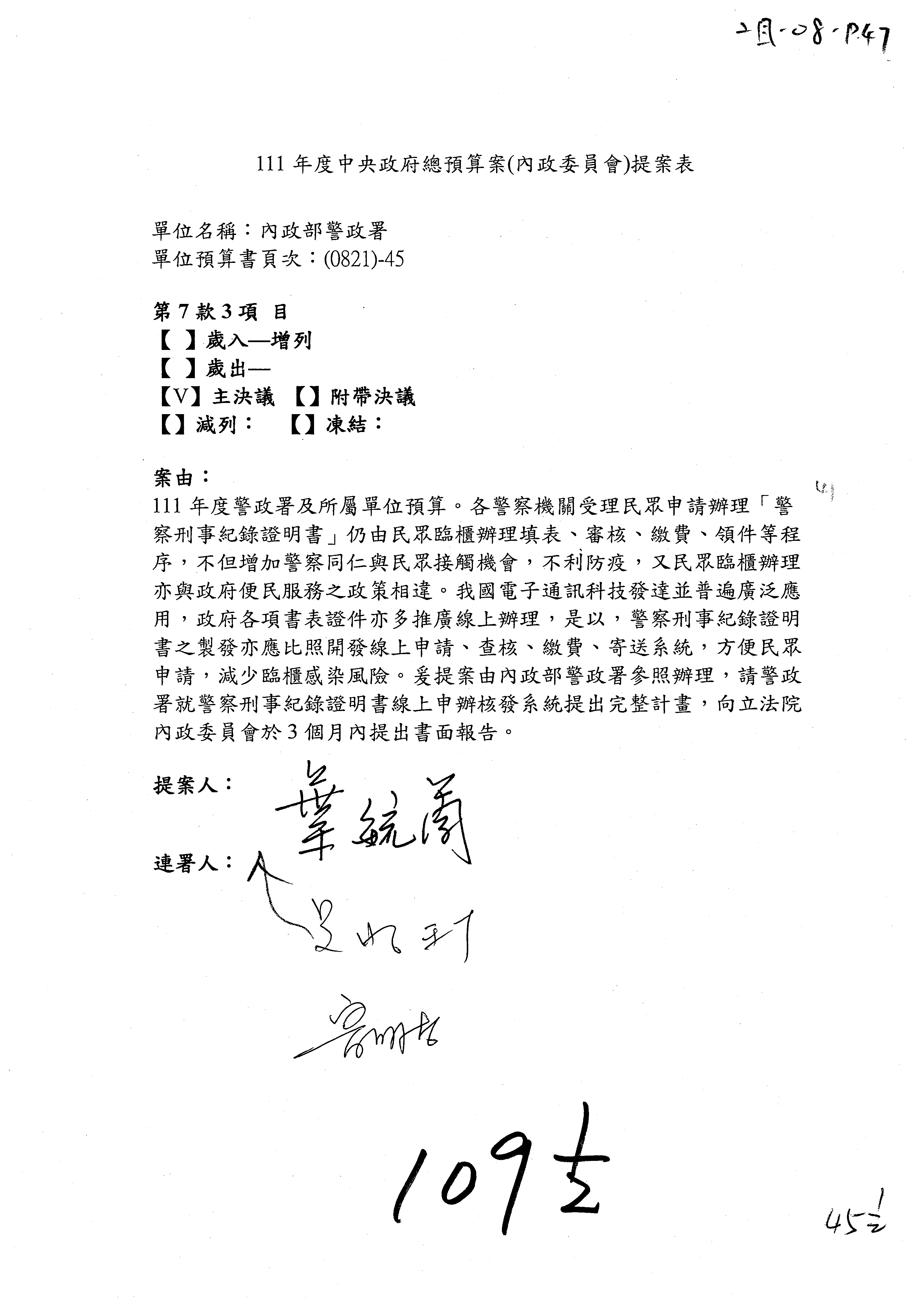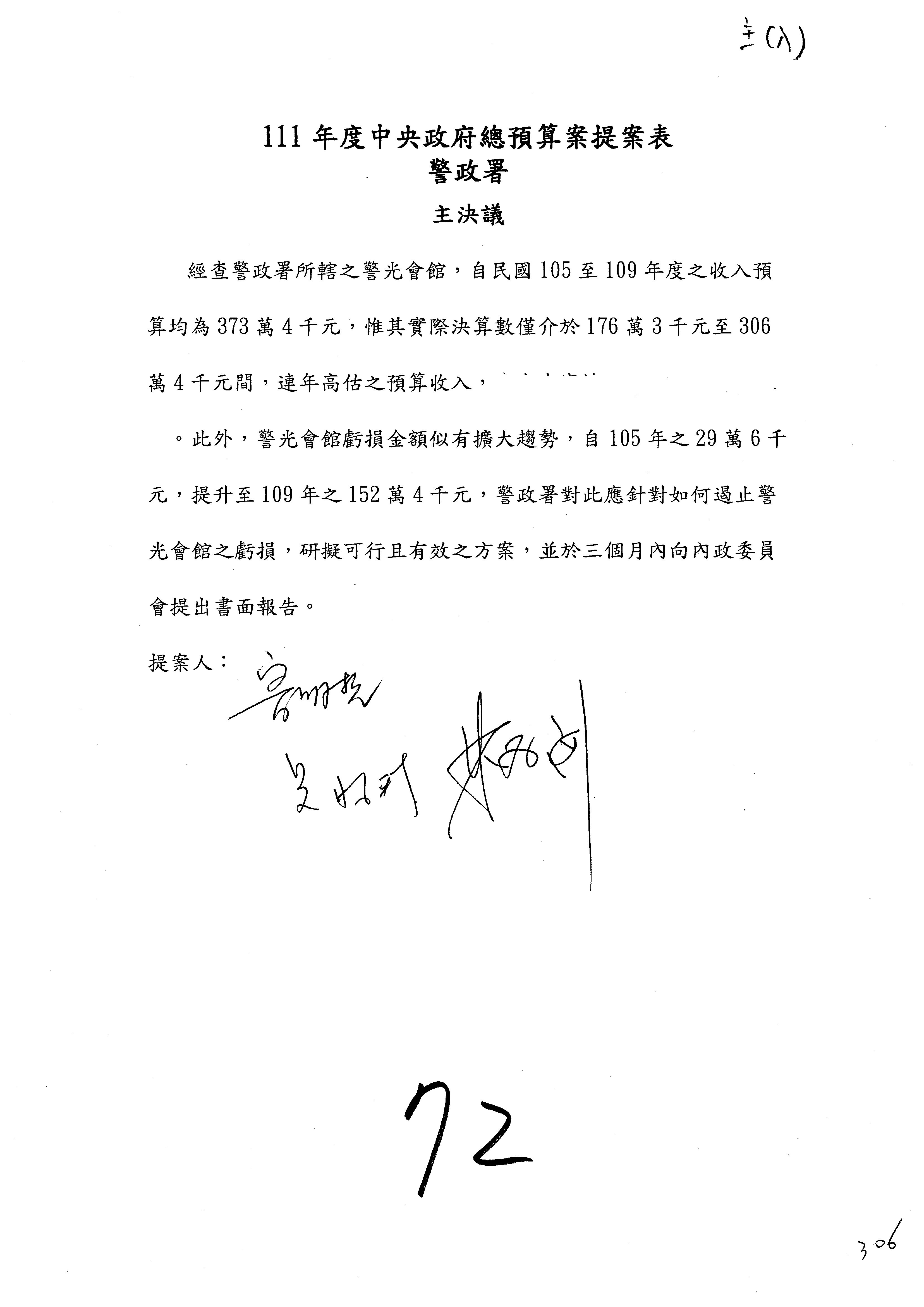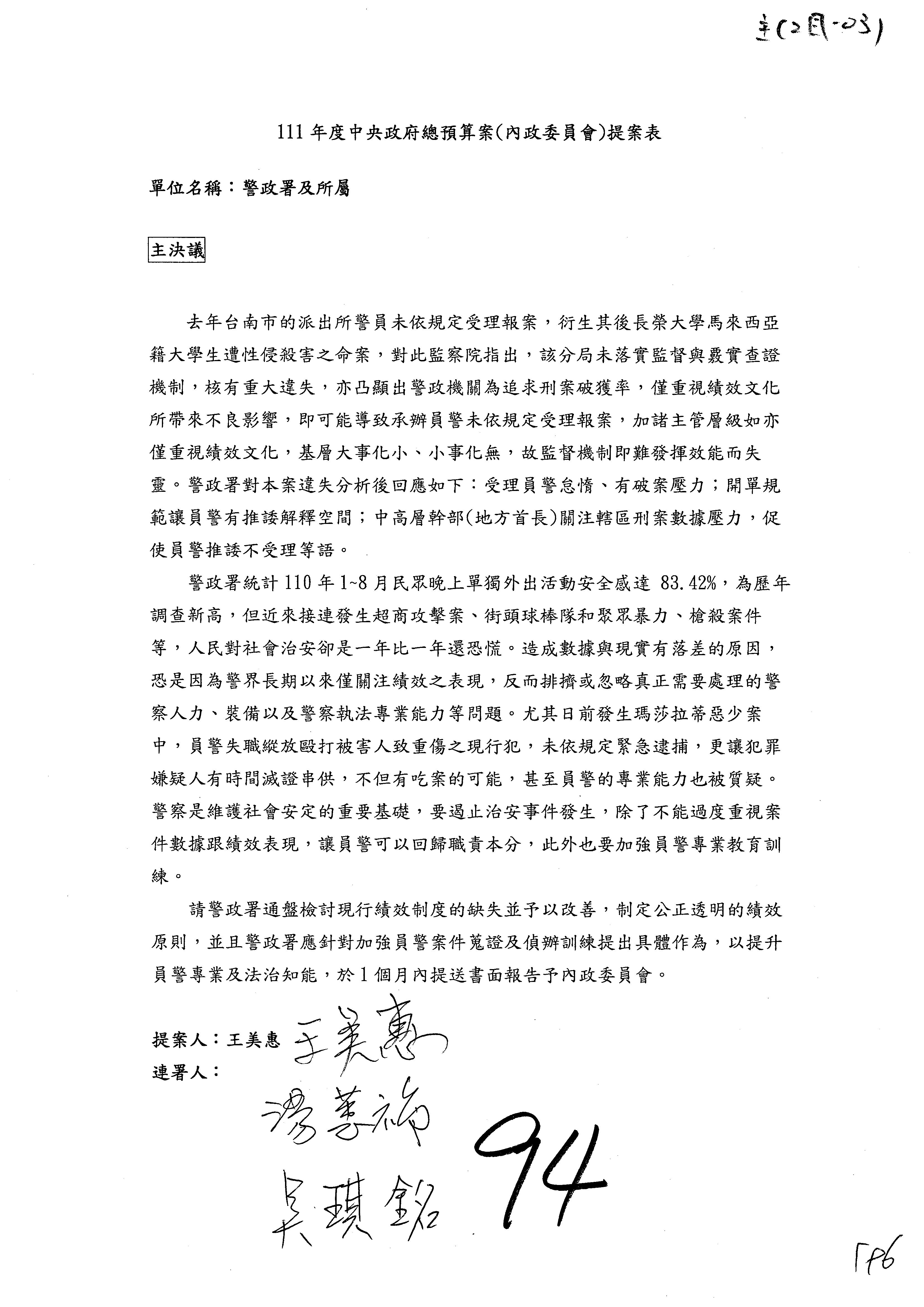 主席:現在進行預算處理,今天預算審查的順序依序為:警政署及所屬、中央警察大學、消防署及所屬、移民署、役政署及空中勤務總隊等單位預算,以上每個單位的預算數已宣讀完畢。