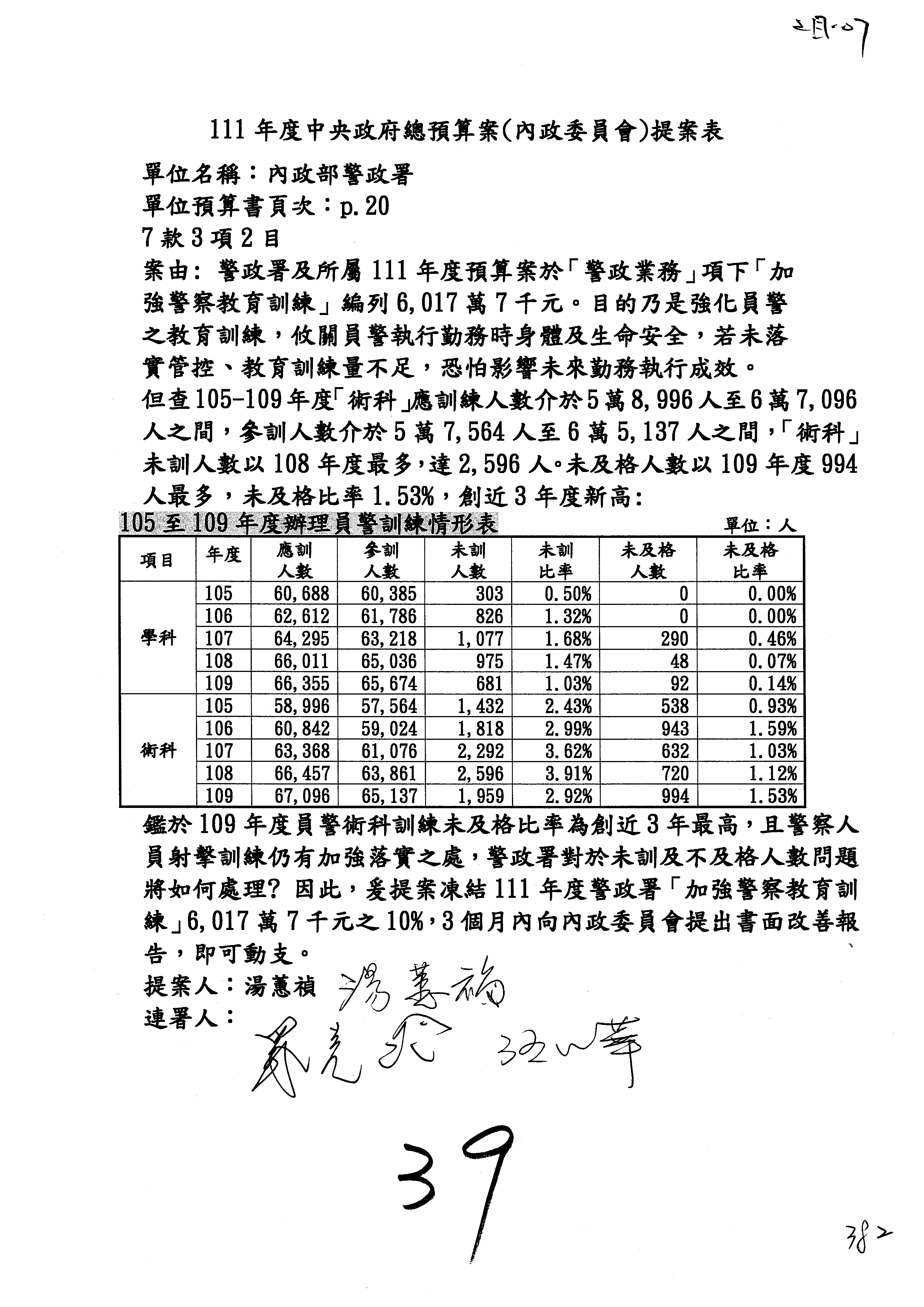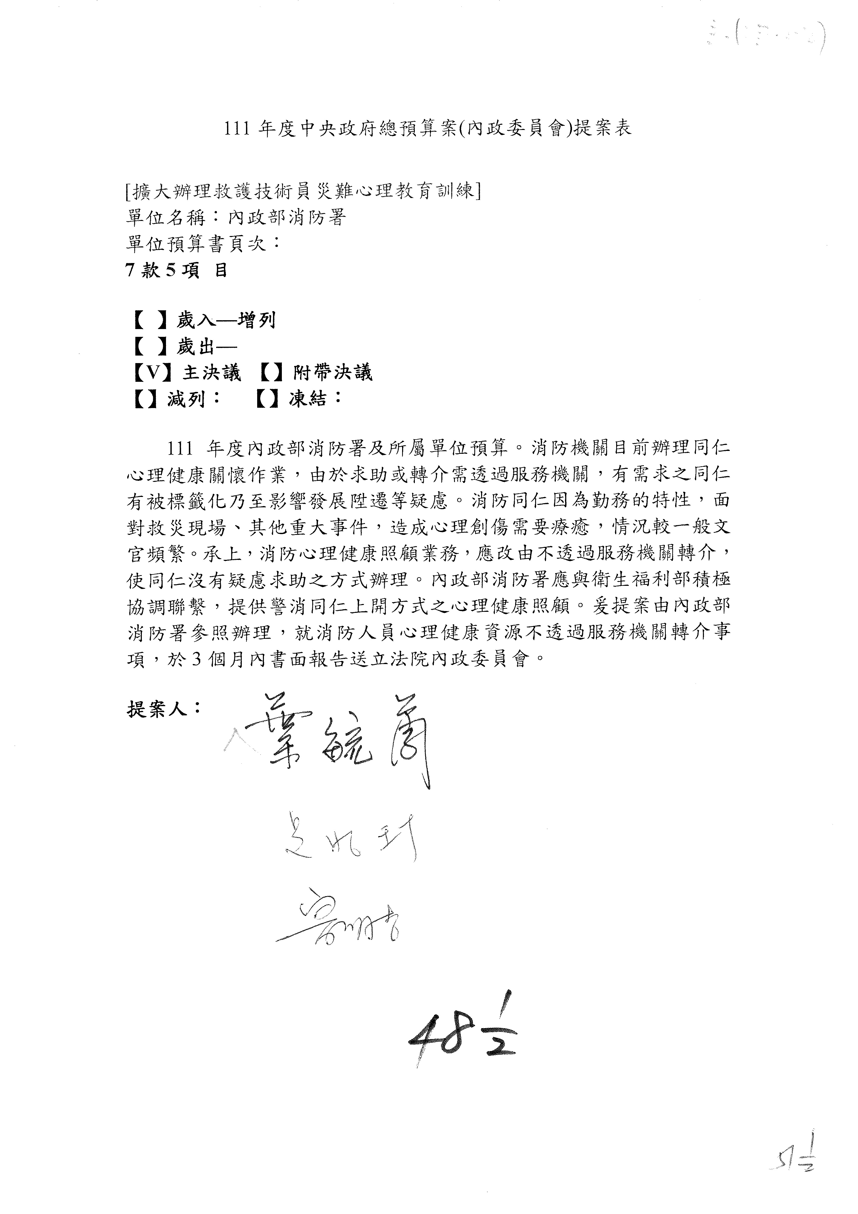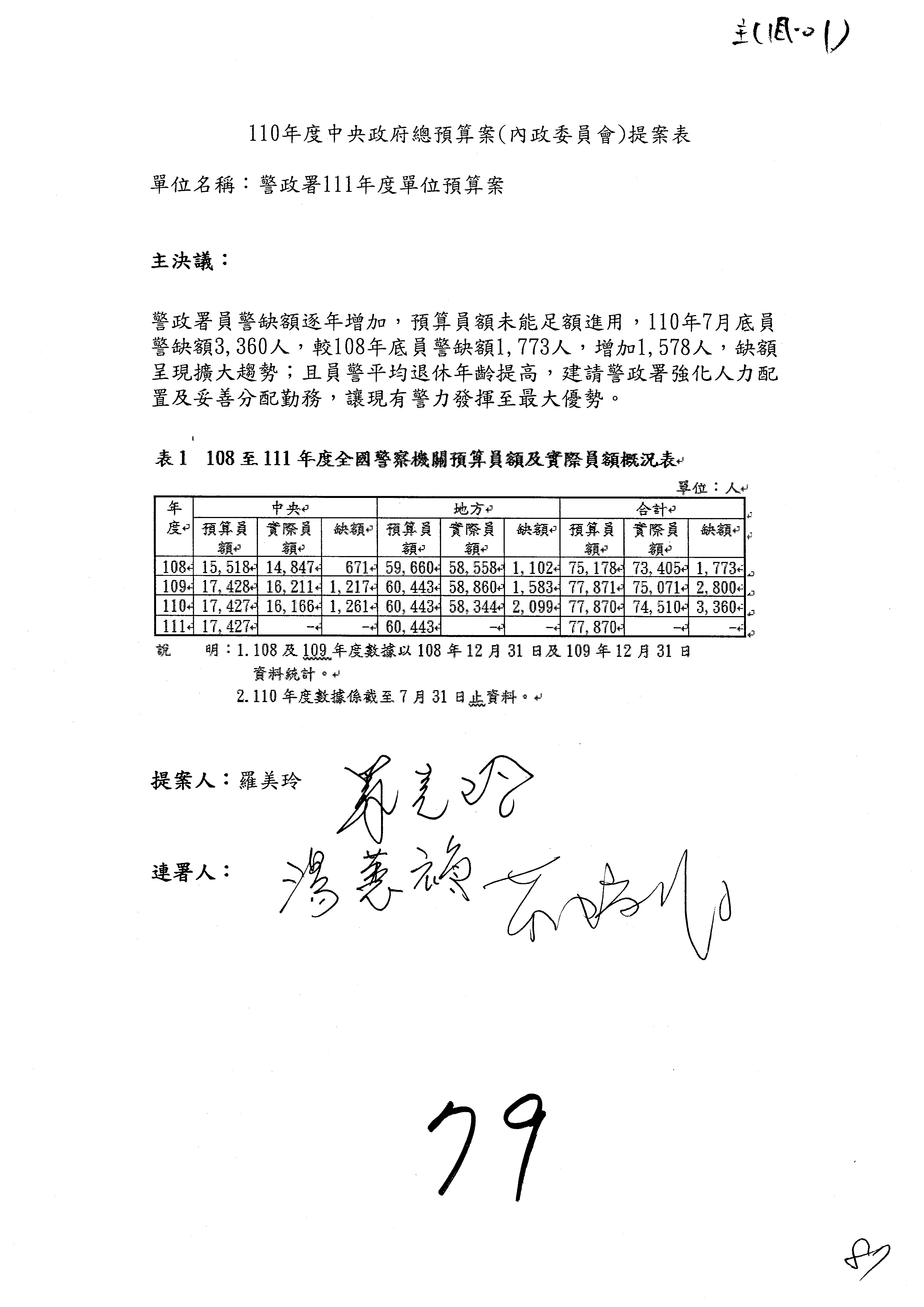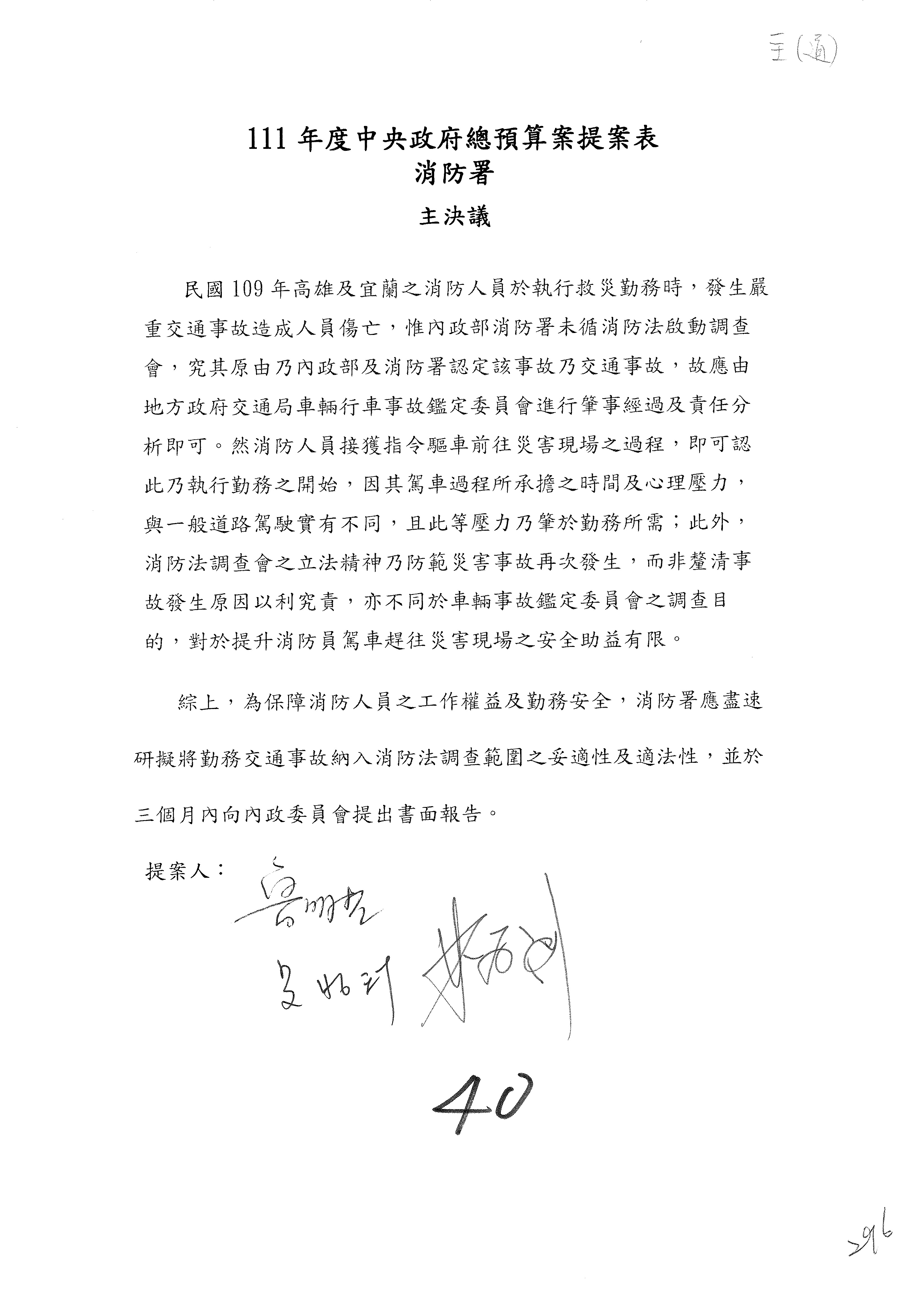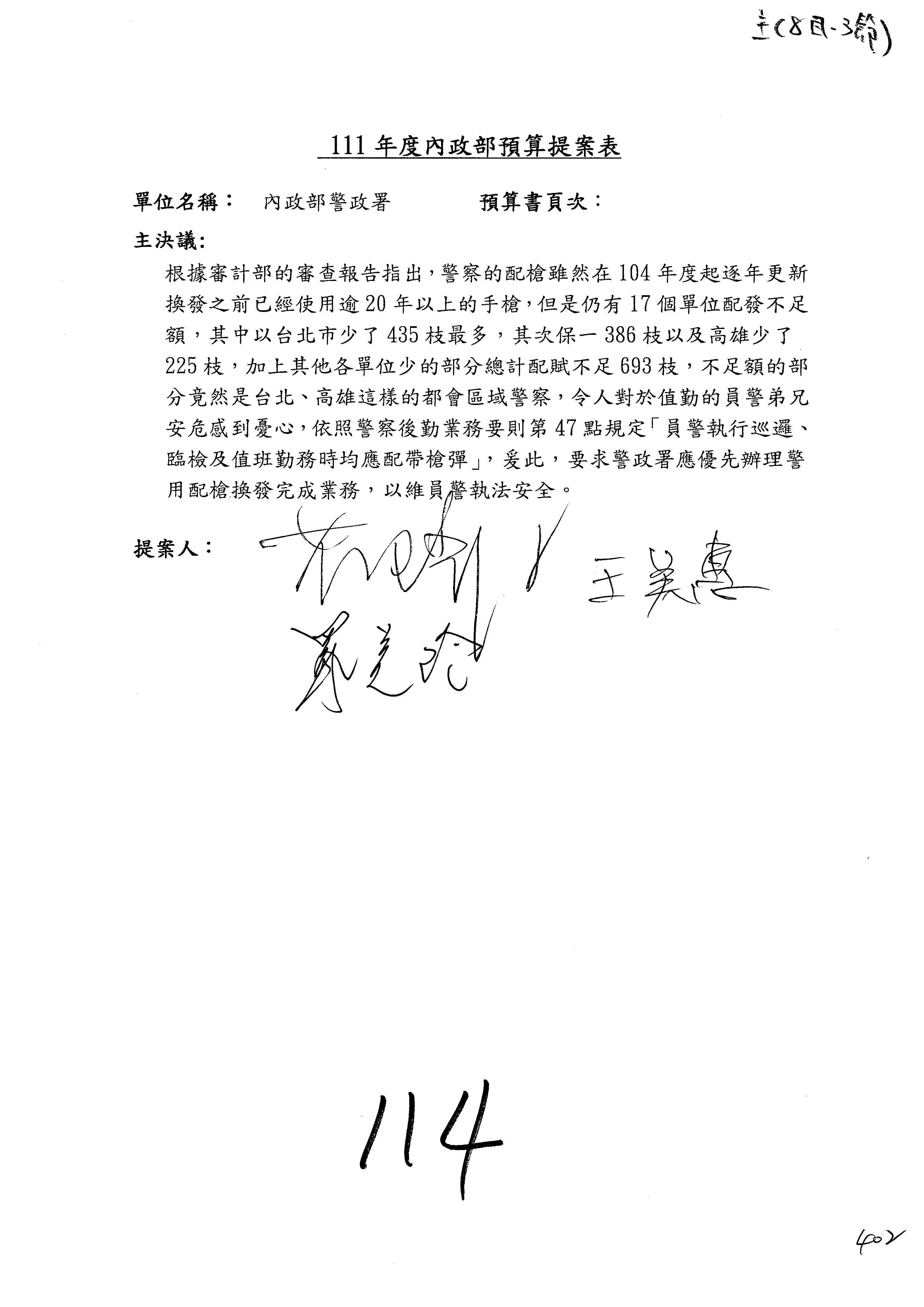 主席:現在進行預算處理,今天預算審查的順序依序為:警政署及所屬、中央警察大學、消防署及所屬、移民署、役政署及空中勤務總隊等單位預算,以上每個單位的預算數已宣讀完畢。