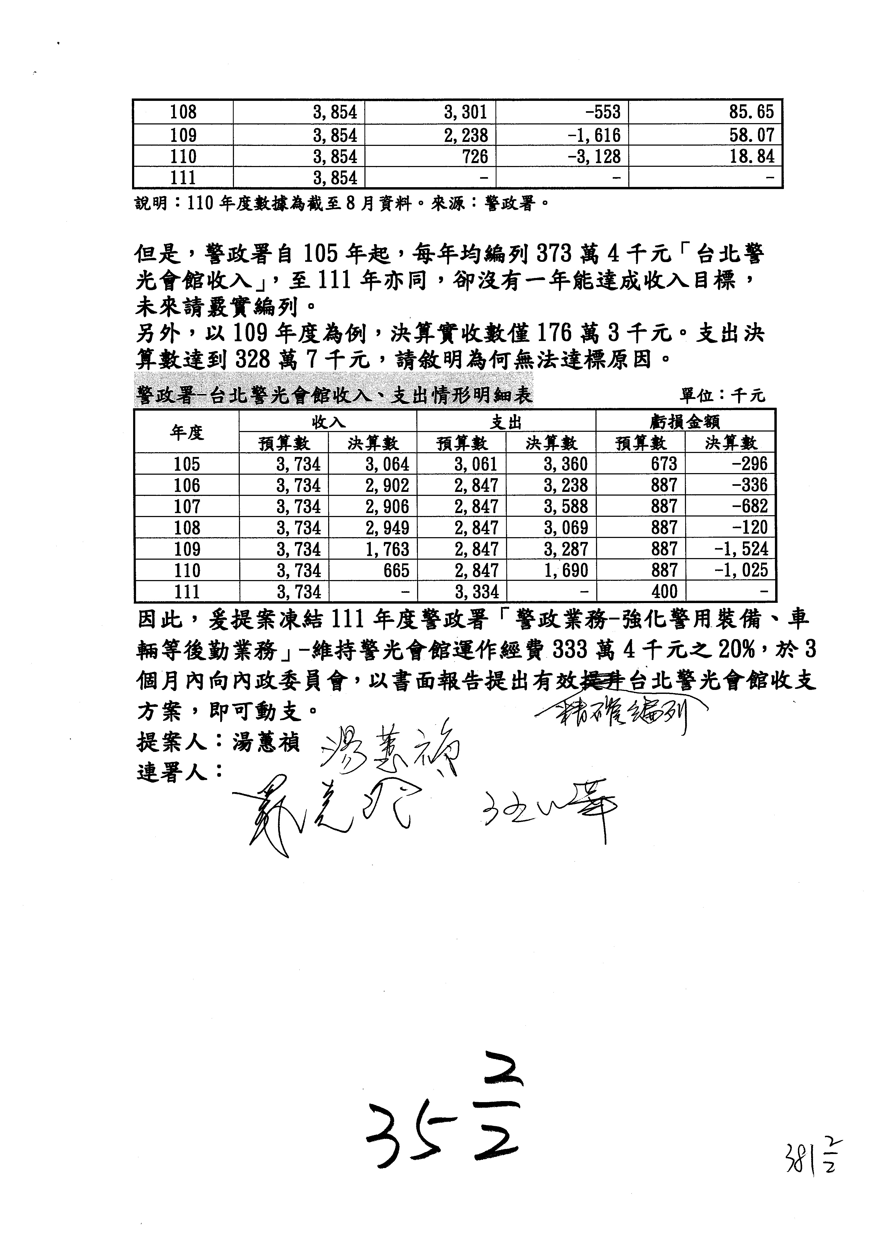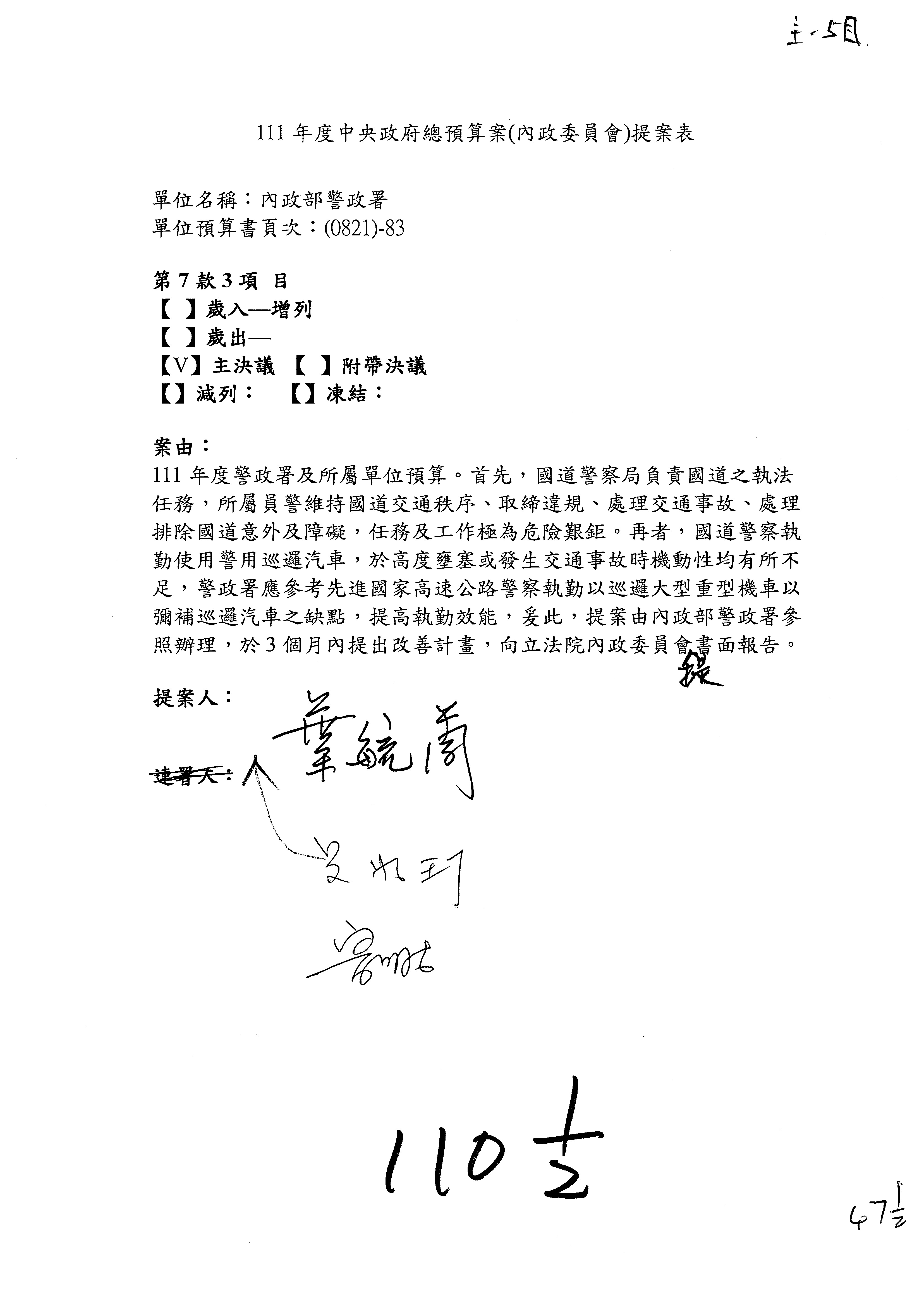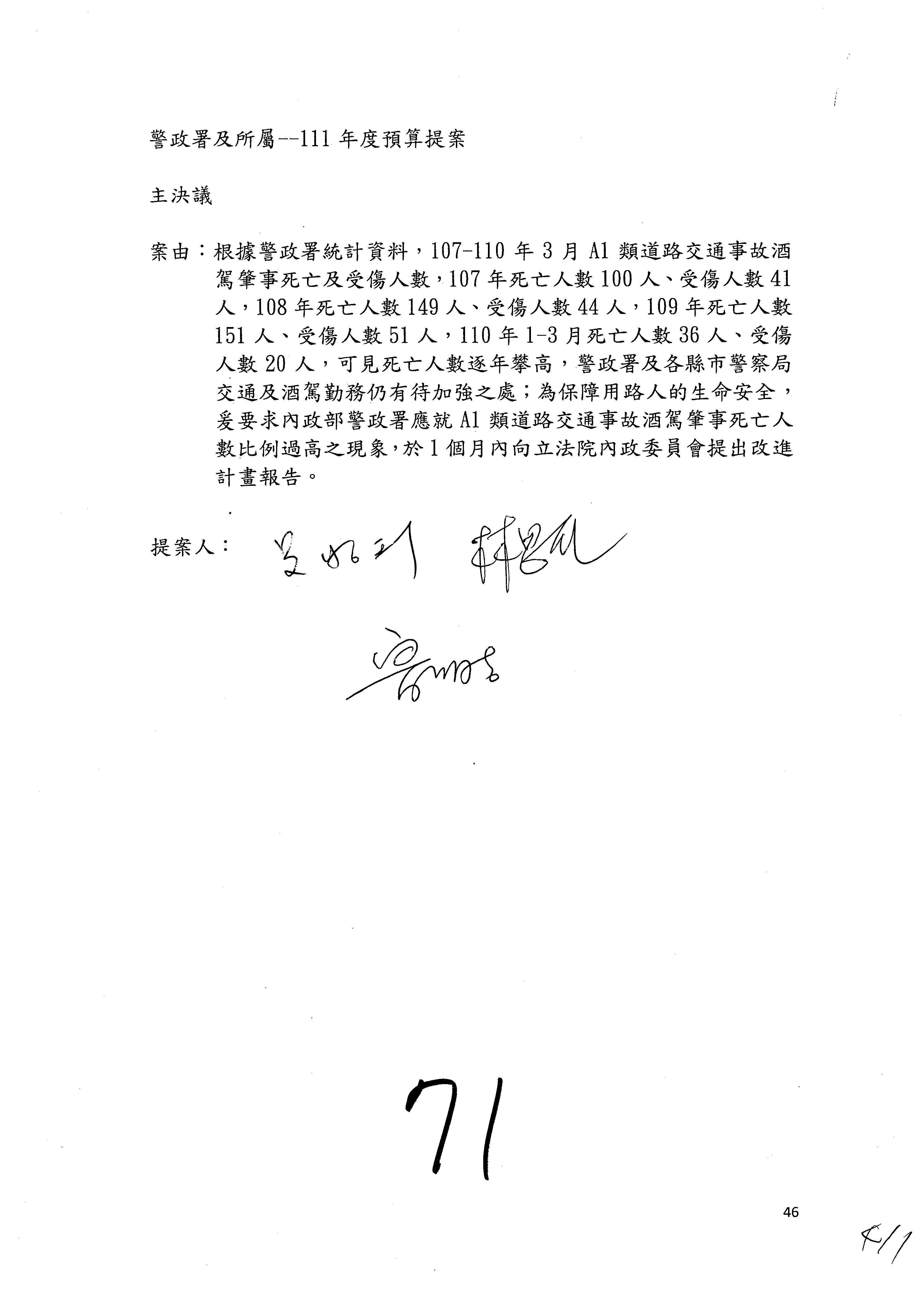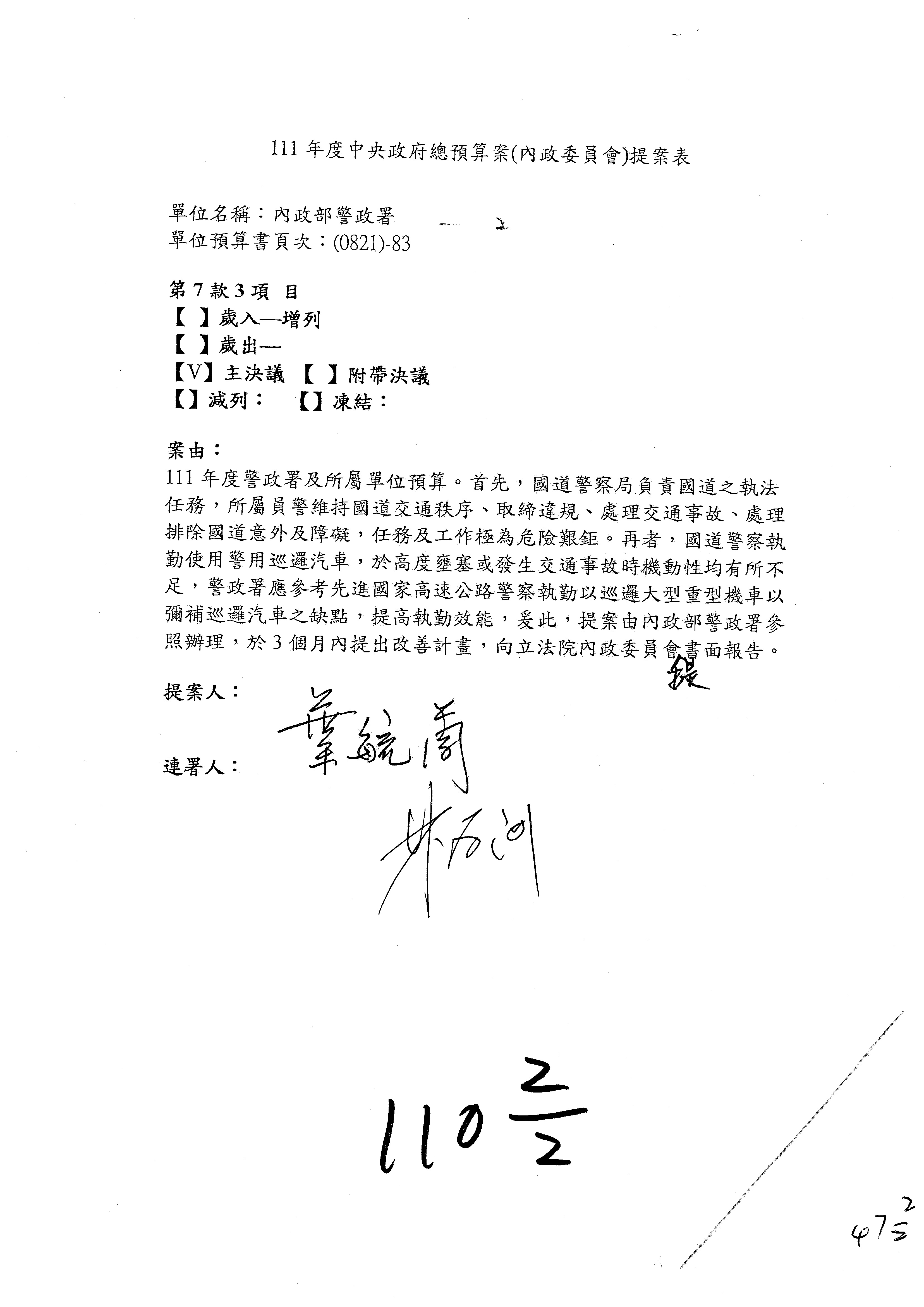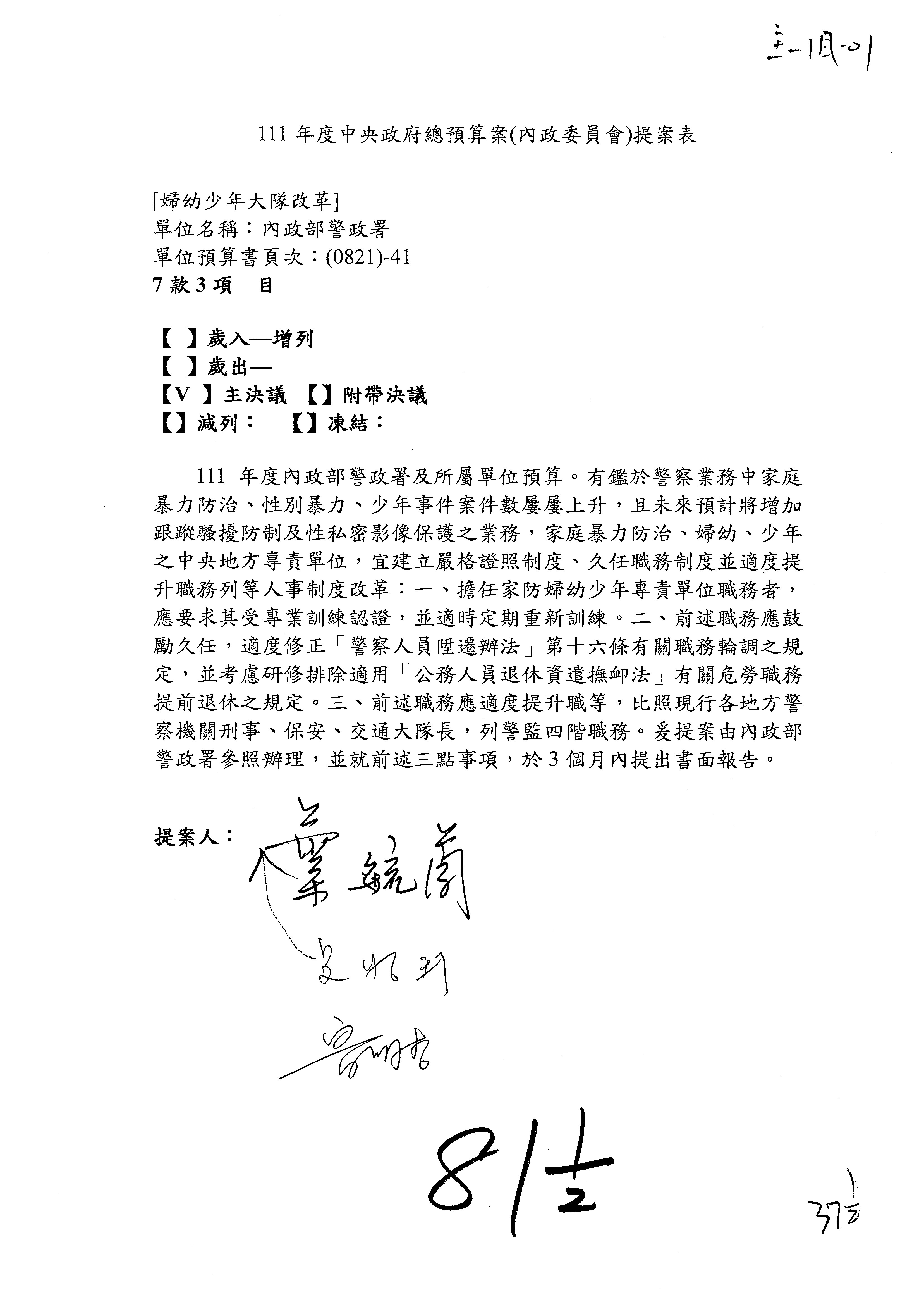 主席:現在進行預算處理,今天預算審查的順序依序為:警政署及所屬、中央警察大學、消防署及所屬、移民署、役政署及空中勤務總隊等單位預算,以上每個單位的預算數已宣讀完畢。