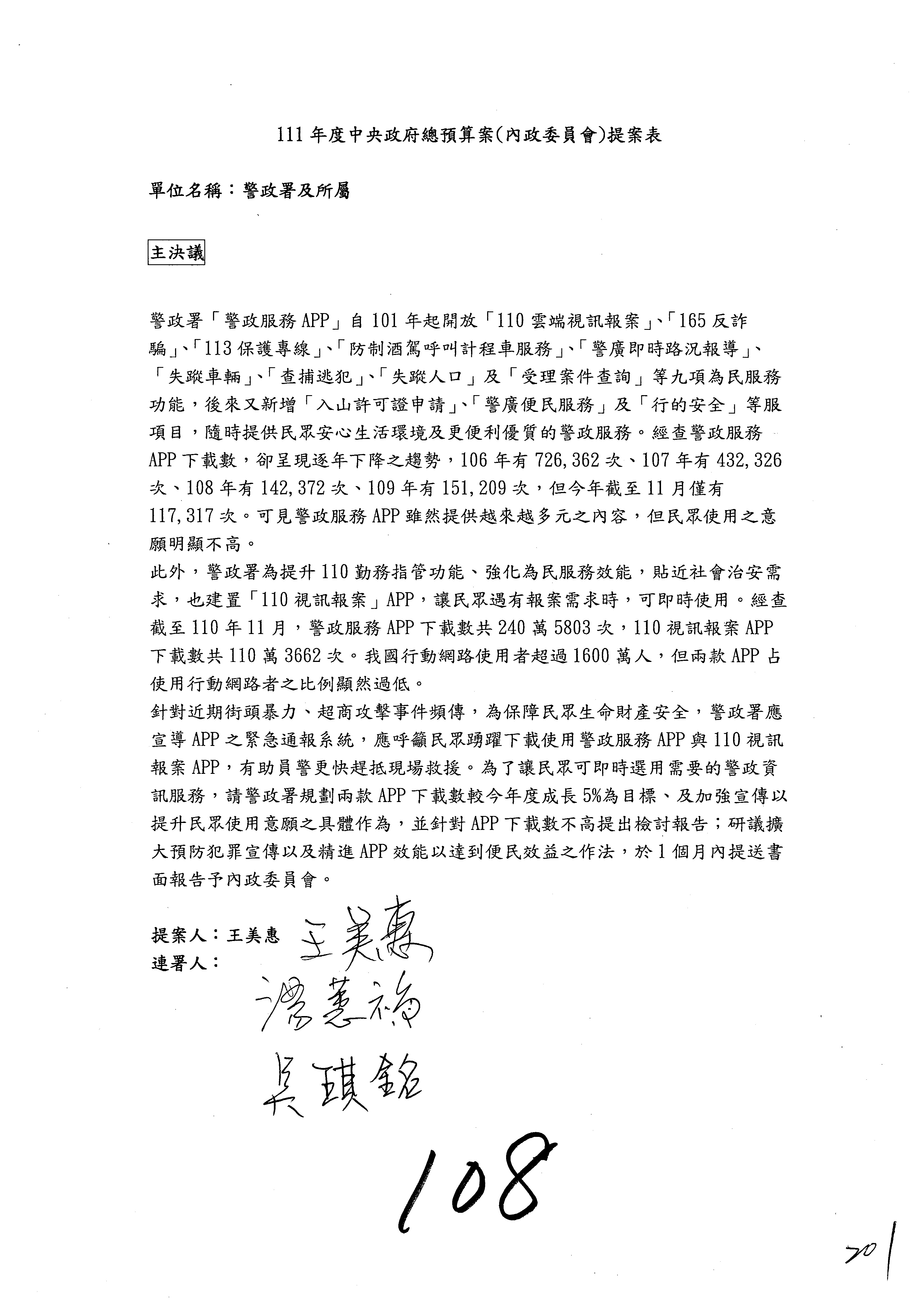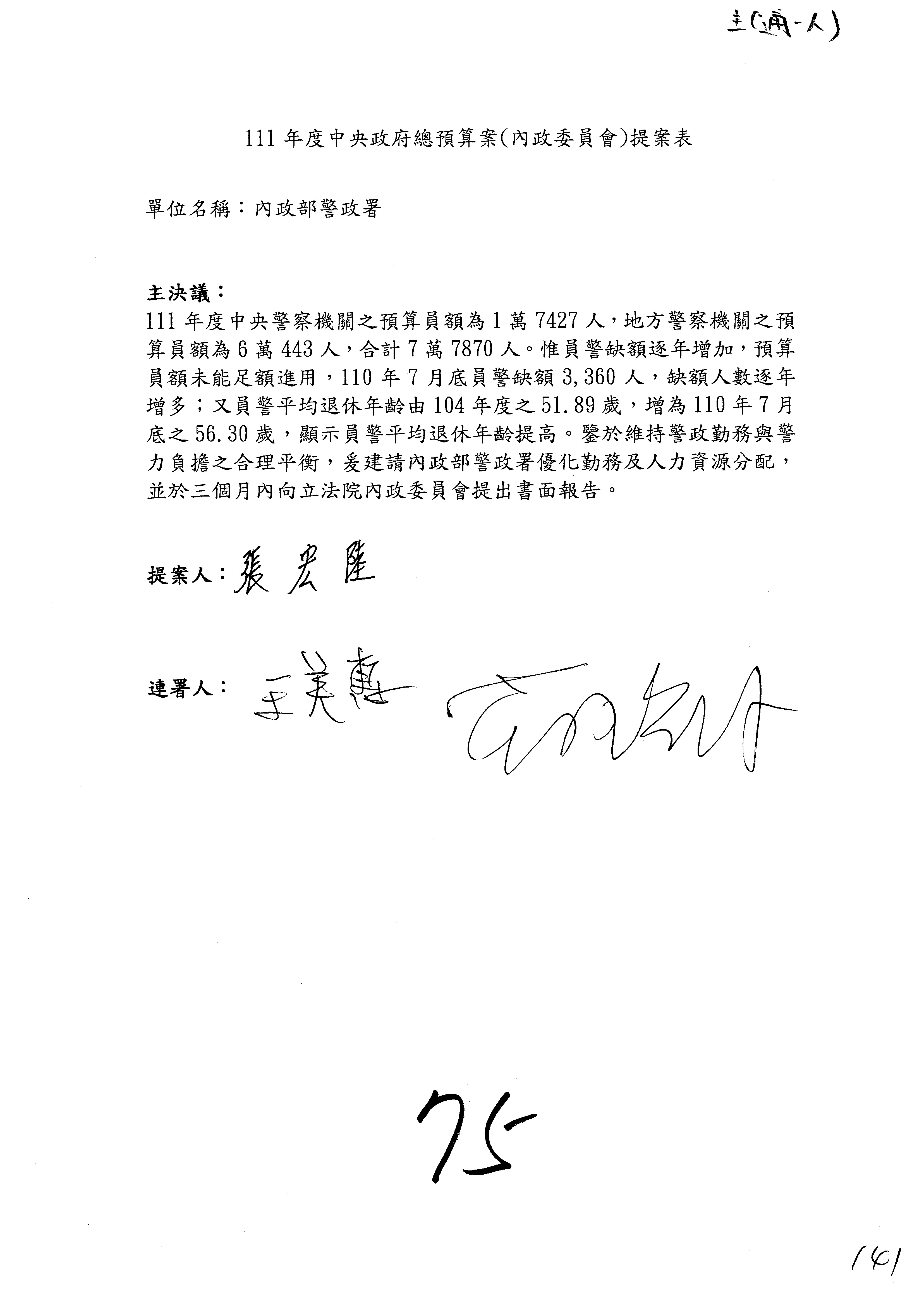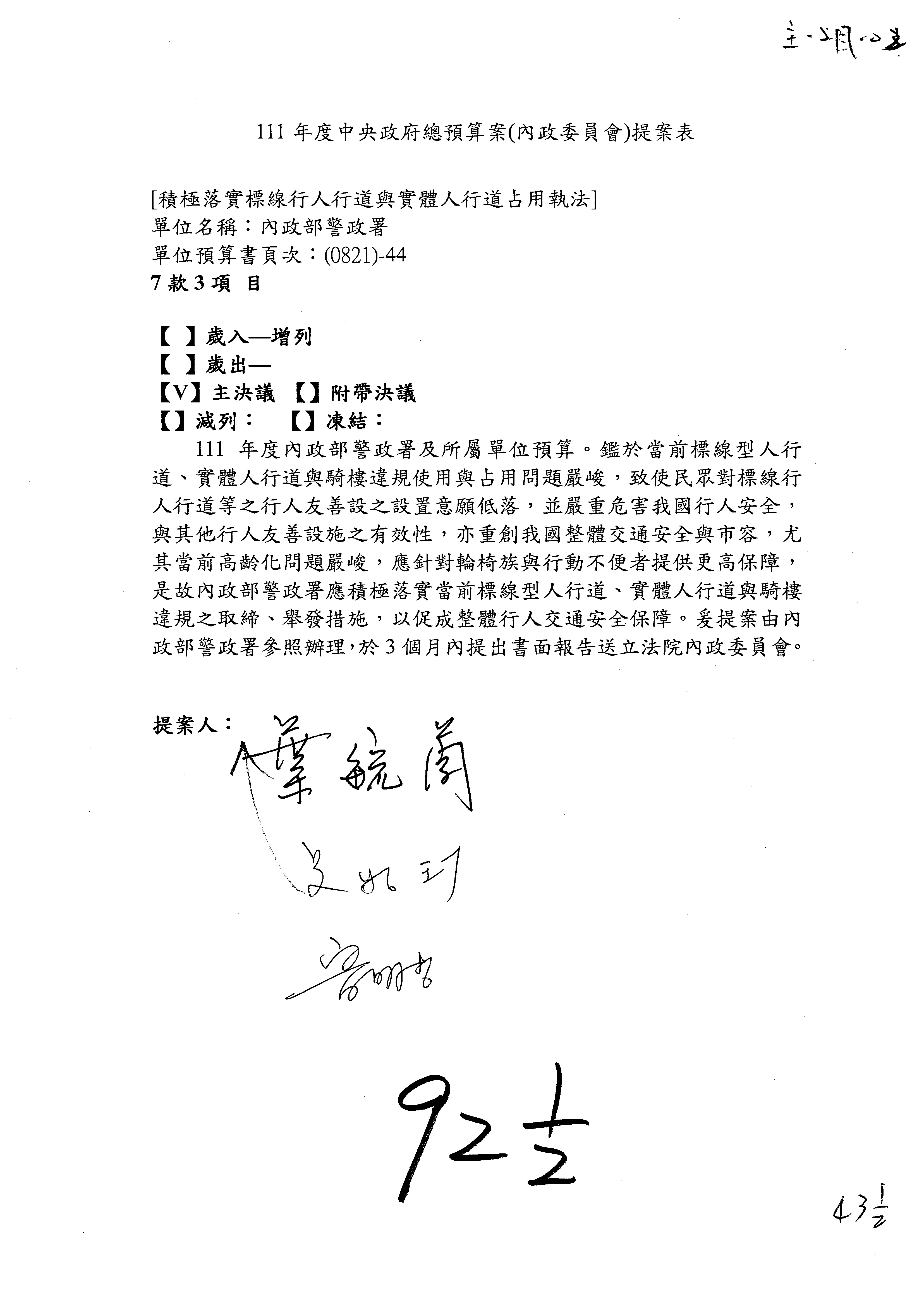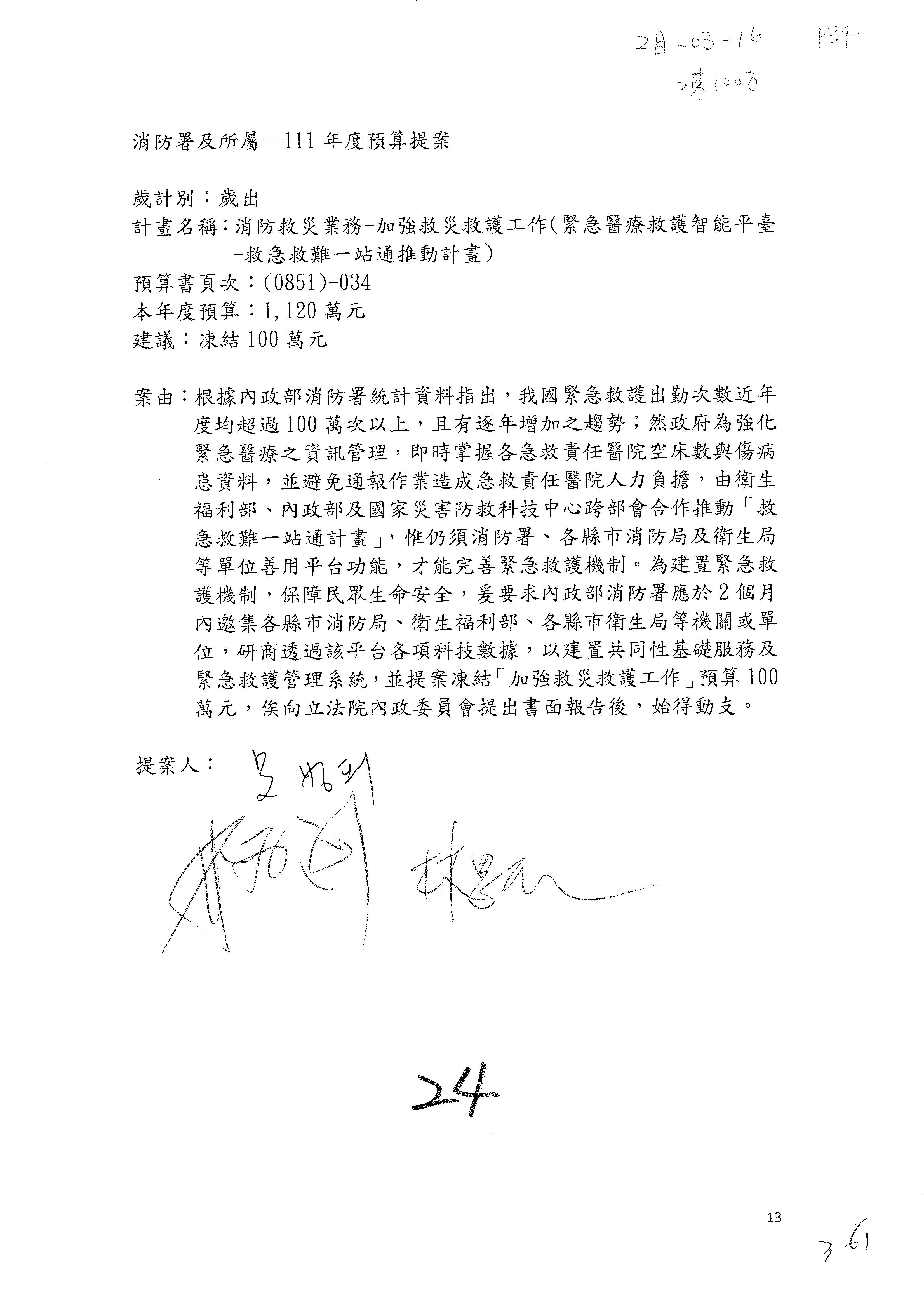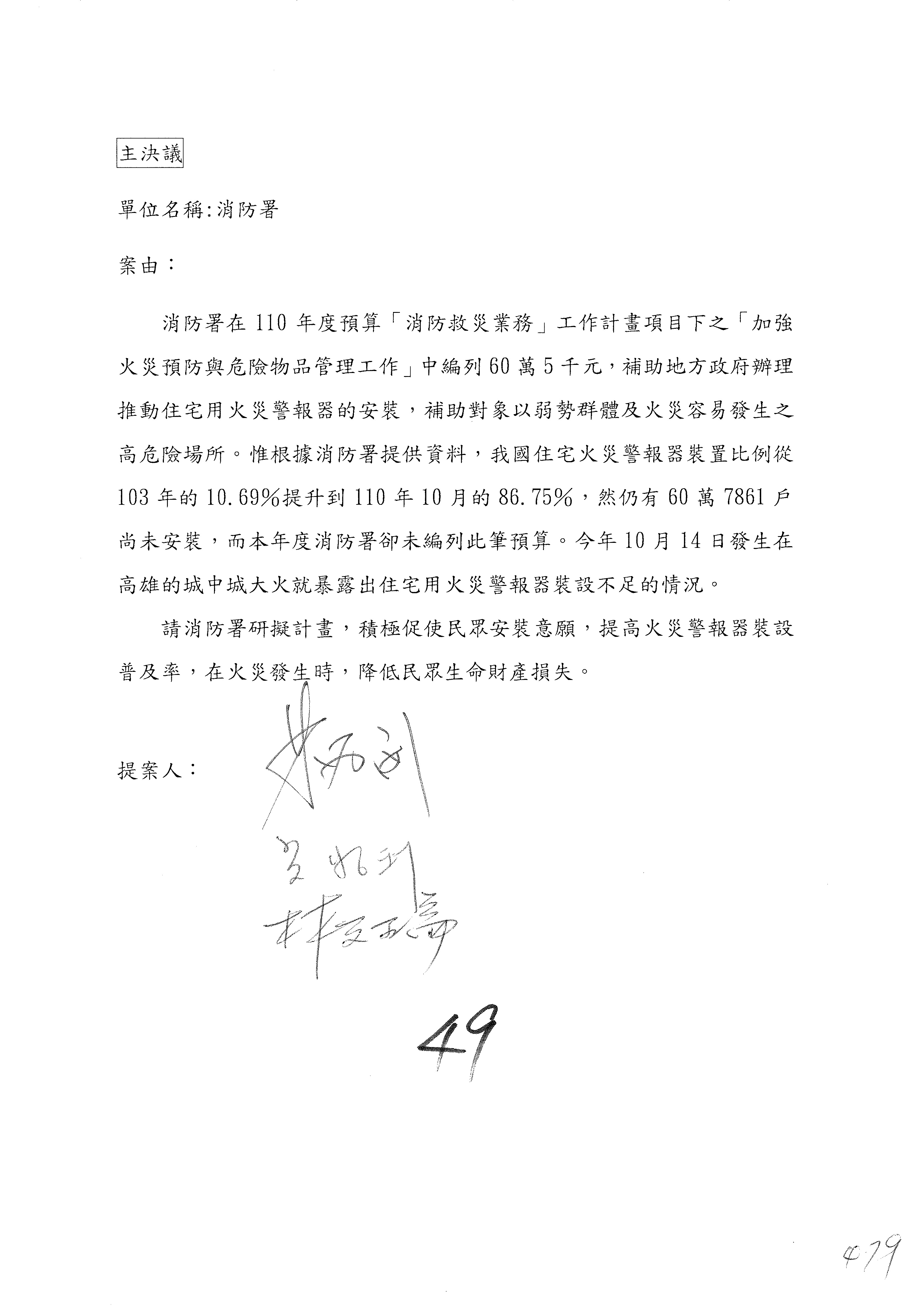 主席:現在進行預算處理,今天預算審查的順序依序為:警政署及所屬、中央警察大學、消防署及所屬、移民署、役政署及空中勤務總隊等單位預算,以上每個單位的預算數已宣讀完畢。