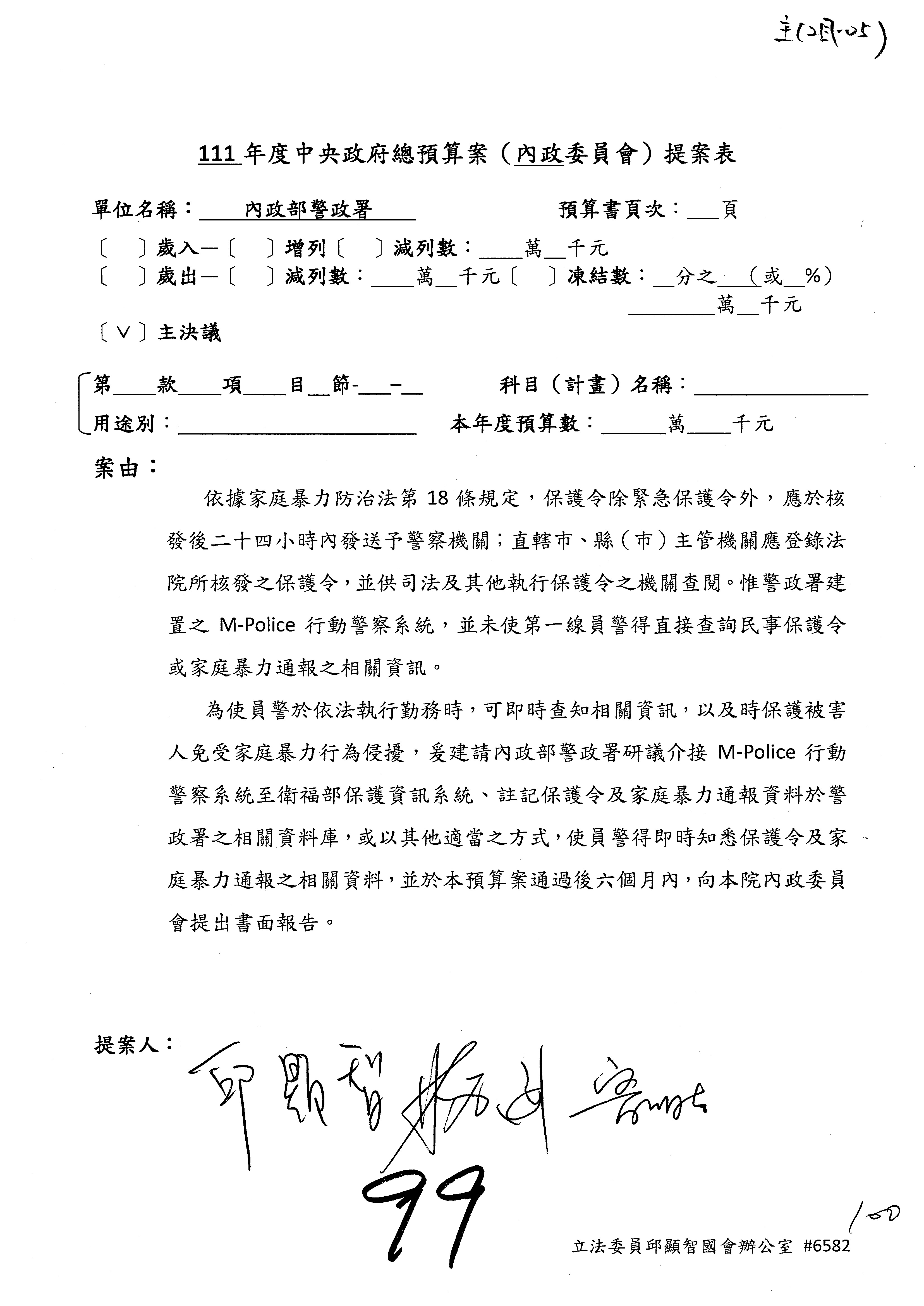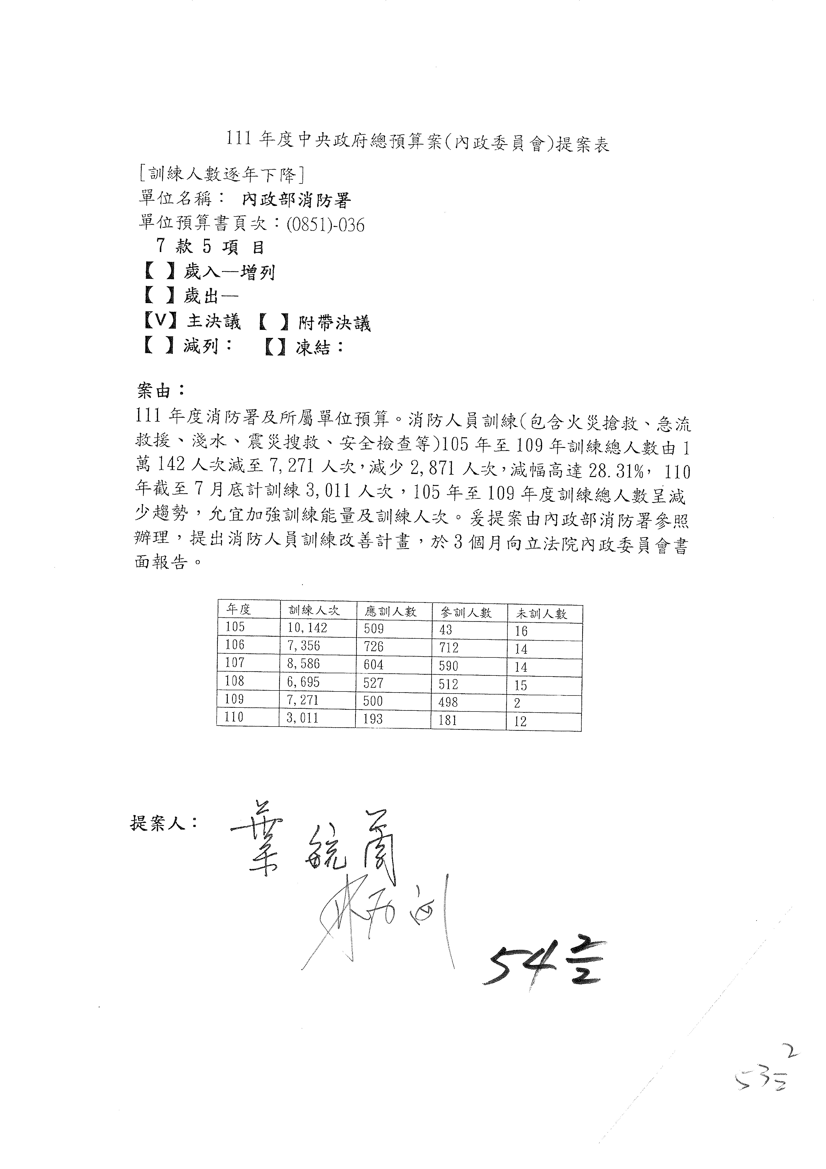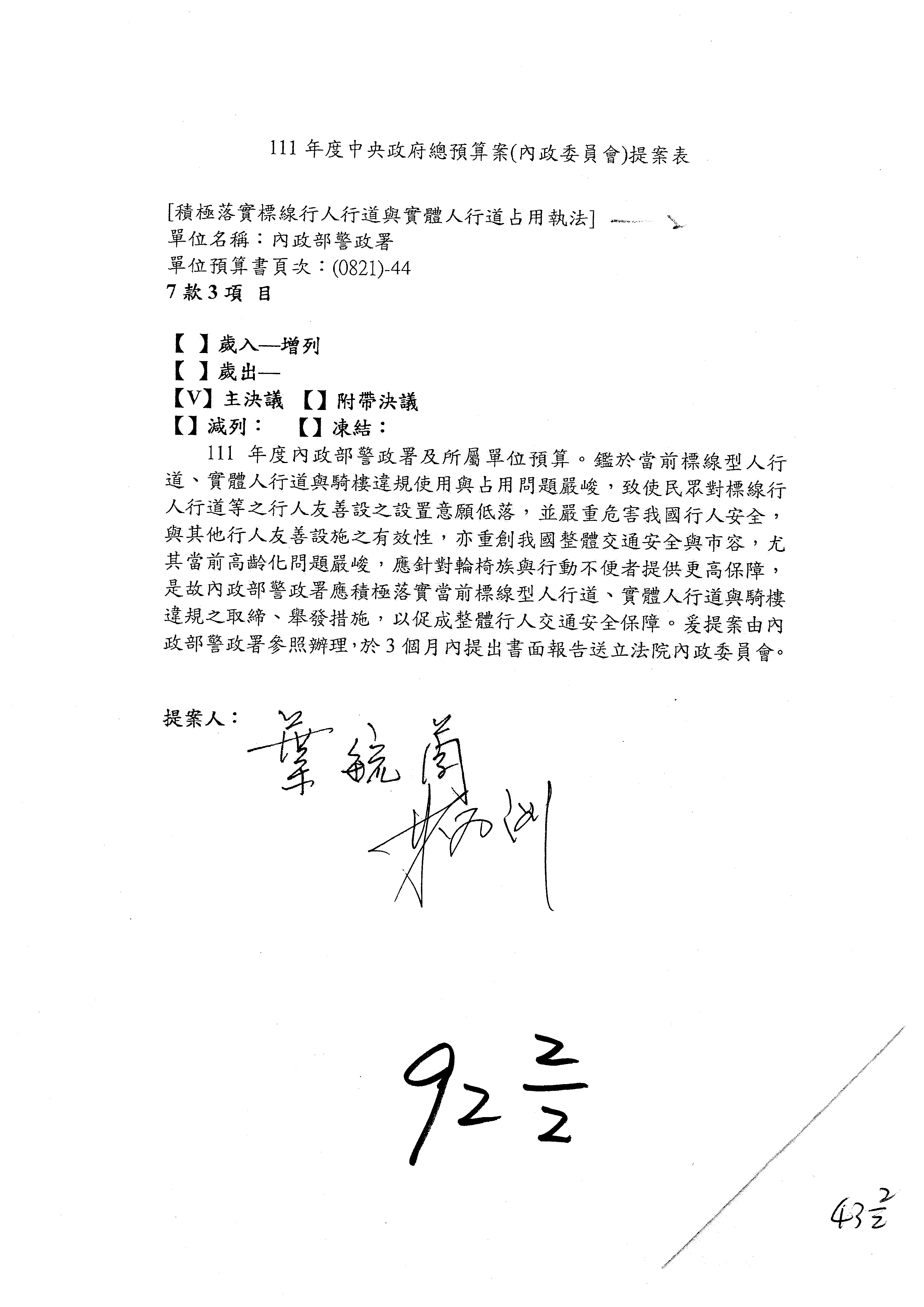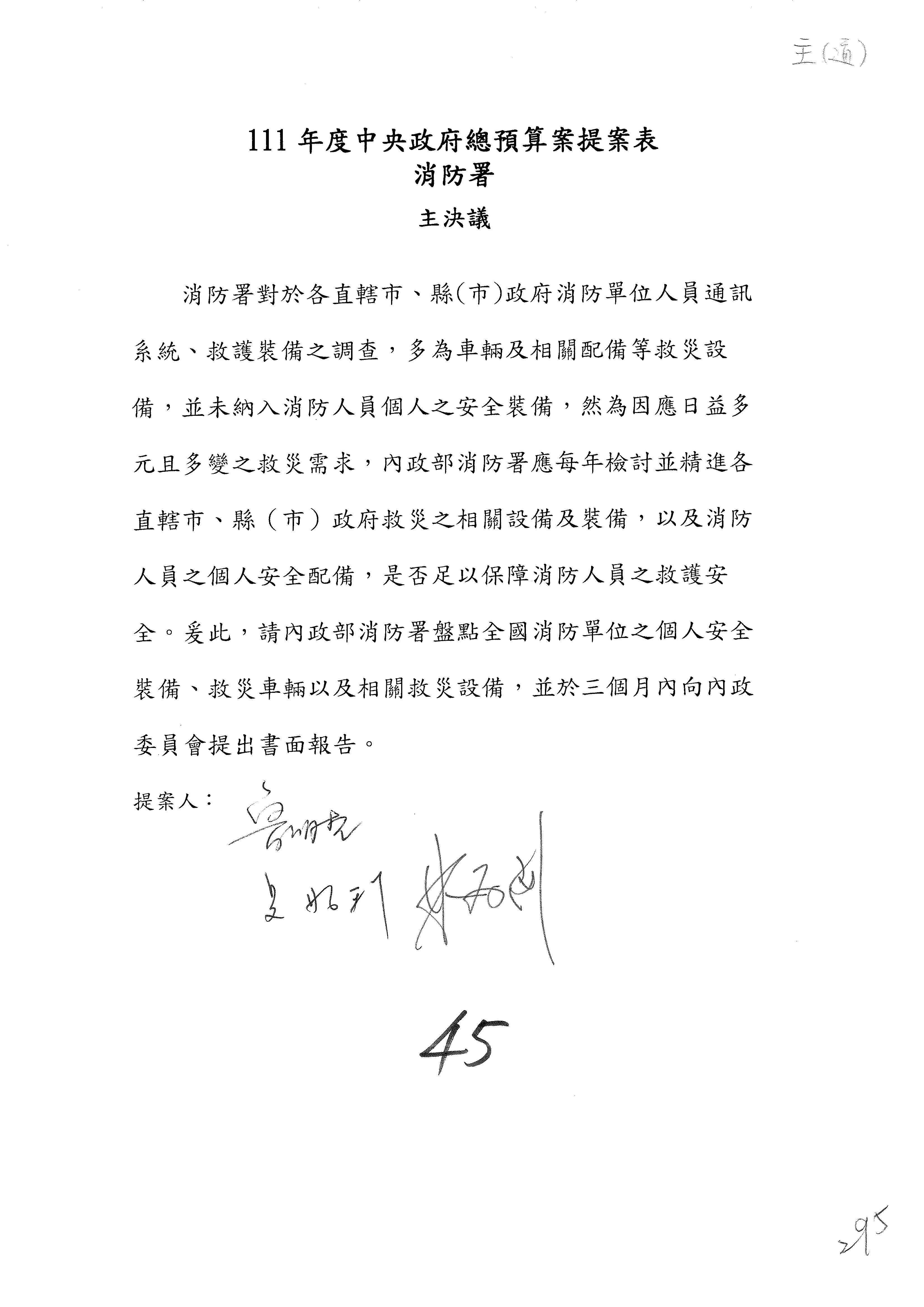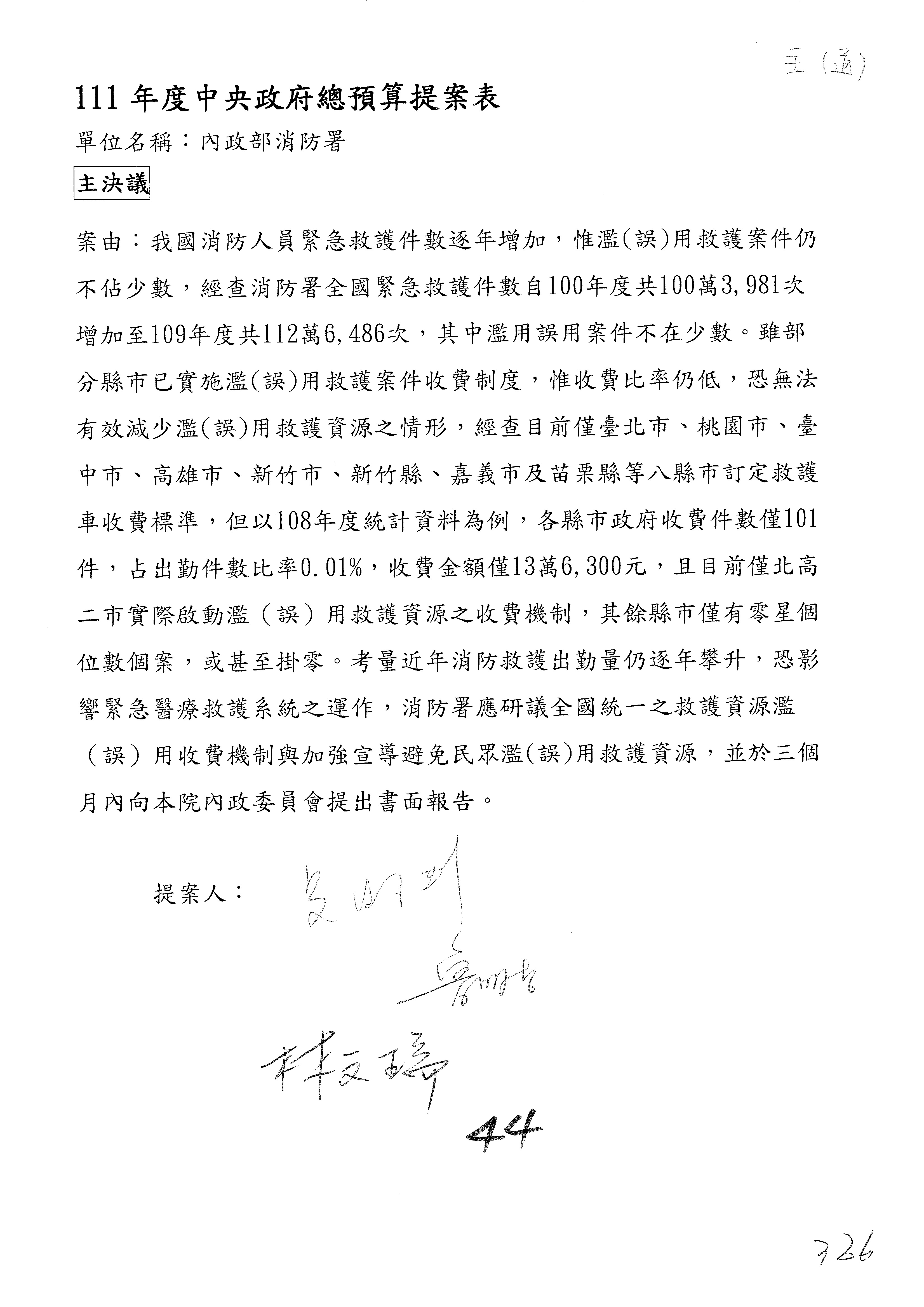 主席:現在進行預算處理,今天預算審查的順序依序為:警政署及所屬、中央警察大學、消防署及所屬、移民署、役政署及空中勤務總隊等單位預算,以上每個單位的預算數已宣讀完畢。