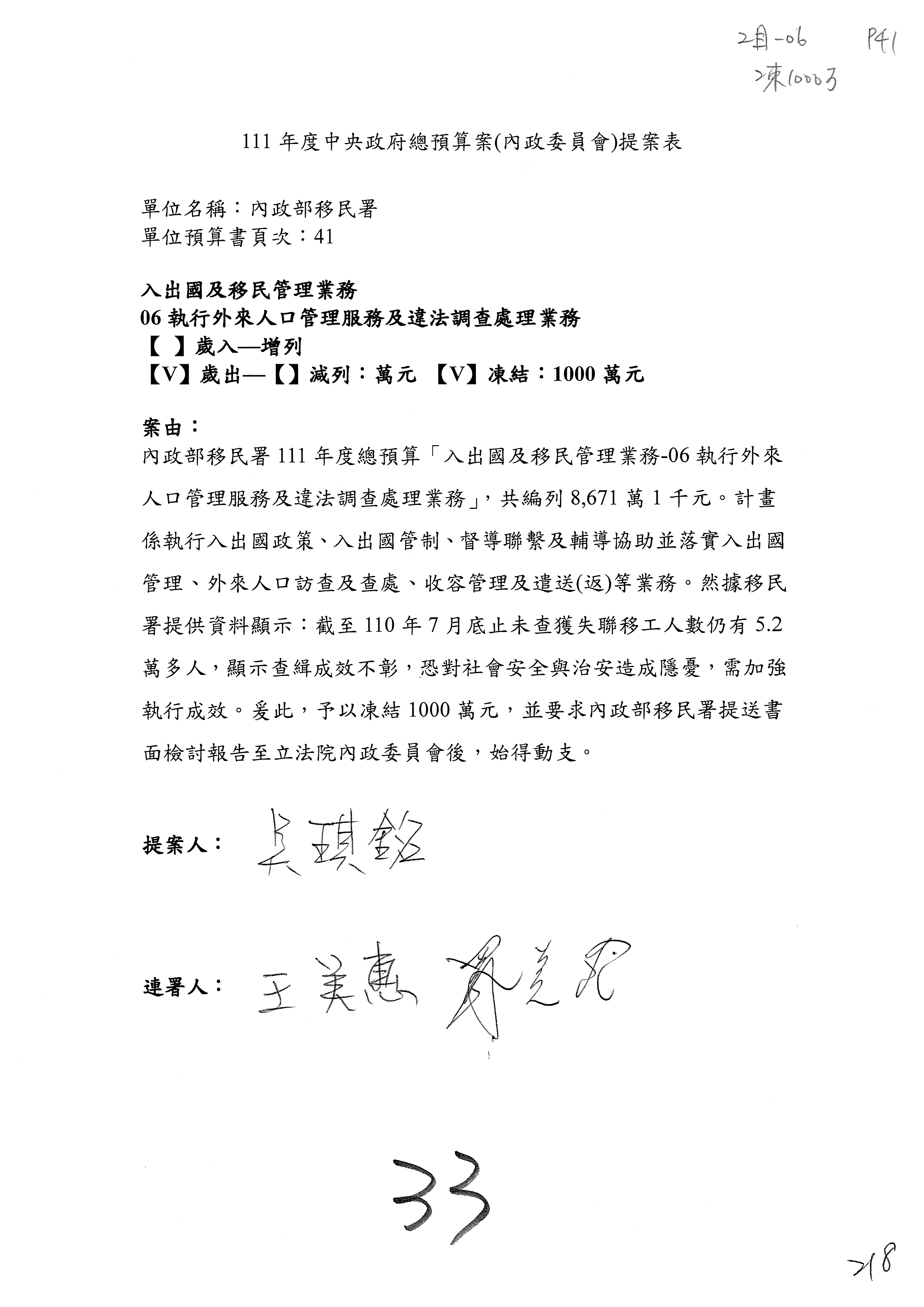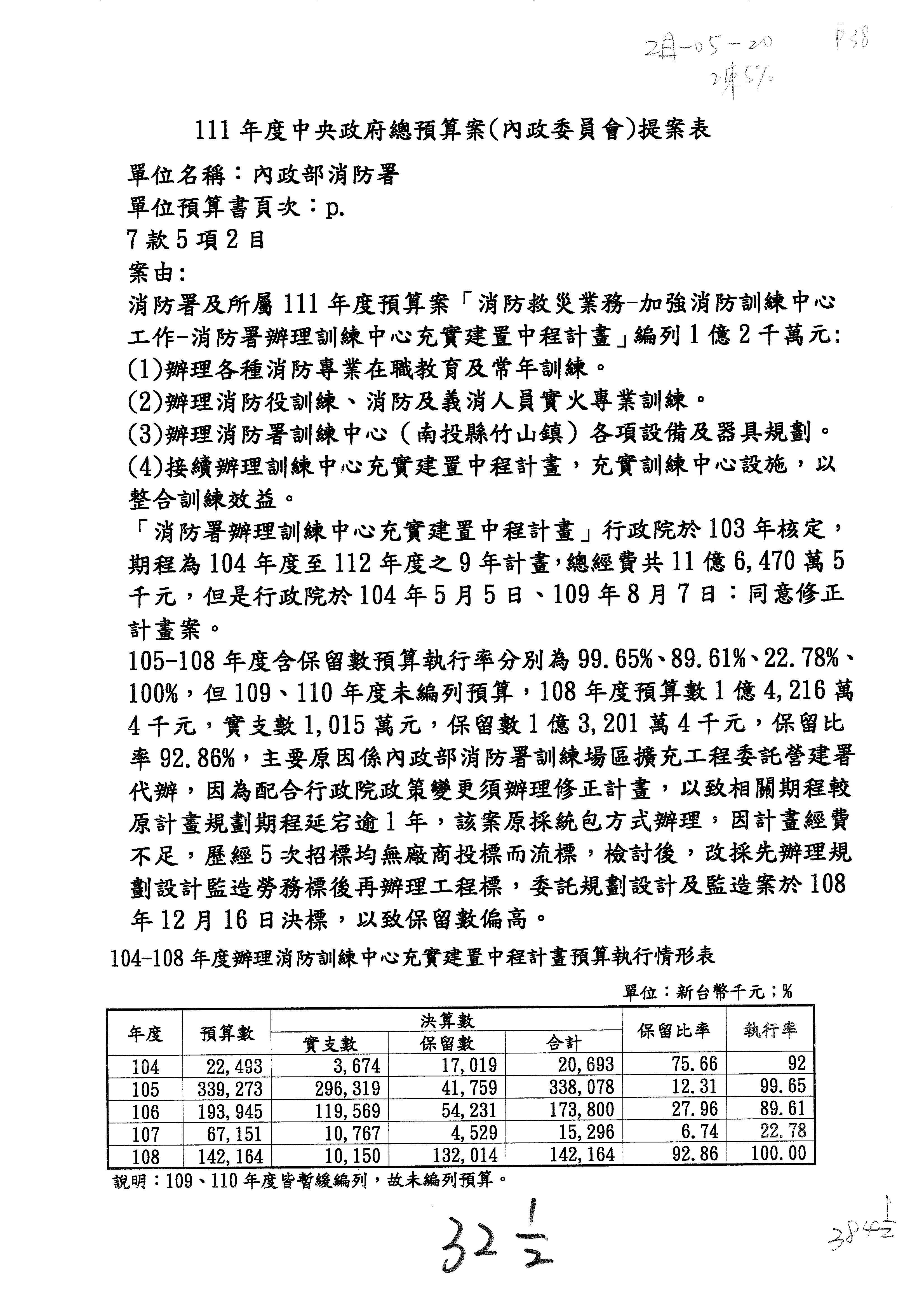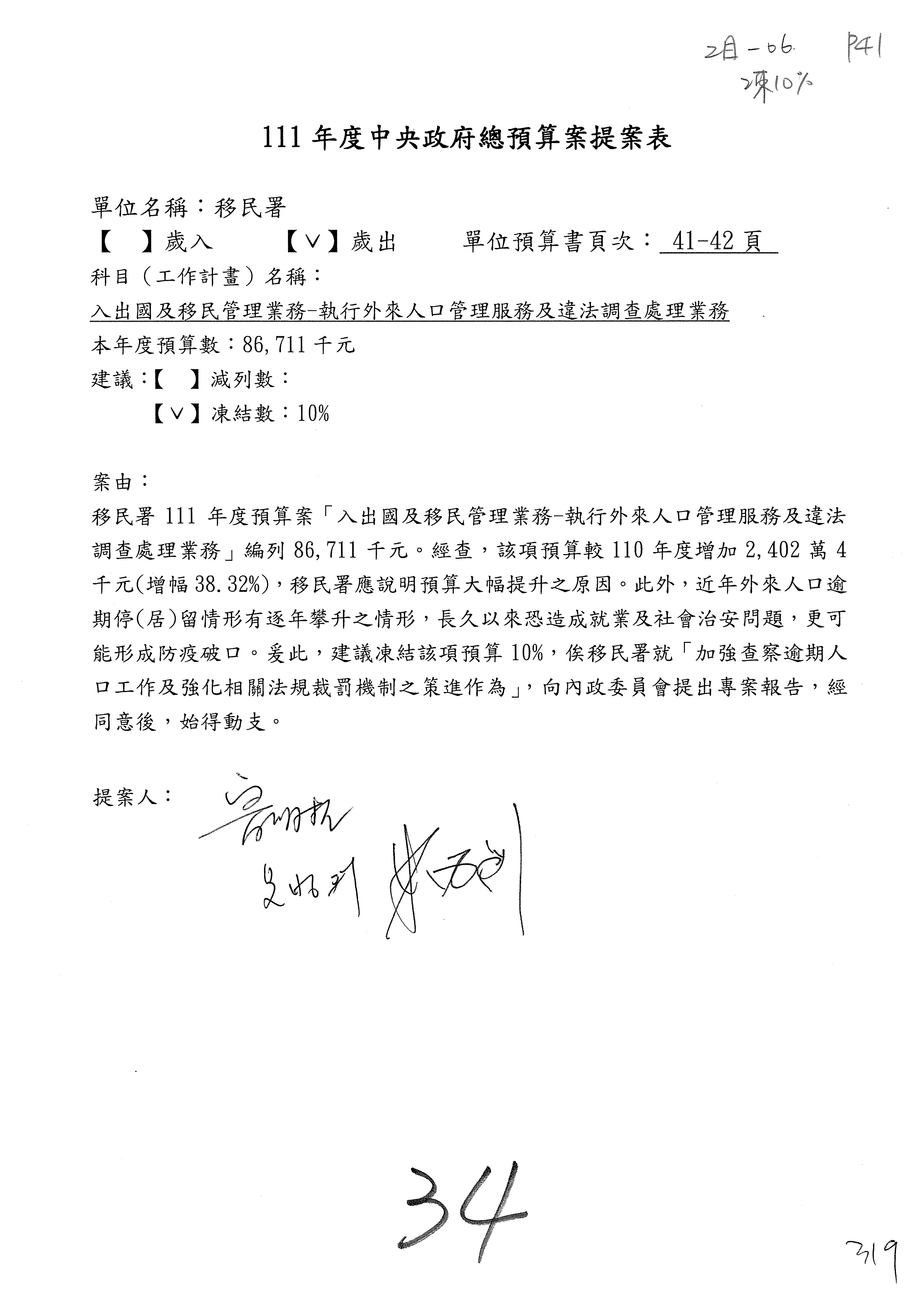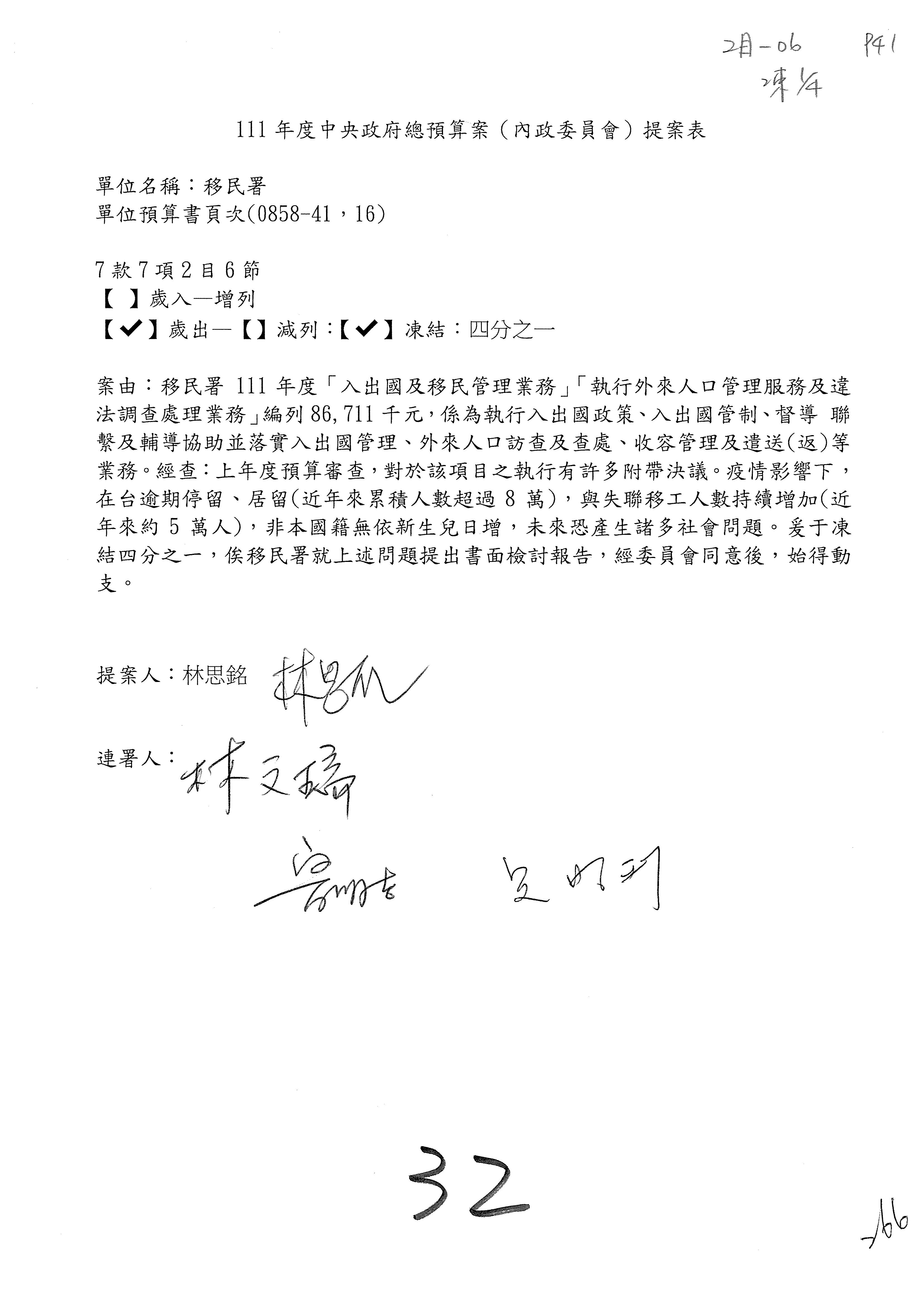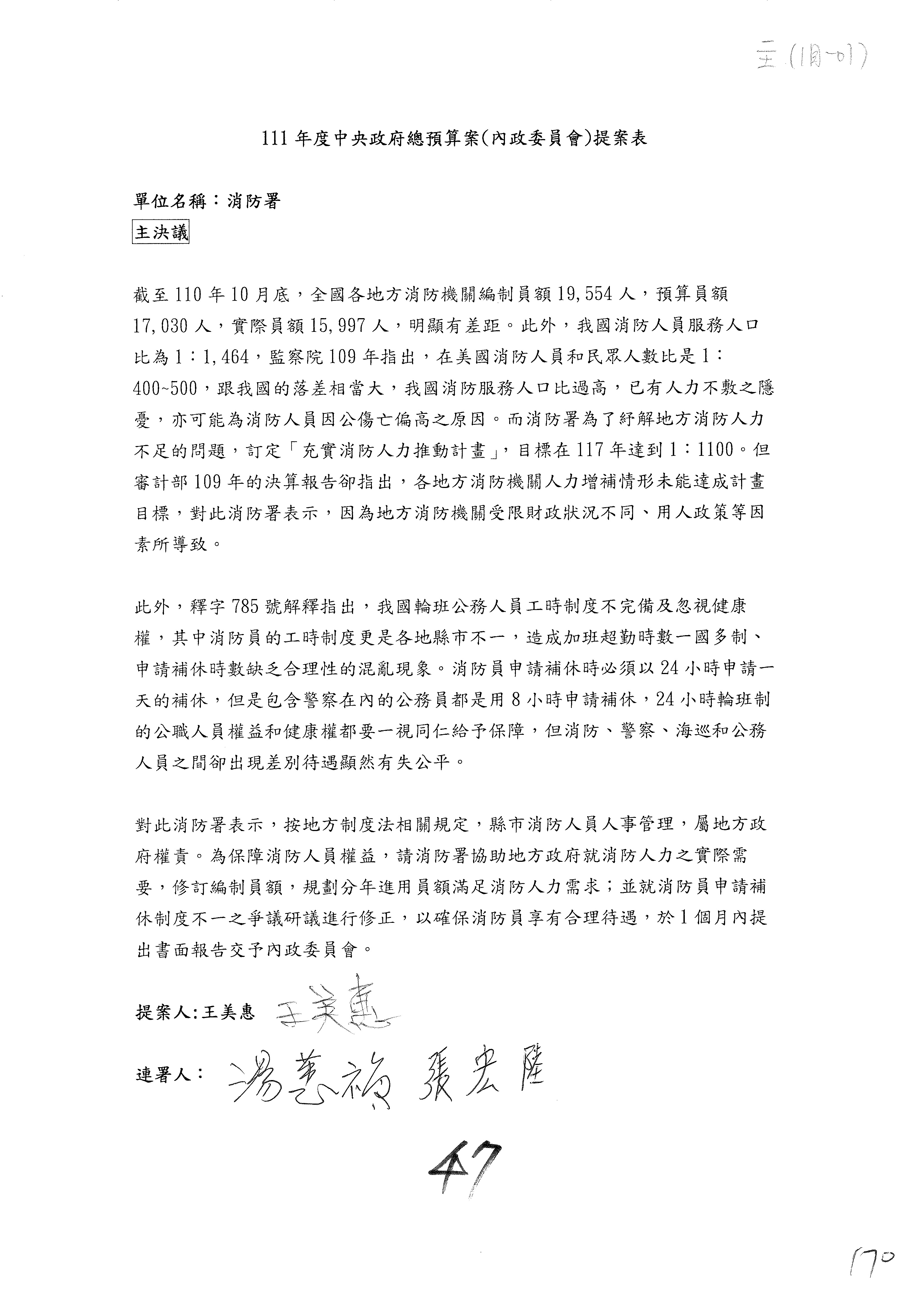 主席:現在進行預算處理,今天預算審查的順序依序為:警政署及所屬、中央警察大學、消防署及所屬、移民署、役政署及空中勤務總隊等單位預算,以上每個單位的預算數已宣讀完畢。
