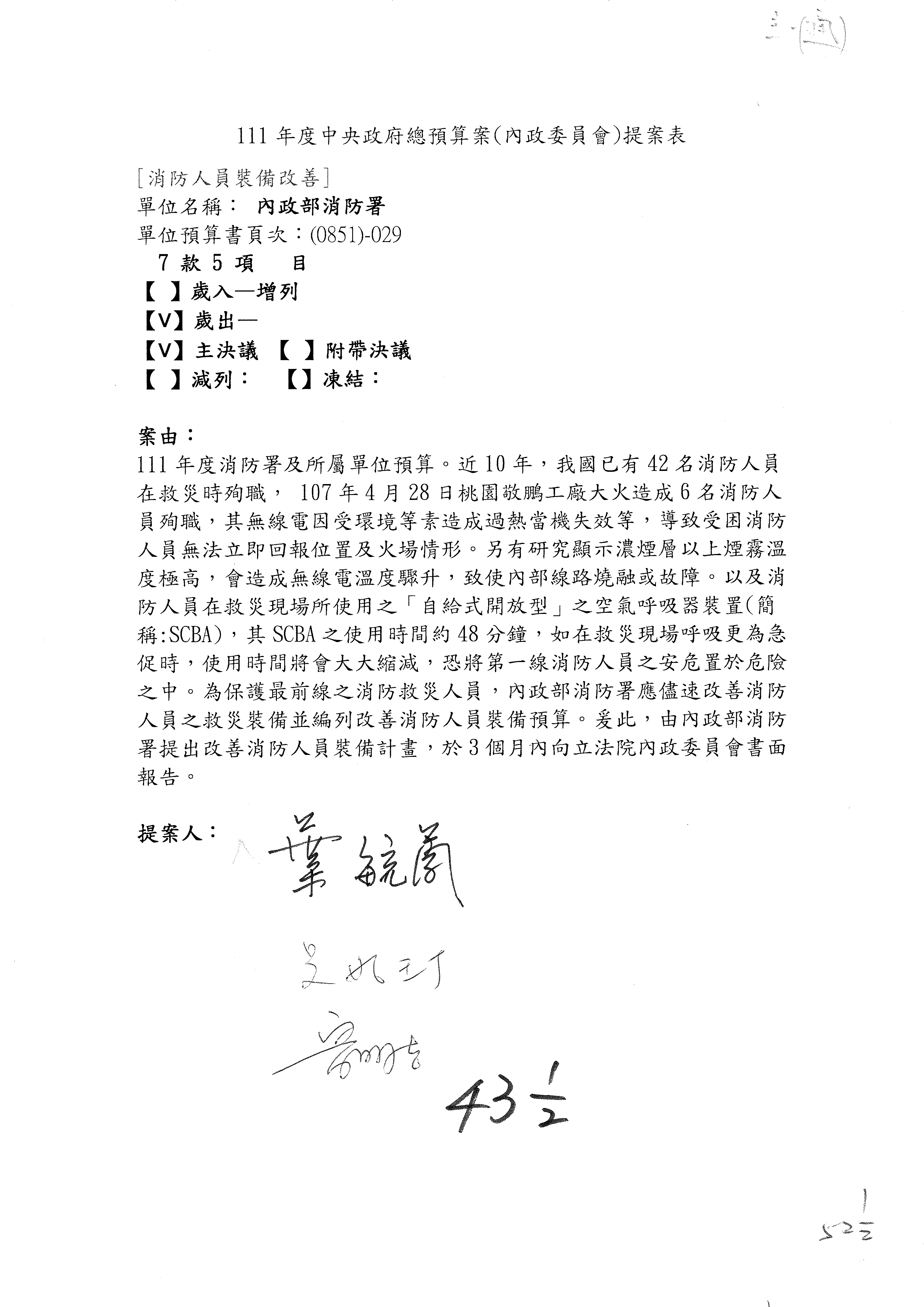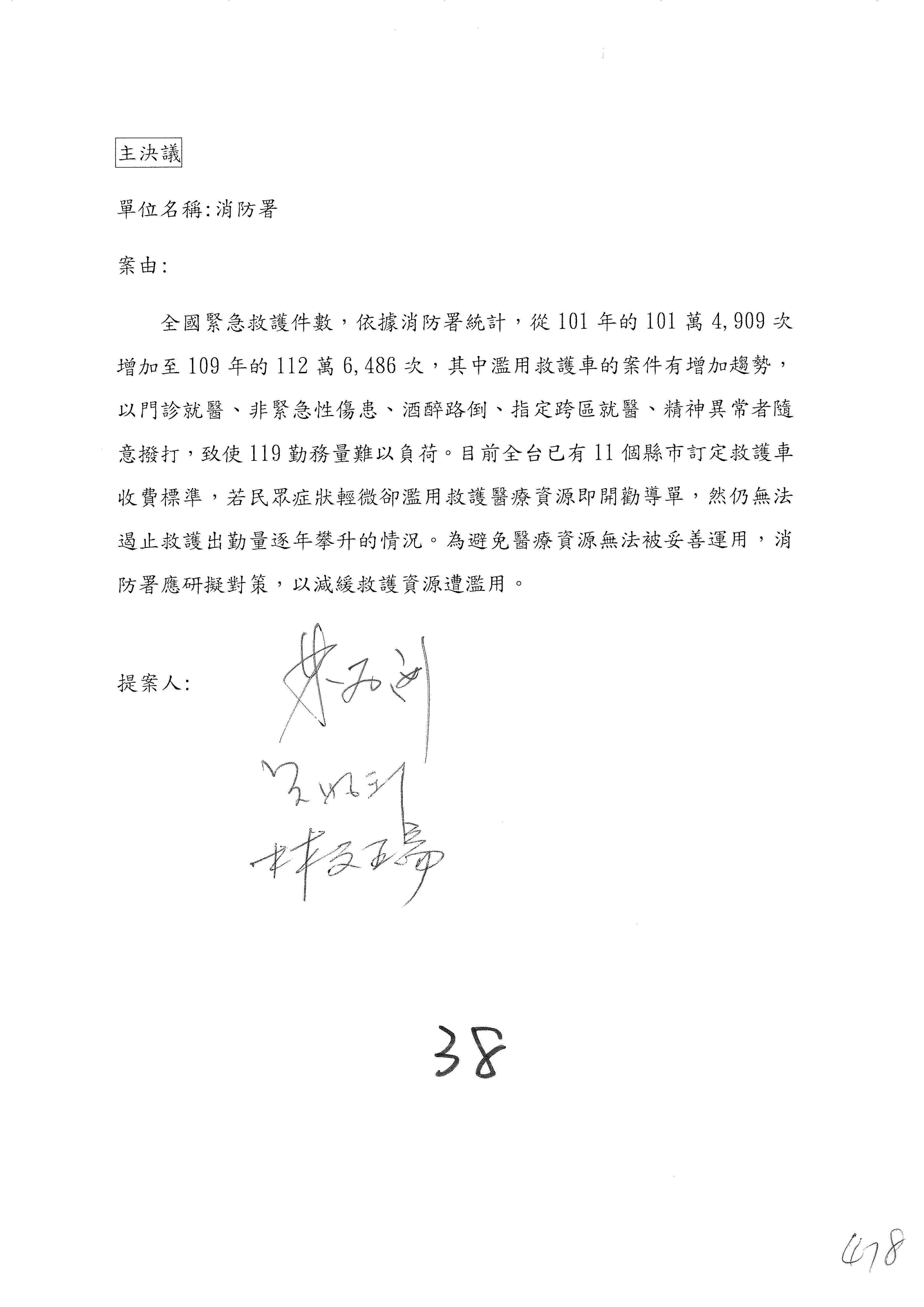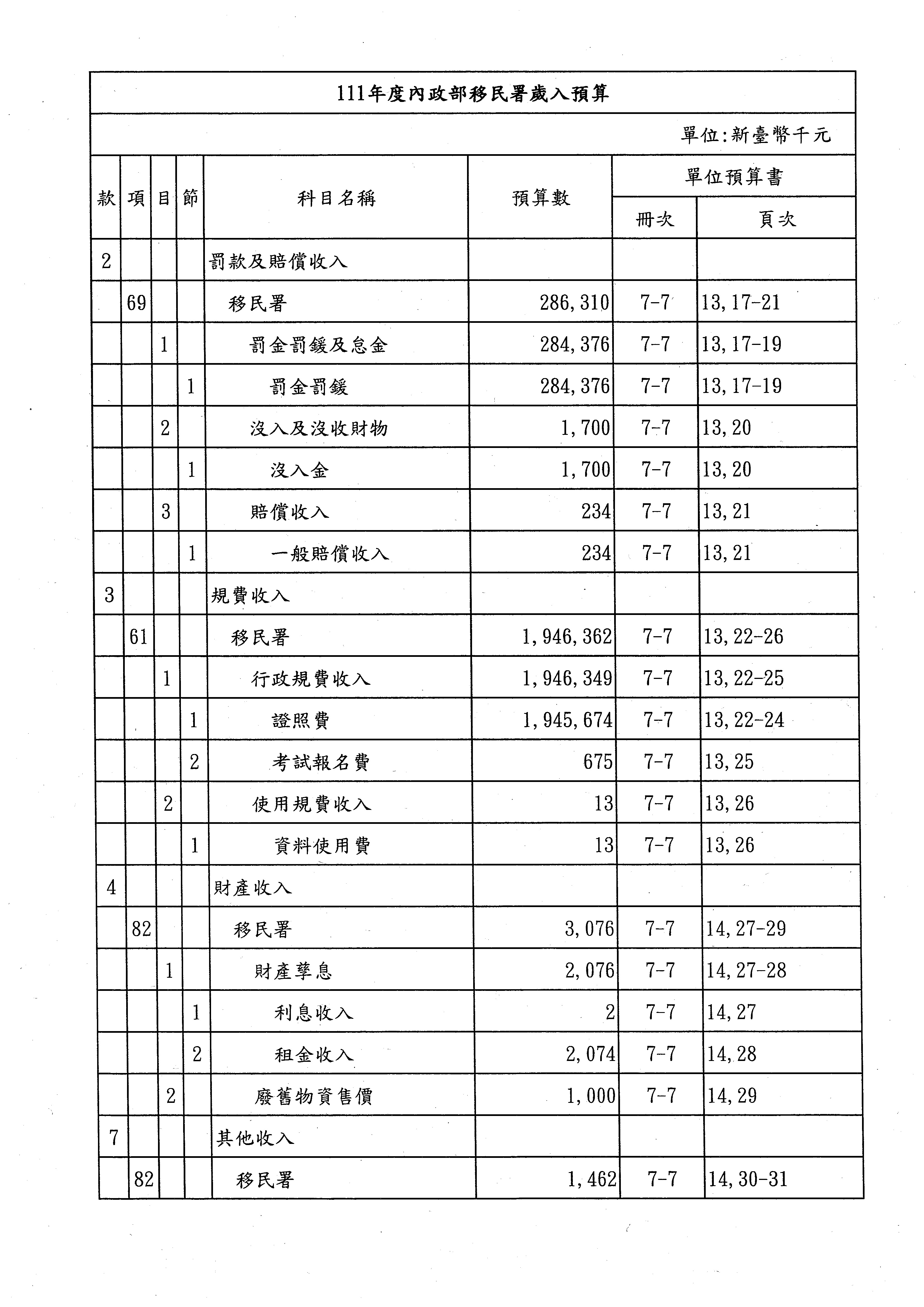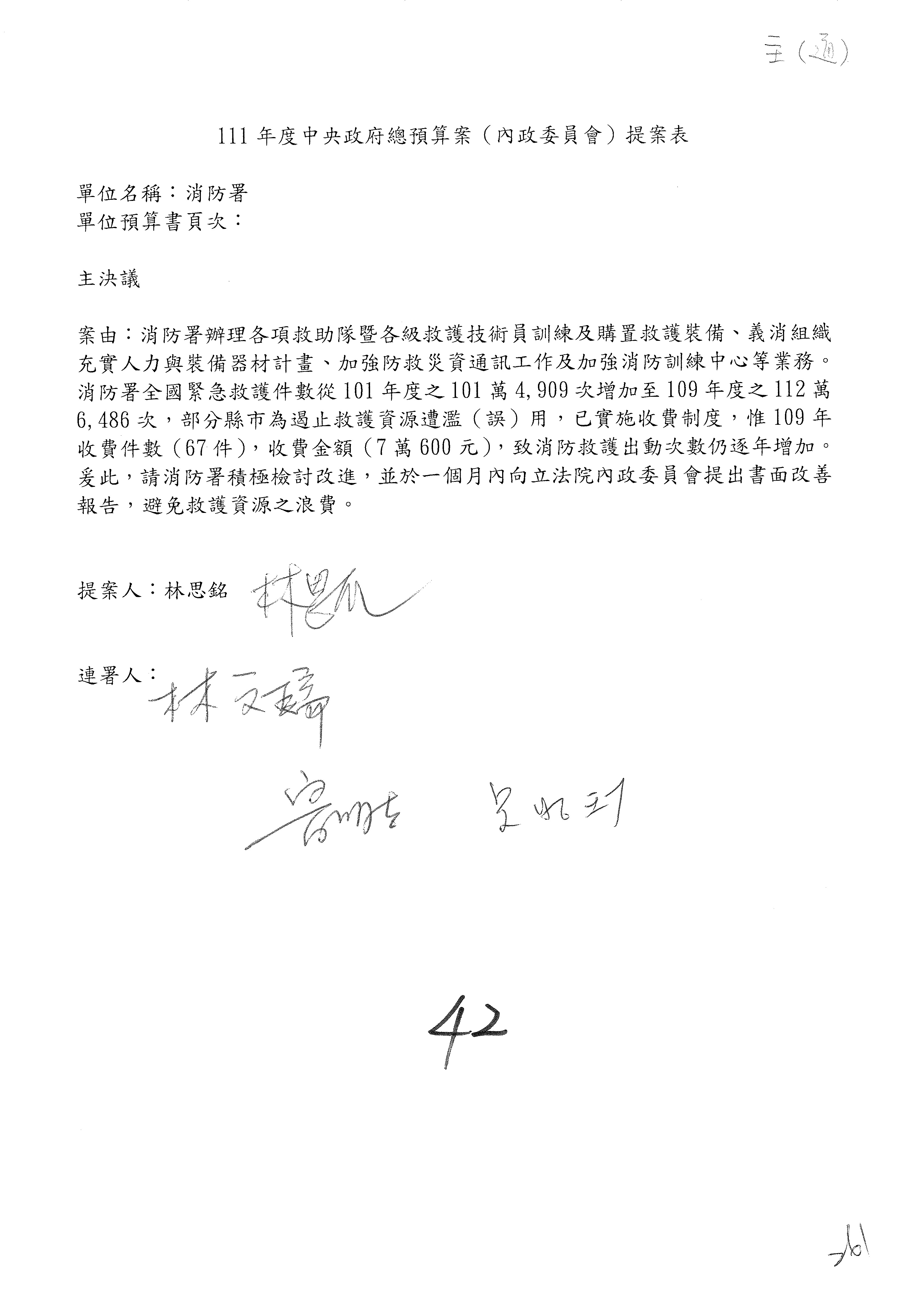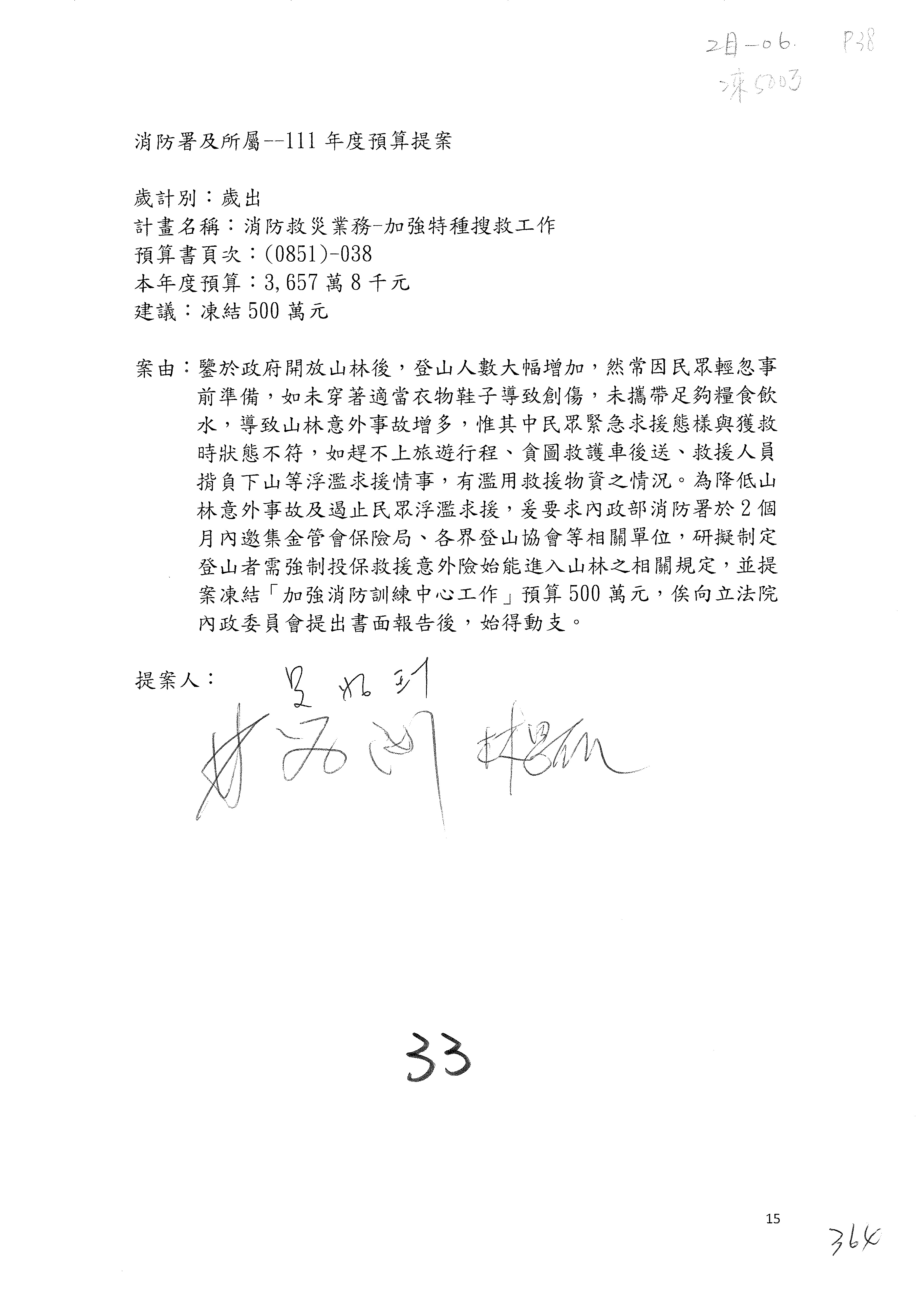 主席:現在進行預算處理,今天預算審查的順序依序為:警政署及所屬、中央警察大學、消防署及所屬、移民署、役政署及空中勤務總隊等單位預算,以上每個單位的預算數已宣讀完畢。