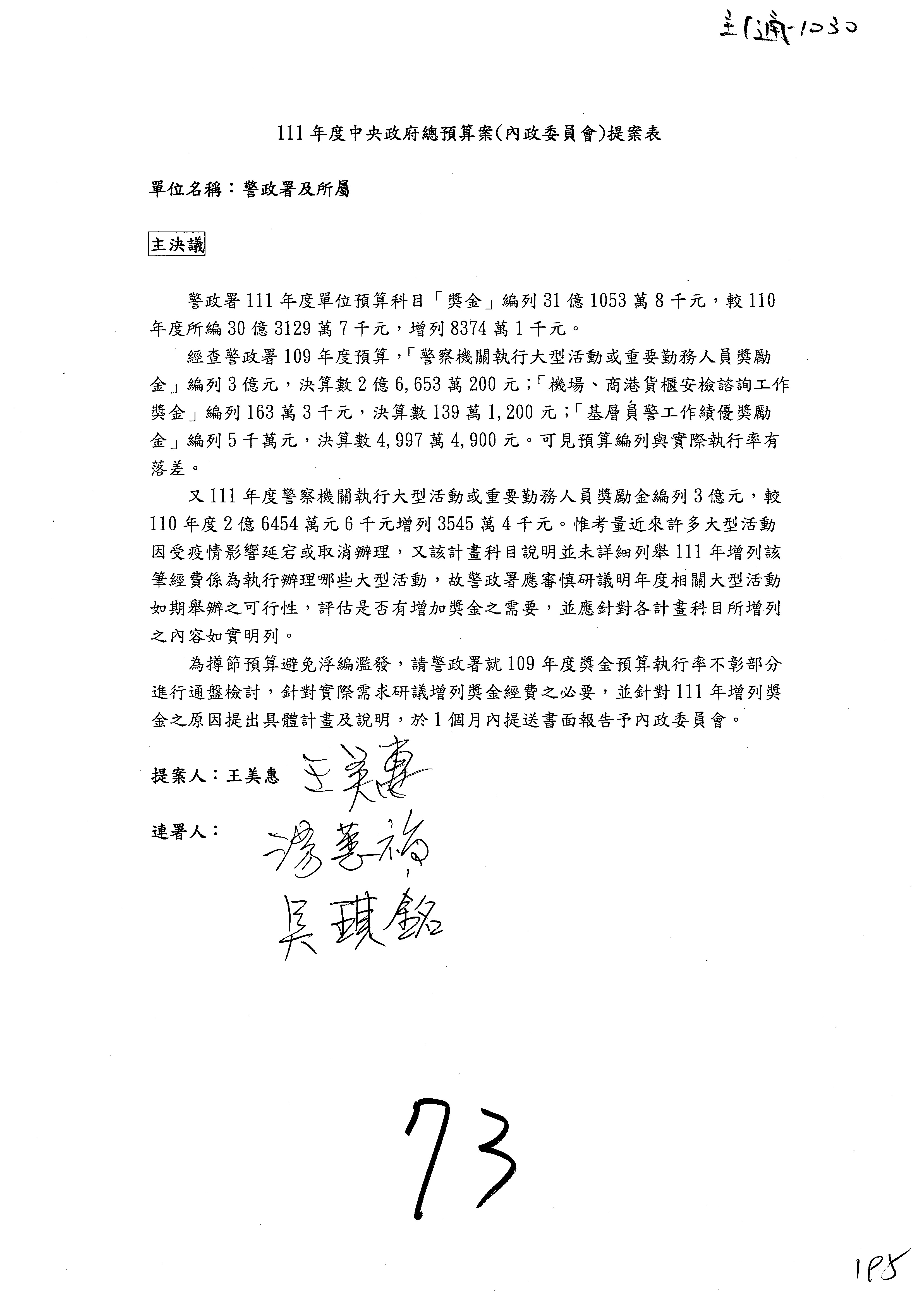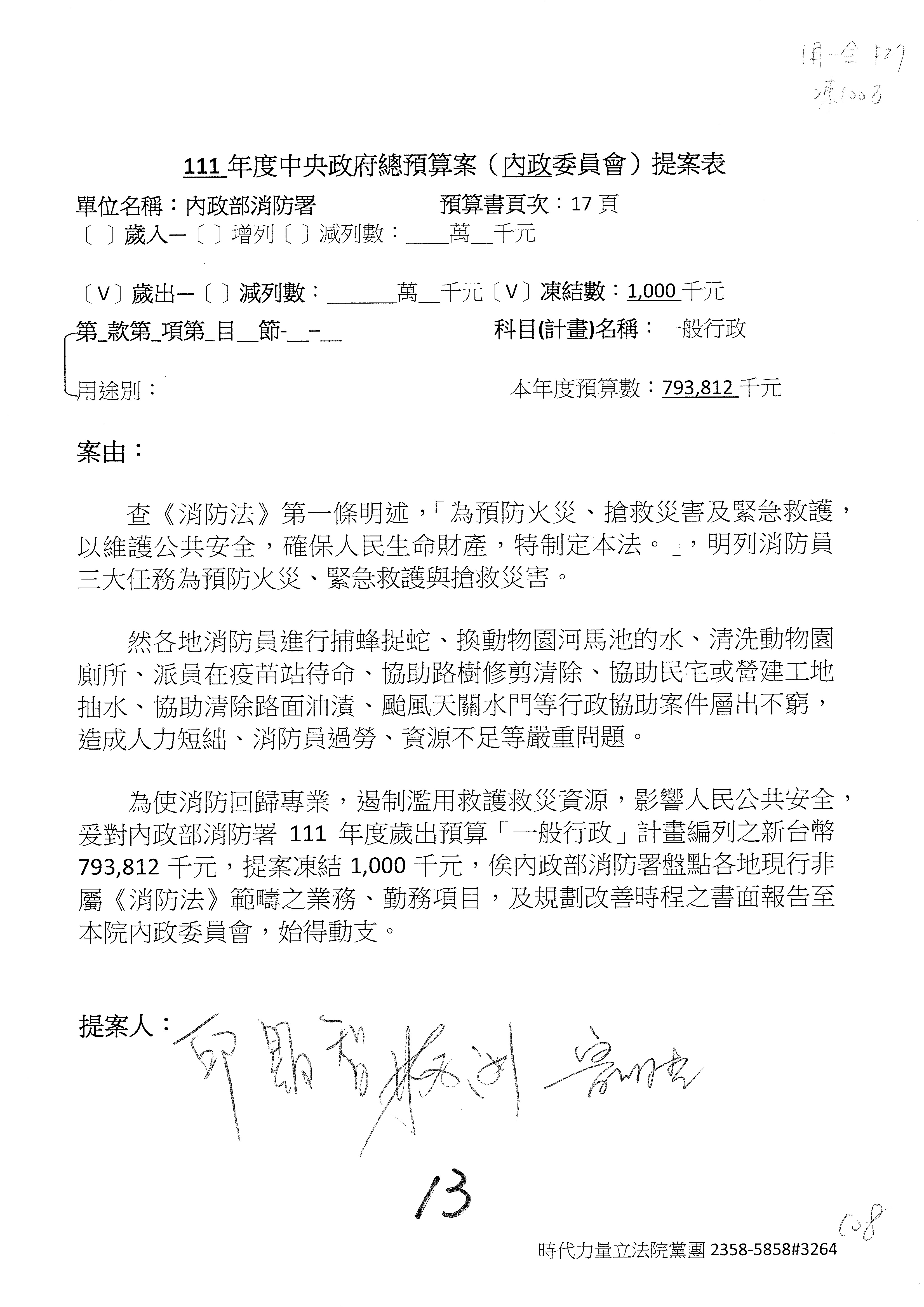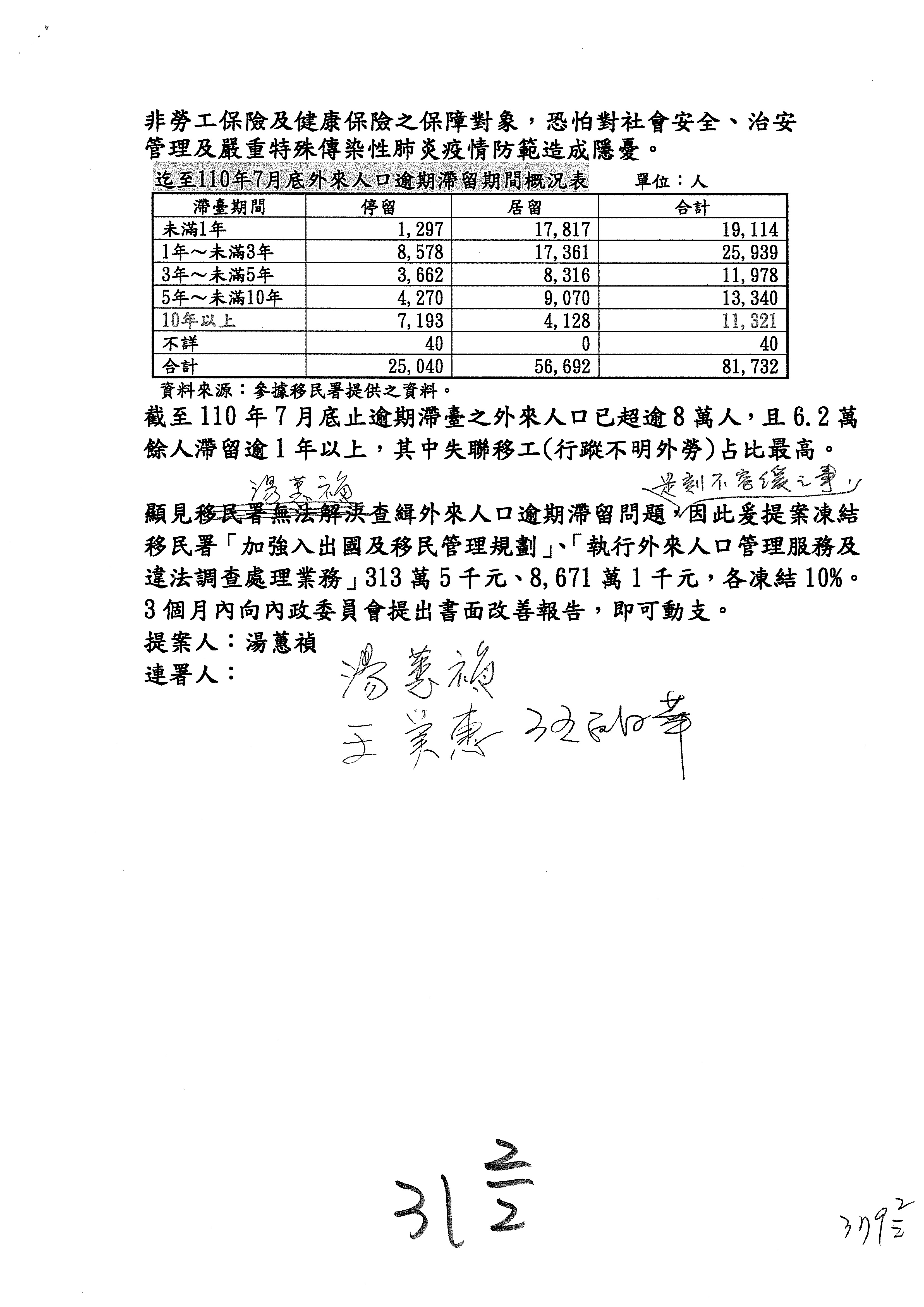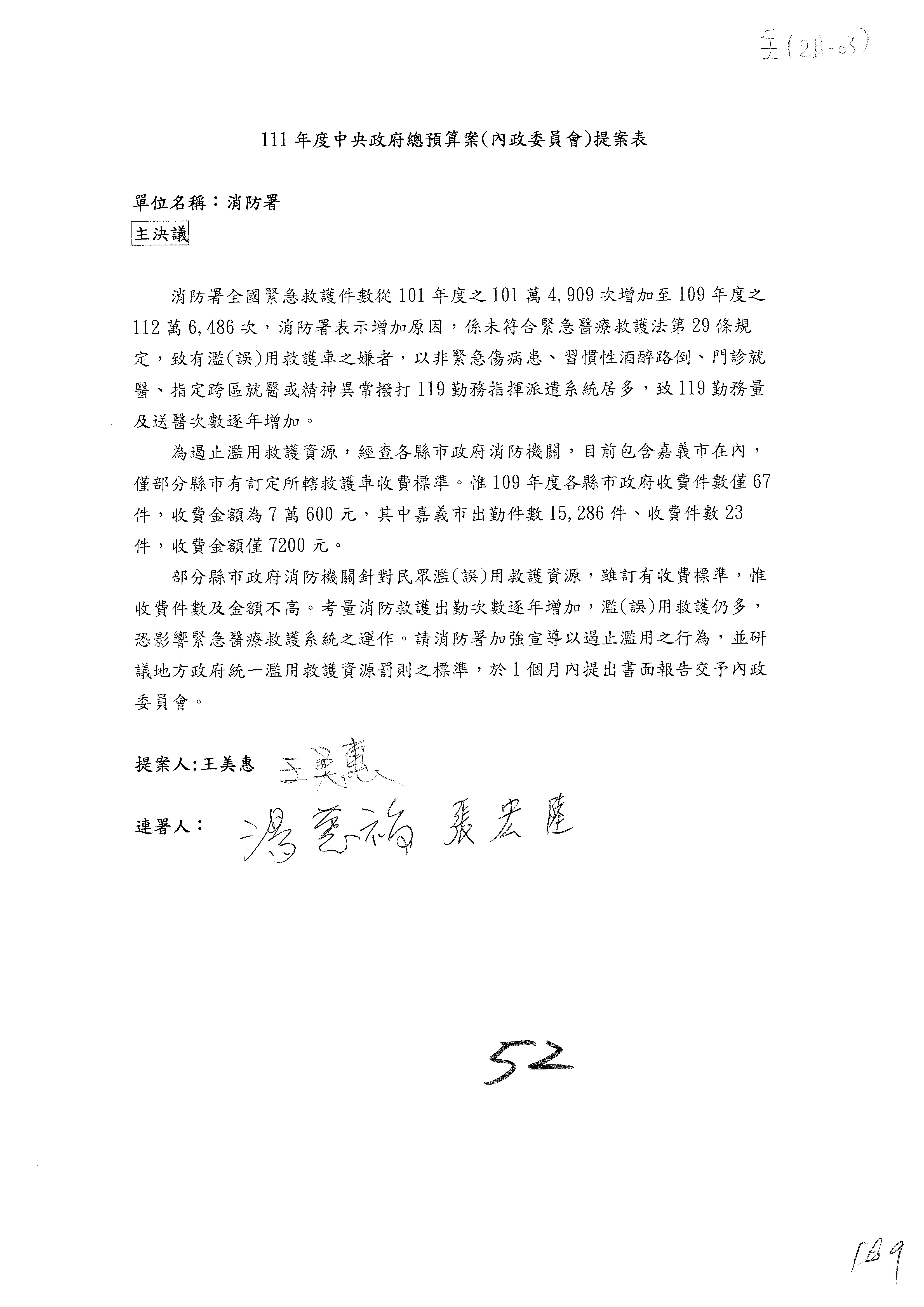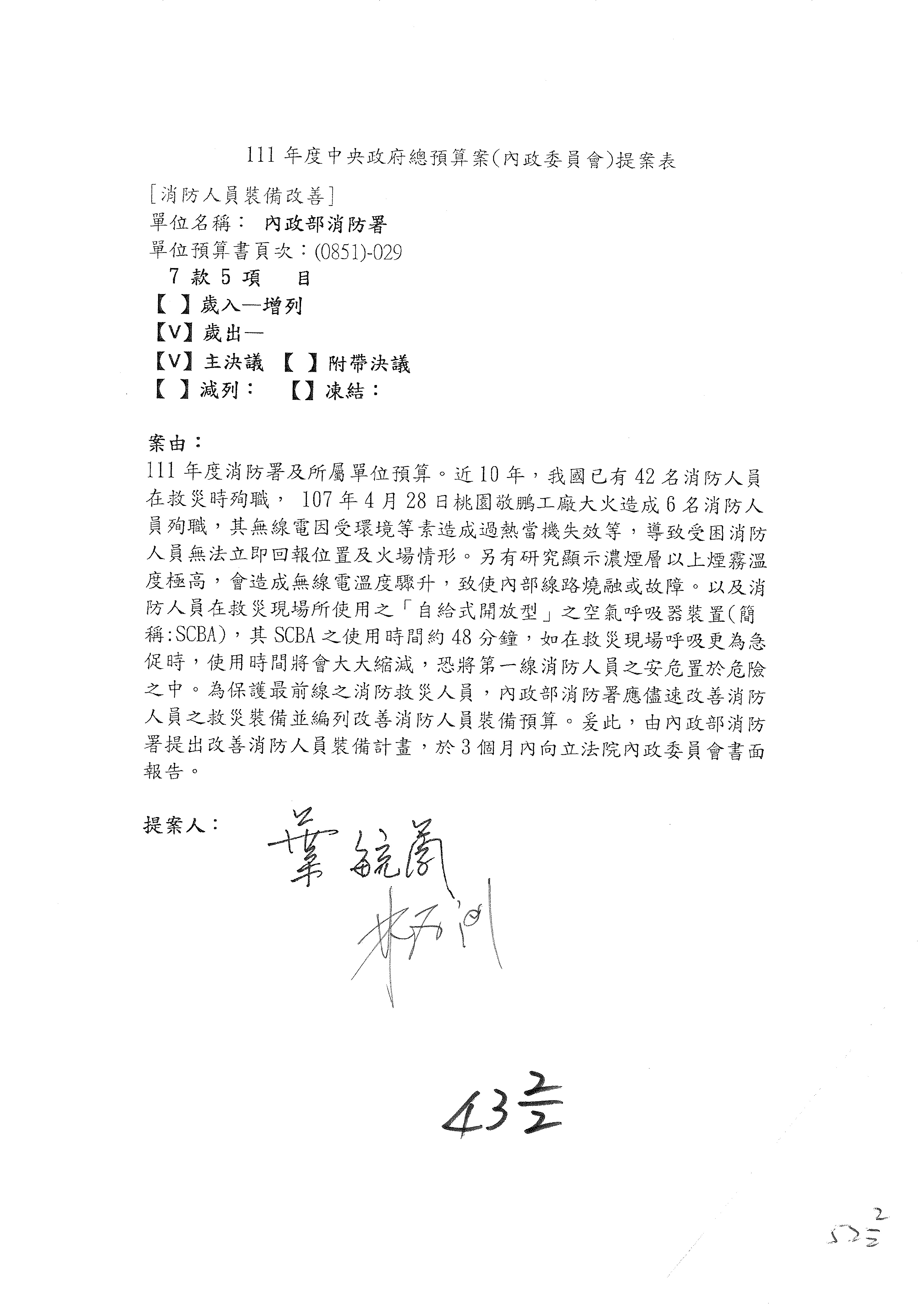 主席:現在進行預算處理,今天預算審查的順序依序為:警政署及所屬、中央警察大學、消防署及所屬、移民署、役政署及空中勤務總隊等單位預算,以上每個單位的預算數已宣讀完畢。