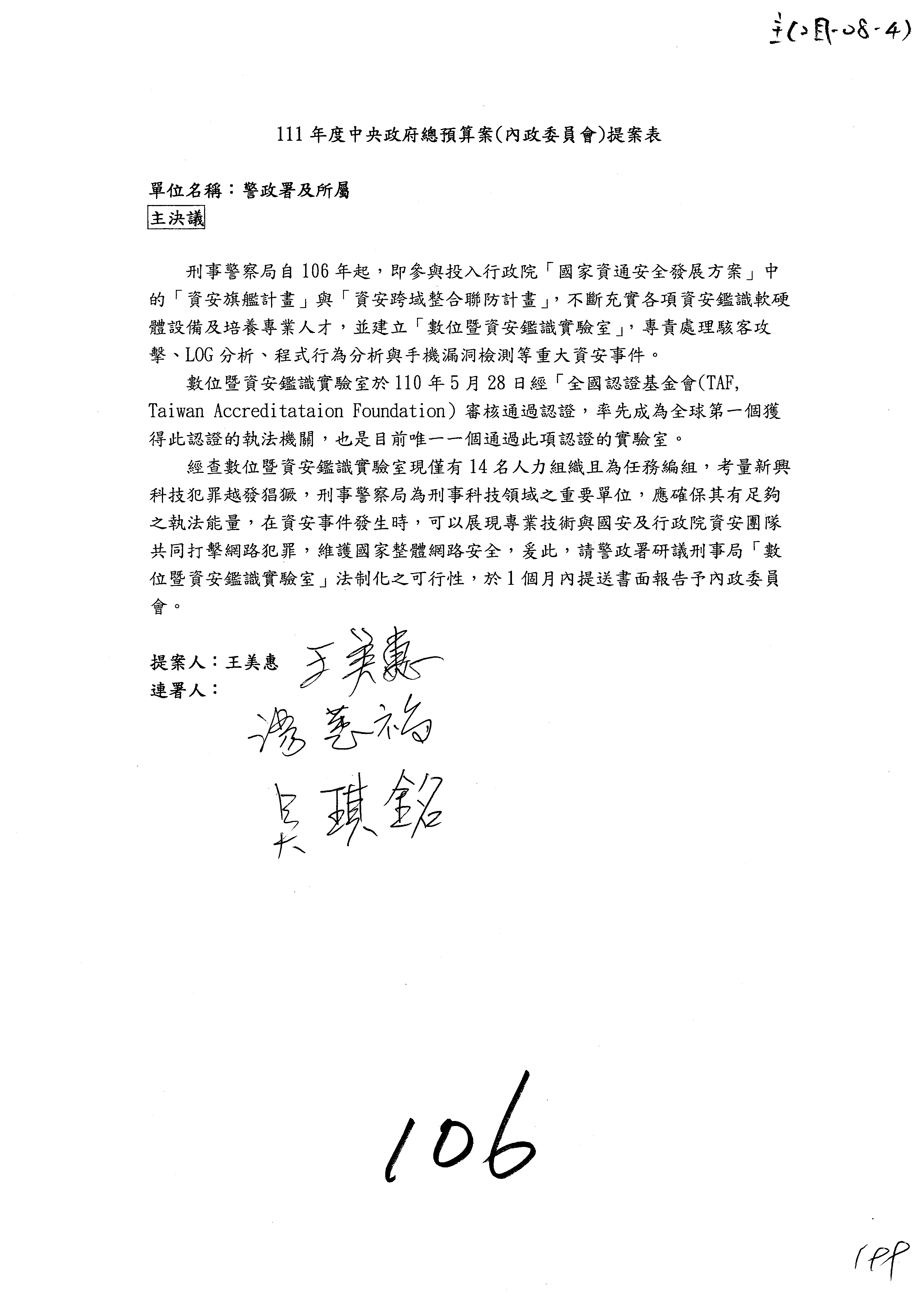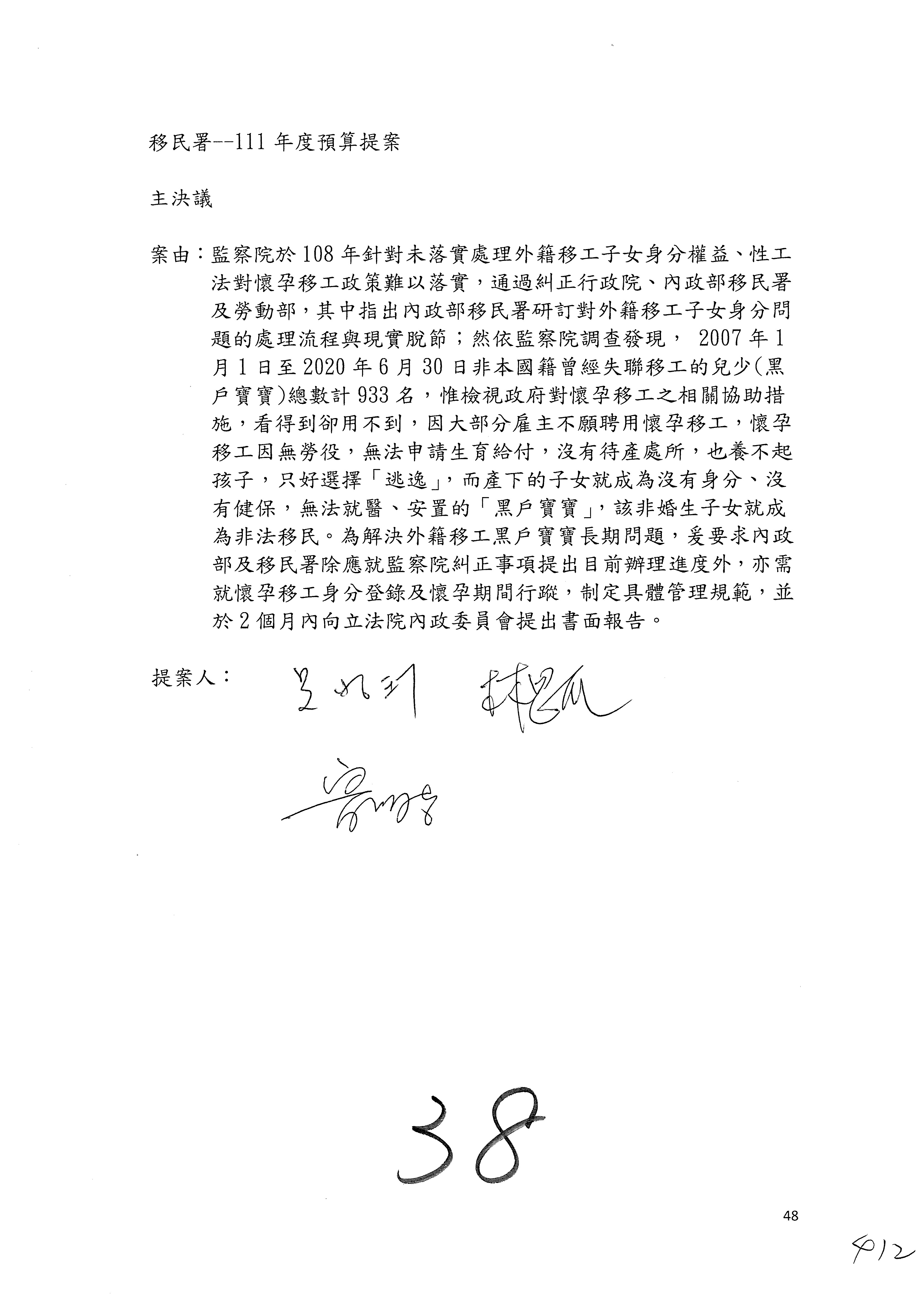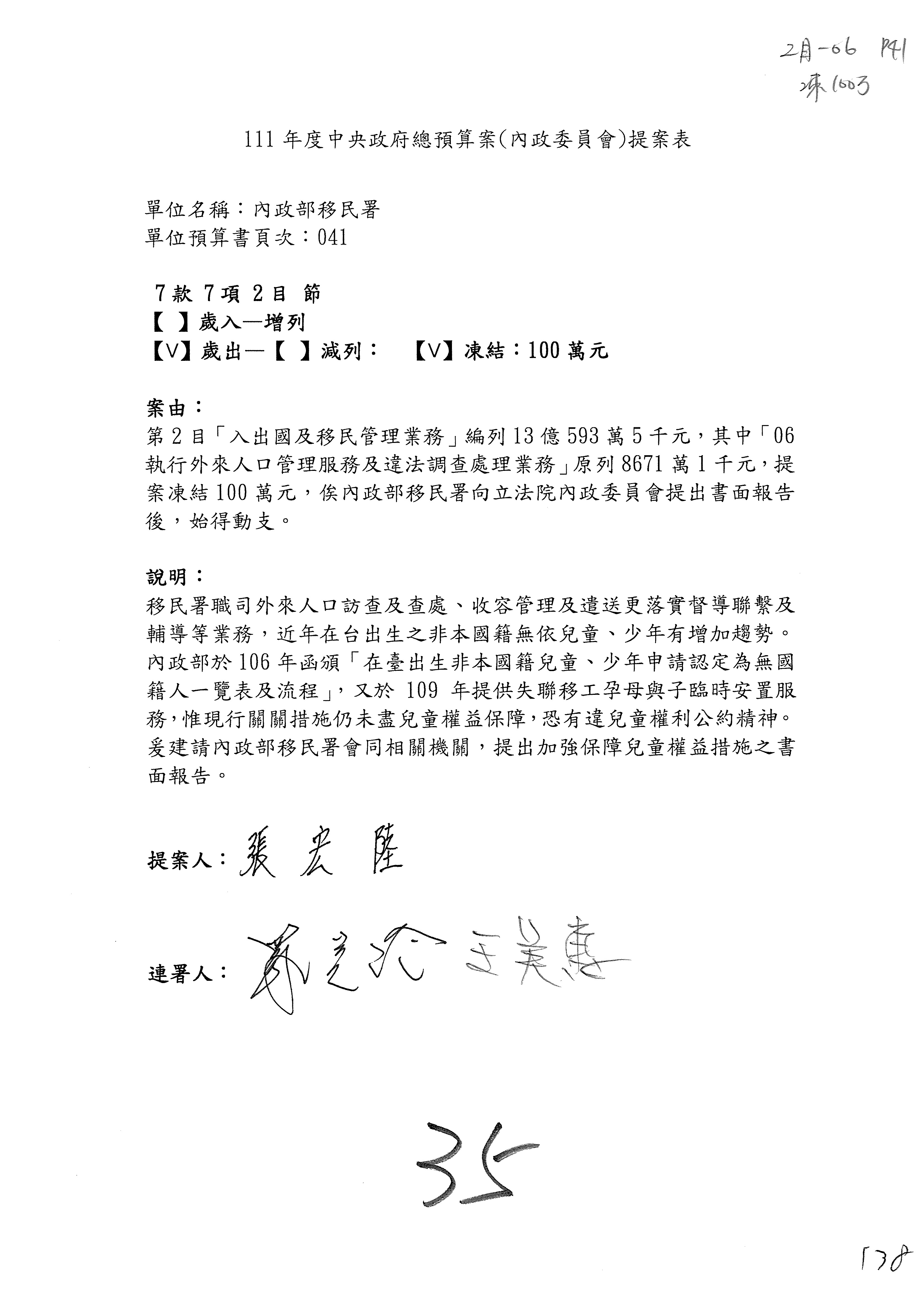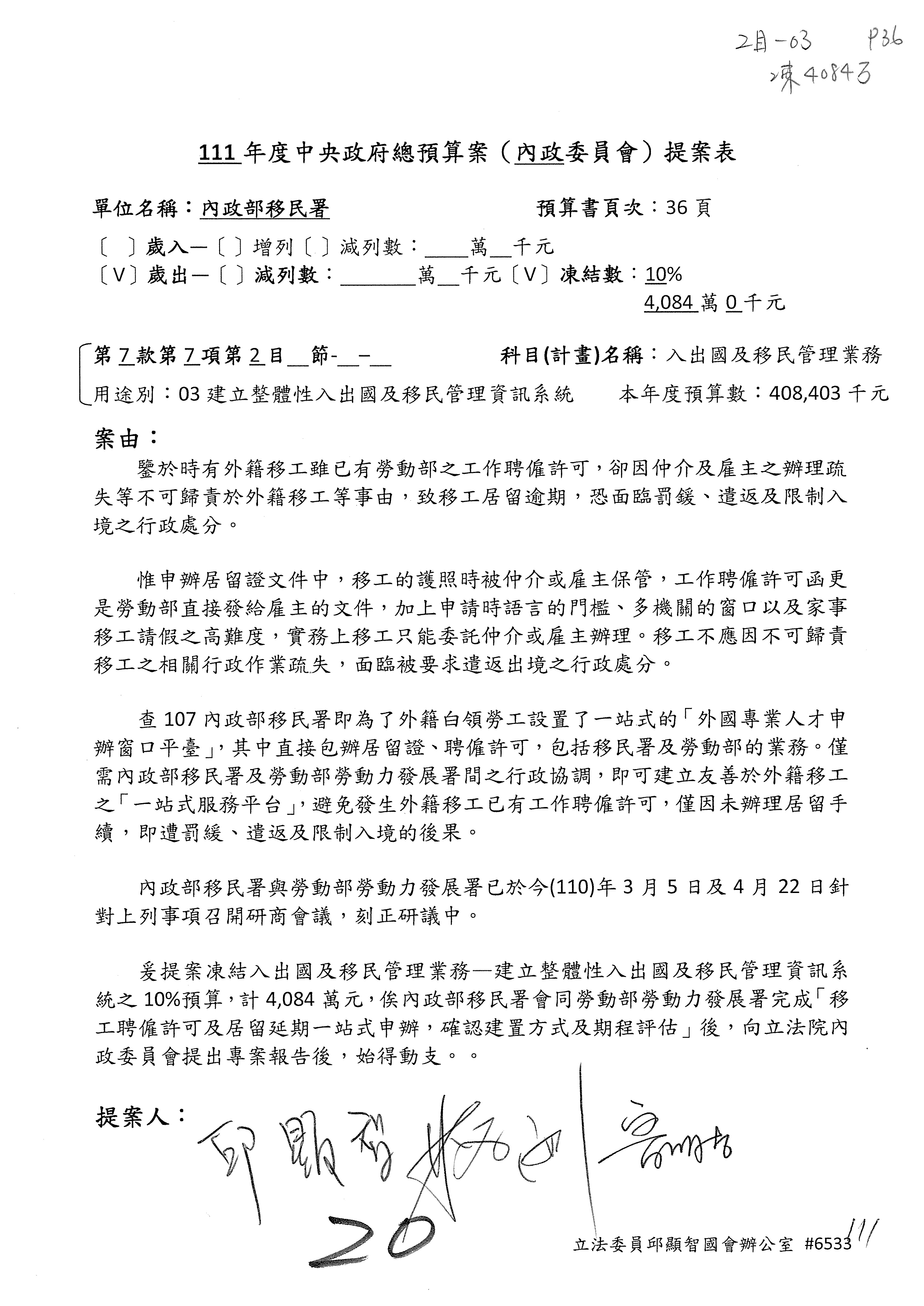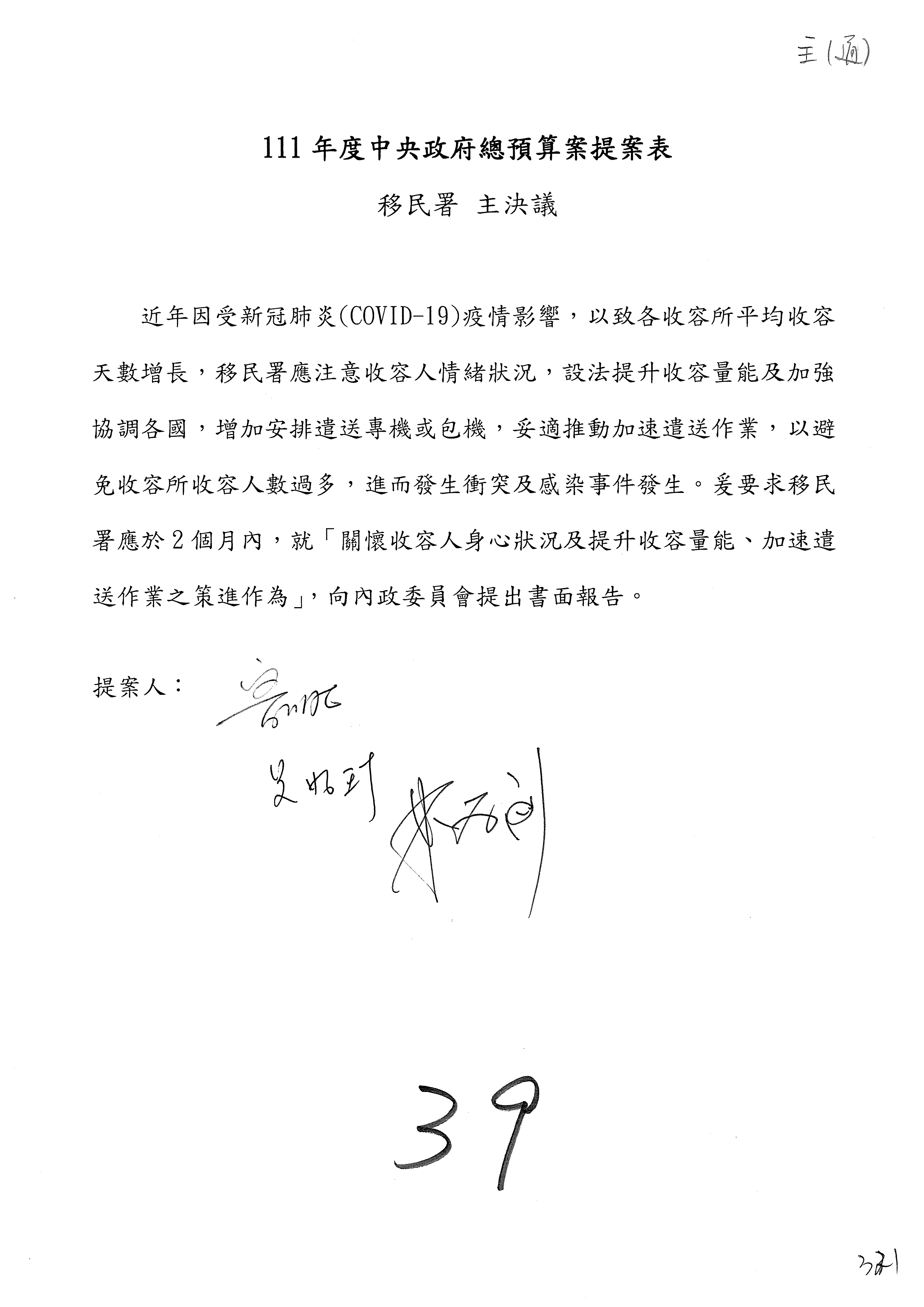 主席:現在進行預算處理,今天預算審查的順序依序為:警政署及所屬、中央警察大學、消防署及所屬、移民署、役政署及空中勤務總隊等單位預算,以上每個單位的預算數已宣讀完畢。