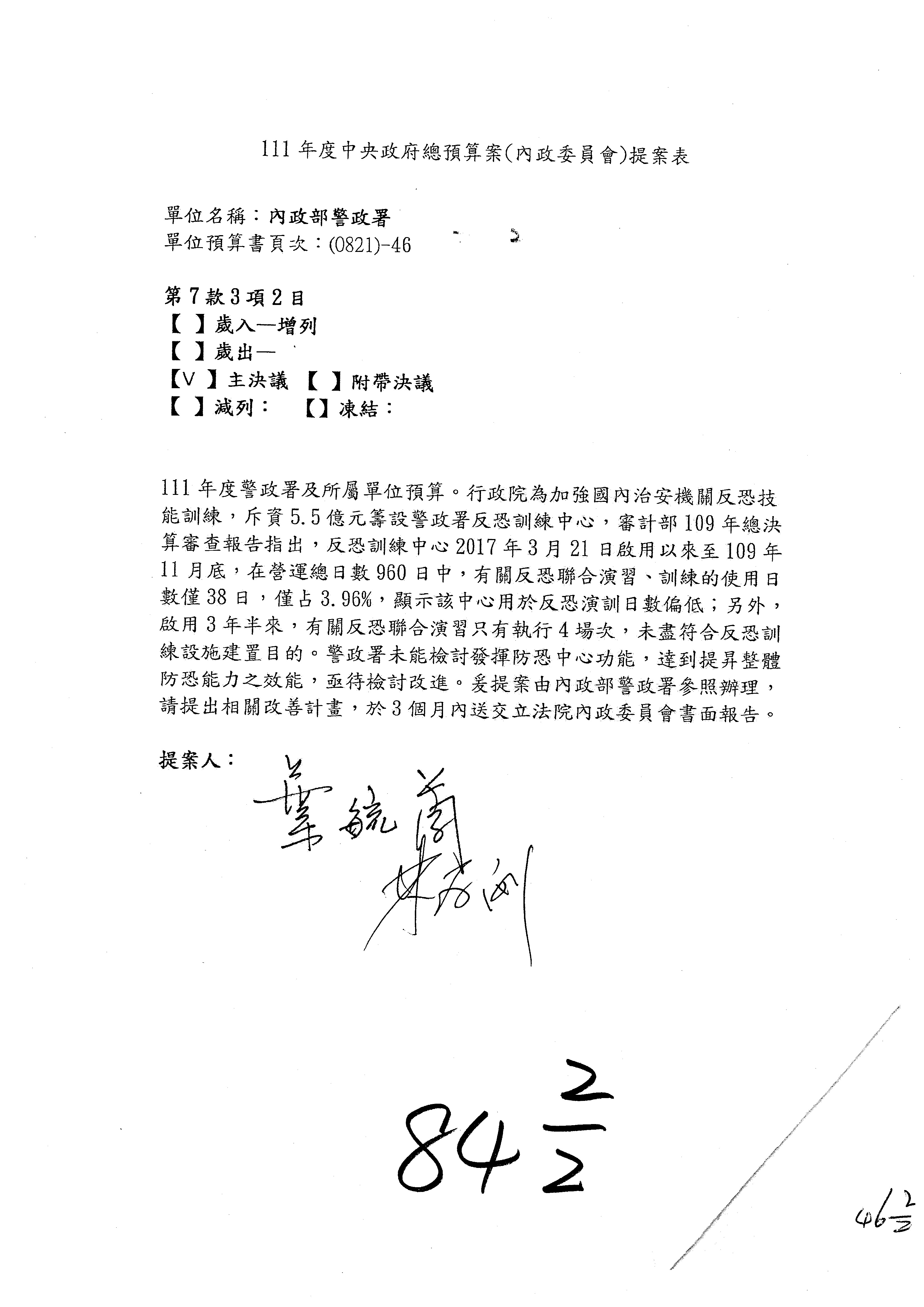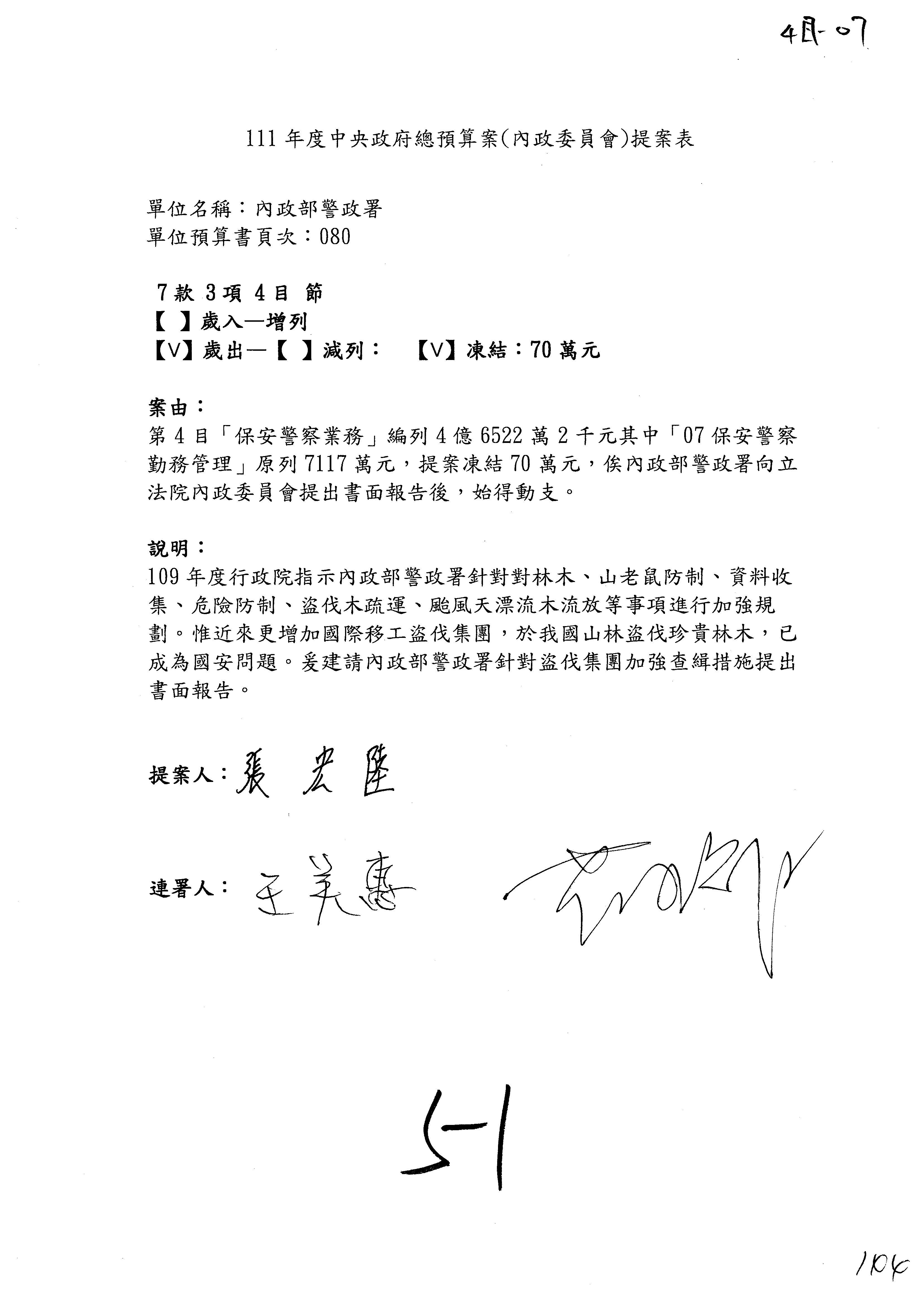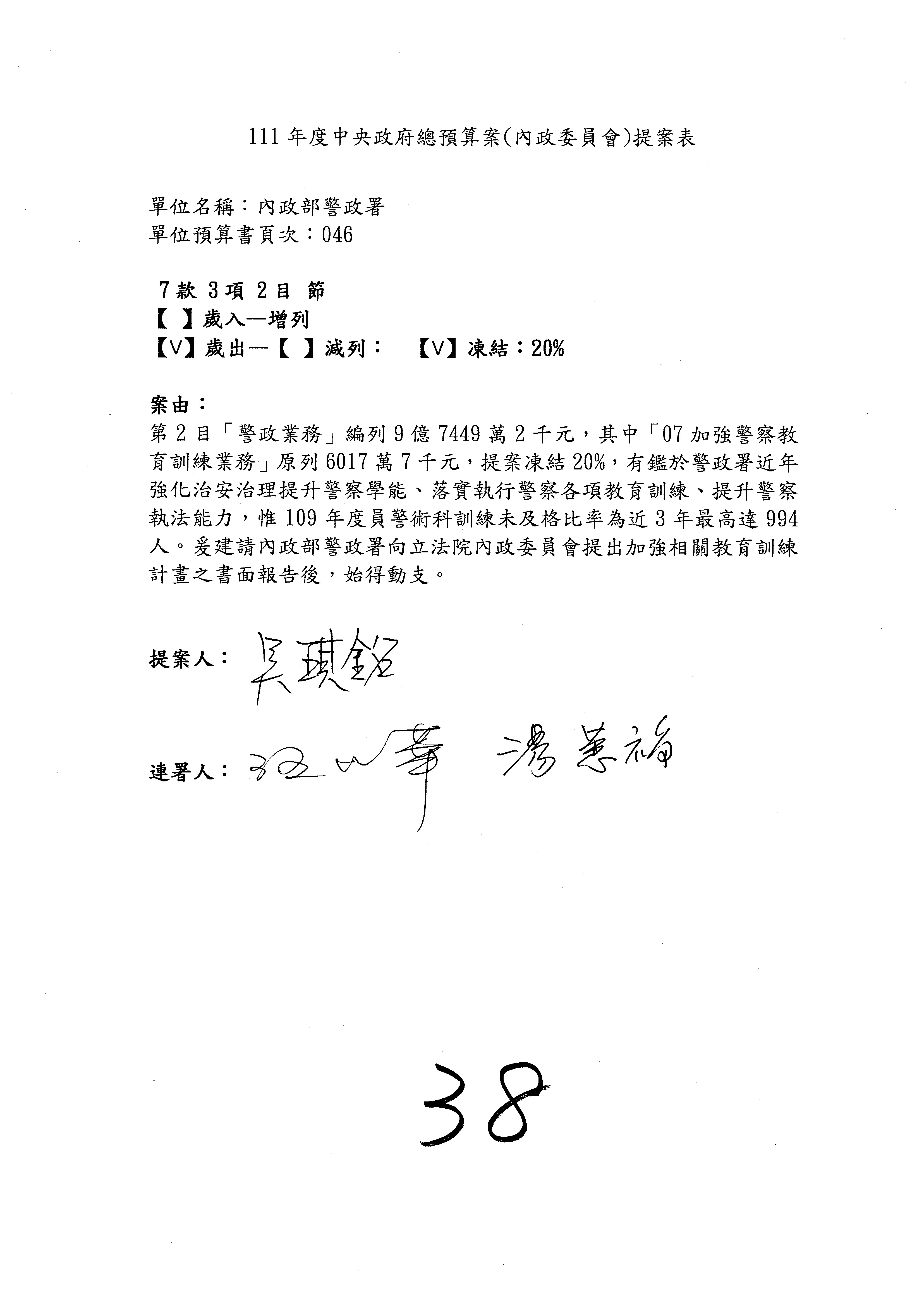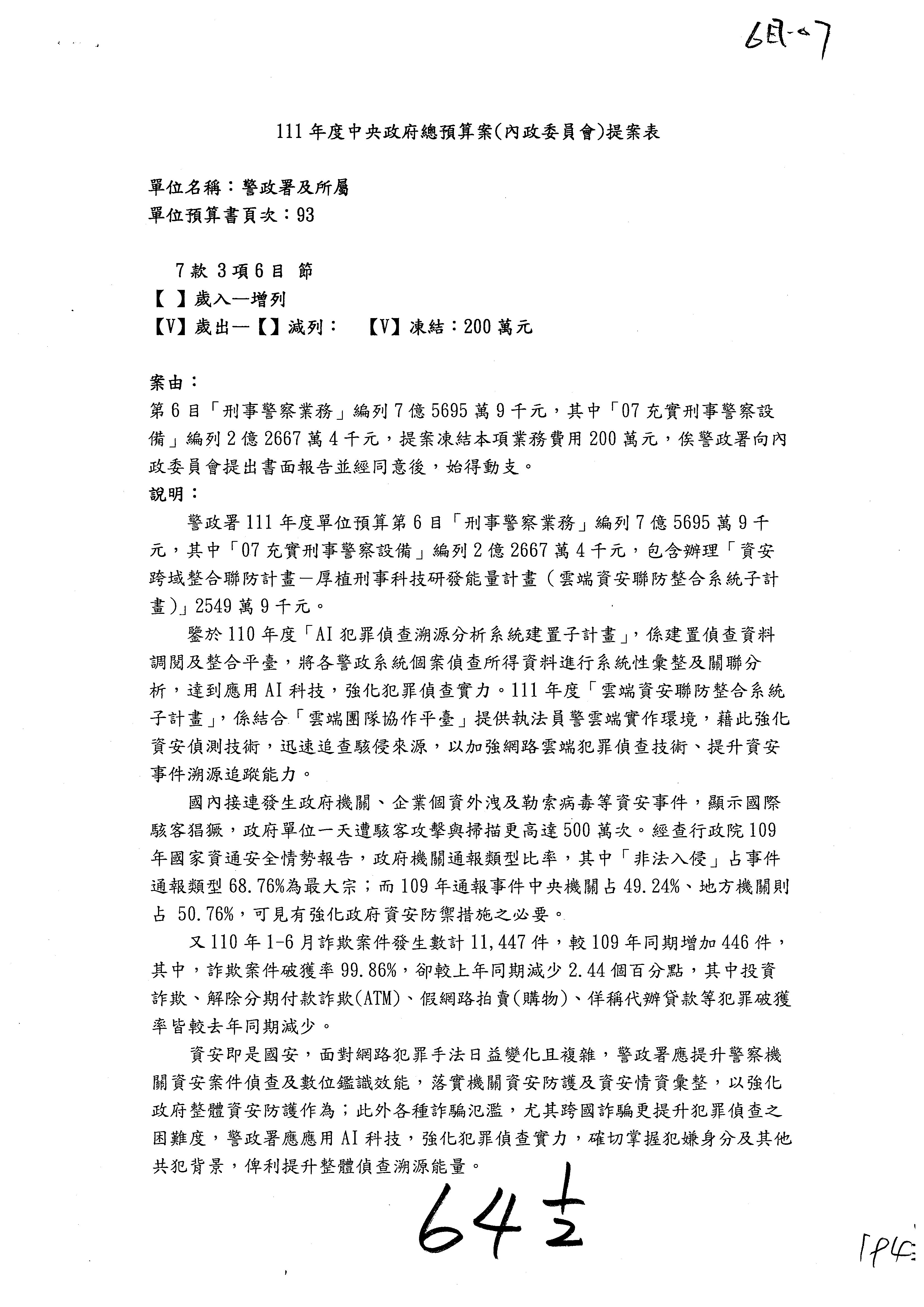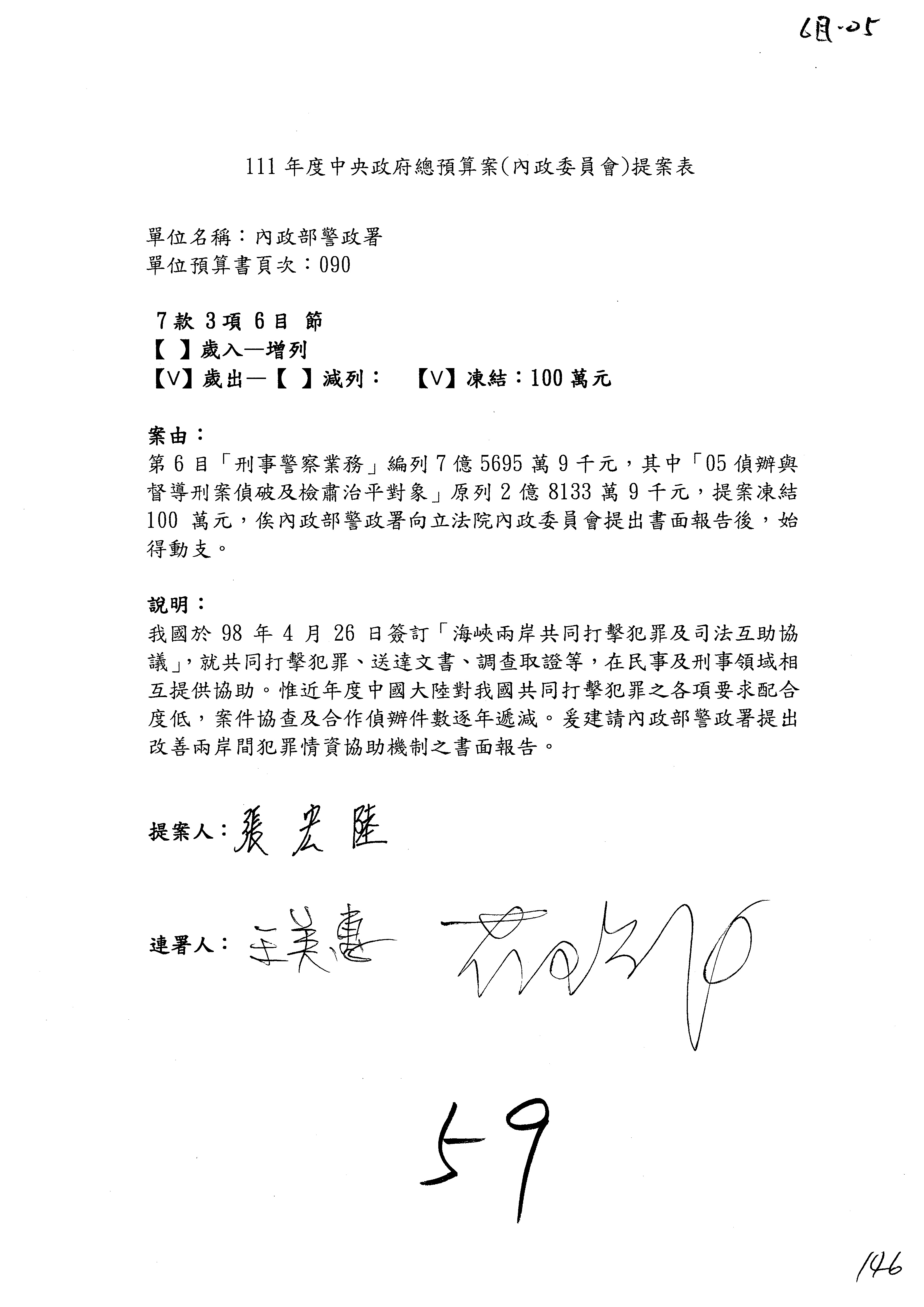 第26案是一樣的科目嗎?不一樣,這是在加強警備應變措施、社會治安維護及國際警察合作之業務費項下,凍結十分之一,OK嗎?要說明嗎?好,請說明。