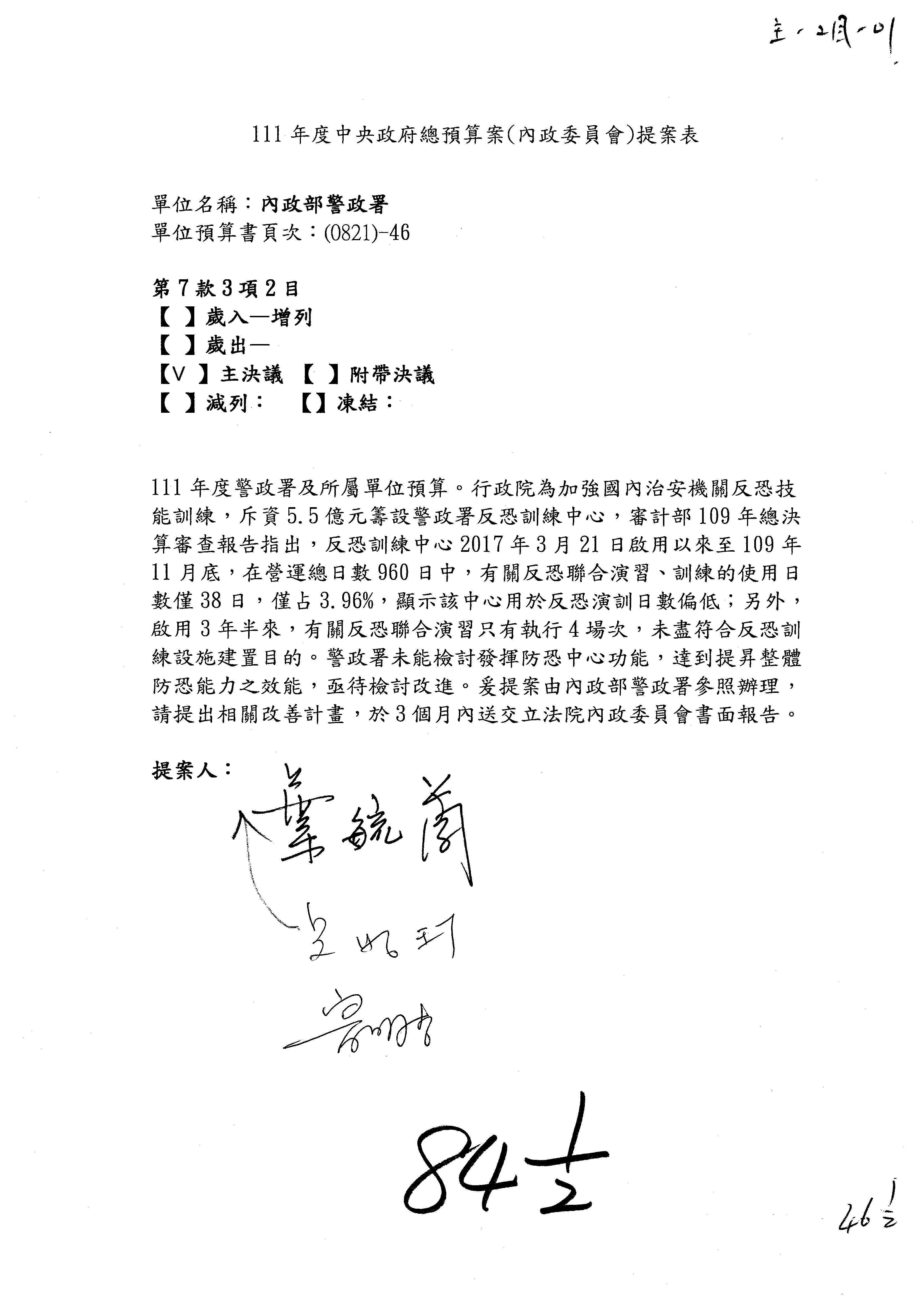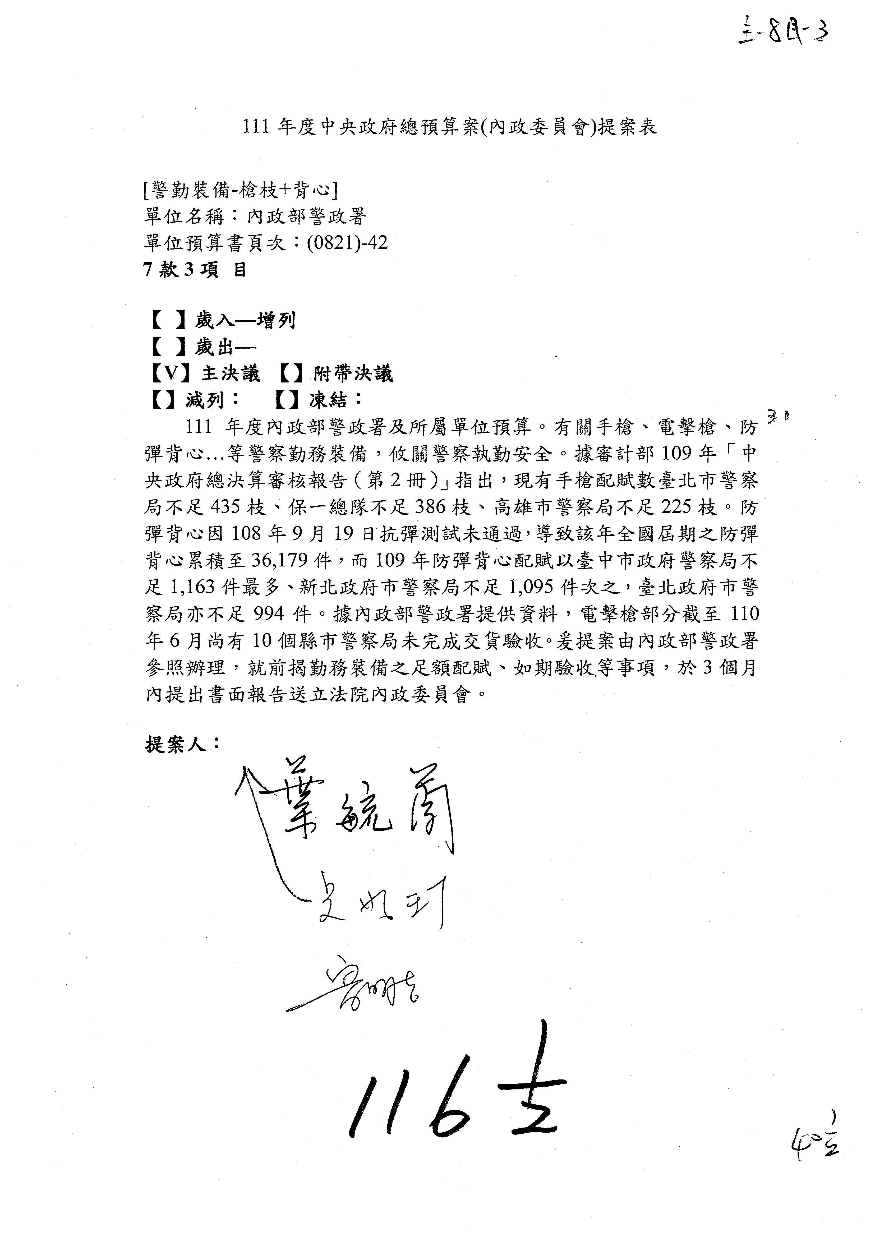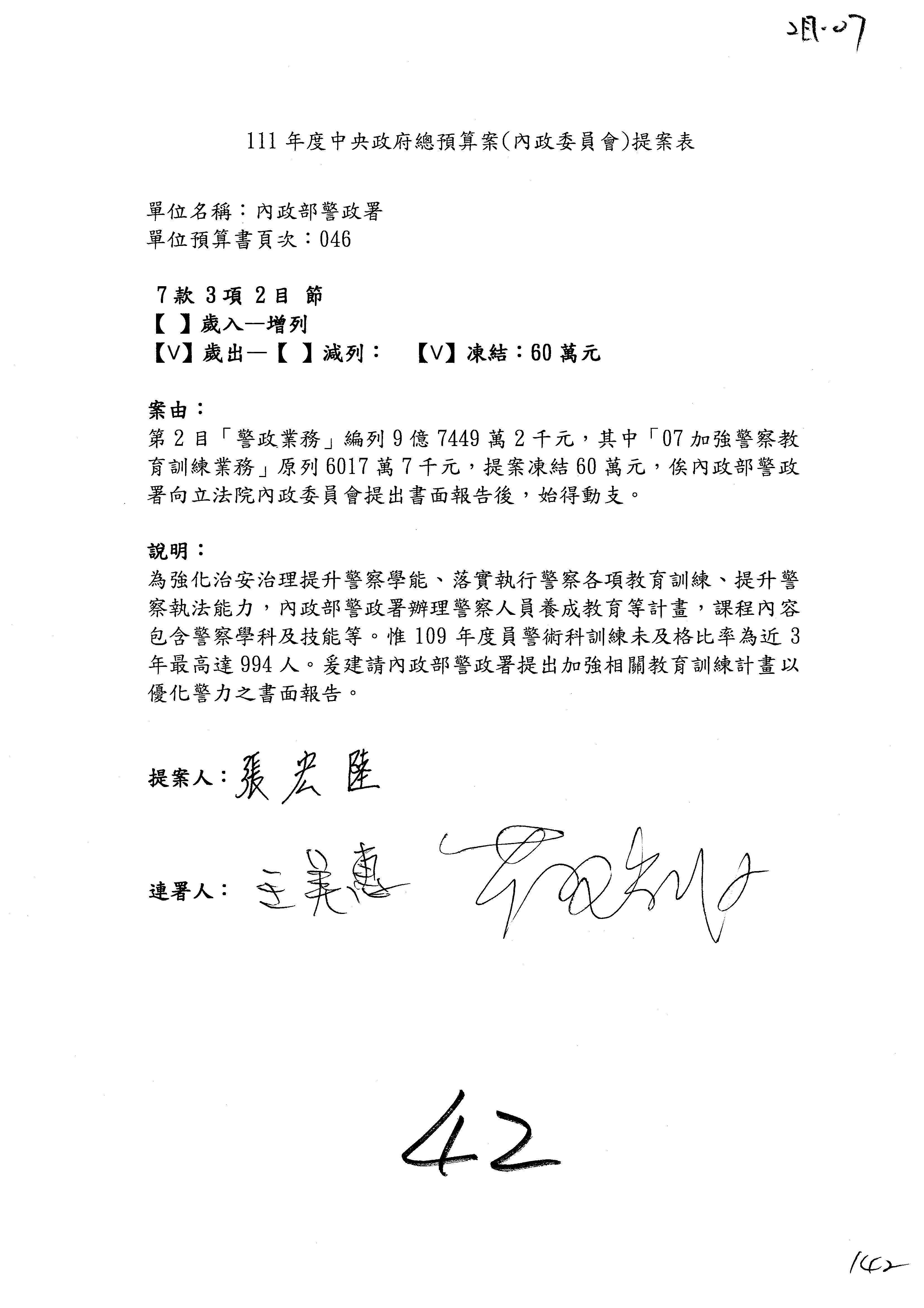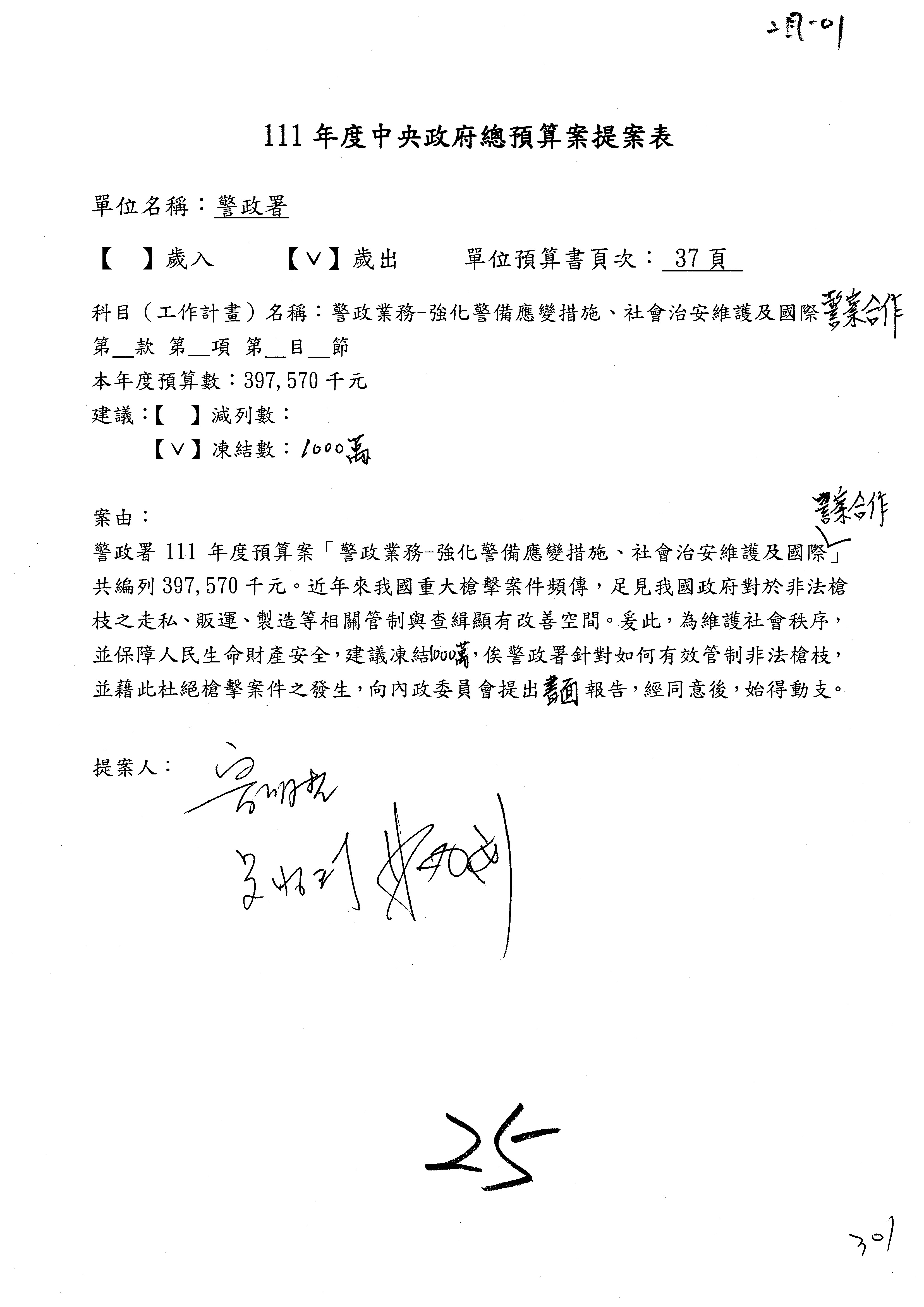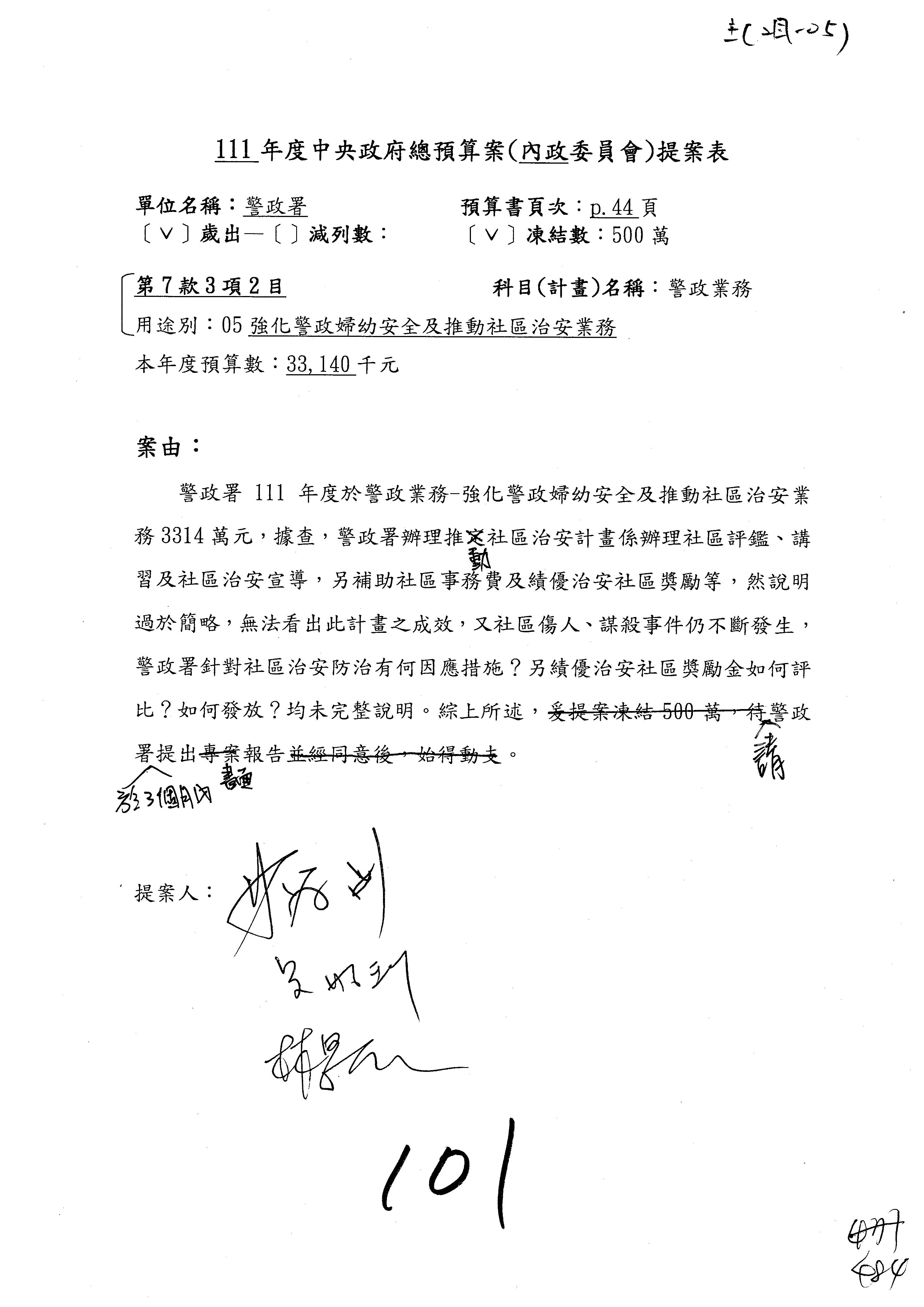 第26案是一樣的科目嗎?不一樣,這是在加強警備應變措施、社會治安維護及國際警察合作之業務費項下,凍結十分之一,OK嗎?要說明嗎?好,請說明。