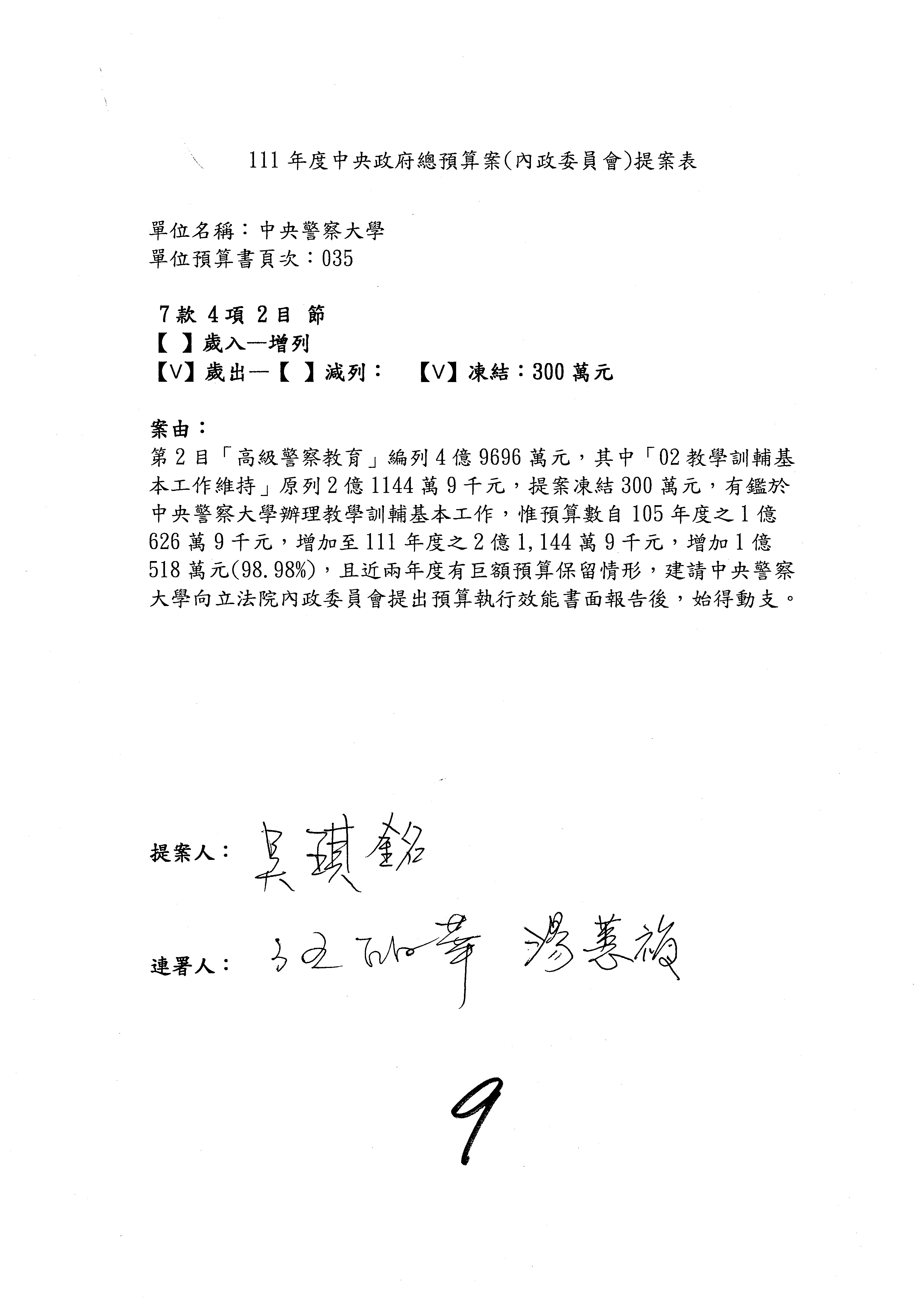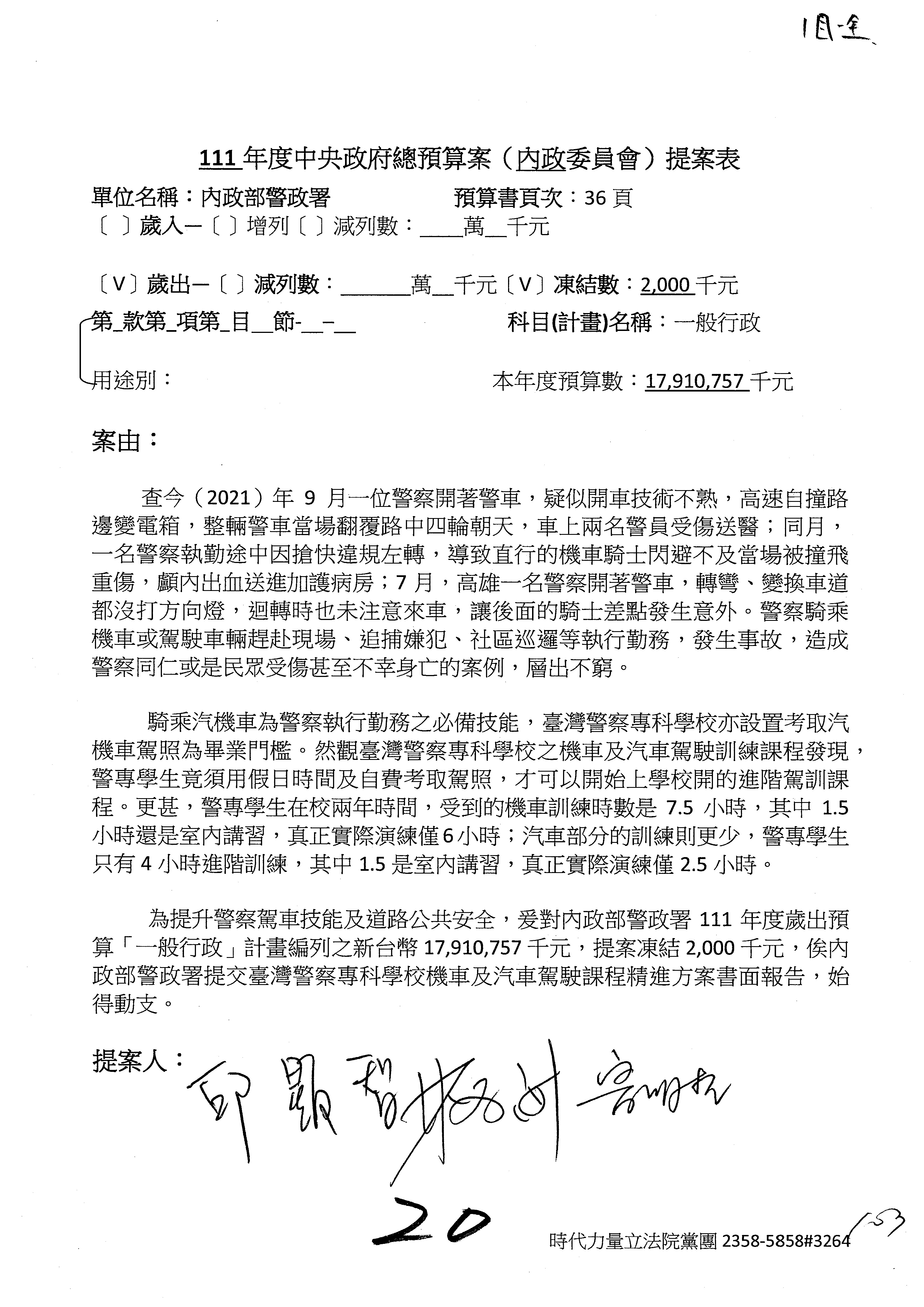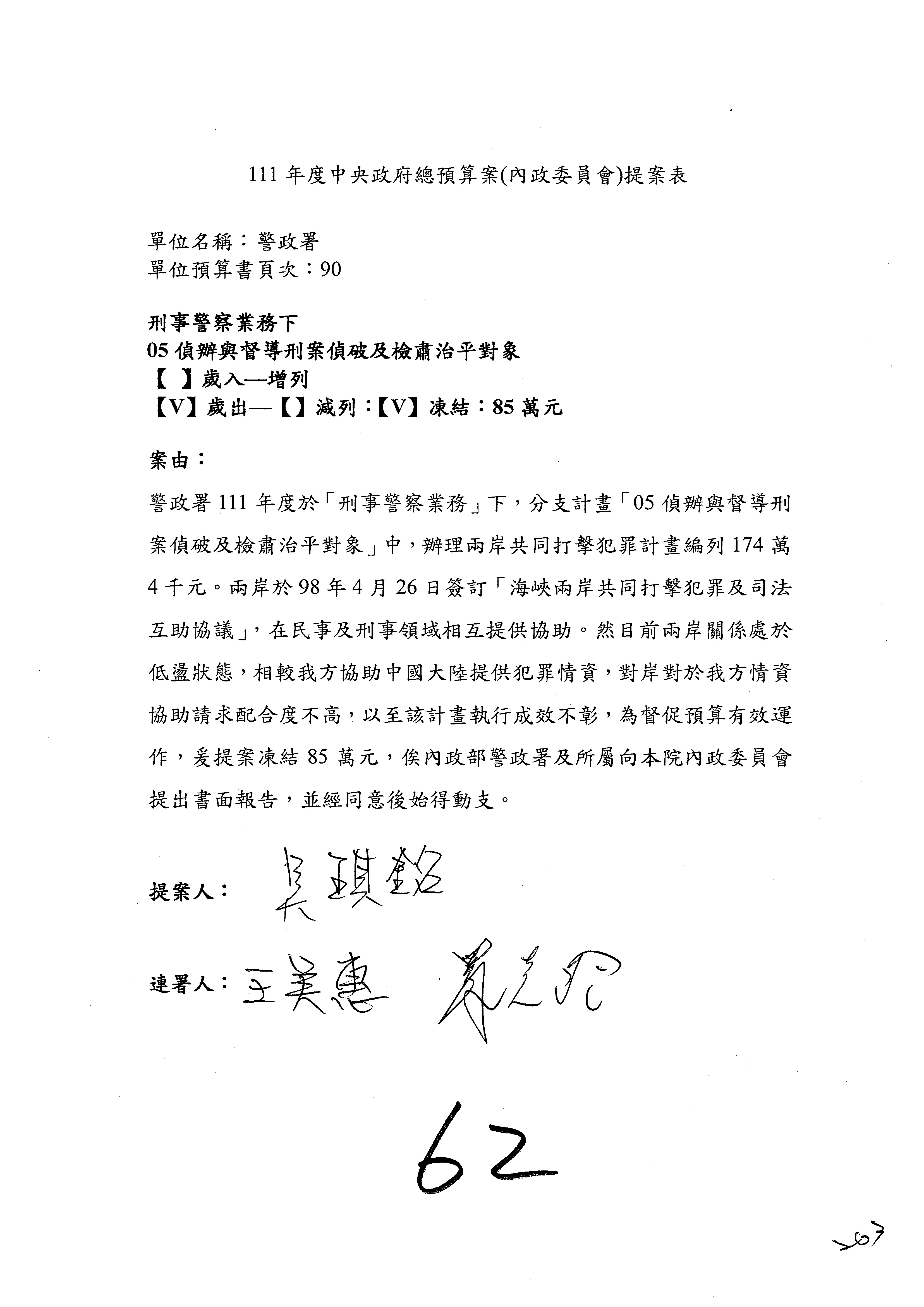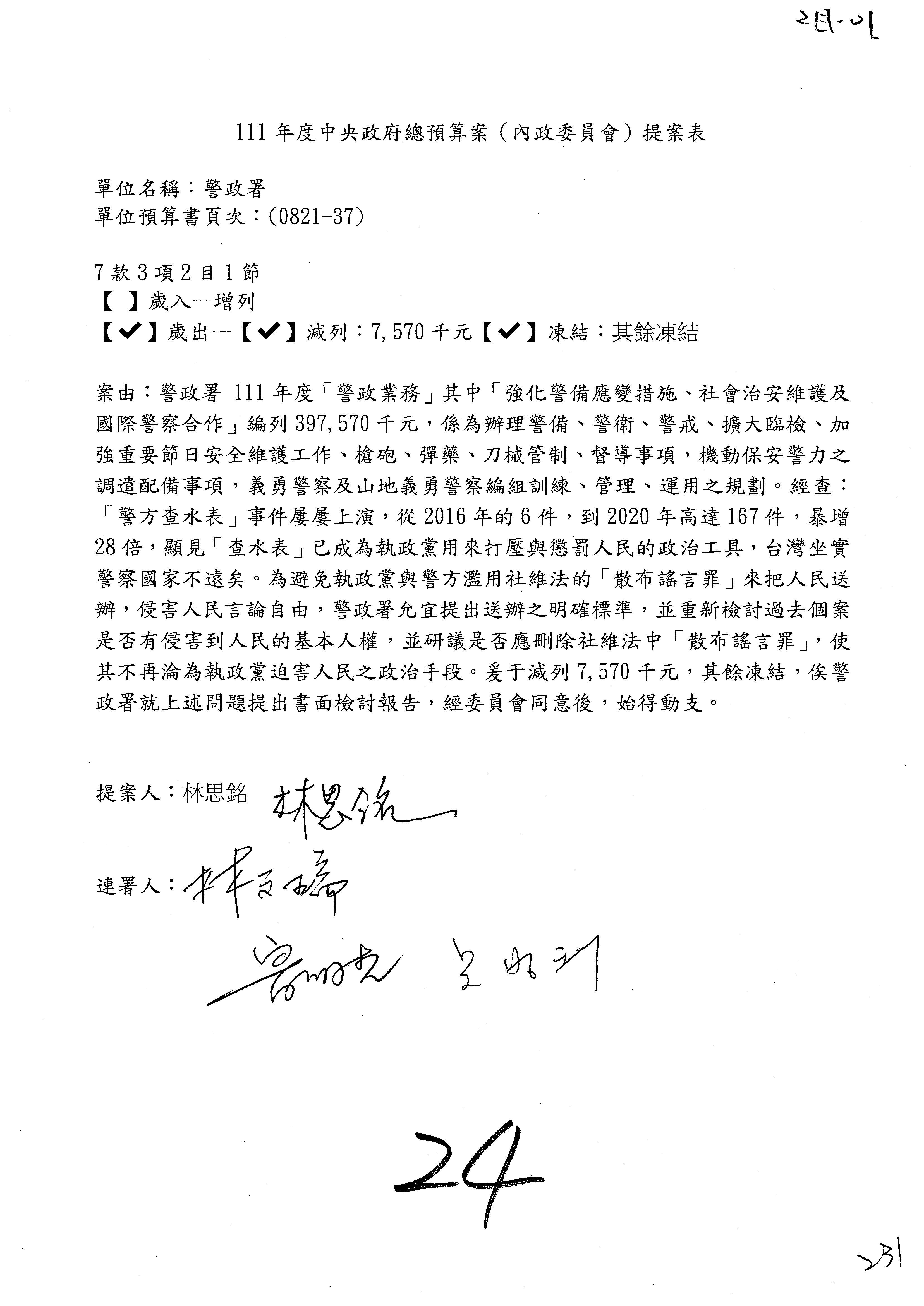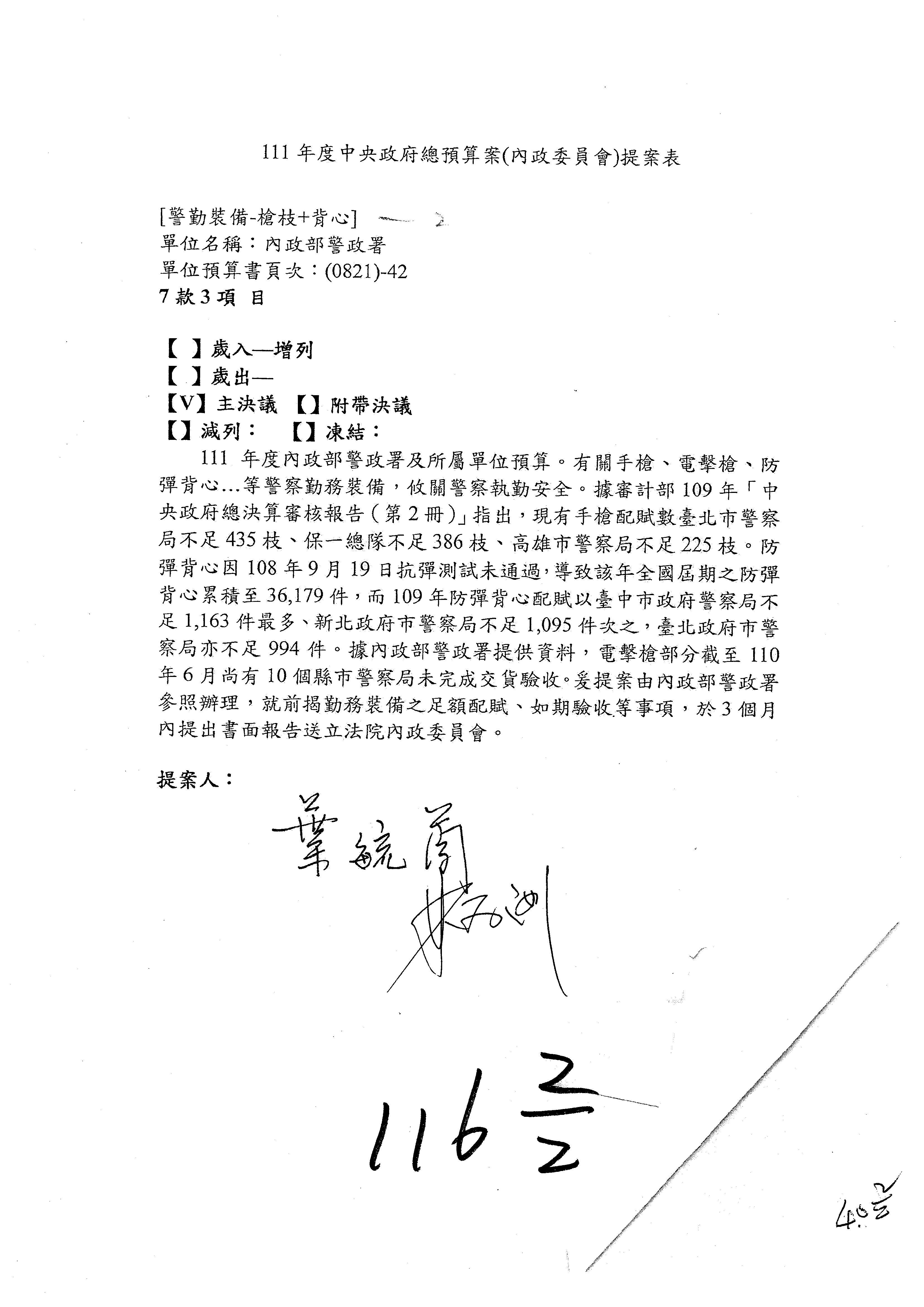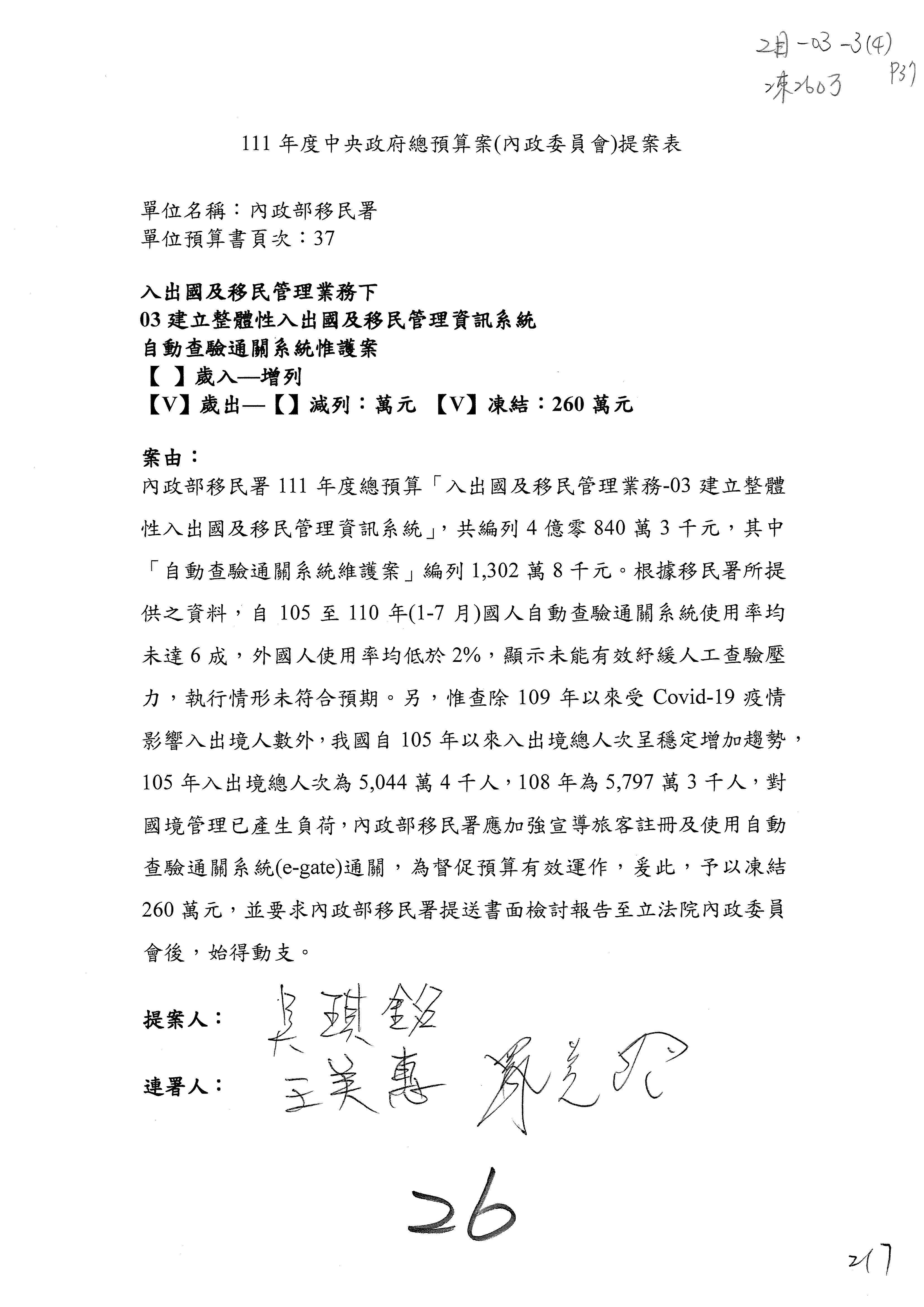 第26案是一樣的科目嗎?不一樣,這是在加強警備應變措施、社會治安維護及國際警察合作之業務費項下,凍結十分之一,OK嗎?要說明嗎?好,請說明。