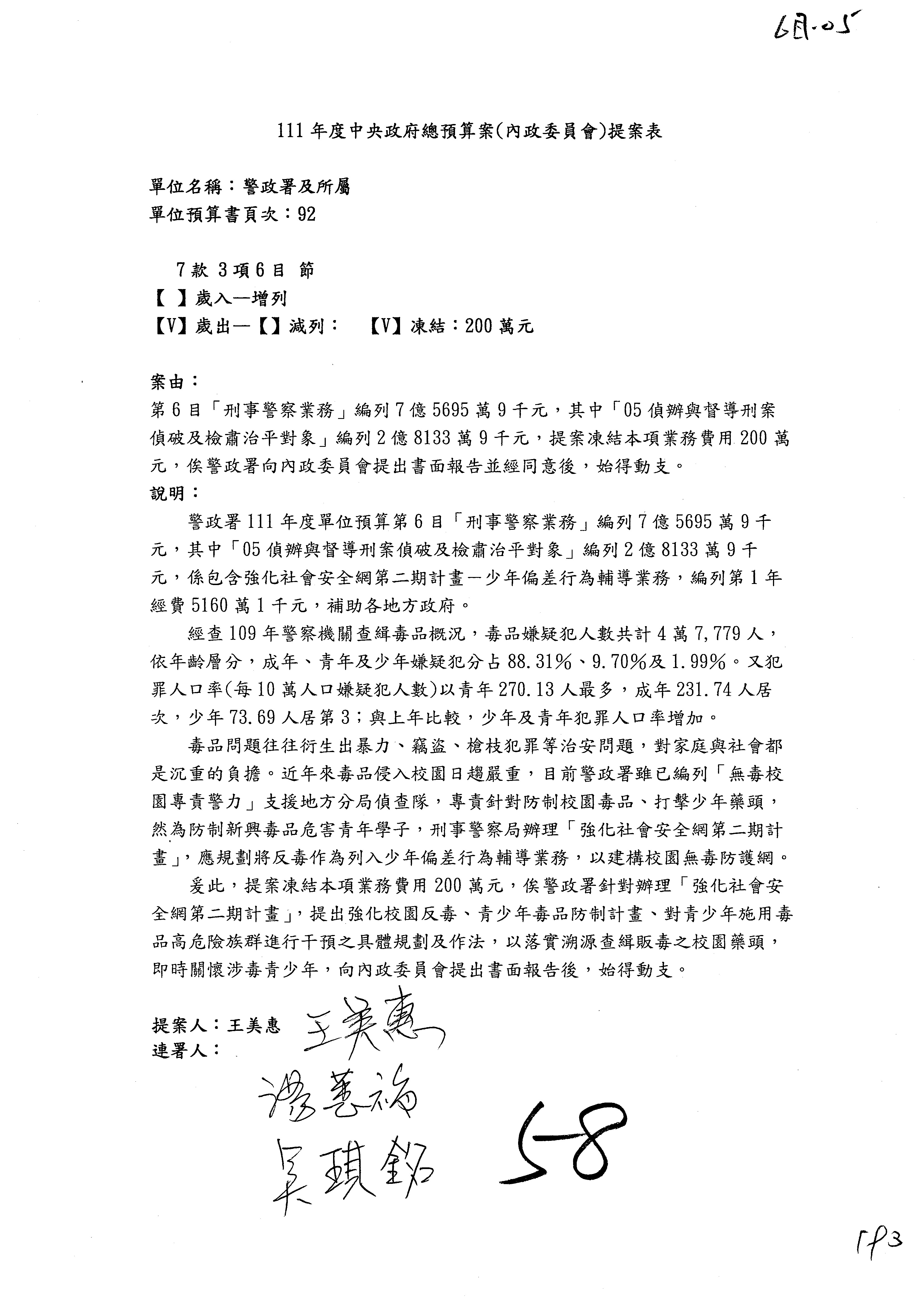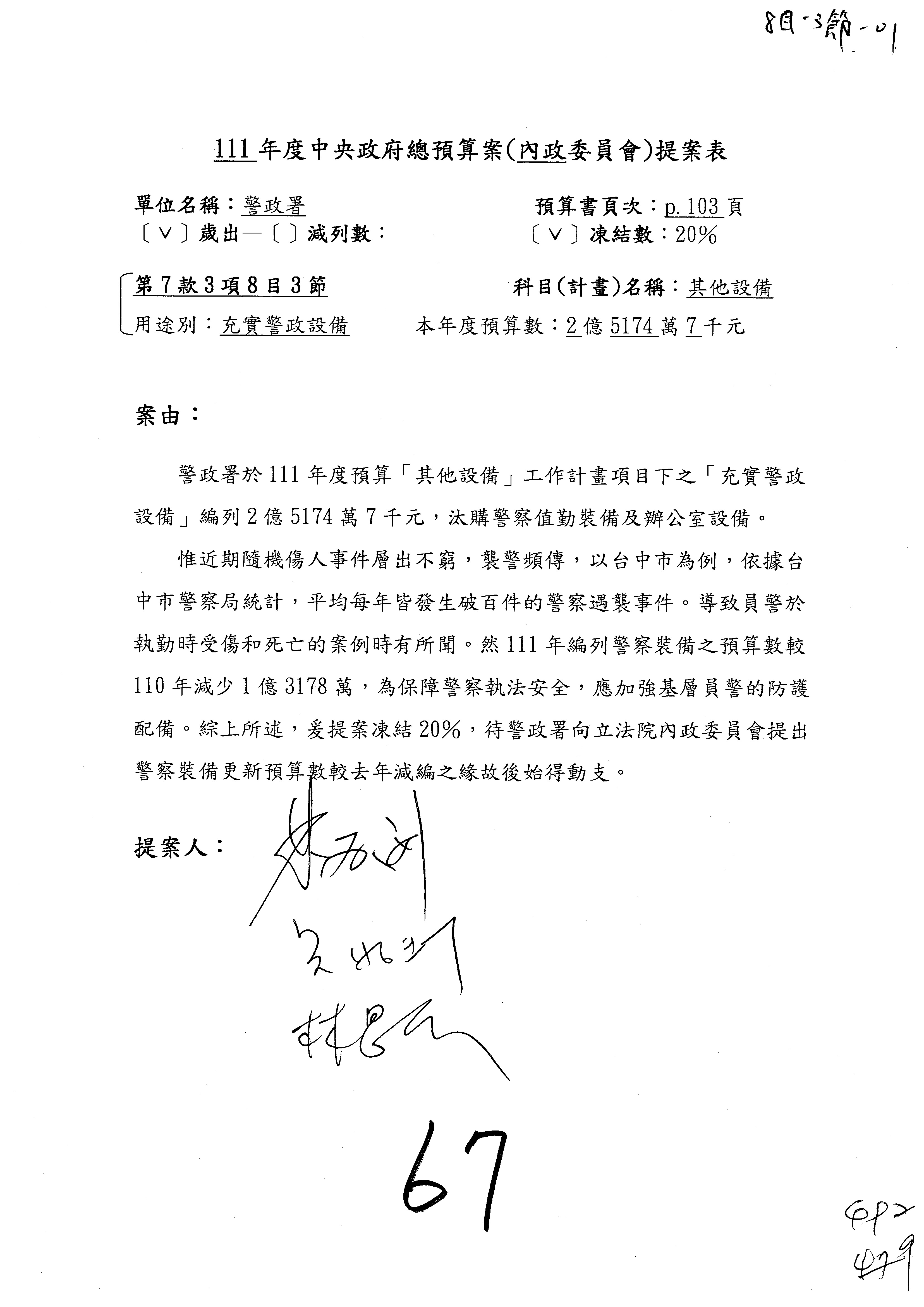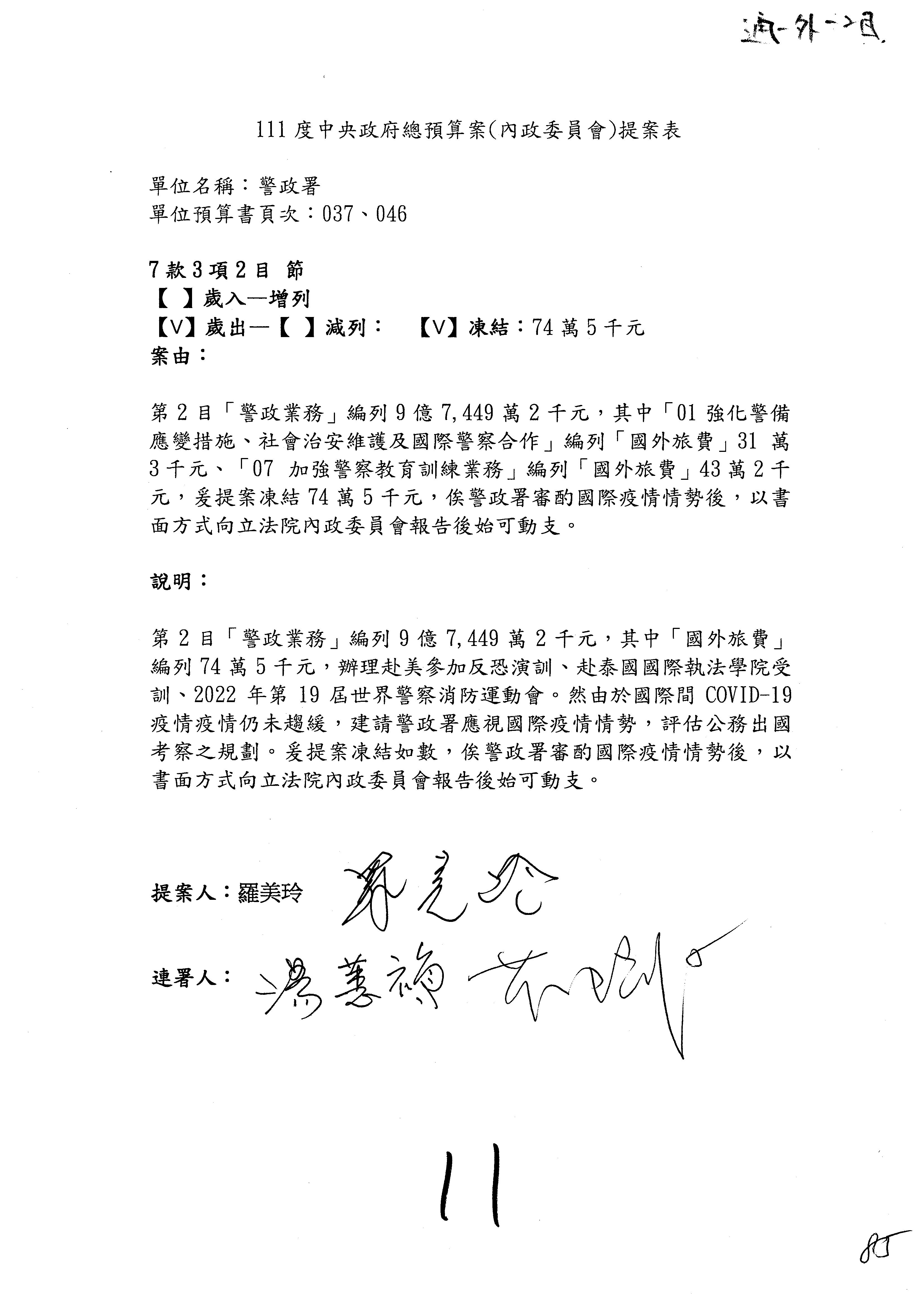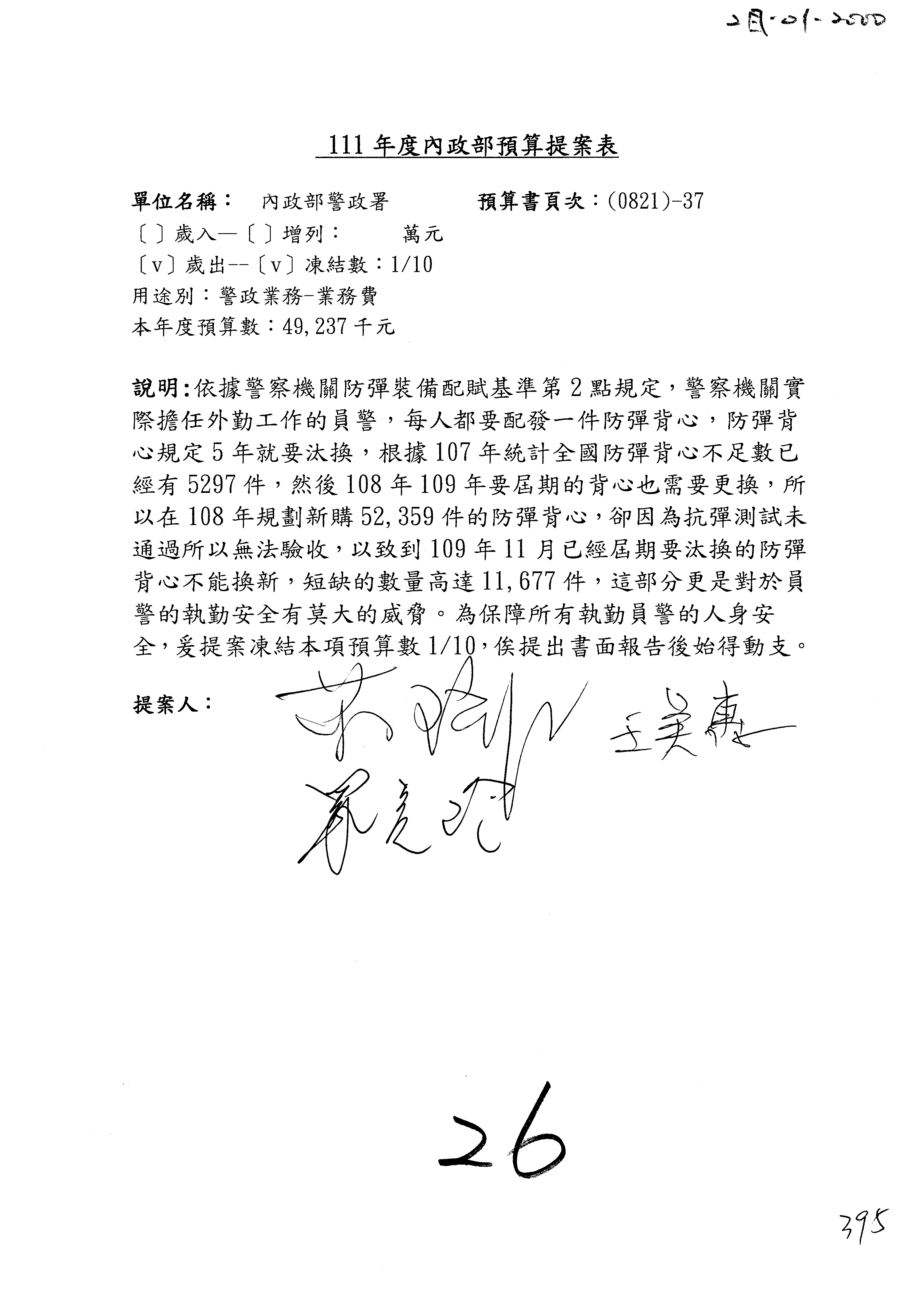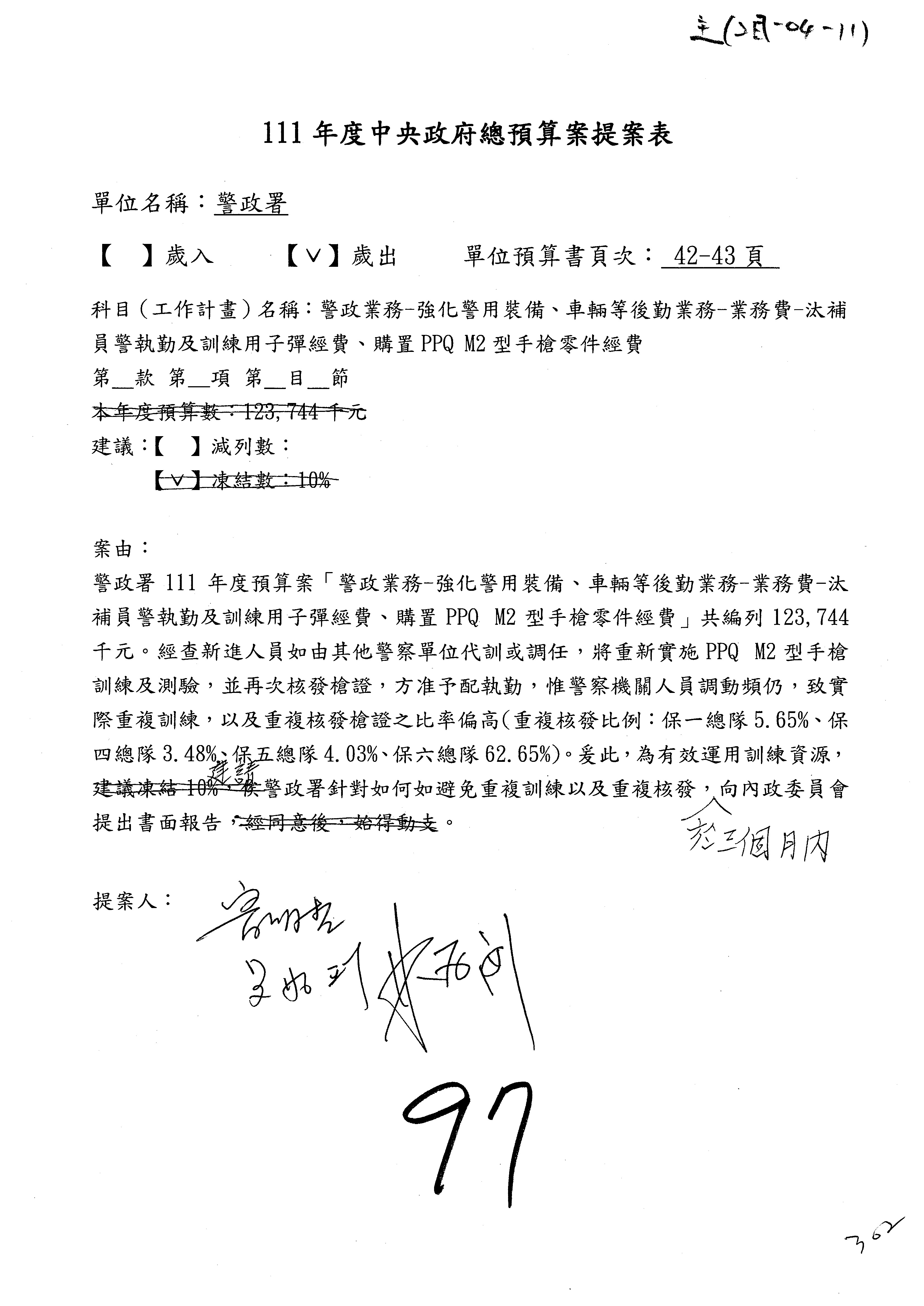 第26案是一樣的科目嗎?不一樣,這是在加強警備應變措施、社會治安維護及國際警察合作之業務費項下,凍結十分之一,OK嗎?要說明嗎?好,請說明。