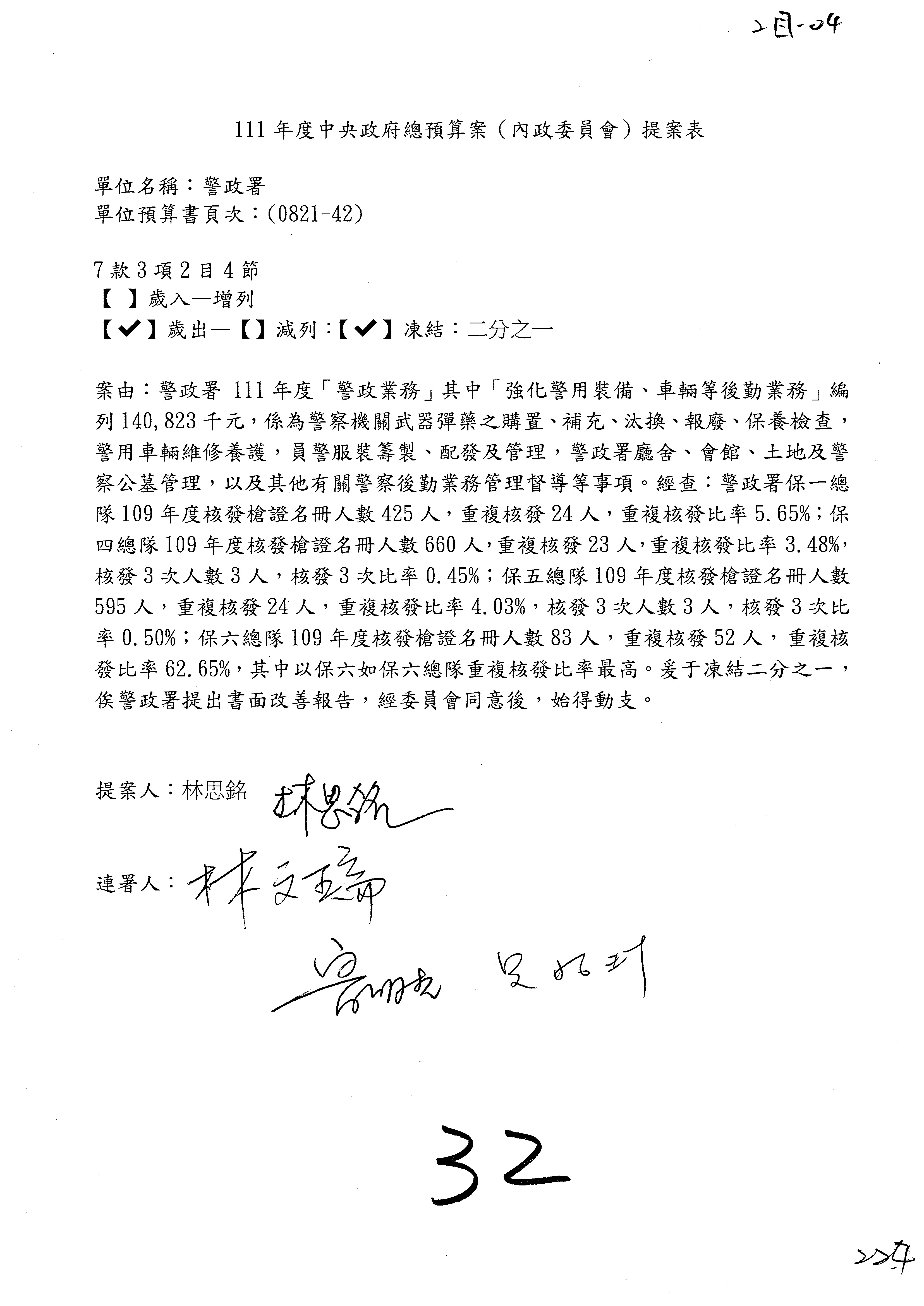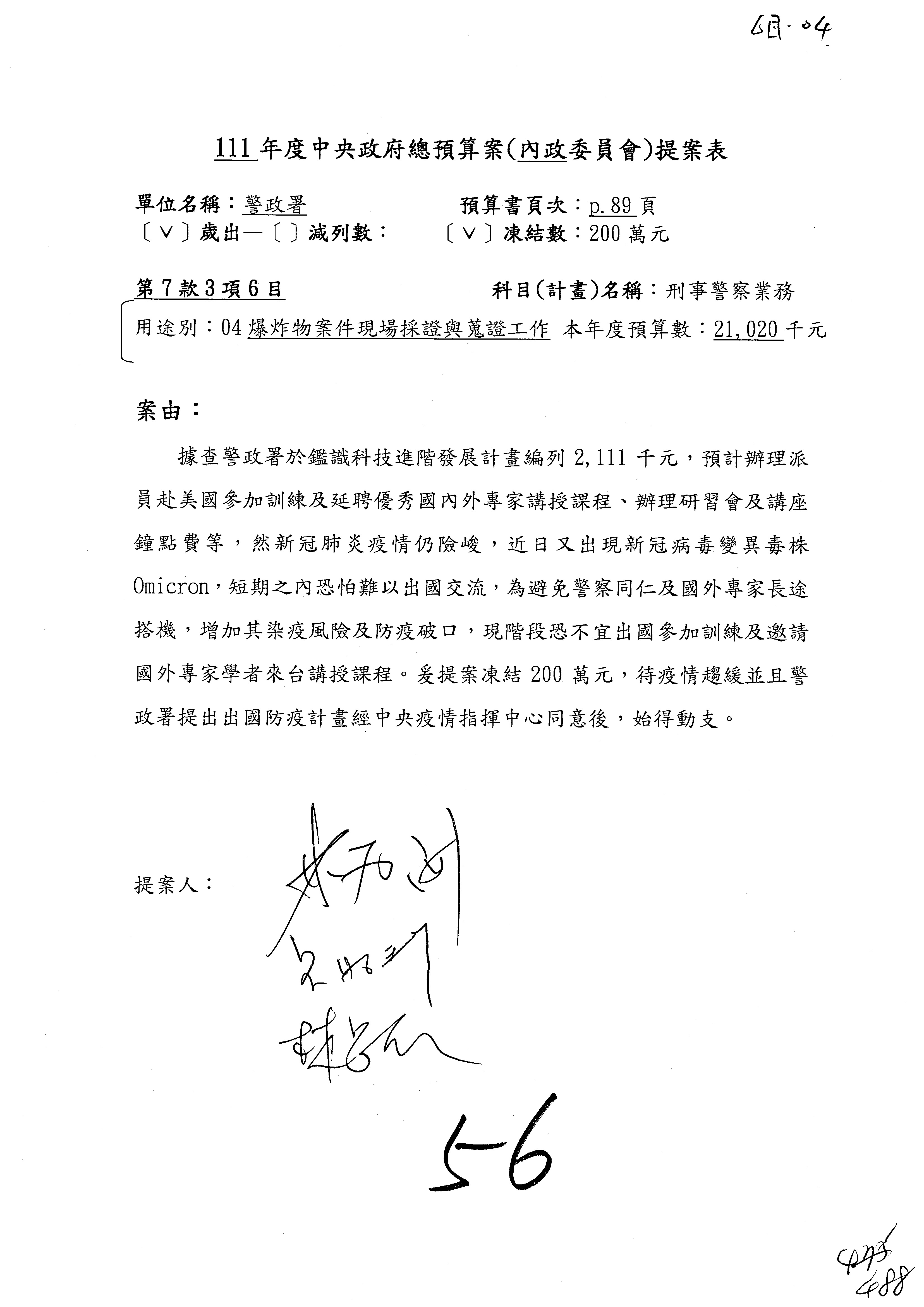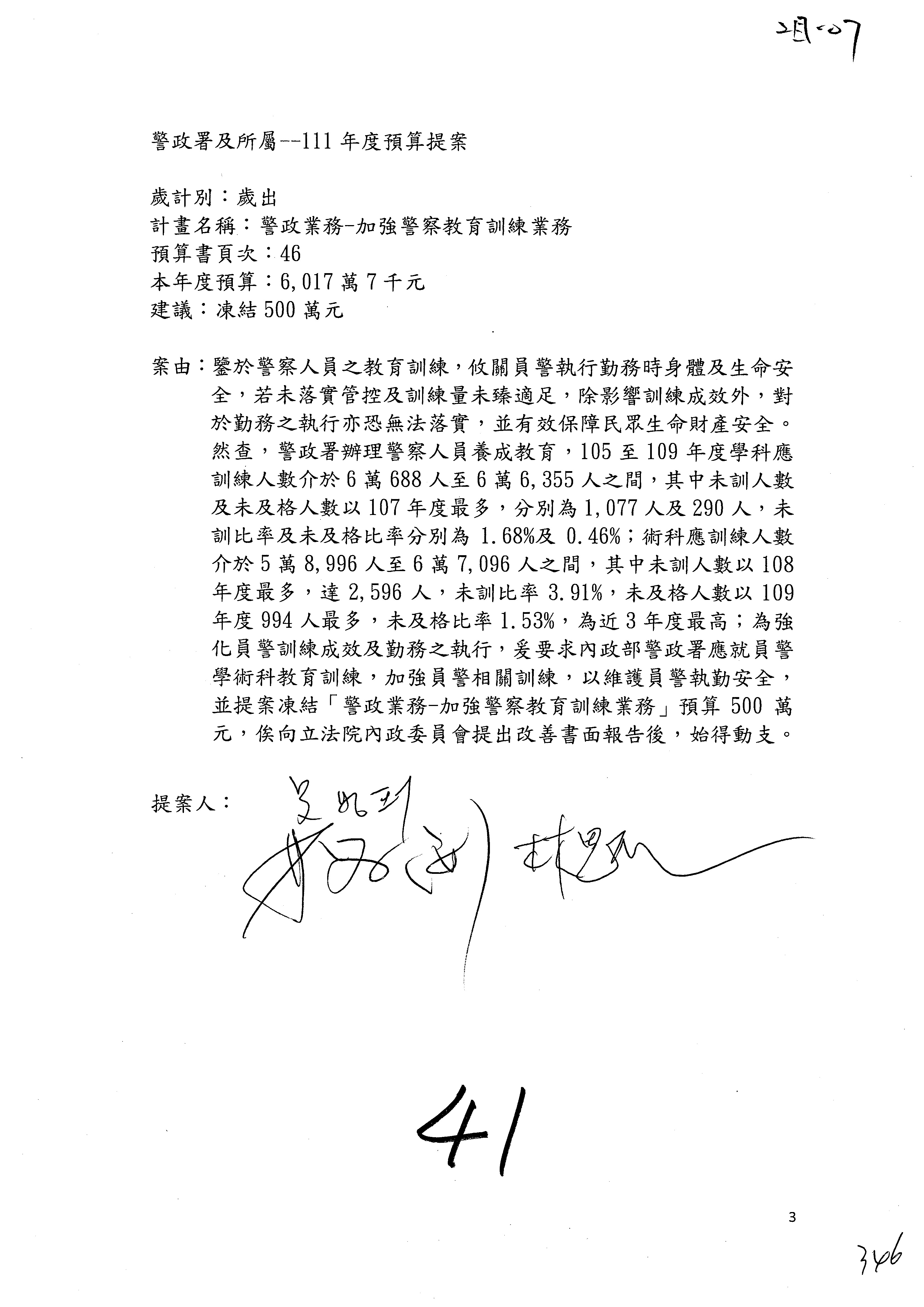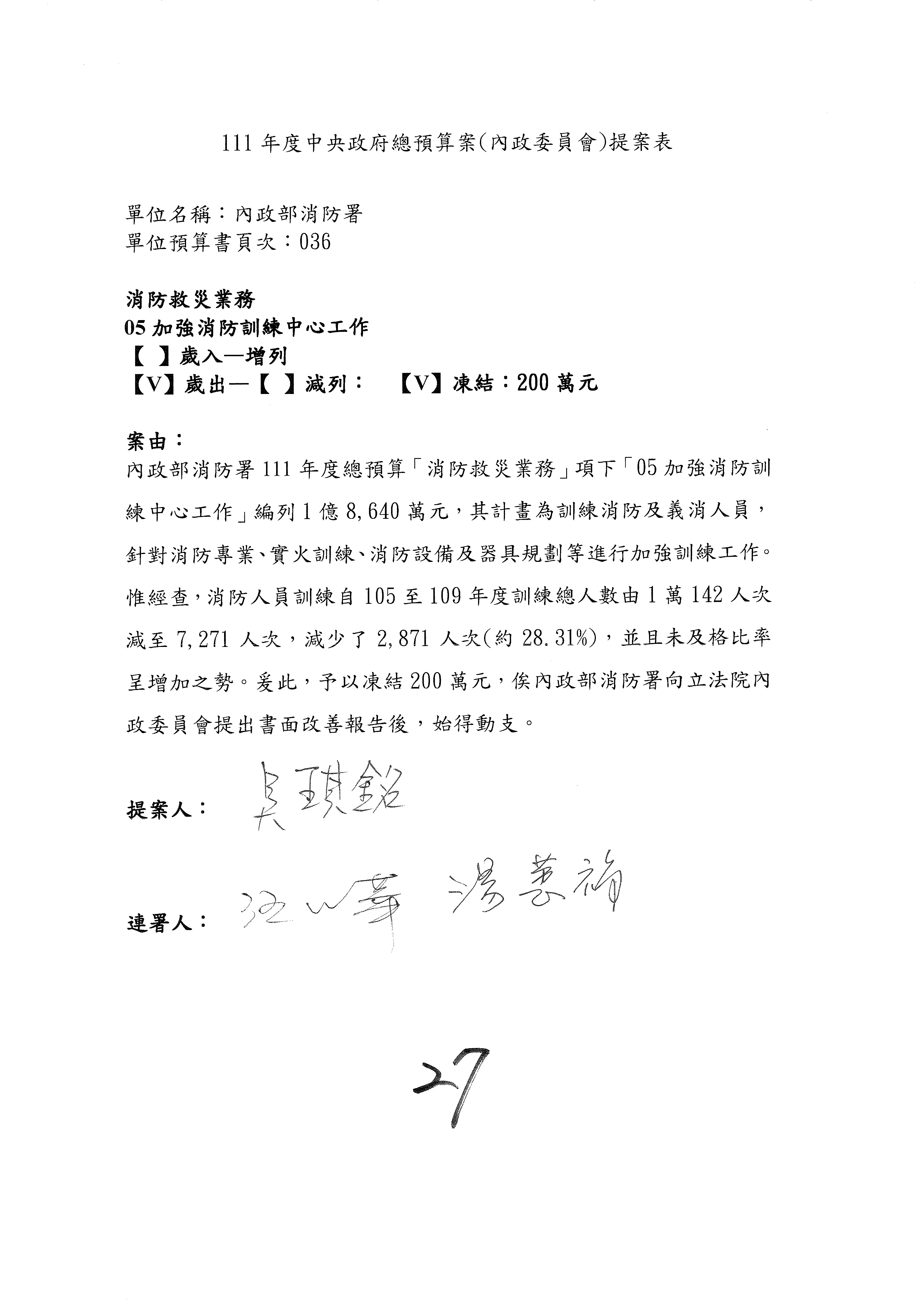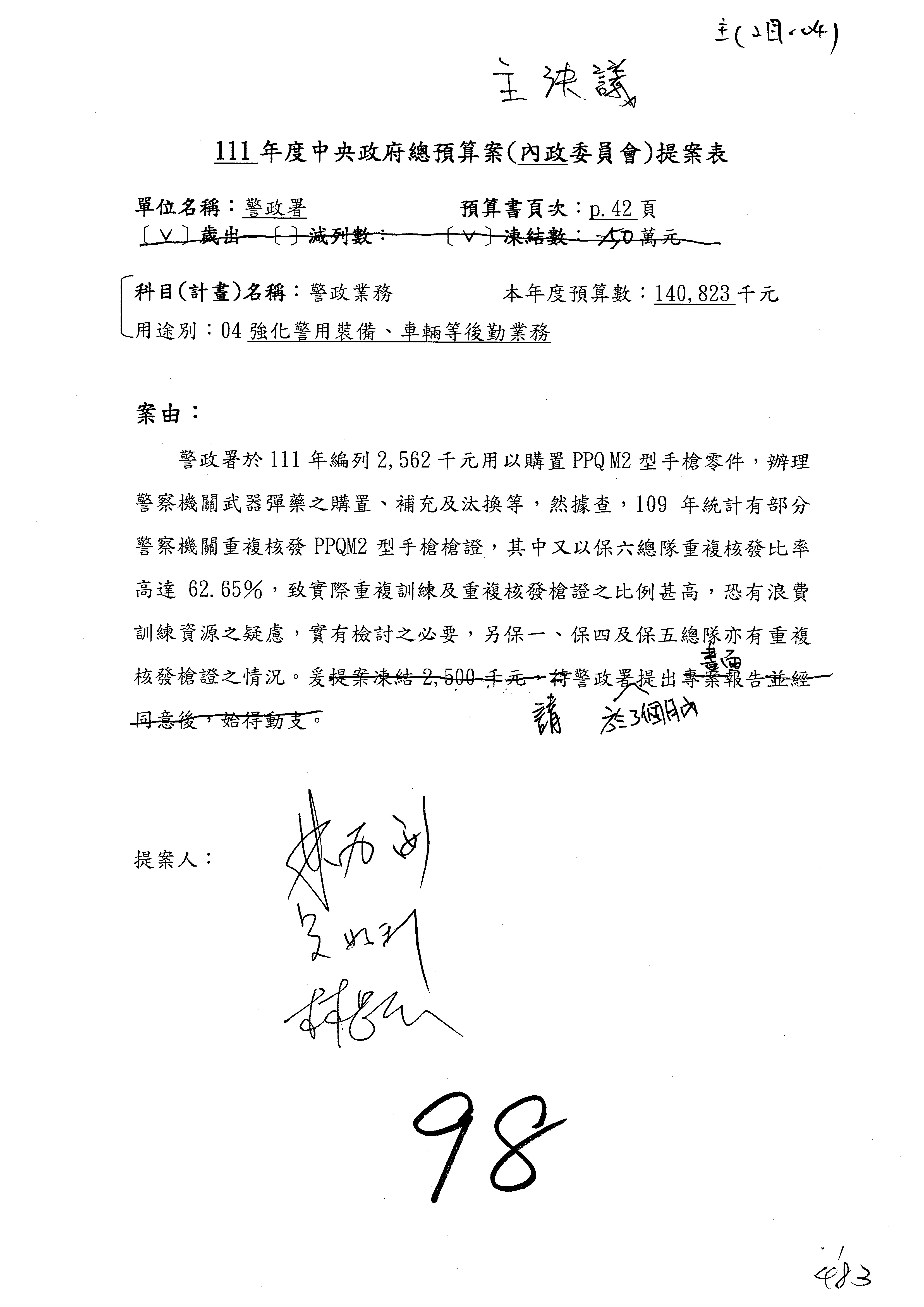 第26案是一樣的科目嗎?不一樣,這是在加強警備應變措施、社會治安維護及國際警察合作之業務費項下,凍結十分之一,OK嗎?要說明嗎?好,請說明。