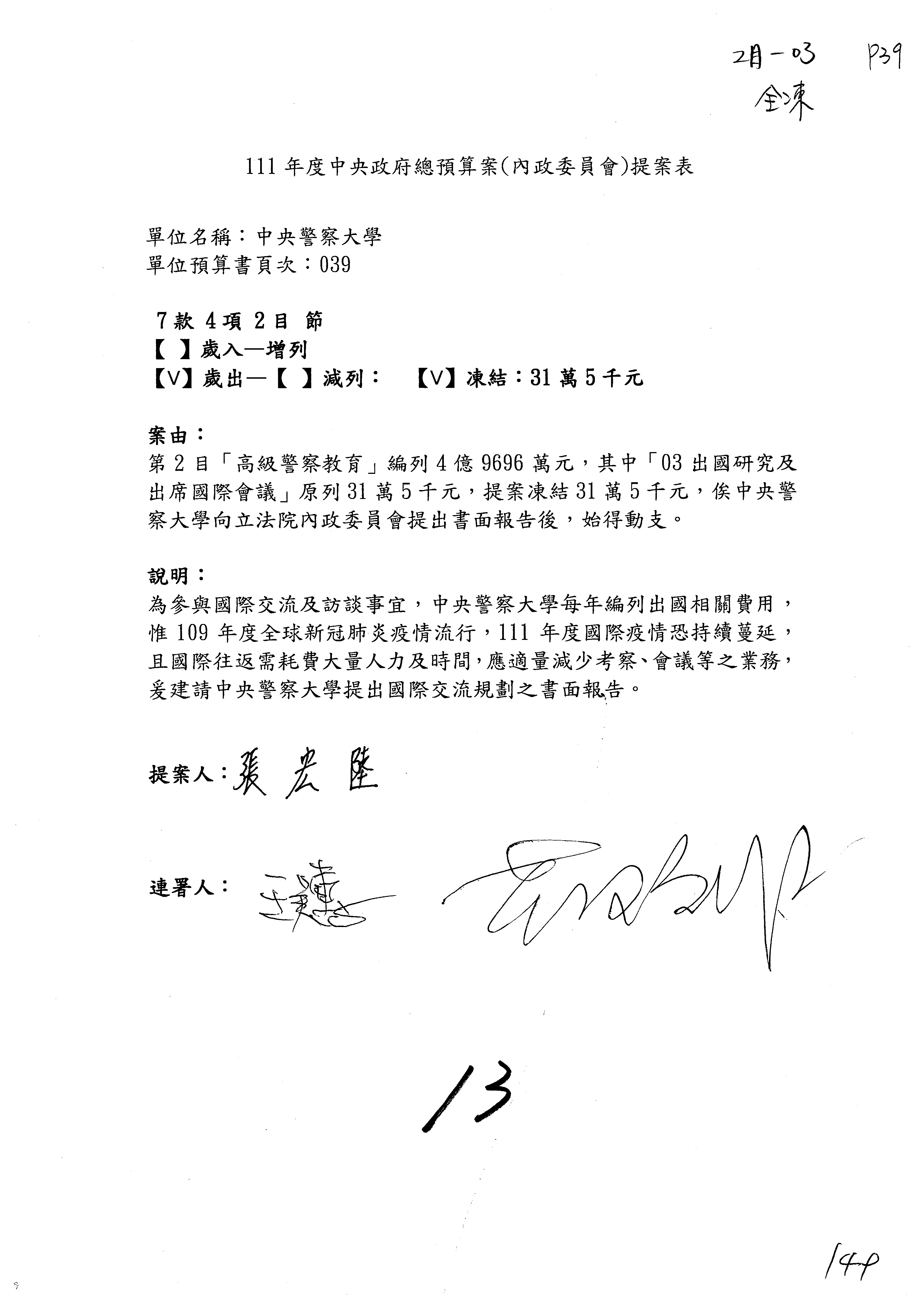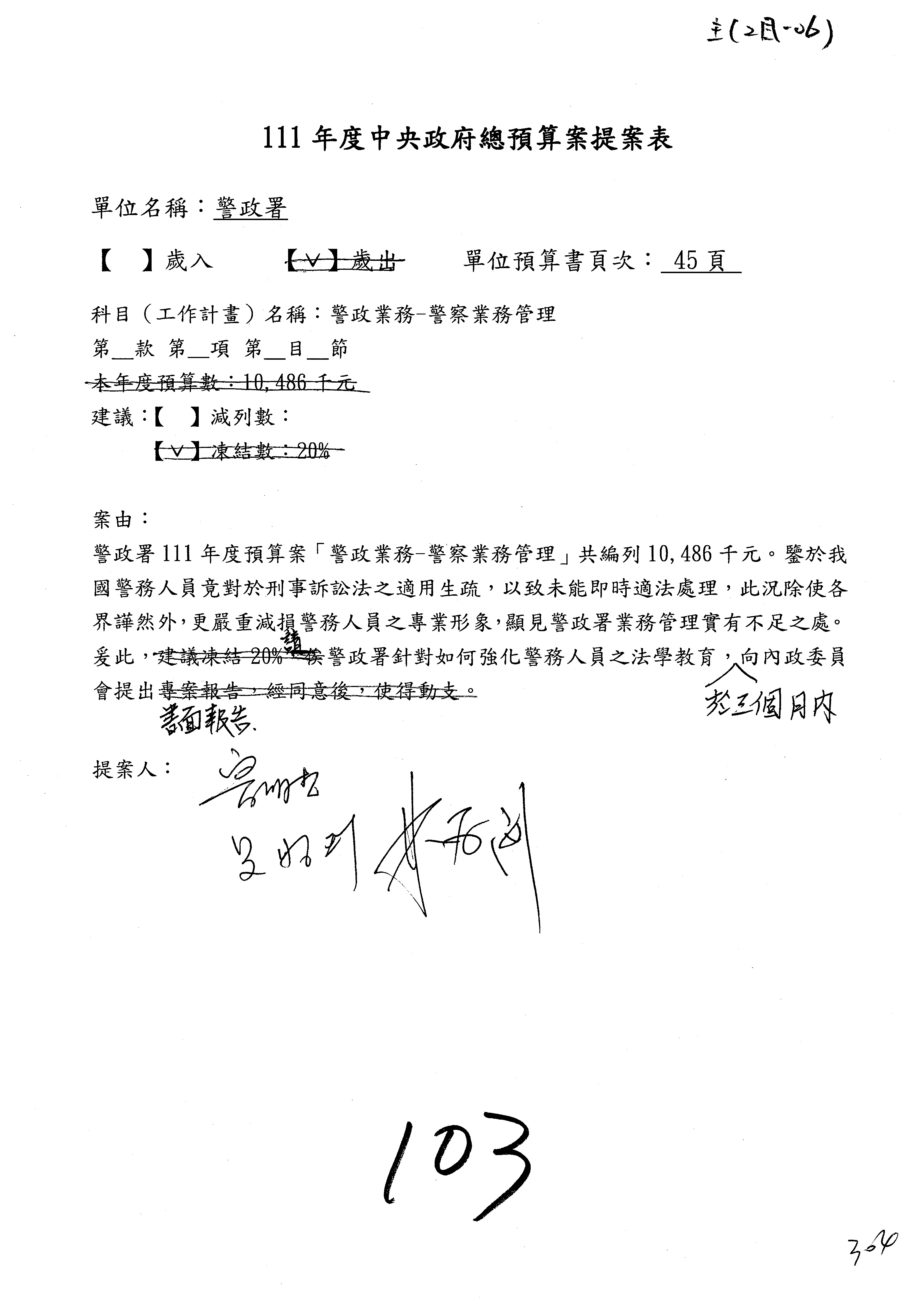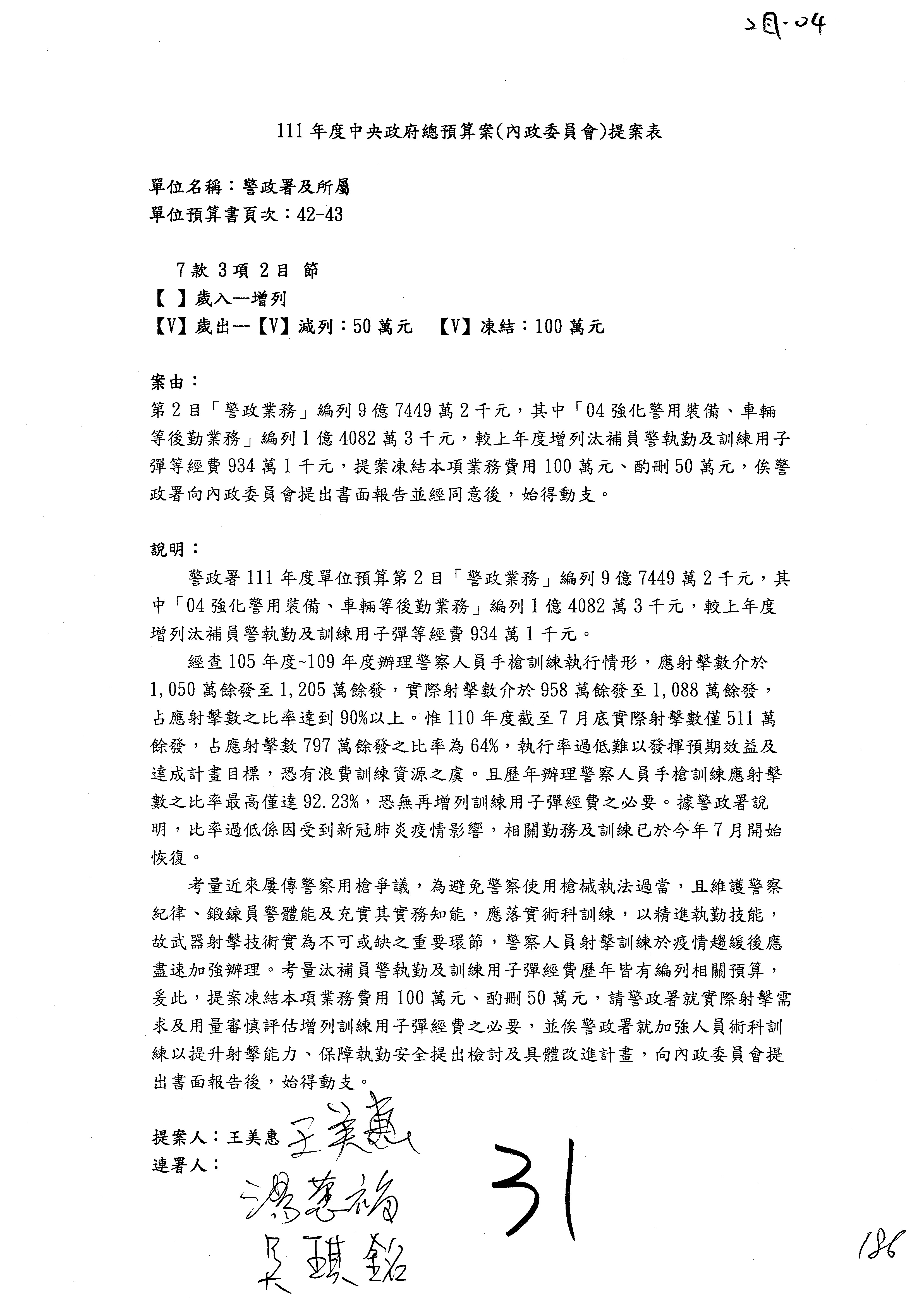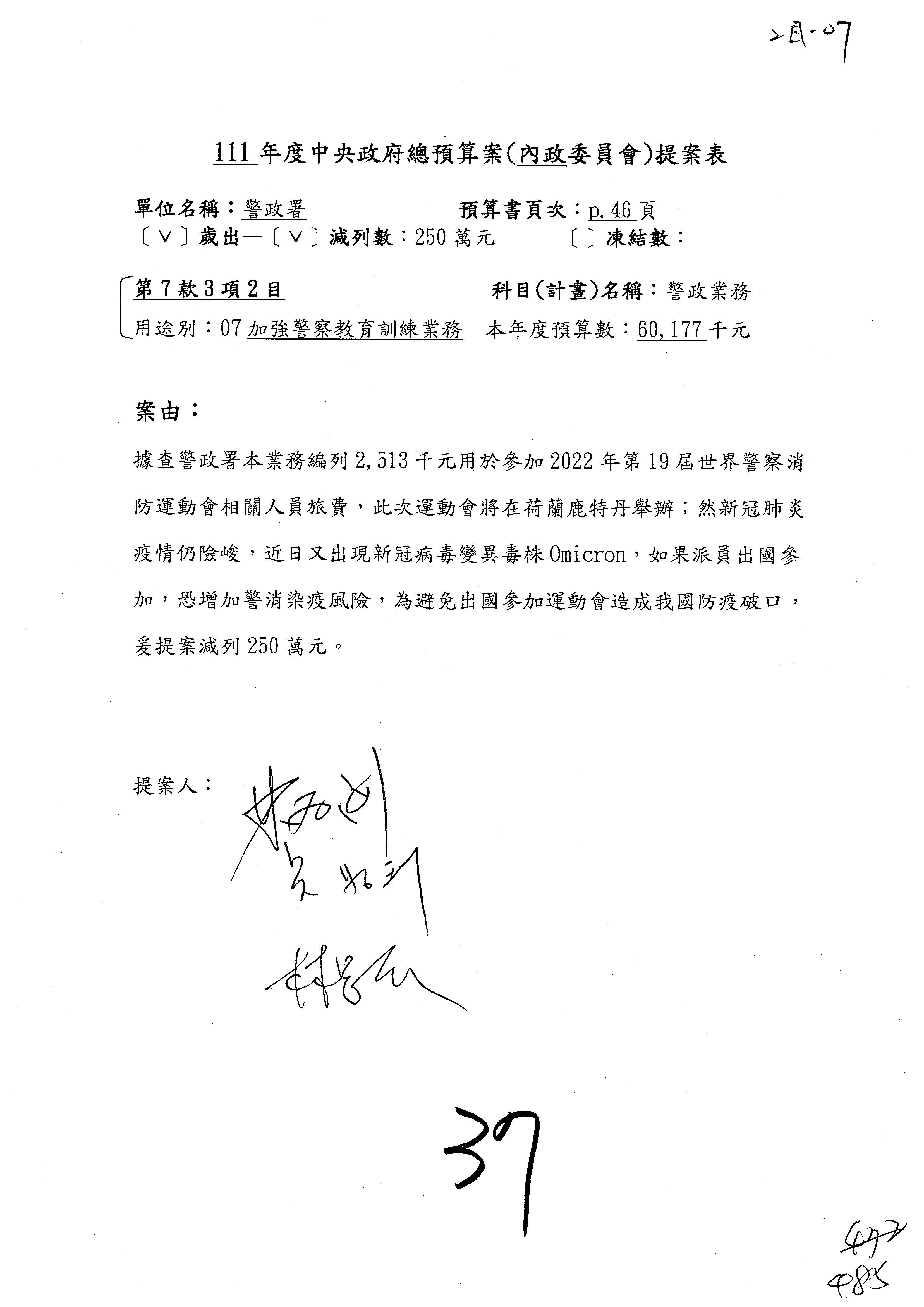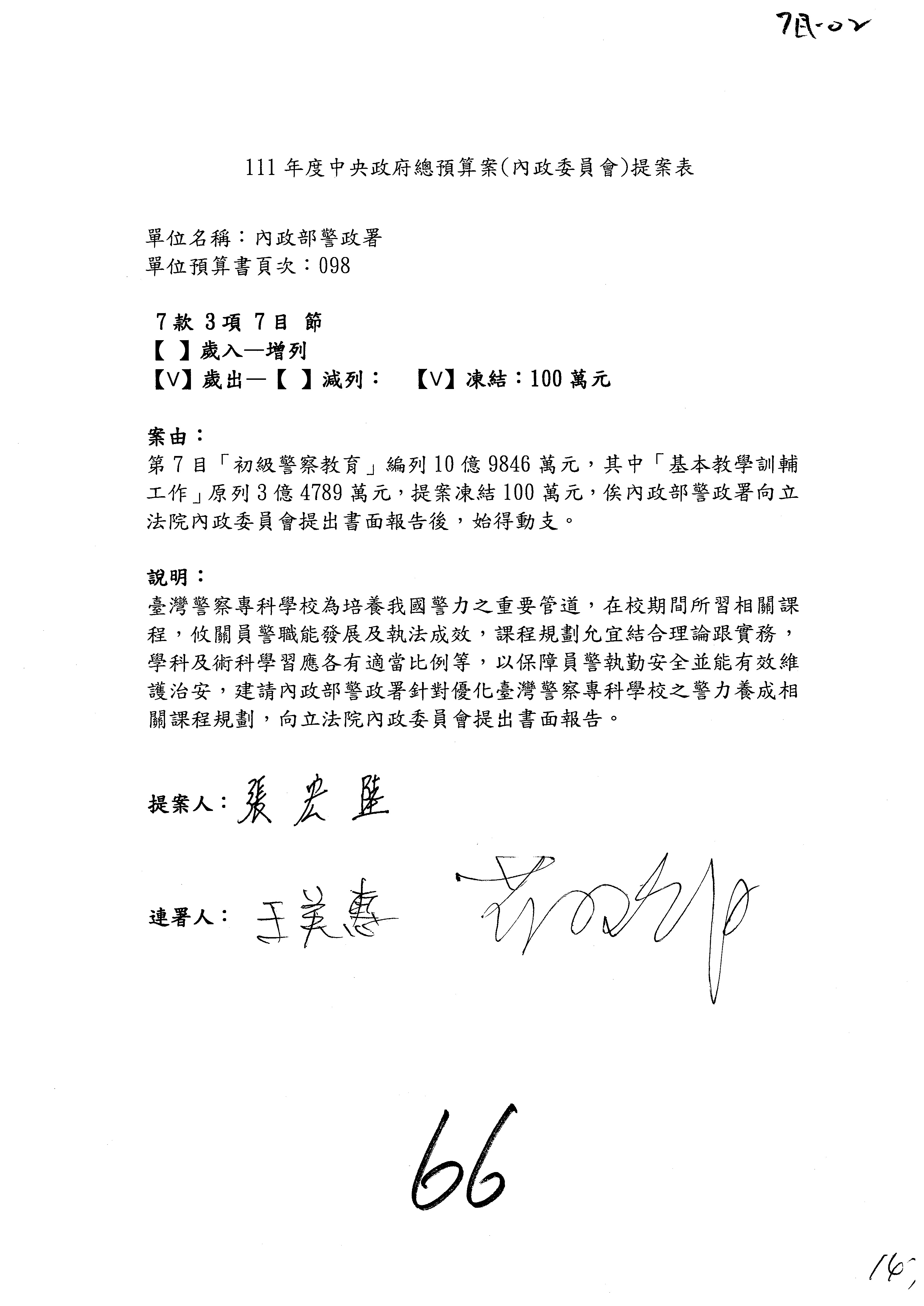第26案是一樣的科目嗎?不一樣,這是在加強警備應變措施、社會治安維護及國際警察合作之業務費項下,凍結十分之一,OK嗎?要說明嗎?好,請說明。