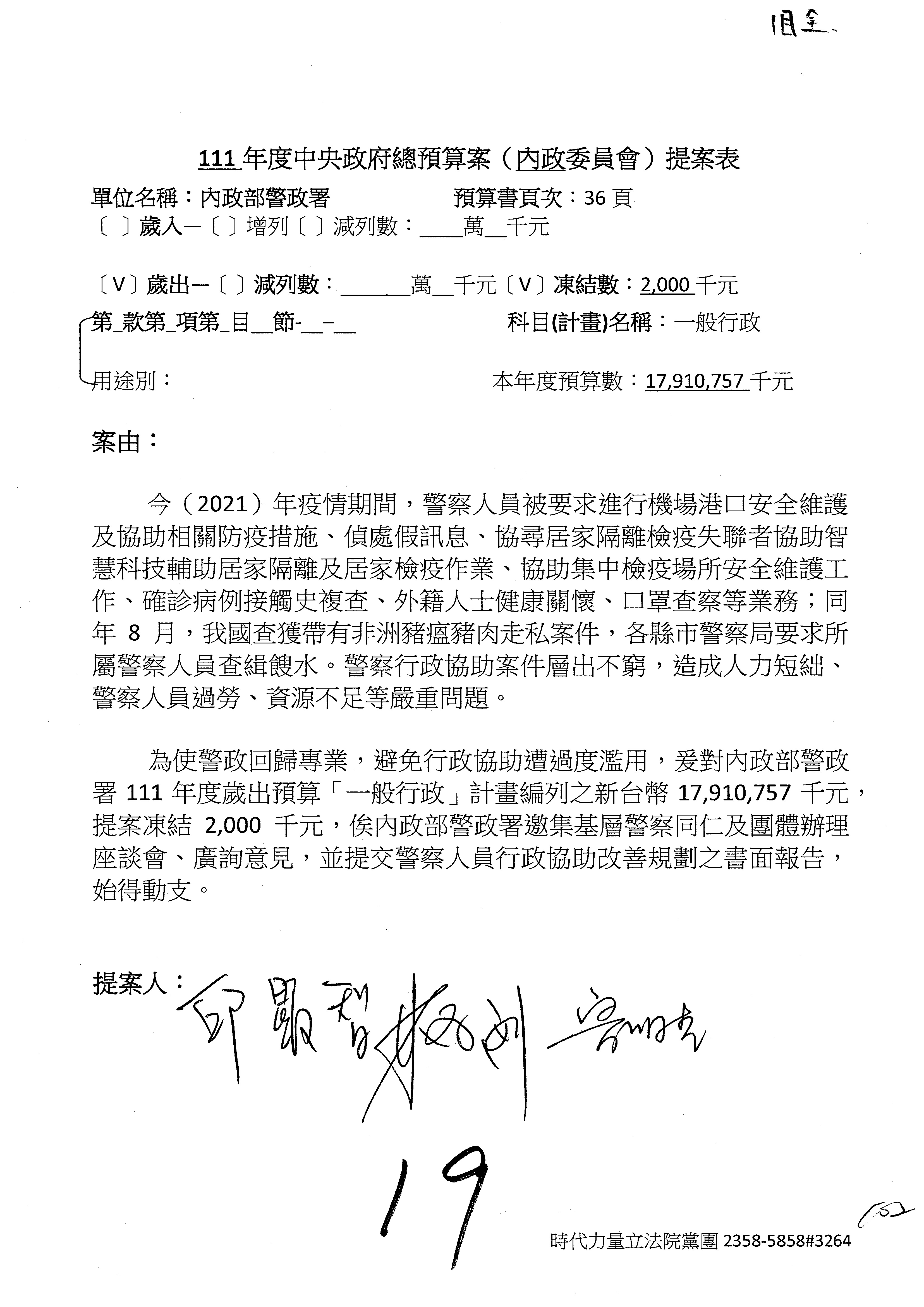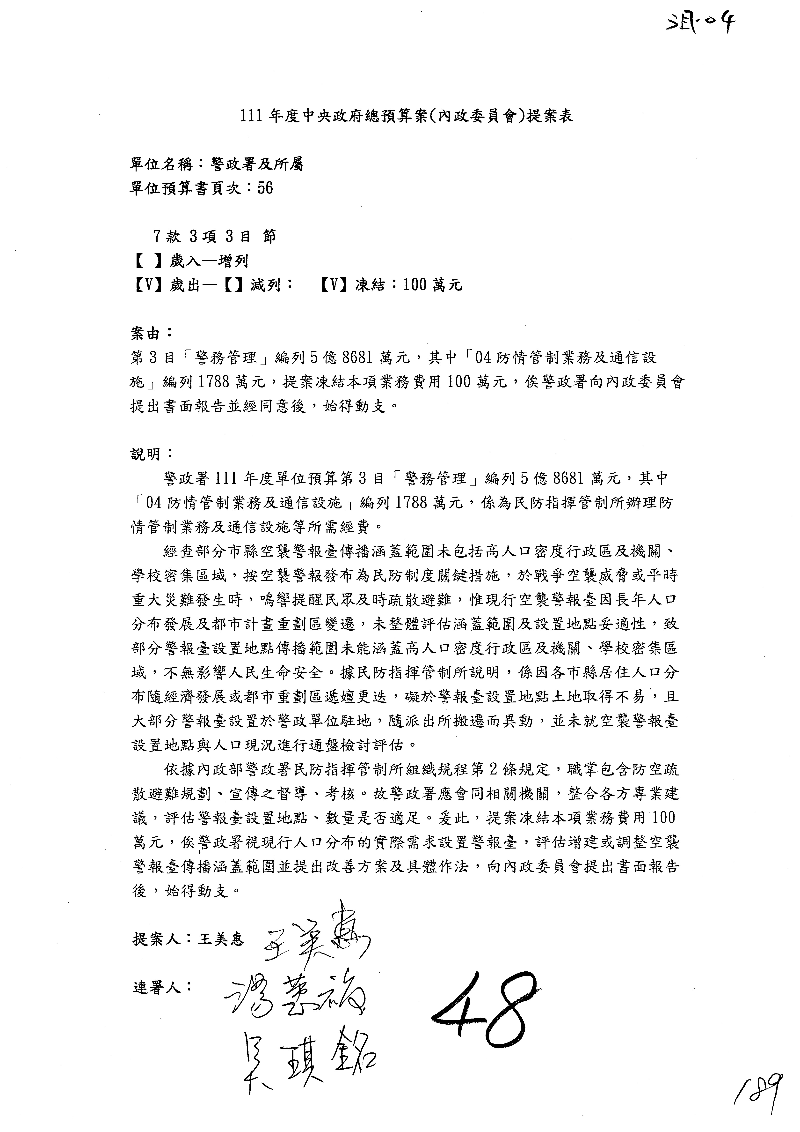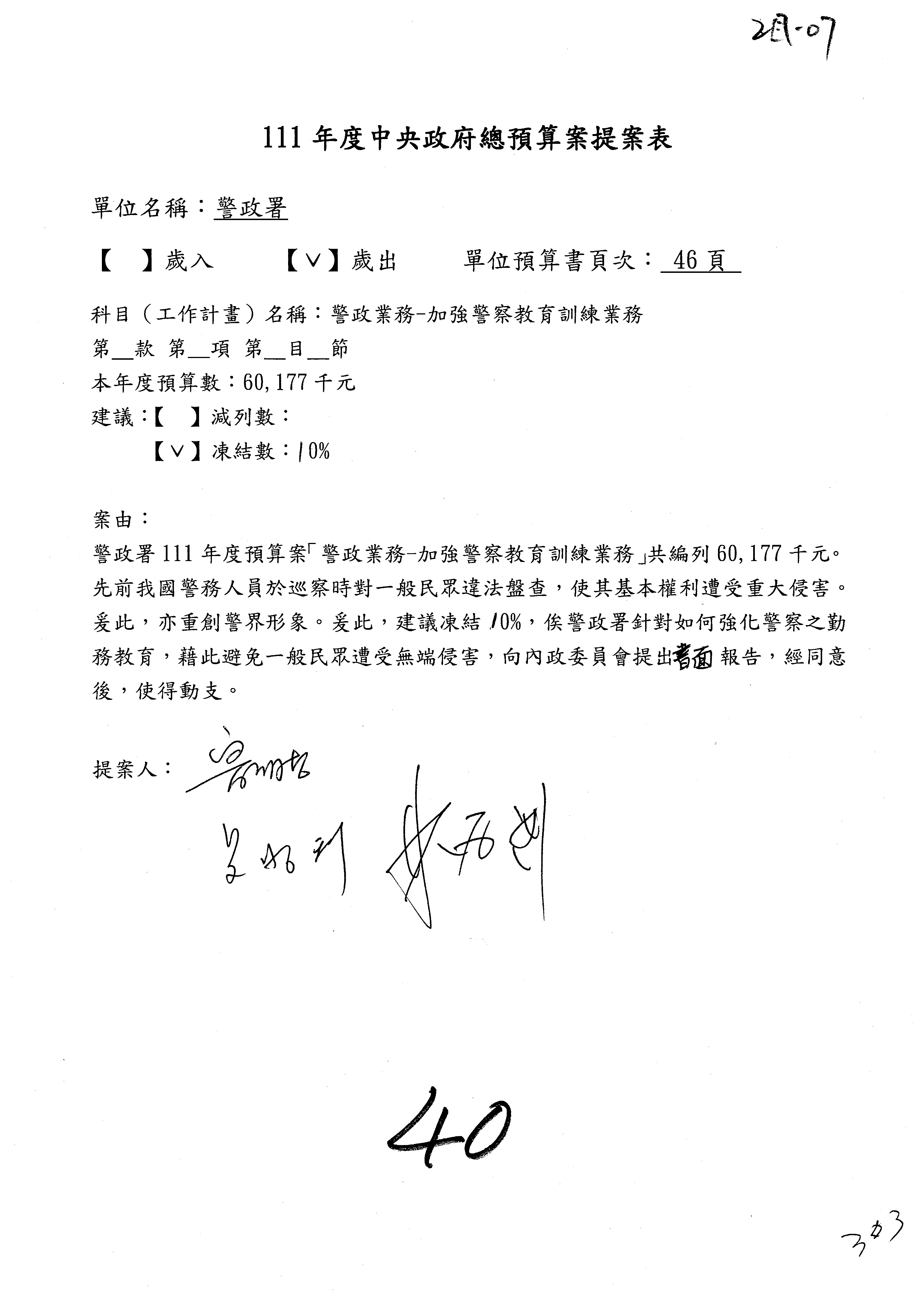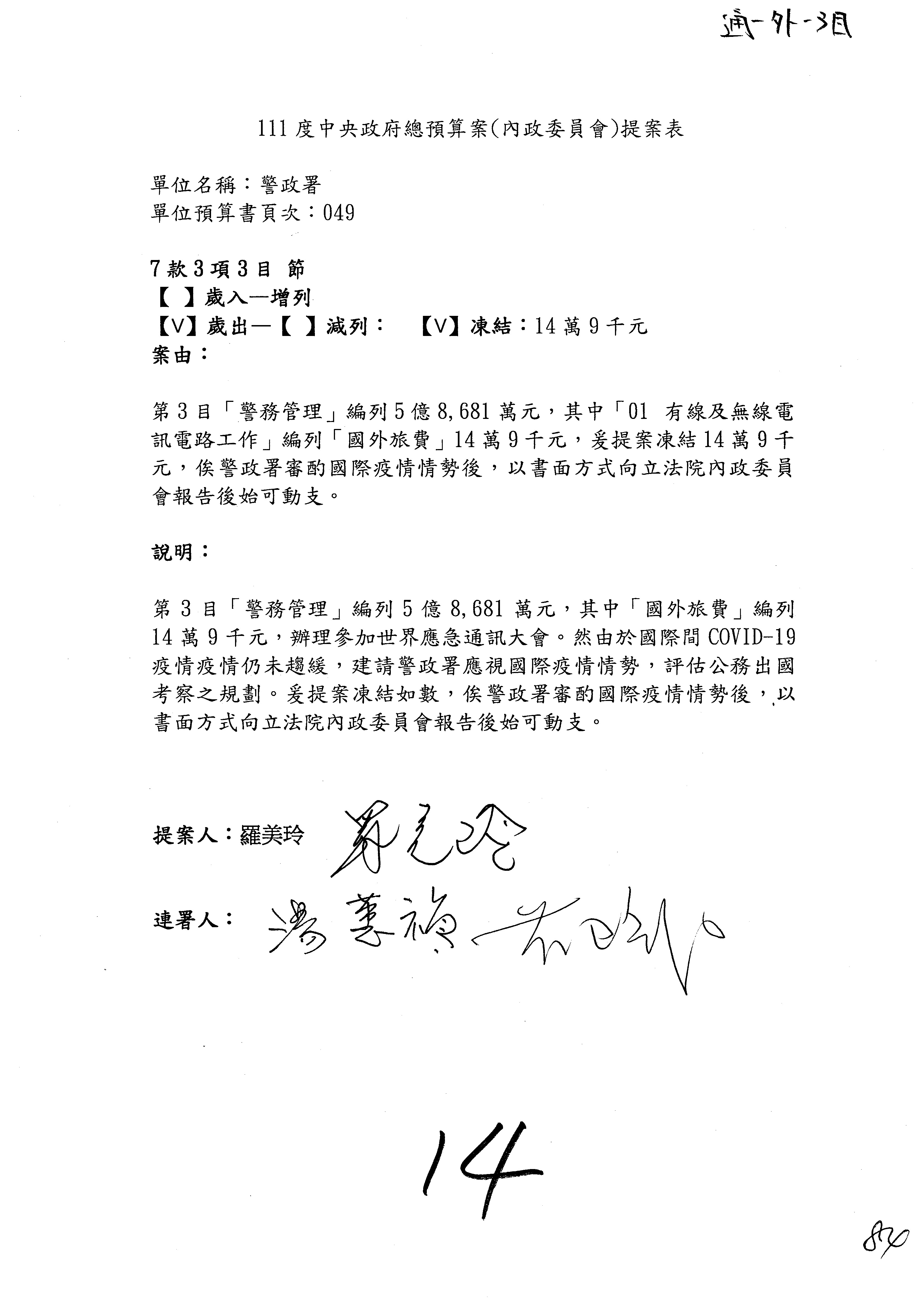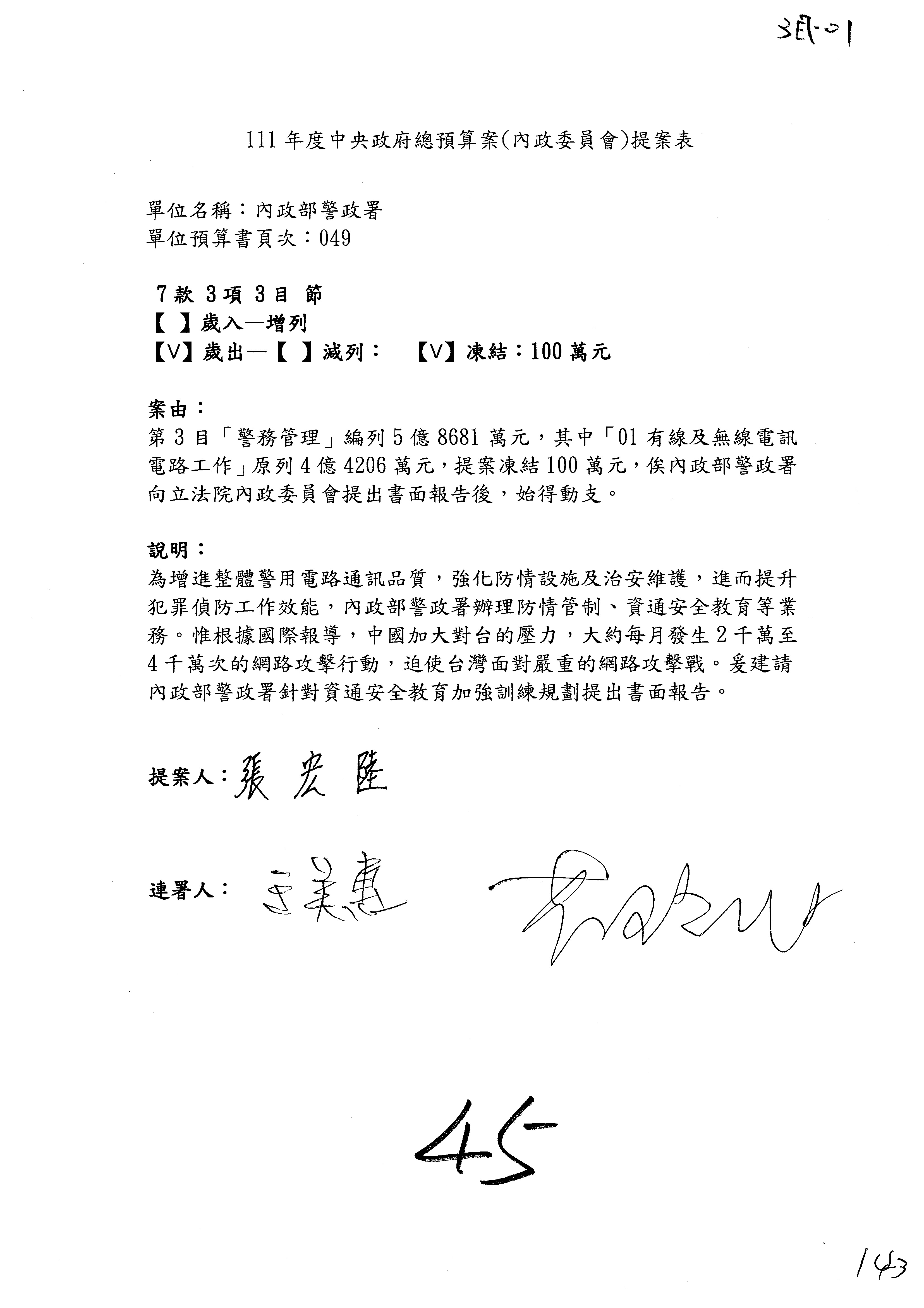 第26案是一樣的科目嗎?不一樣,這是在加強警備應變措施、社會治安維護及國際警察合作之業務費項下,凍結十分之一,OK嗎?要說明嗎?好,請說明。