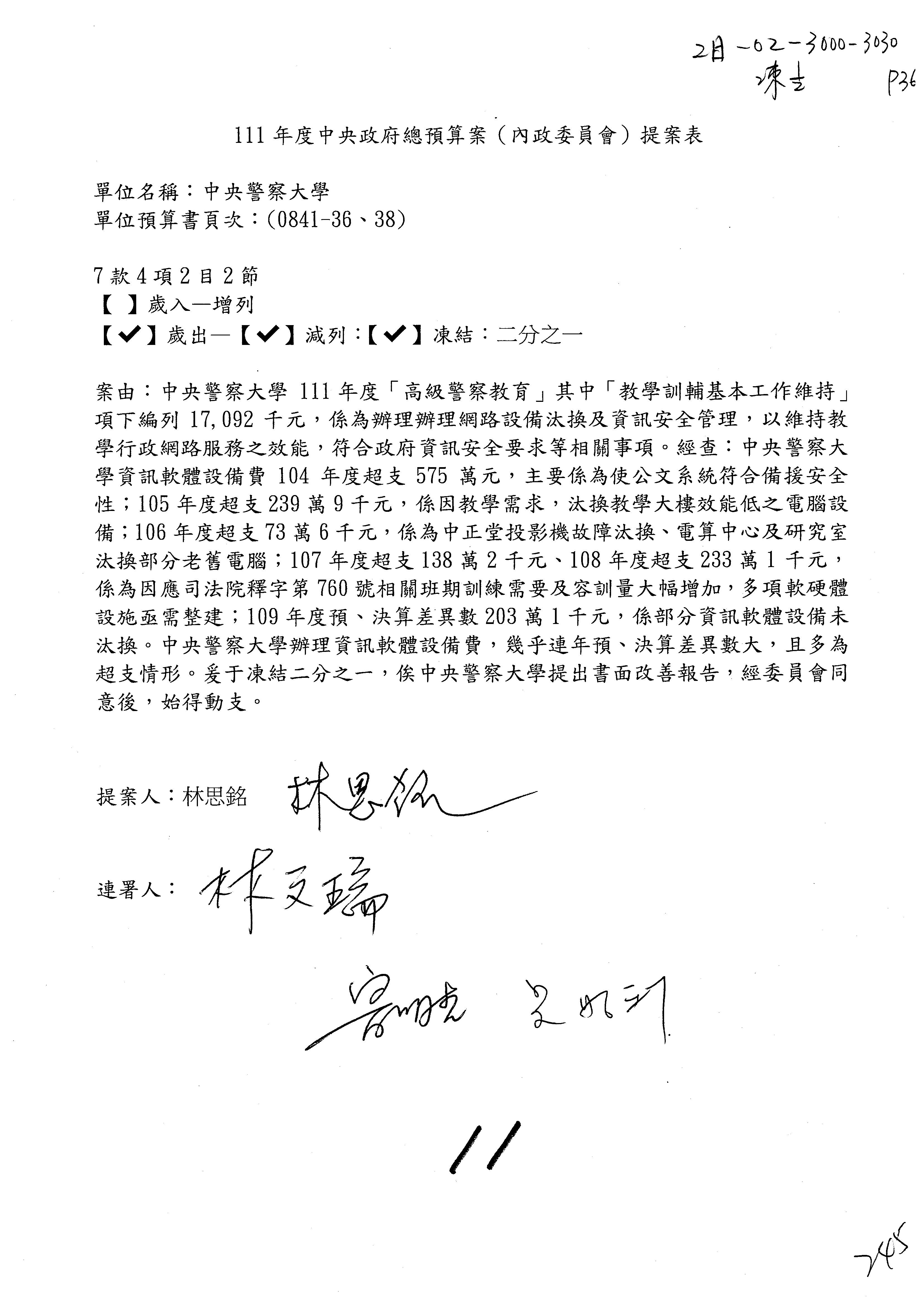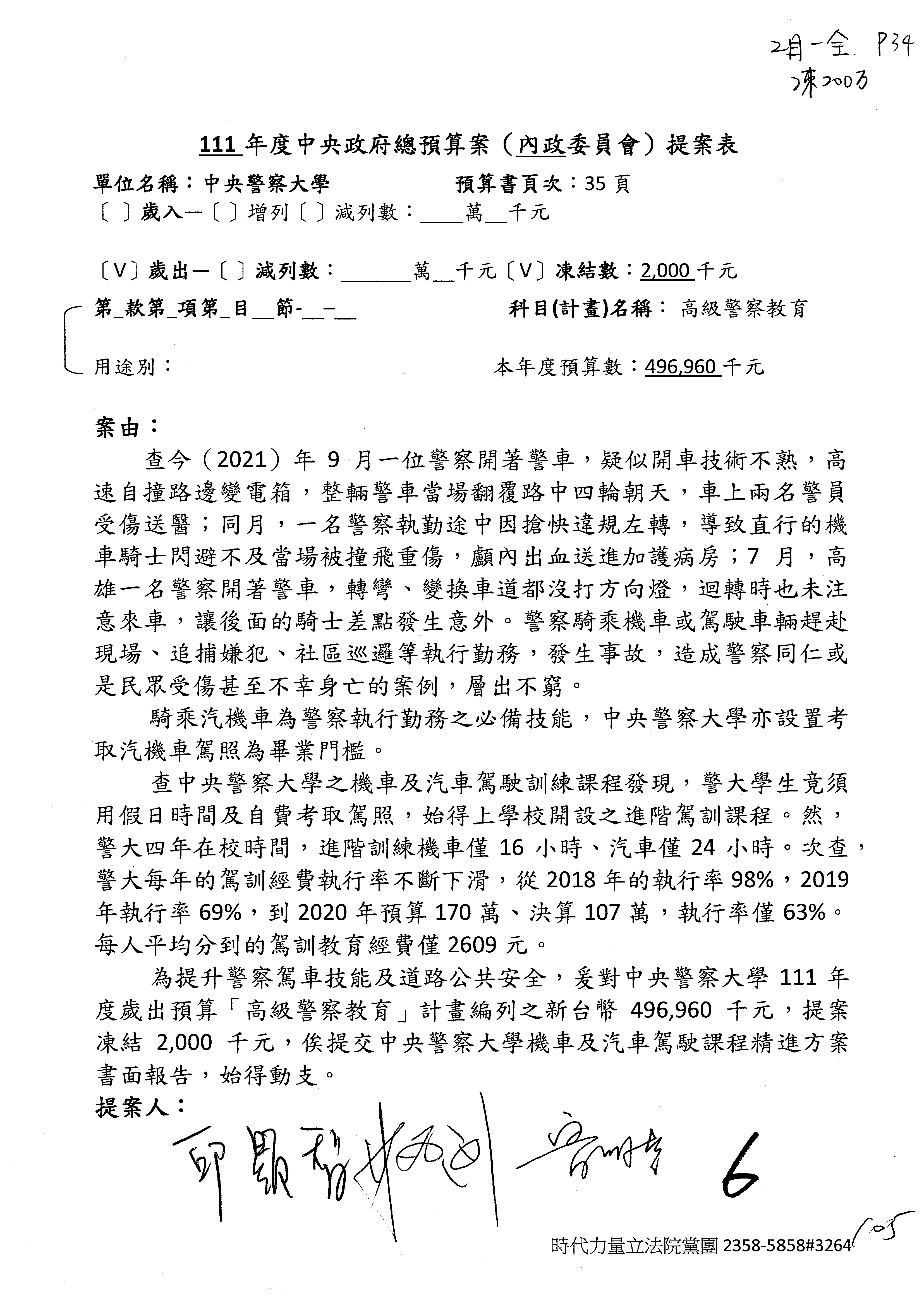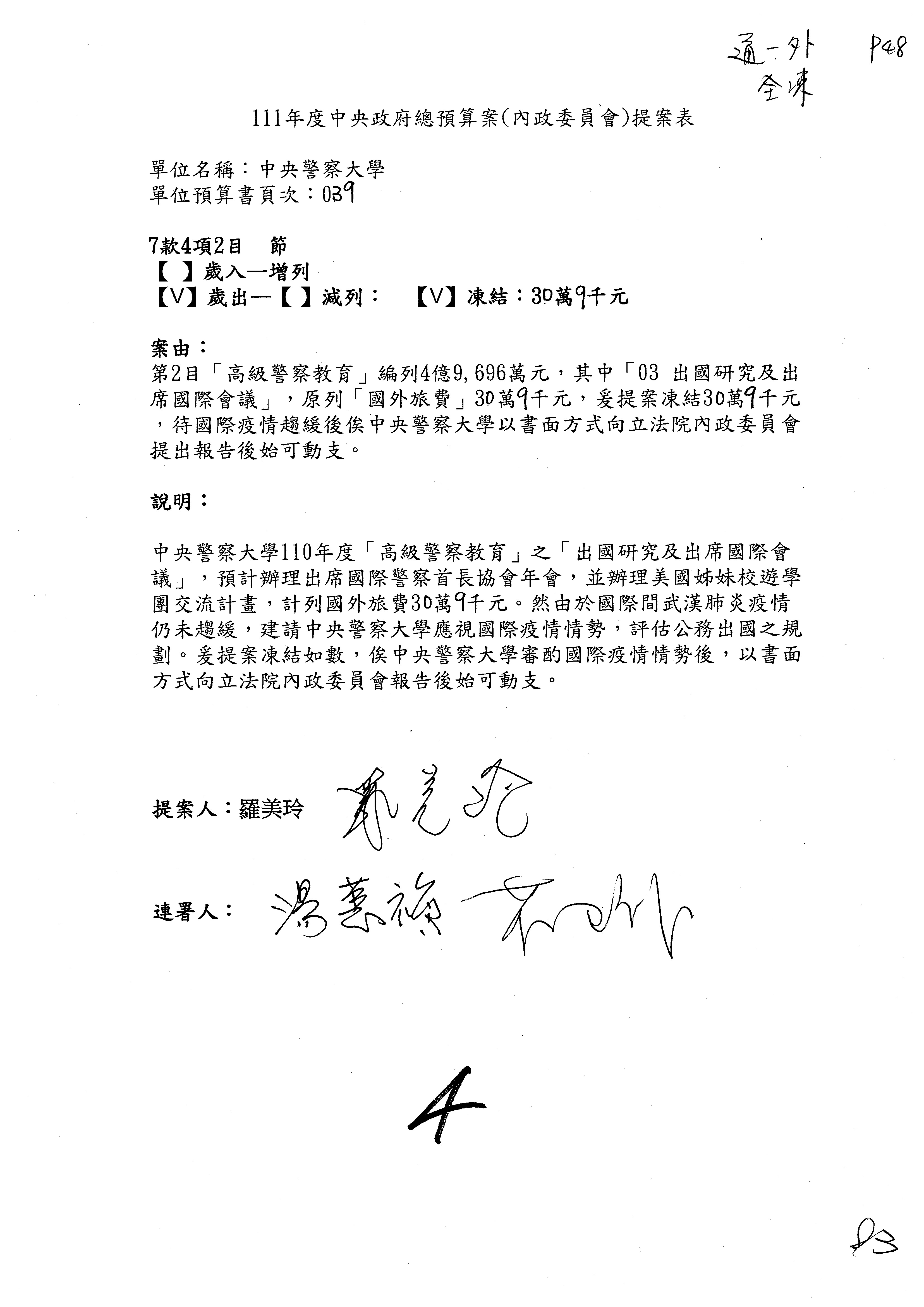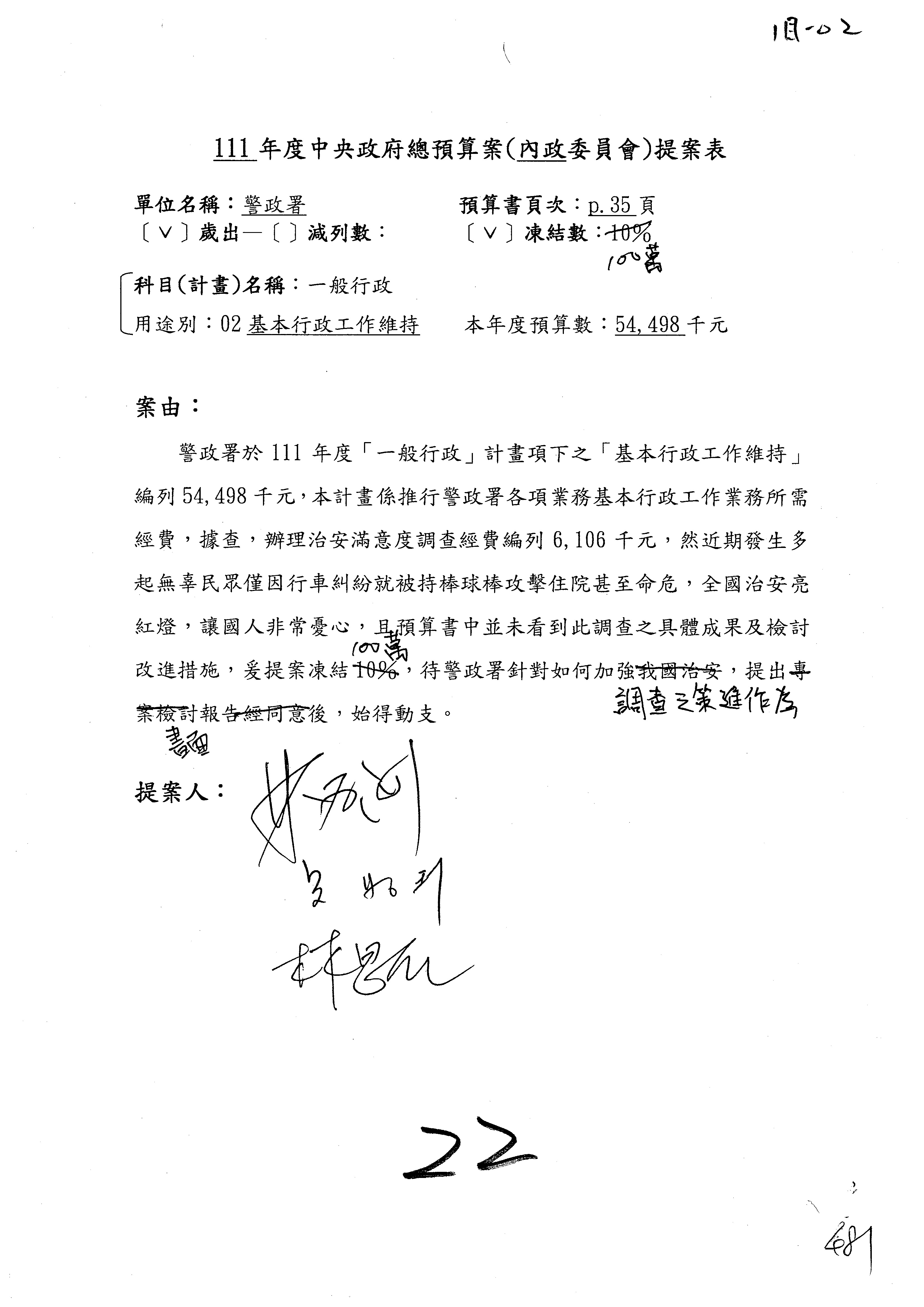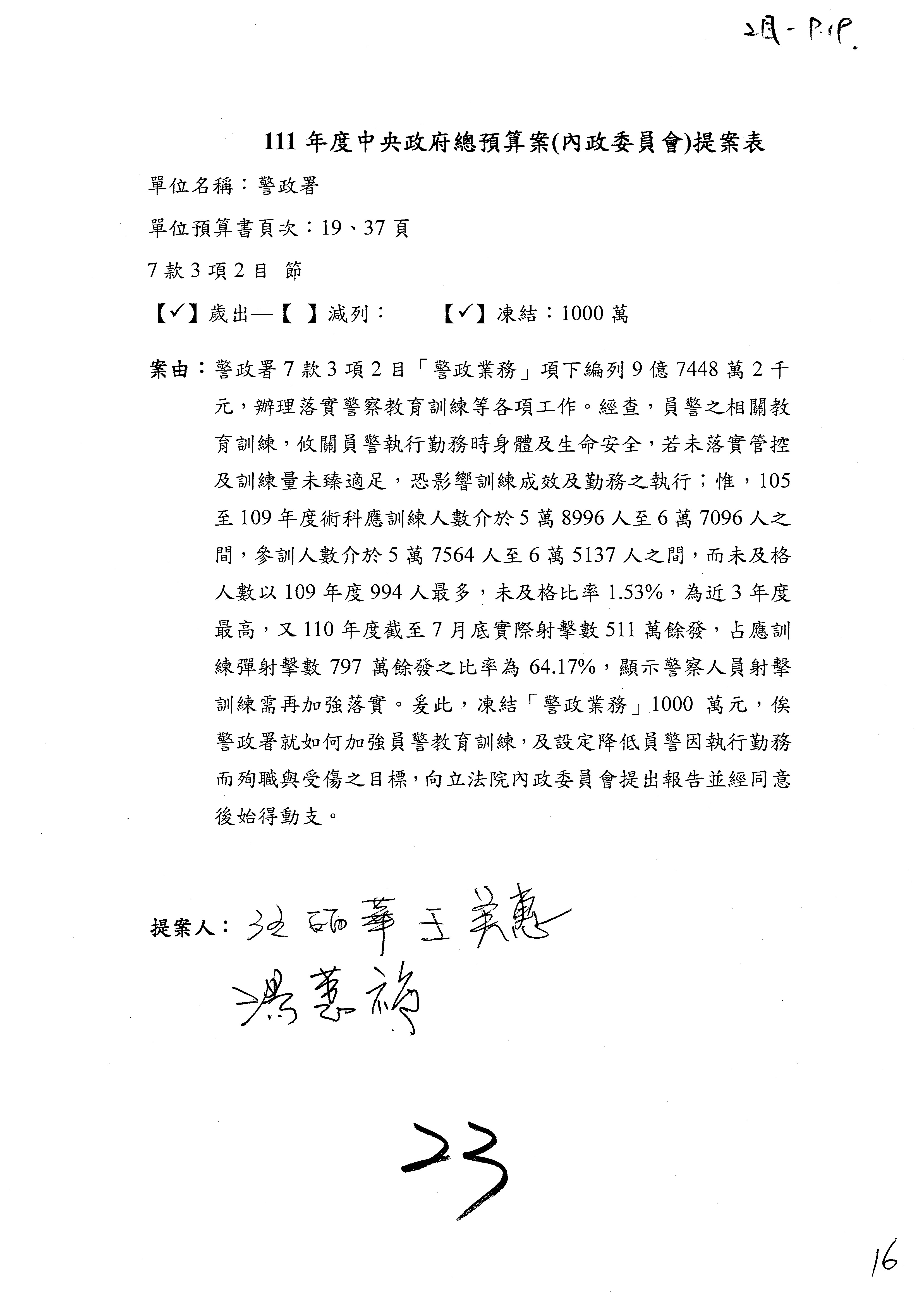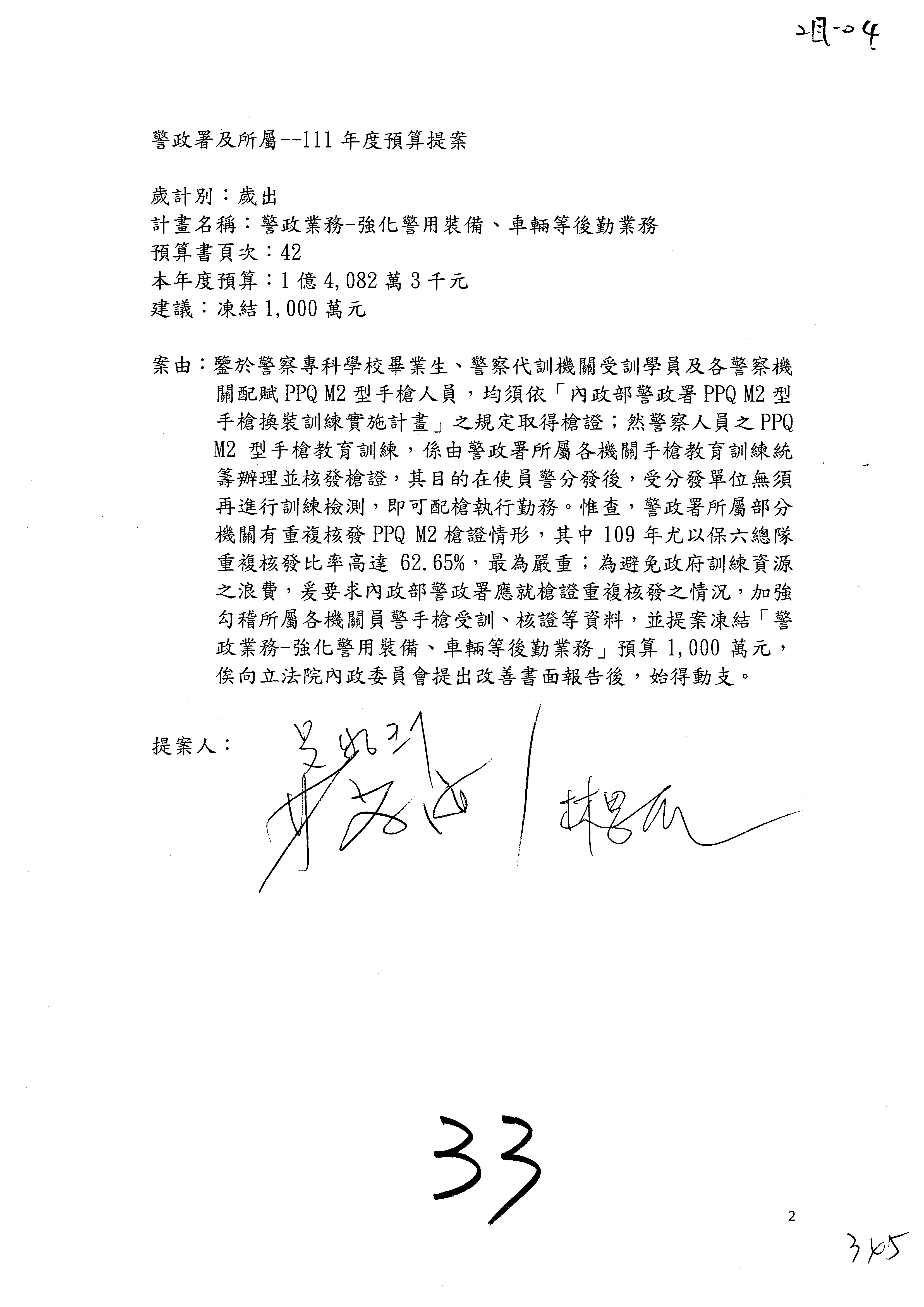 第26案是一樣的科目嗎?不一樣,這是在加強警備應變措施、社會治安維護及國際警察合作之業務費項下,凍結十分之一,OK嗎?要說明嗎?好,請說明。