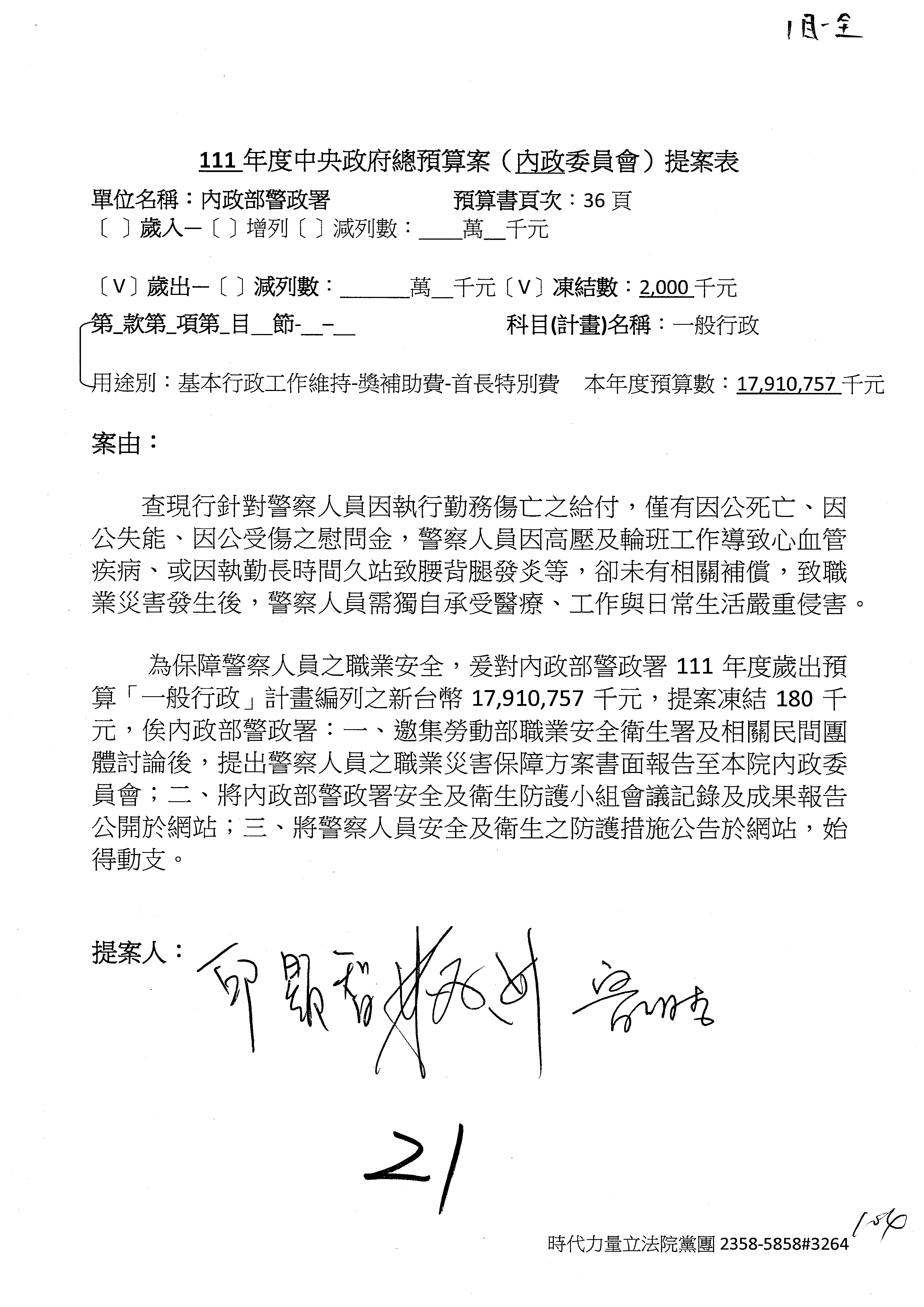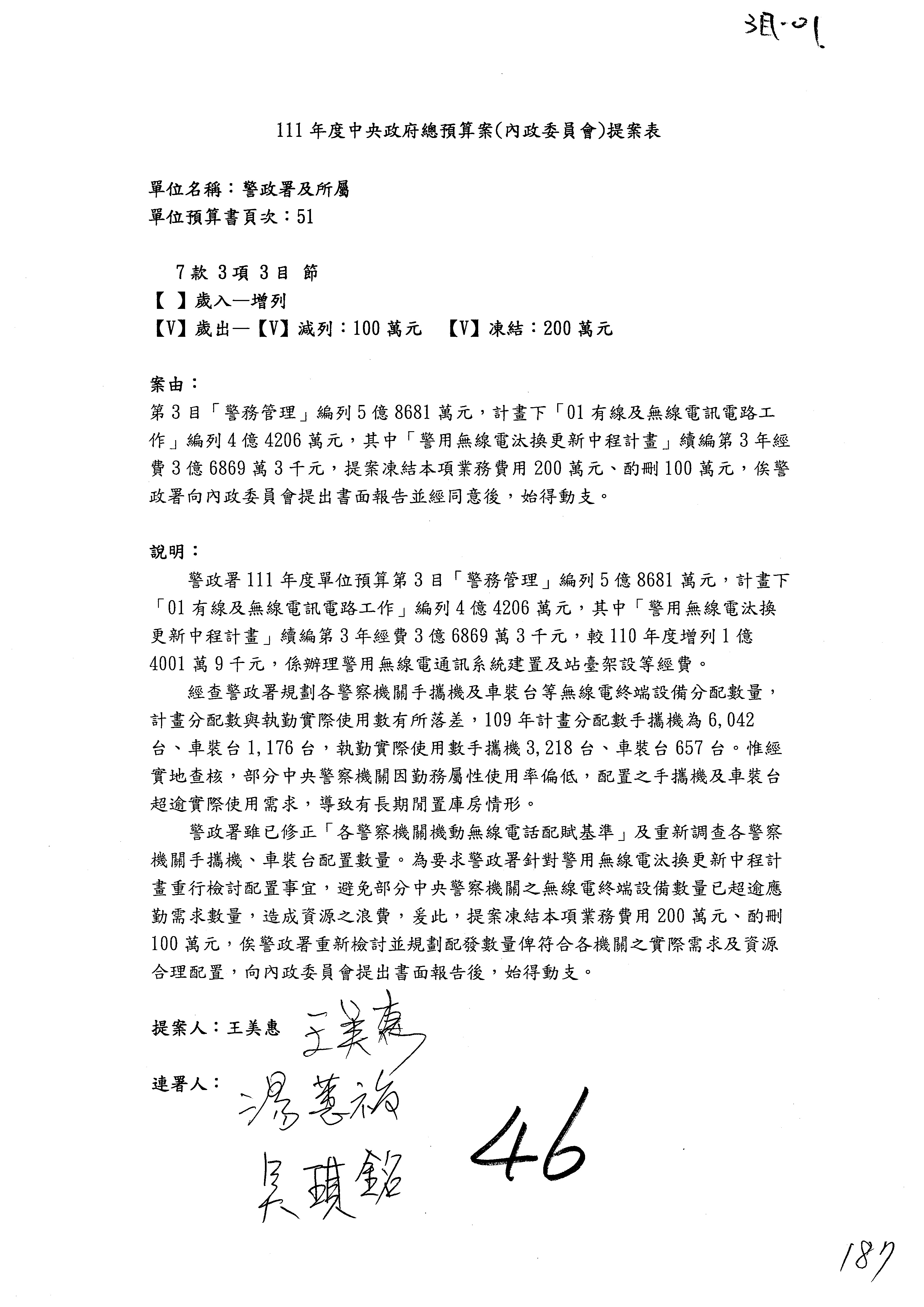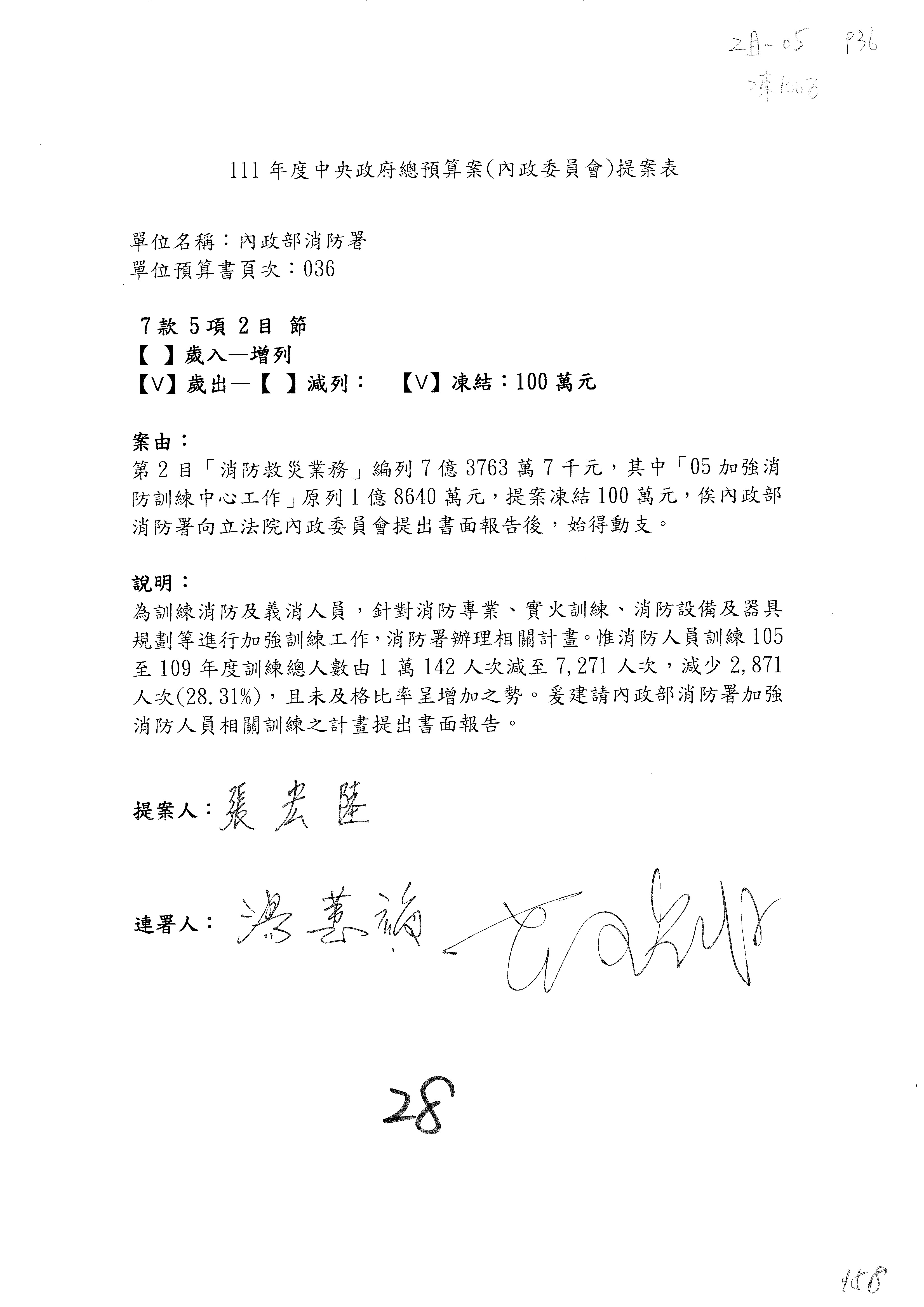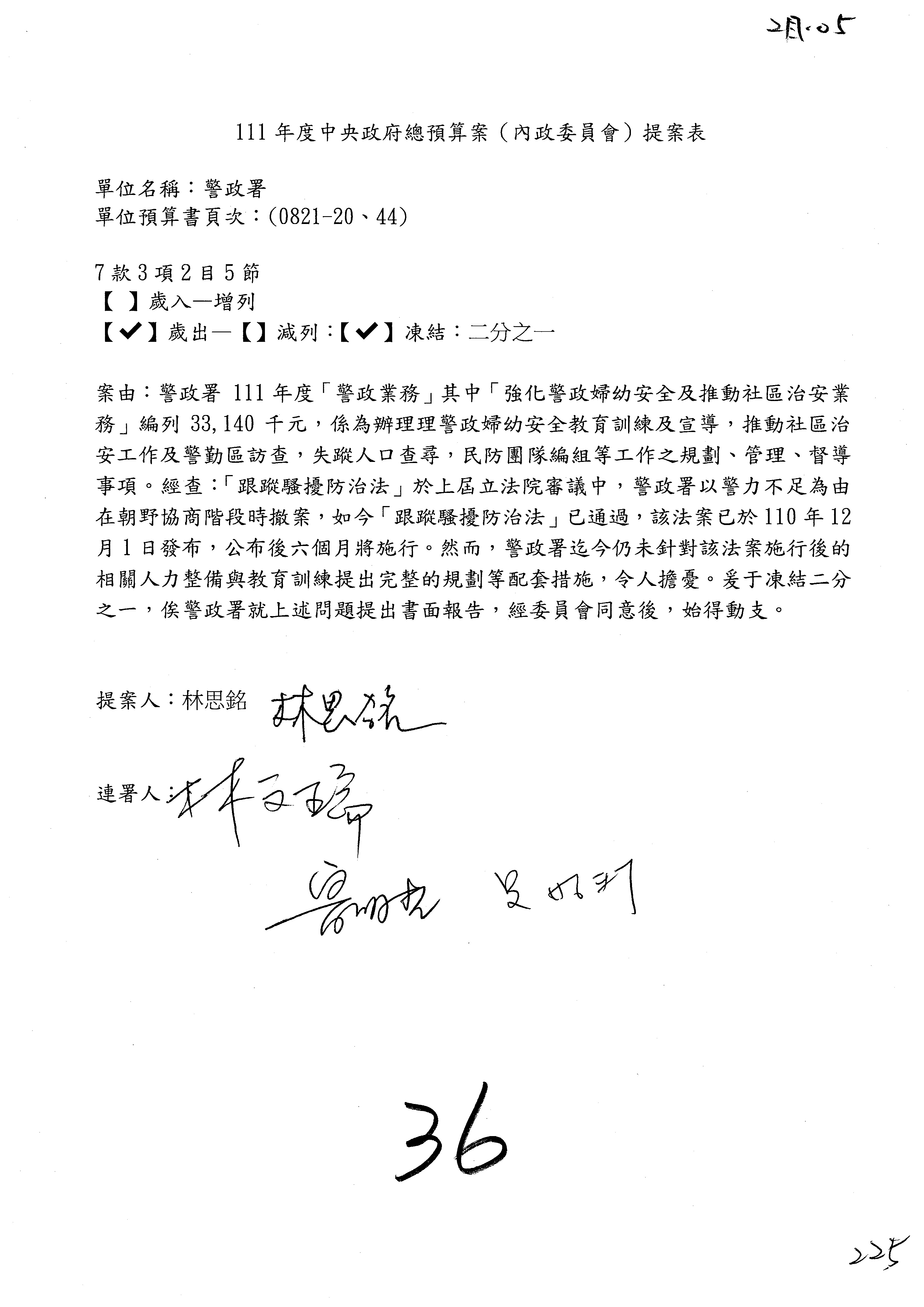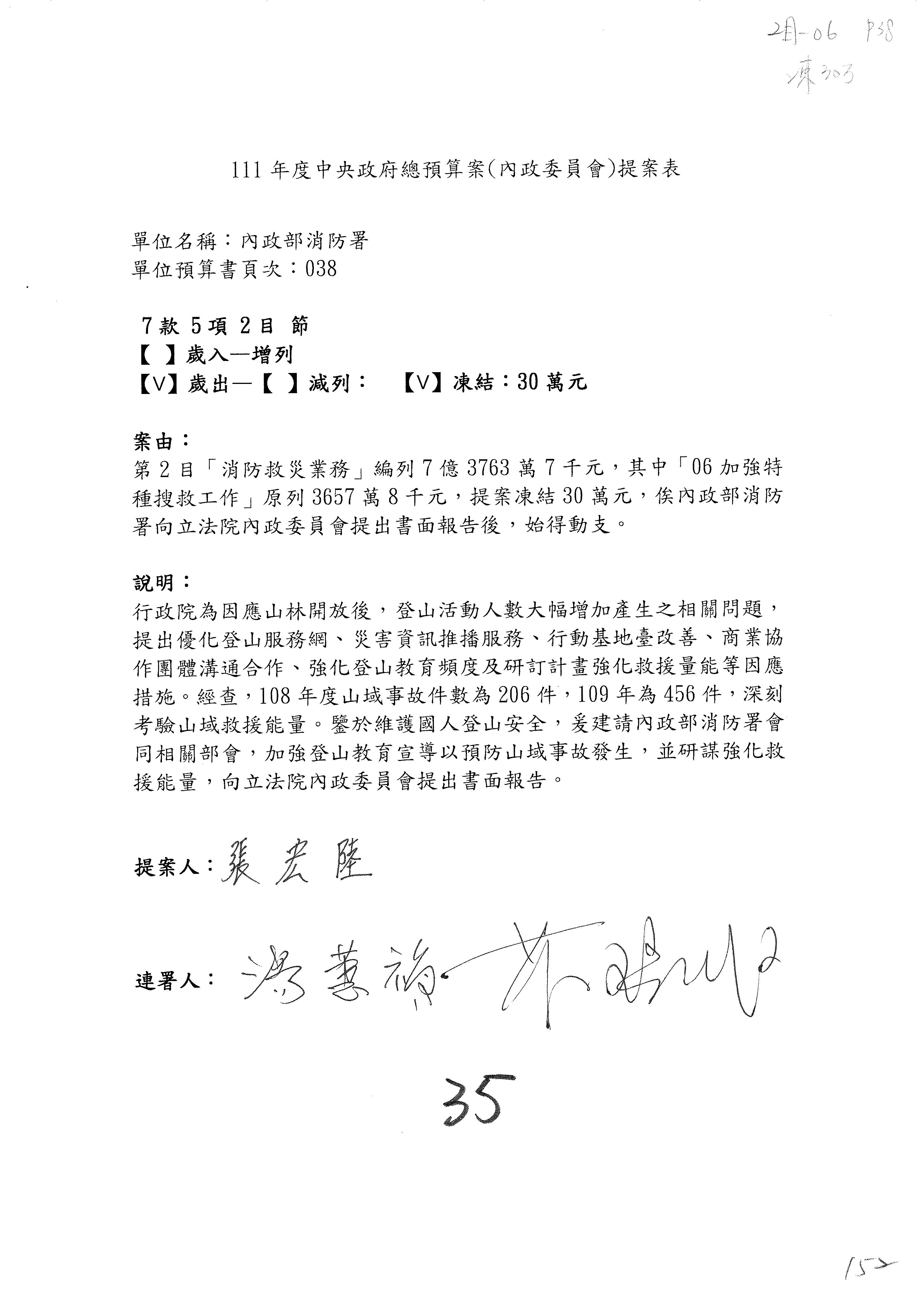 第26案是一樣的科目嗎?不一樣,這是在加強警備應變措施、社會治安維護及國際警察合作之業務費項下,凍結十分之一,OK嗎?要說明嗎?好,請說明。