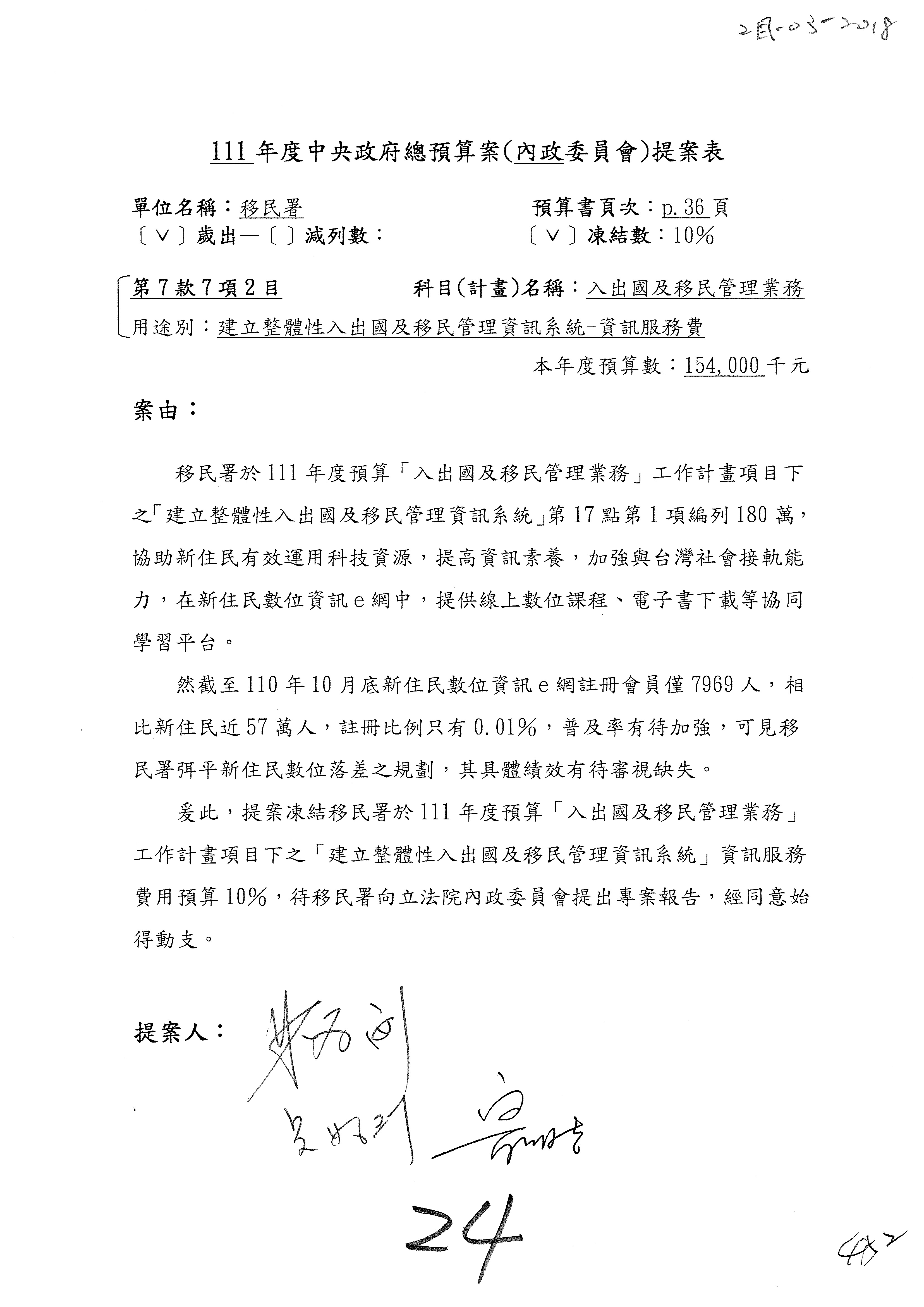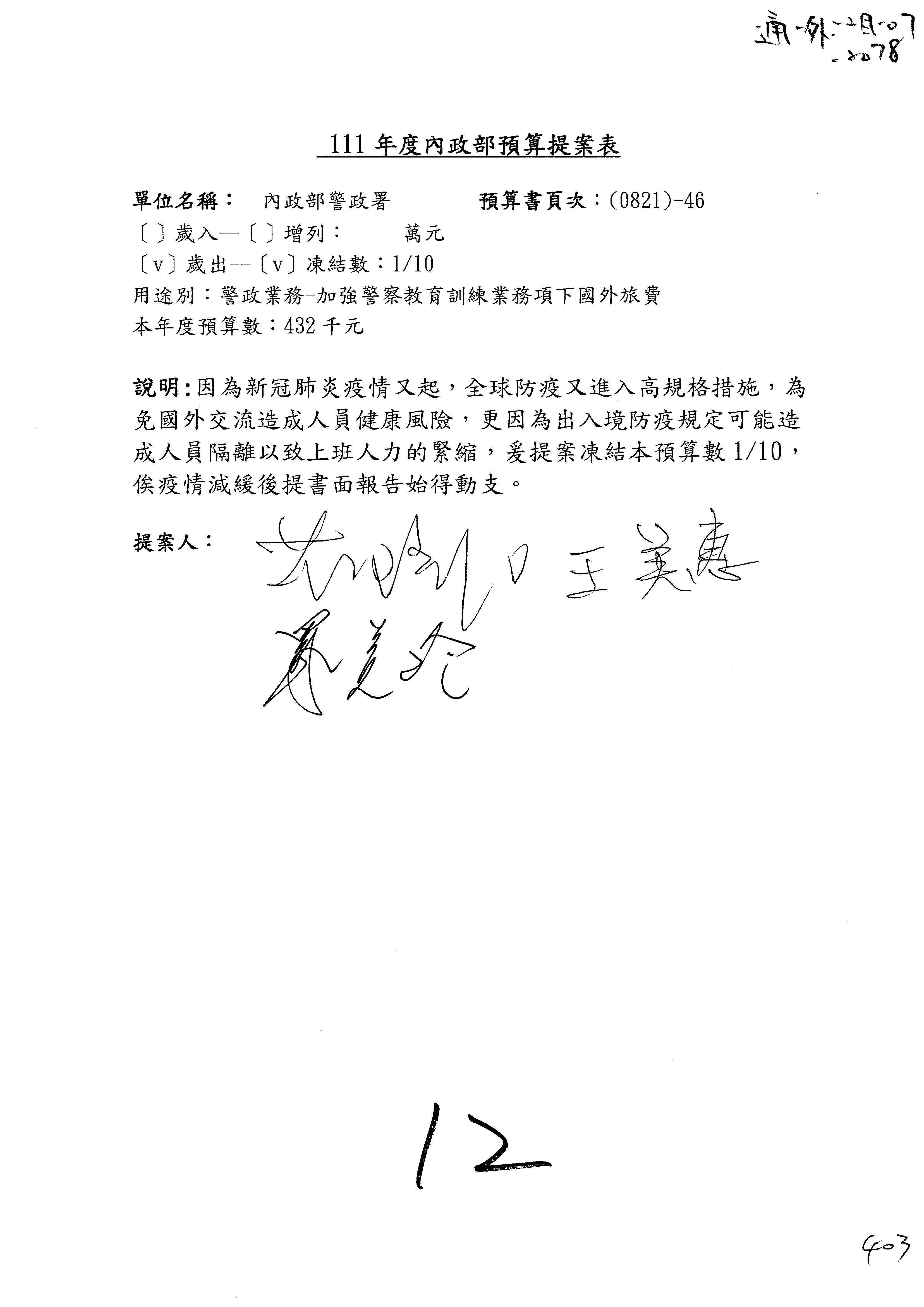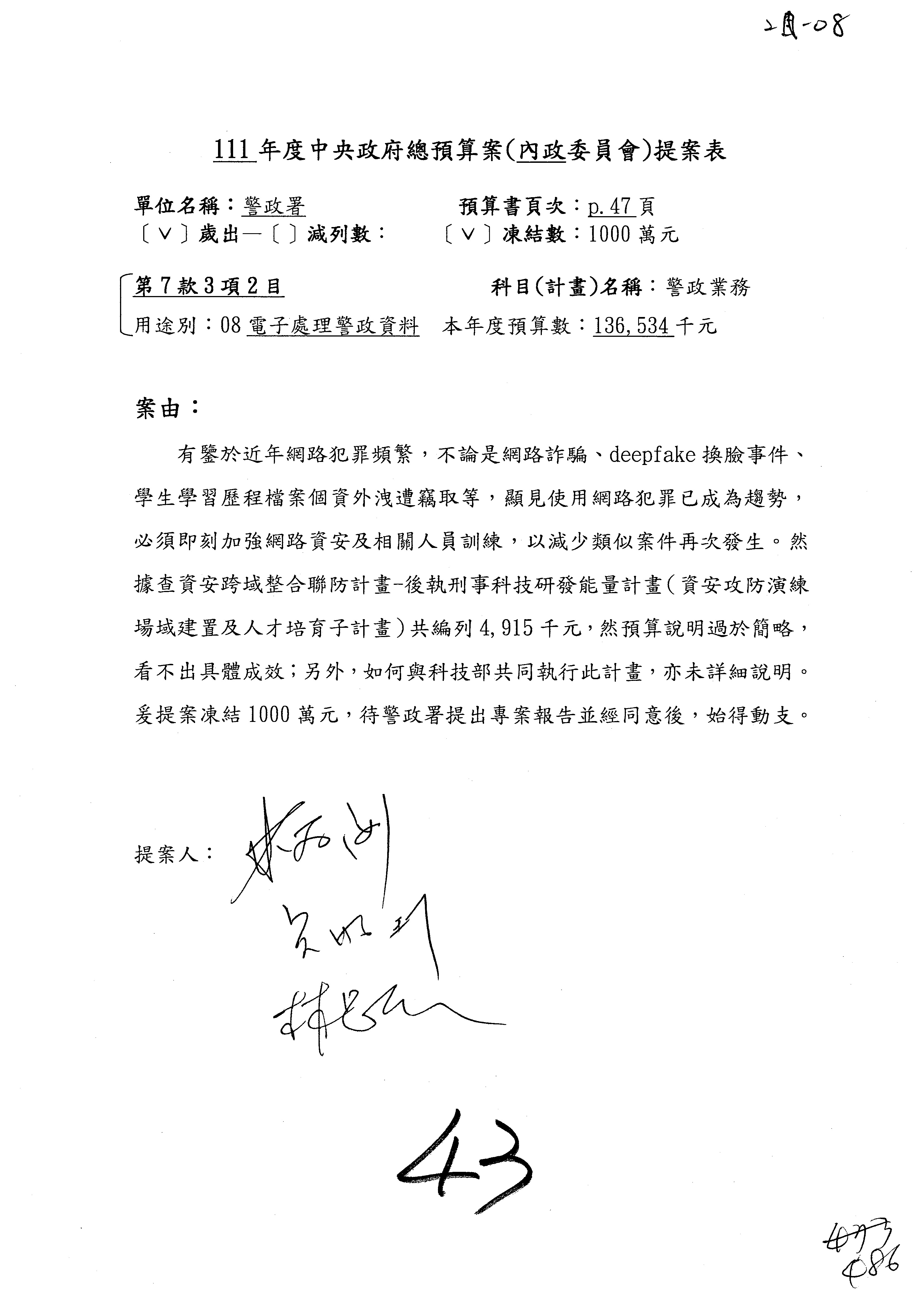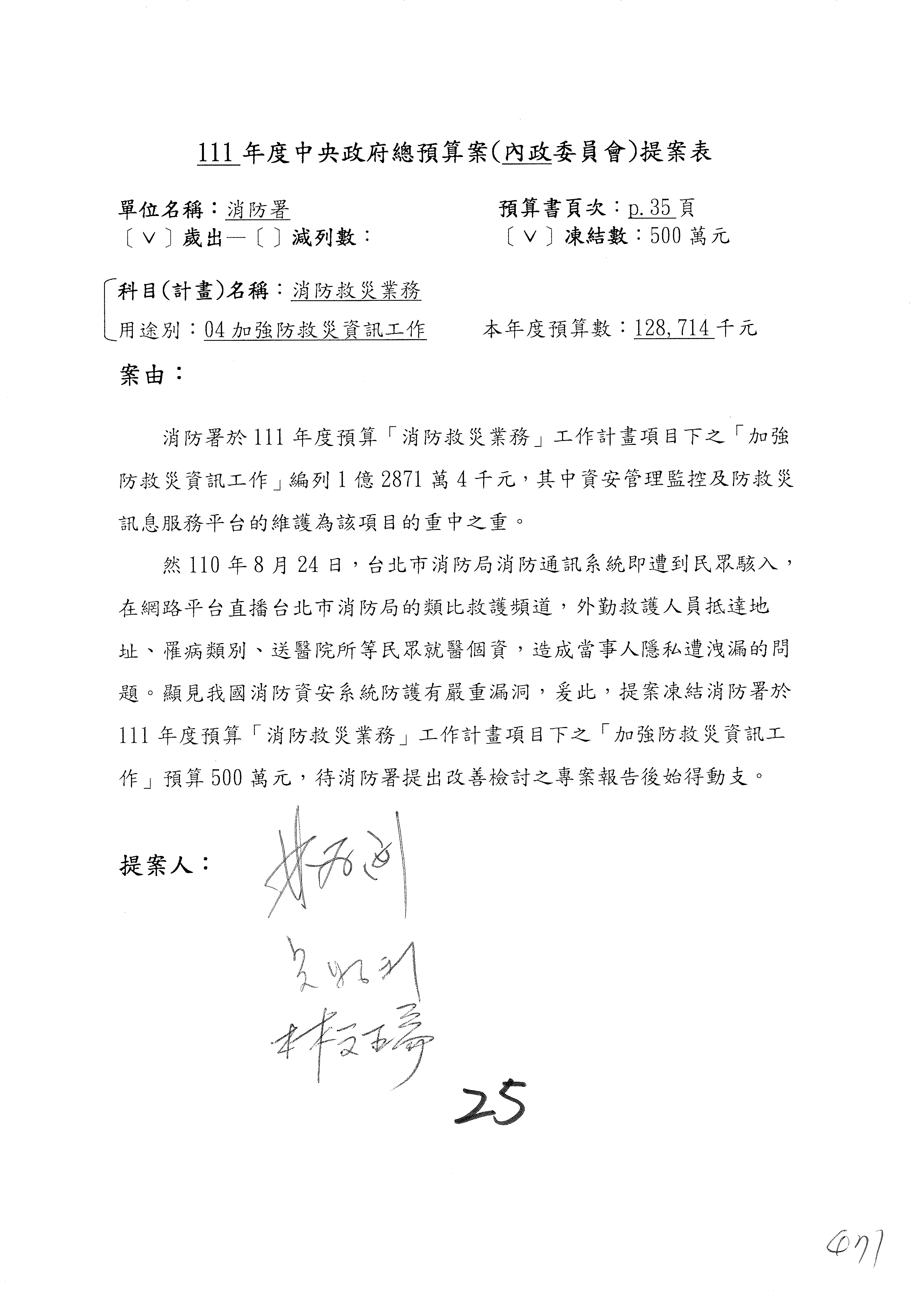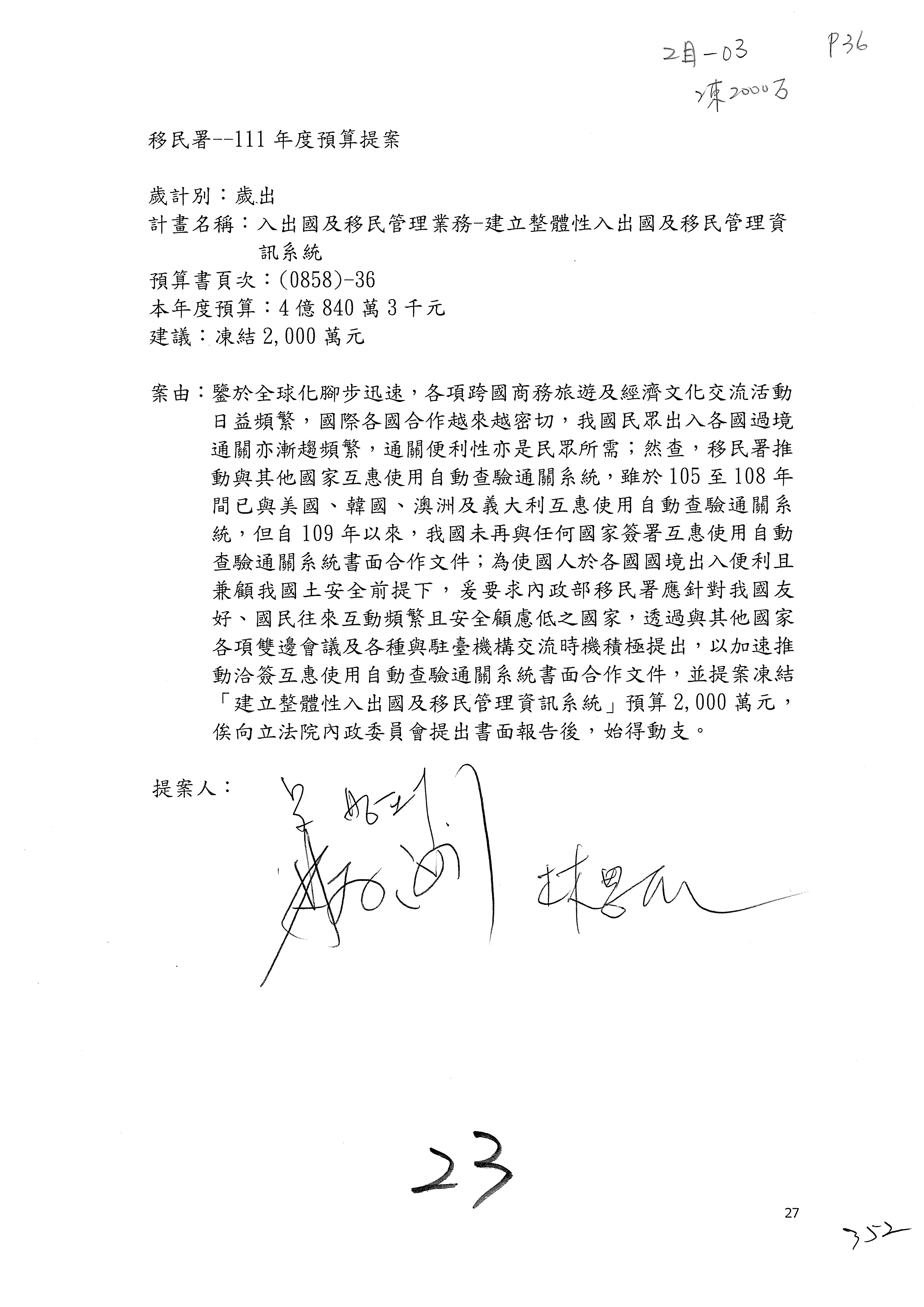 第26案是一樣的科目嗎?不一樣,這是在加強警備應變措施、社會治安維護及國際警察合作之業務費項下,凍結十分之一,OK嗎?要說明嗎?好,請說明。