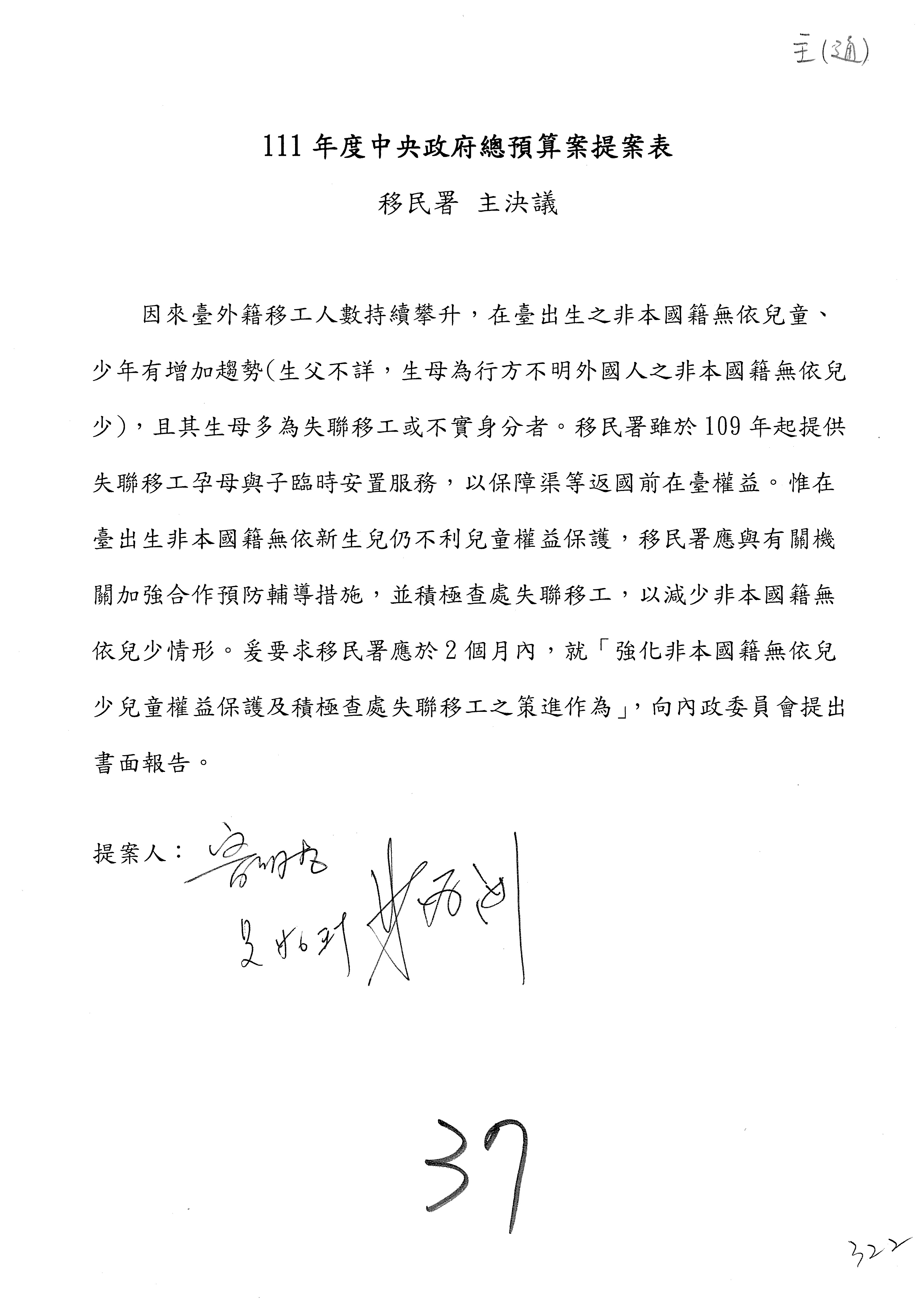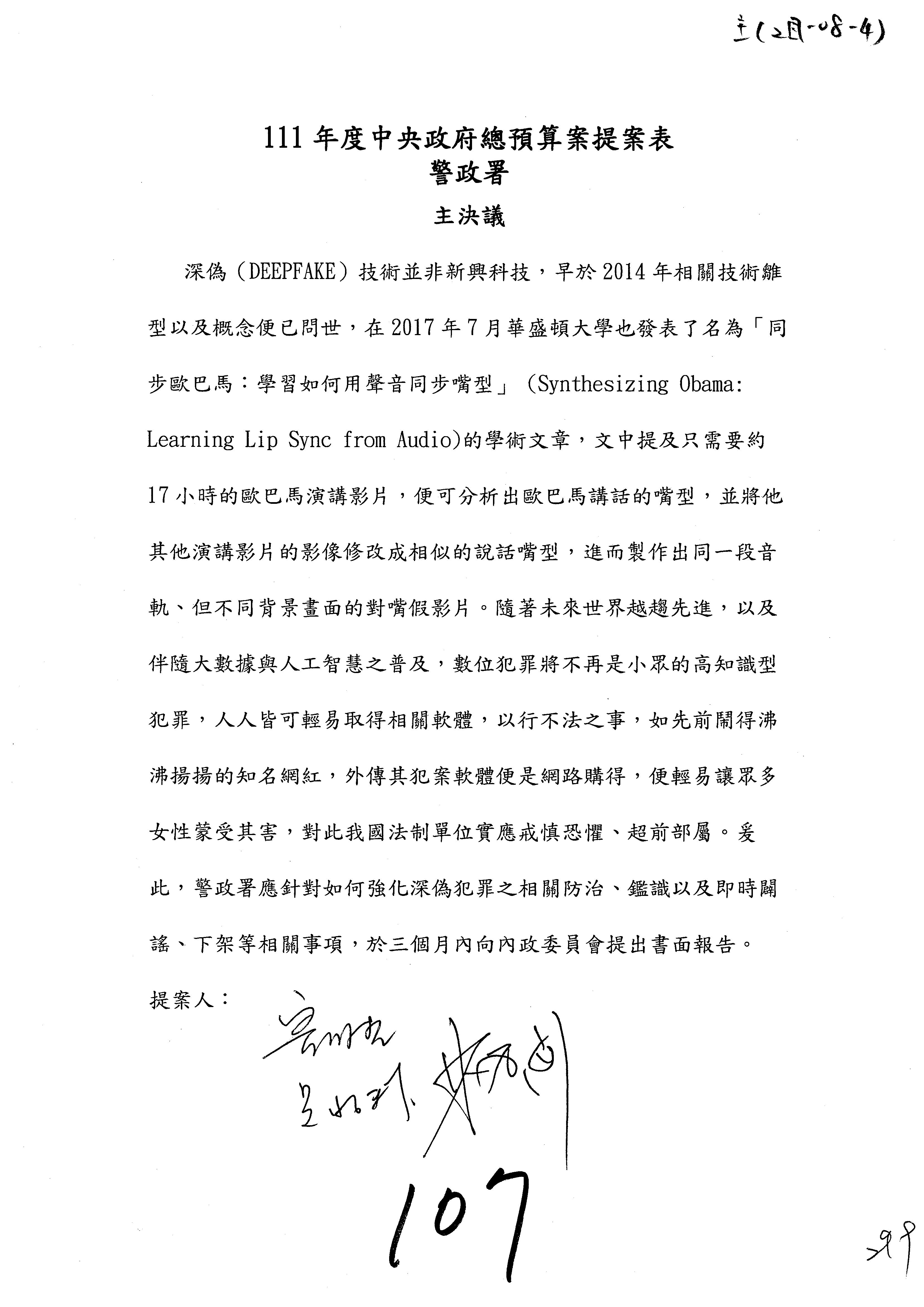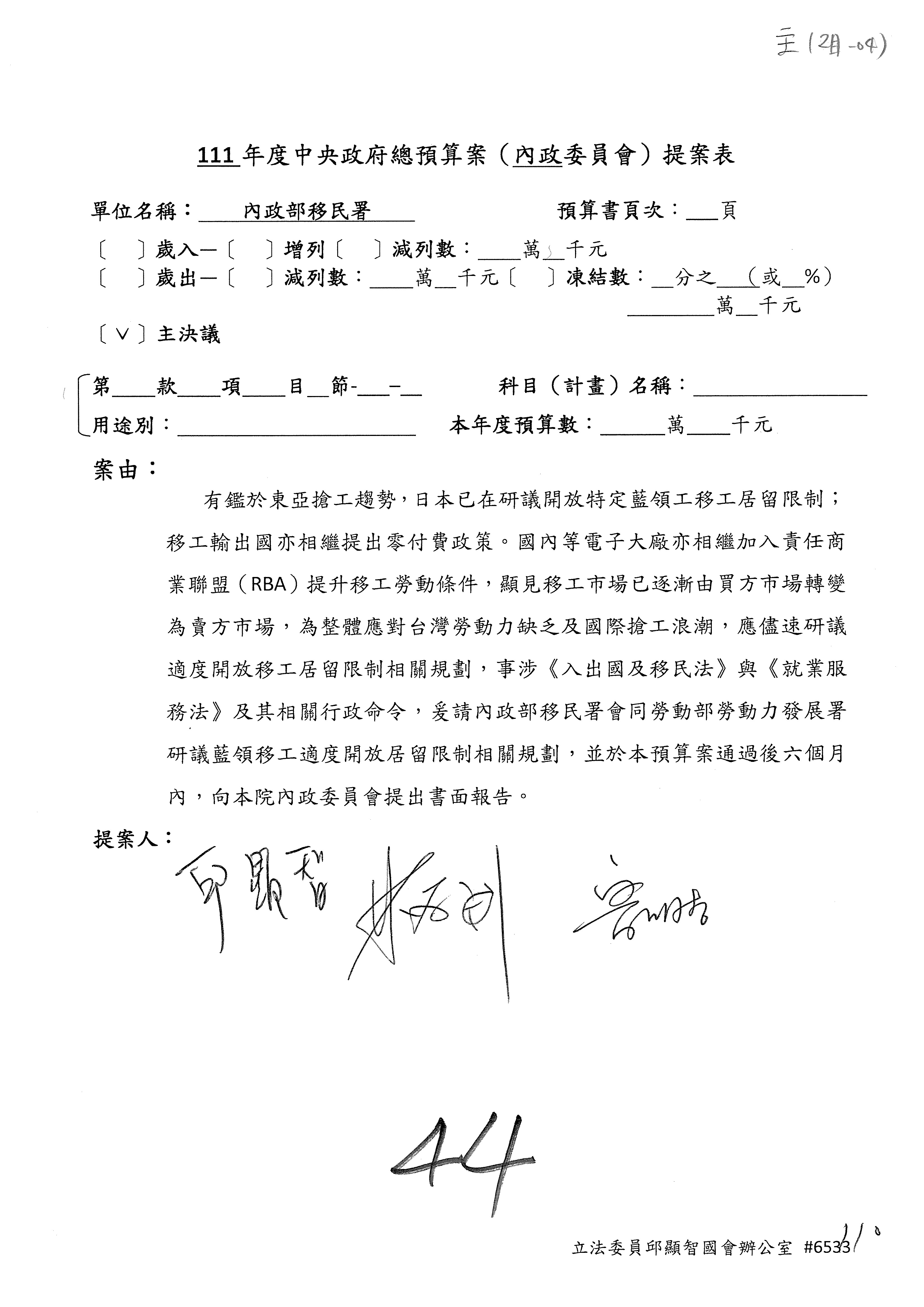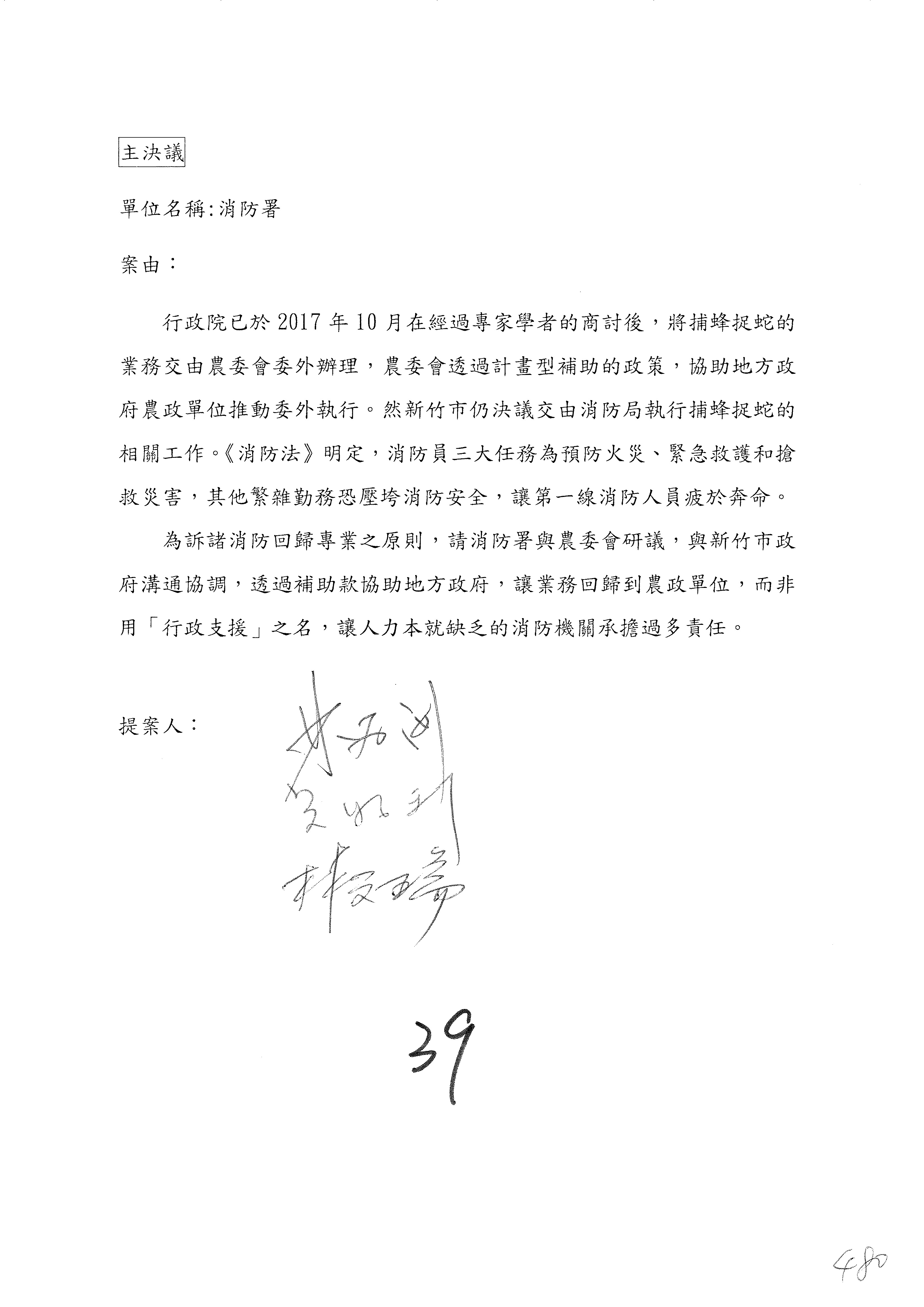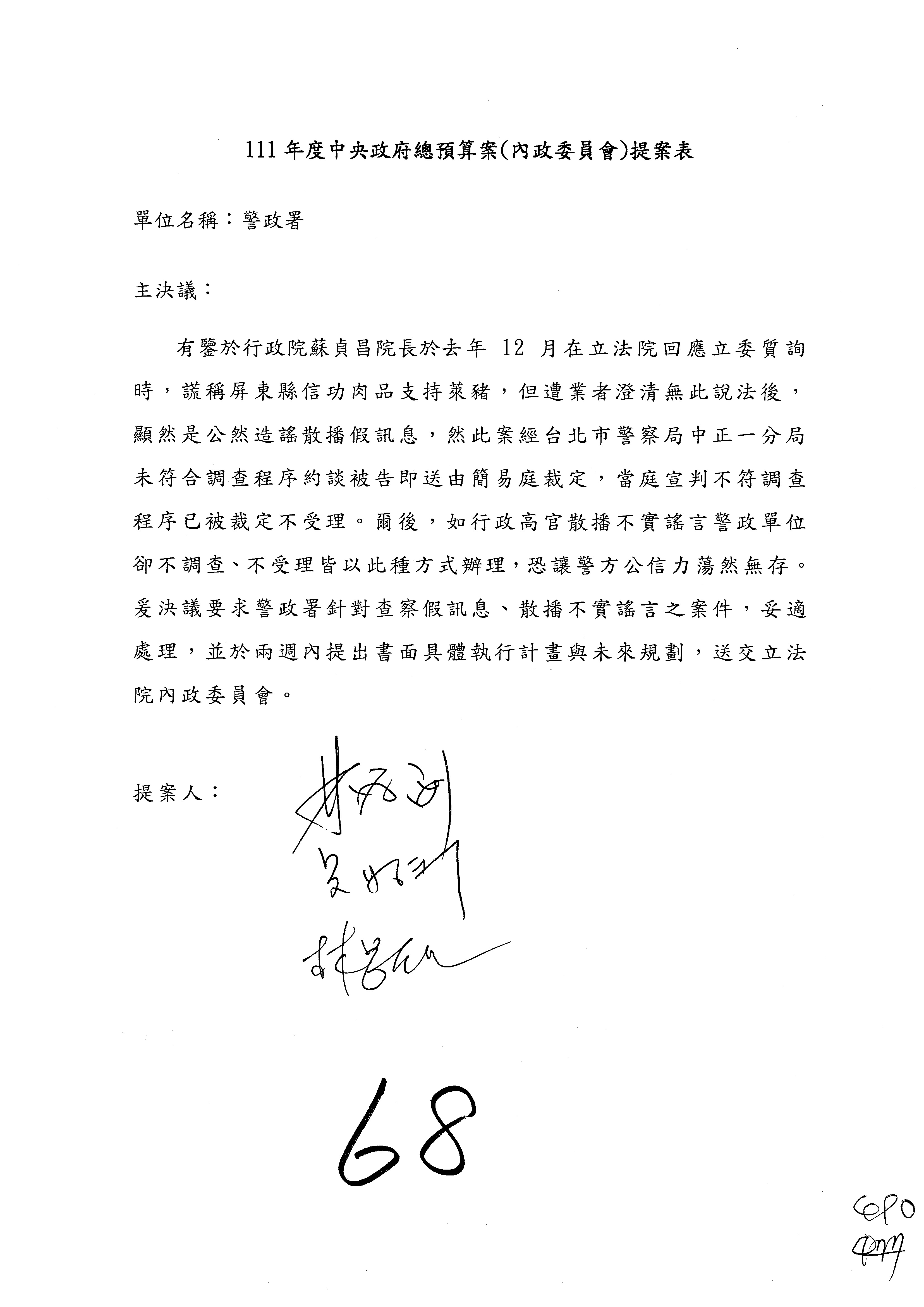 主席:有委員提案的部分照剛才宣讀的協商結論通過,沒有提案的部分預算均照列,請問各位,有無異議?(無)無異議,通過。本次通過之決議文字授權主席及議事人員整理。